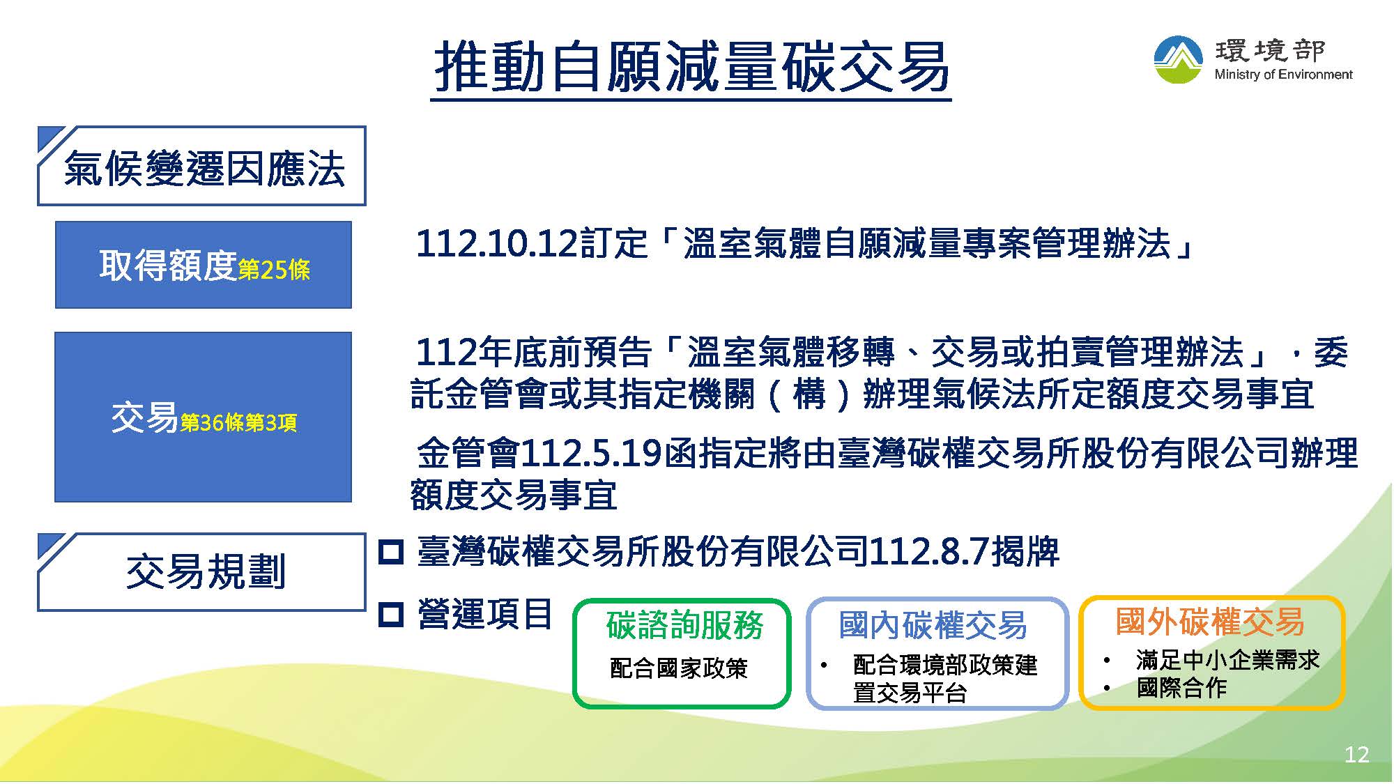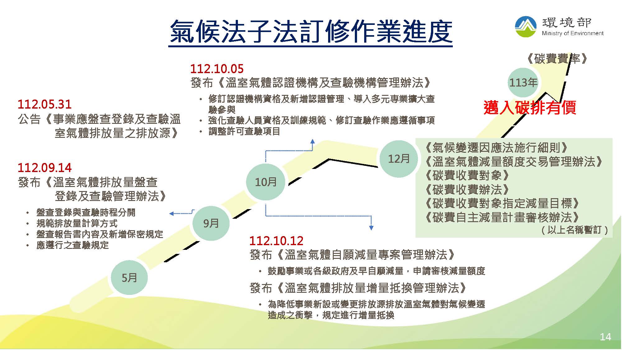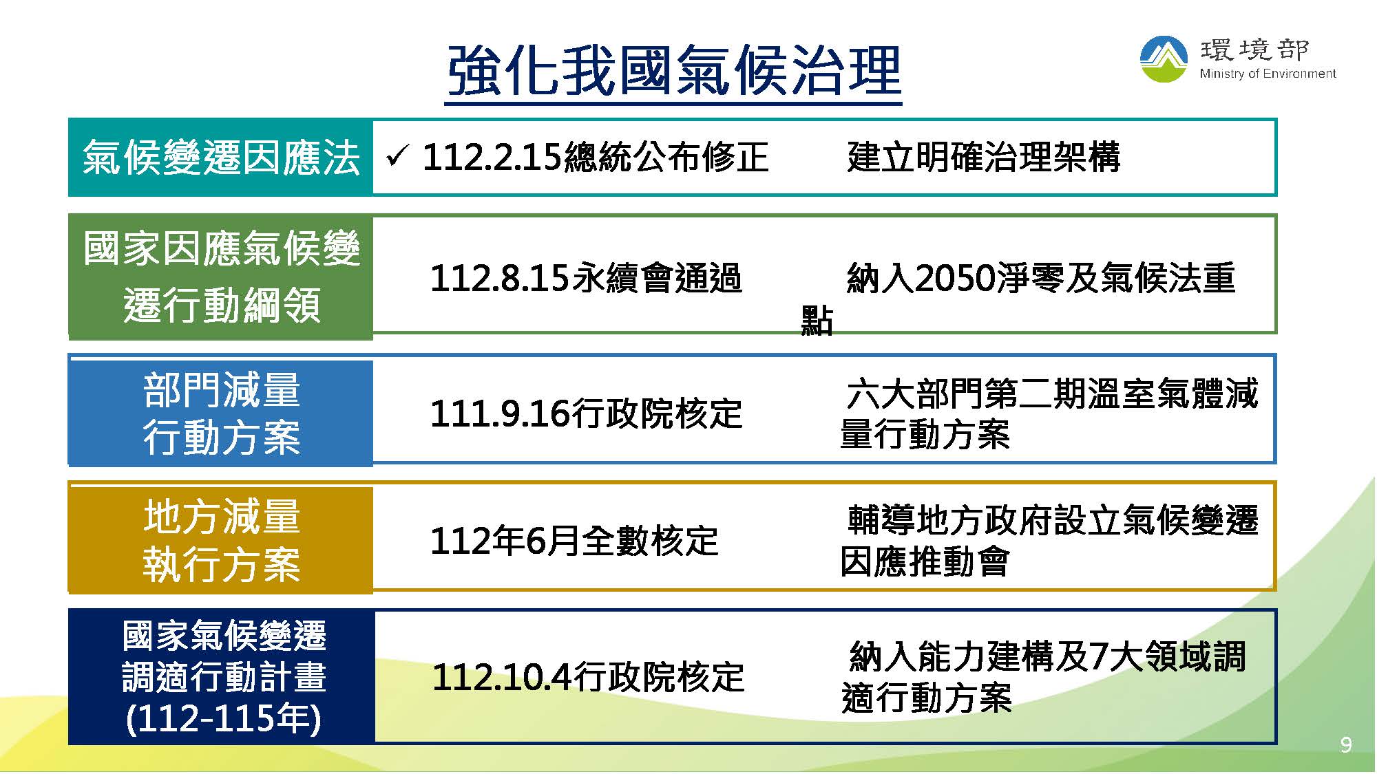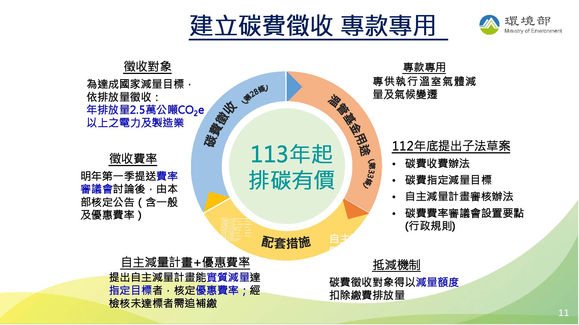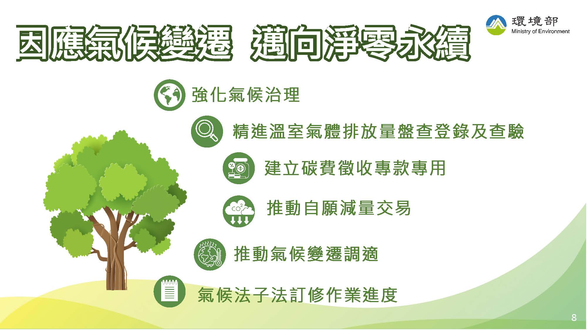 接下來我就針對八個面向簡要報告,第一個我們要推動的大概就是現在全球非常關注的淨零減碳。我們在今年2月份也已經通過氣候變遷因應法,接下來有12個子法,目前環境部已經公告5個子法,有1個草案也在公告當中,另外還有5個跟碳費相關的子法今年年底以前會公布,並與各方討論。明年元月1號開始我們就徵收碳費,大家非常關心到底碳費多少,我們有一個碳費審議會,目前審議委員設置要點也已經公布出來,希望各界假如有意見可以提供給環境部做為整個草案修法的參考。同時我們第三期國家調適計畫也已經在今年10月4號經過行政院核定,未來我們跨部會合作,大家共同朝向2050淨零排碳的方向來努力。