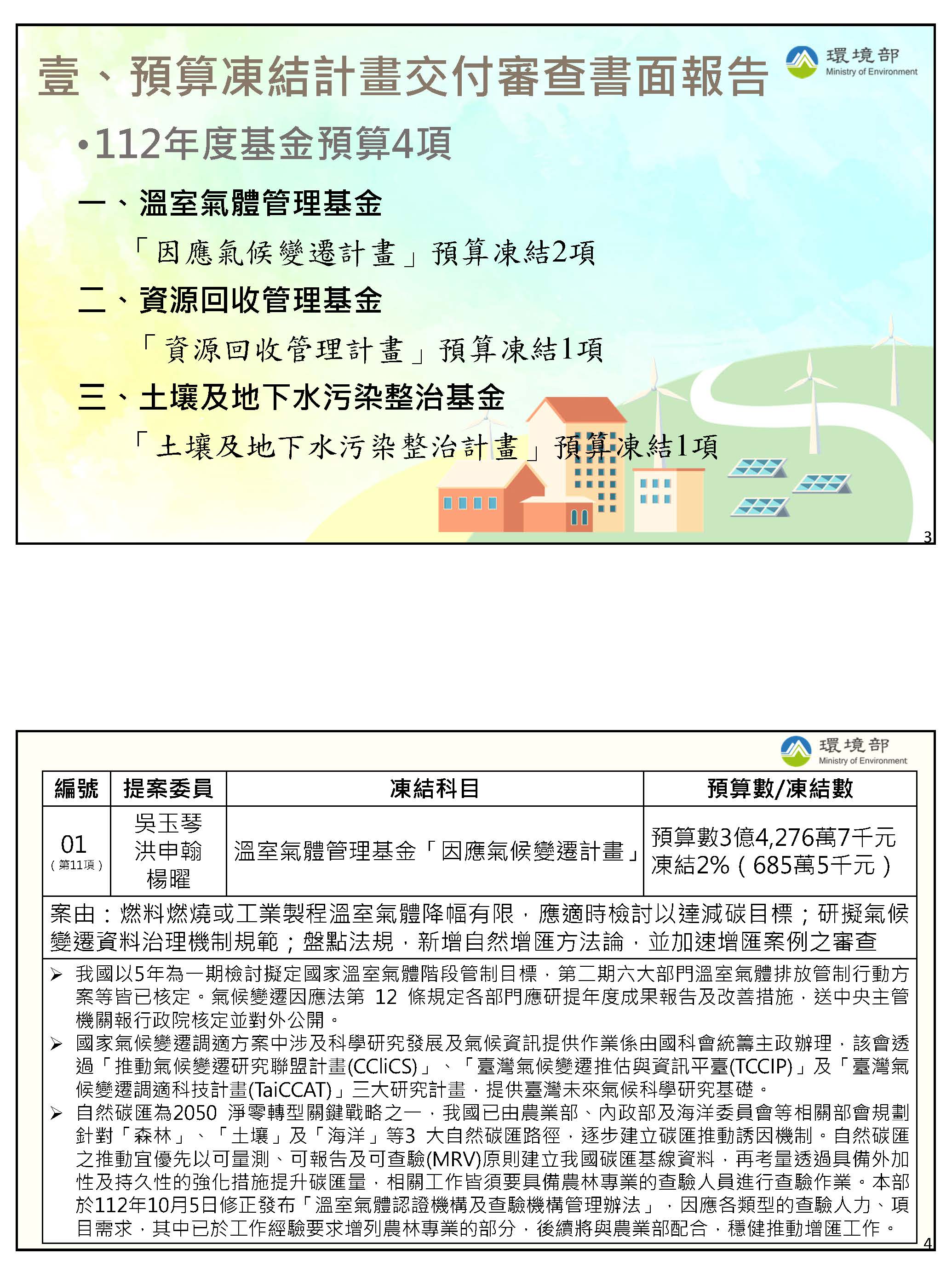 二、審查中華民國112年度中央政府總預算附屬單位預算決議有關環境部主管預算凍結案4案。