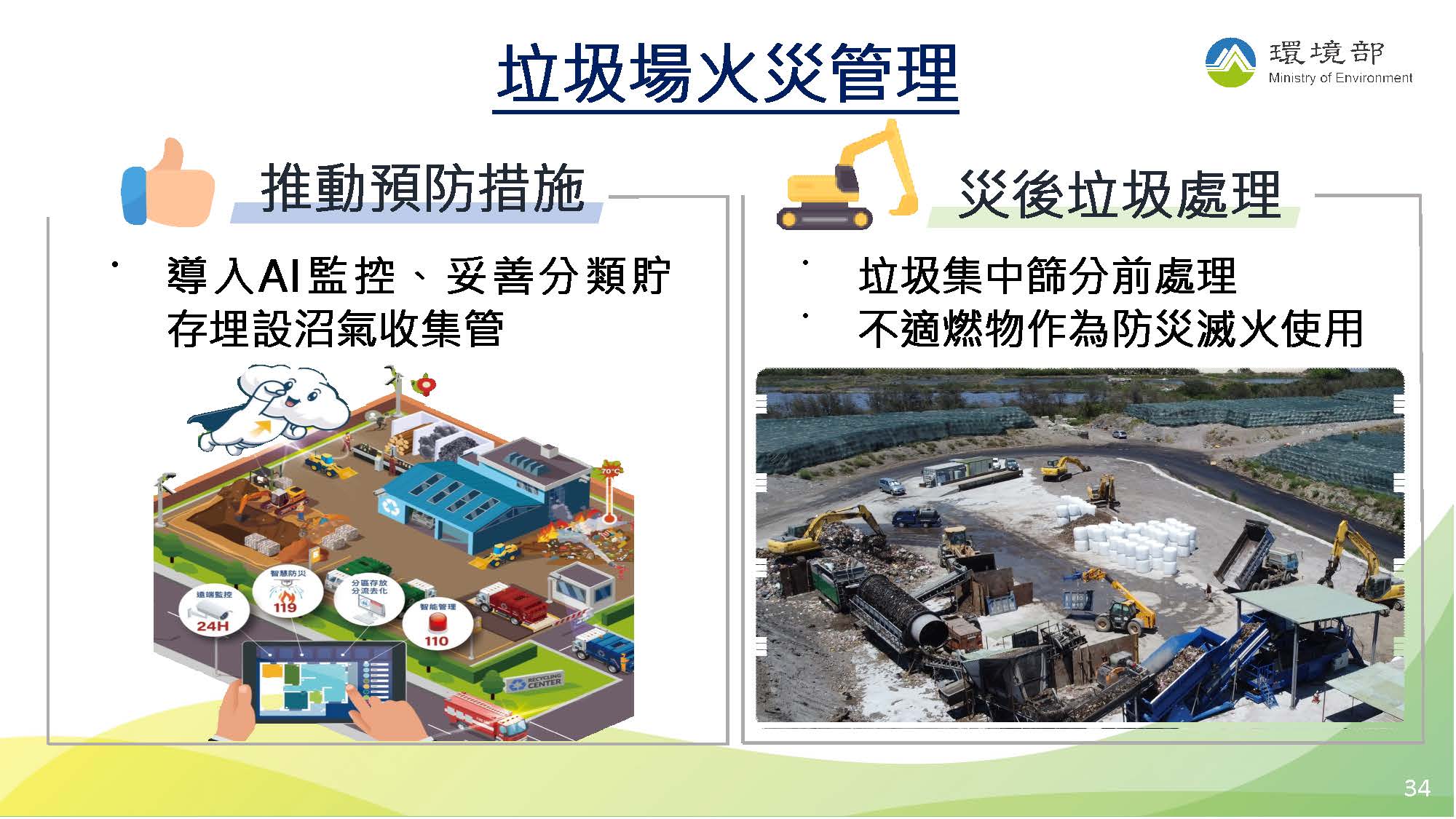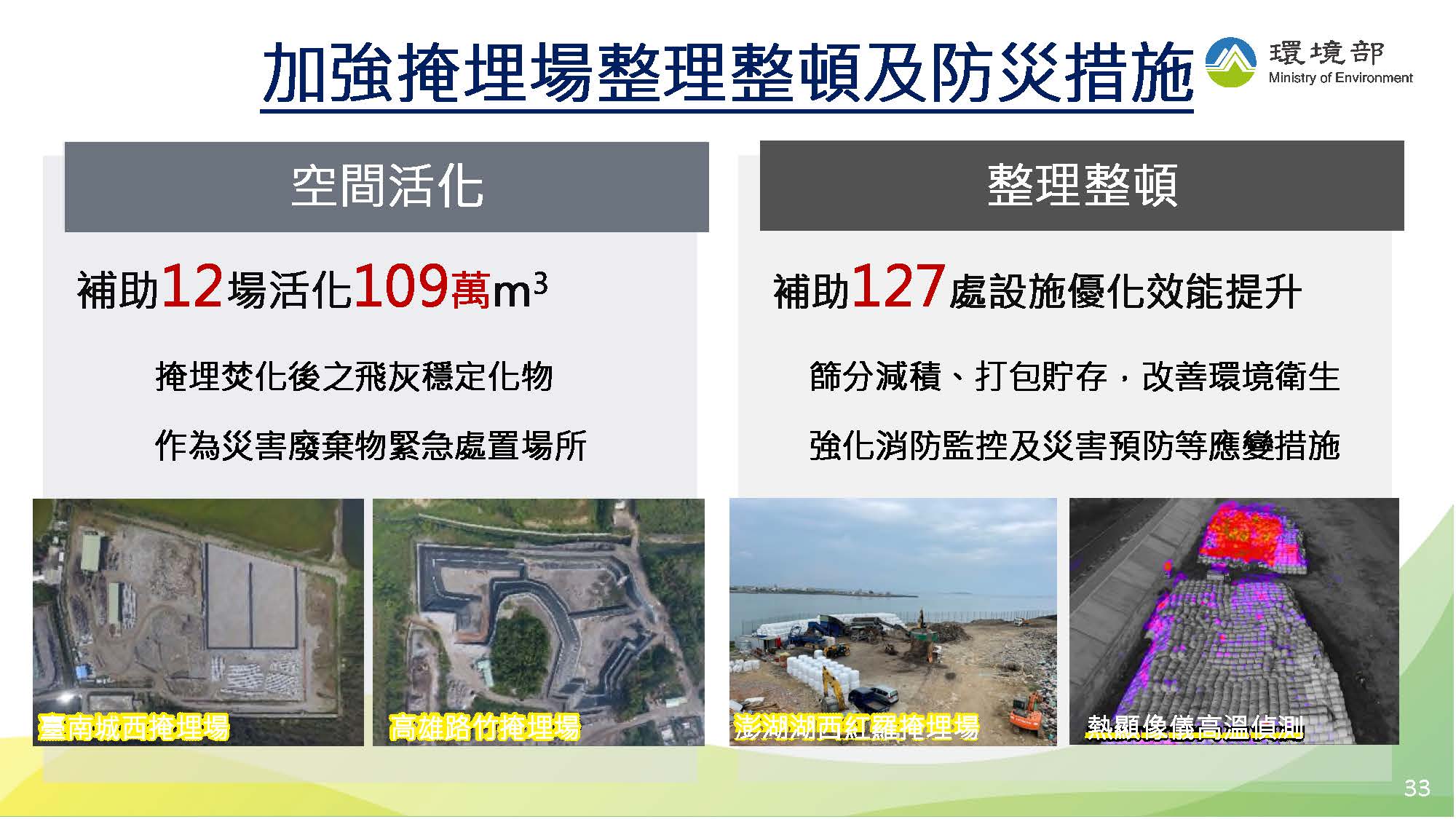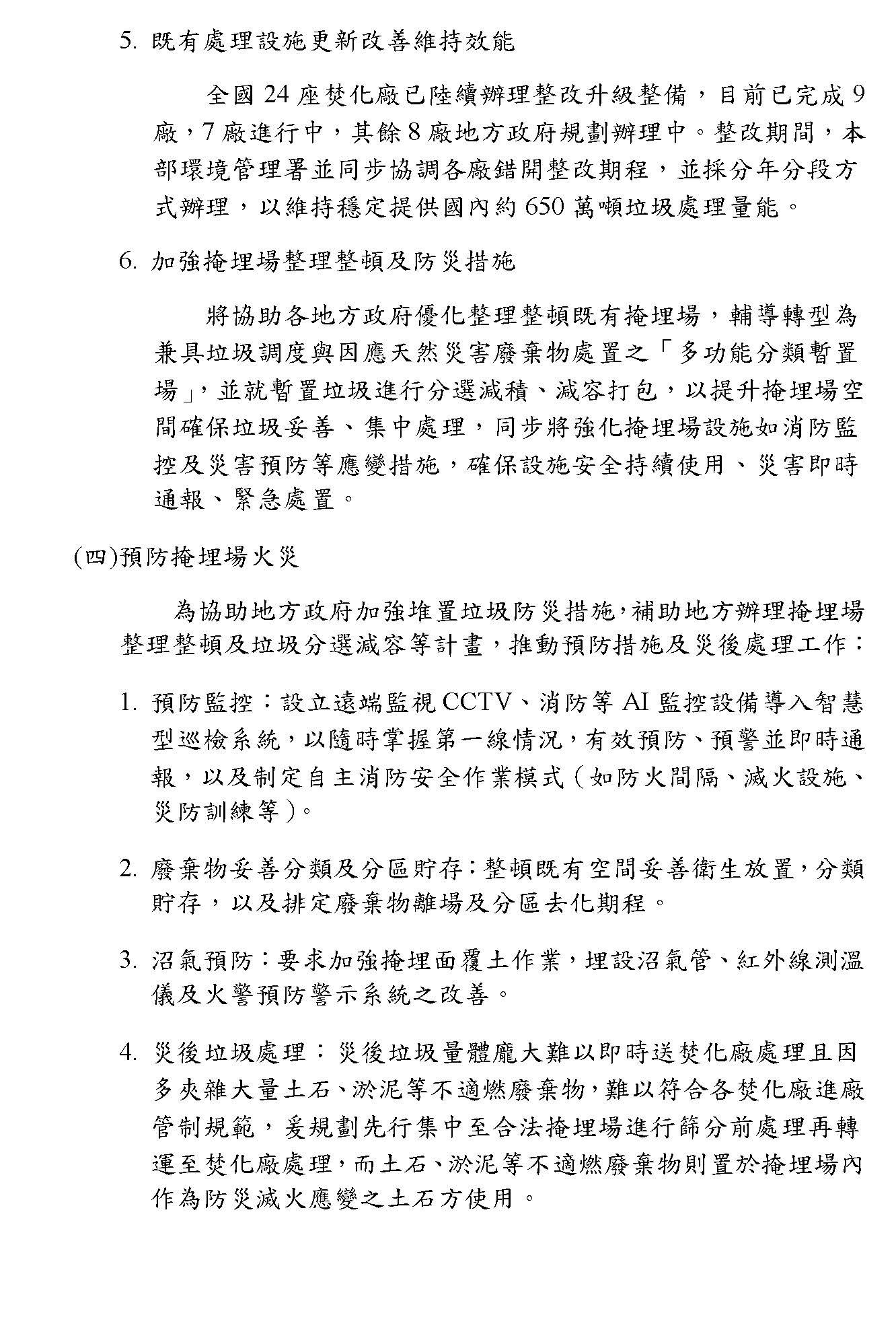 同樣地,我們也積極協助澎湖縣。澎湖縣因為量能的確較少,所以現階段的作法是先篩分打包,楊委員也都知道,也謝謝楊委員爭取很多經費,讓澎湖縣處理篩分、打包。昨天以及上個禮拜發生的掩埋場火燒事件的確就是因為廢棄物堆積在那邊產生沼氣。