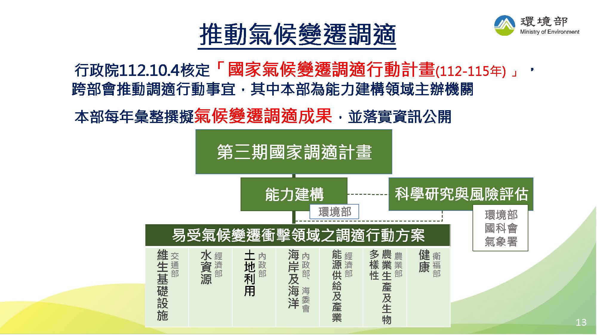環境部提出施行細則修正草案共24條,其中包括明定各綱領、計畫與方案架構內容及期程,踐行公民參與;闡明氣候變遷調適目的及原則,結合國家與地方調適行動;確立氣候治理成果定期提報及檢核機制,落實資訊公開等3大項。