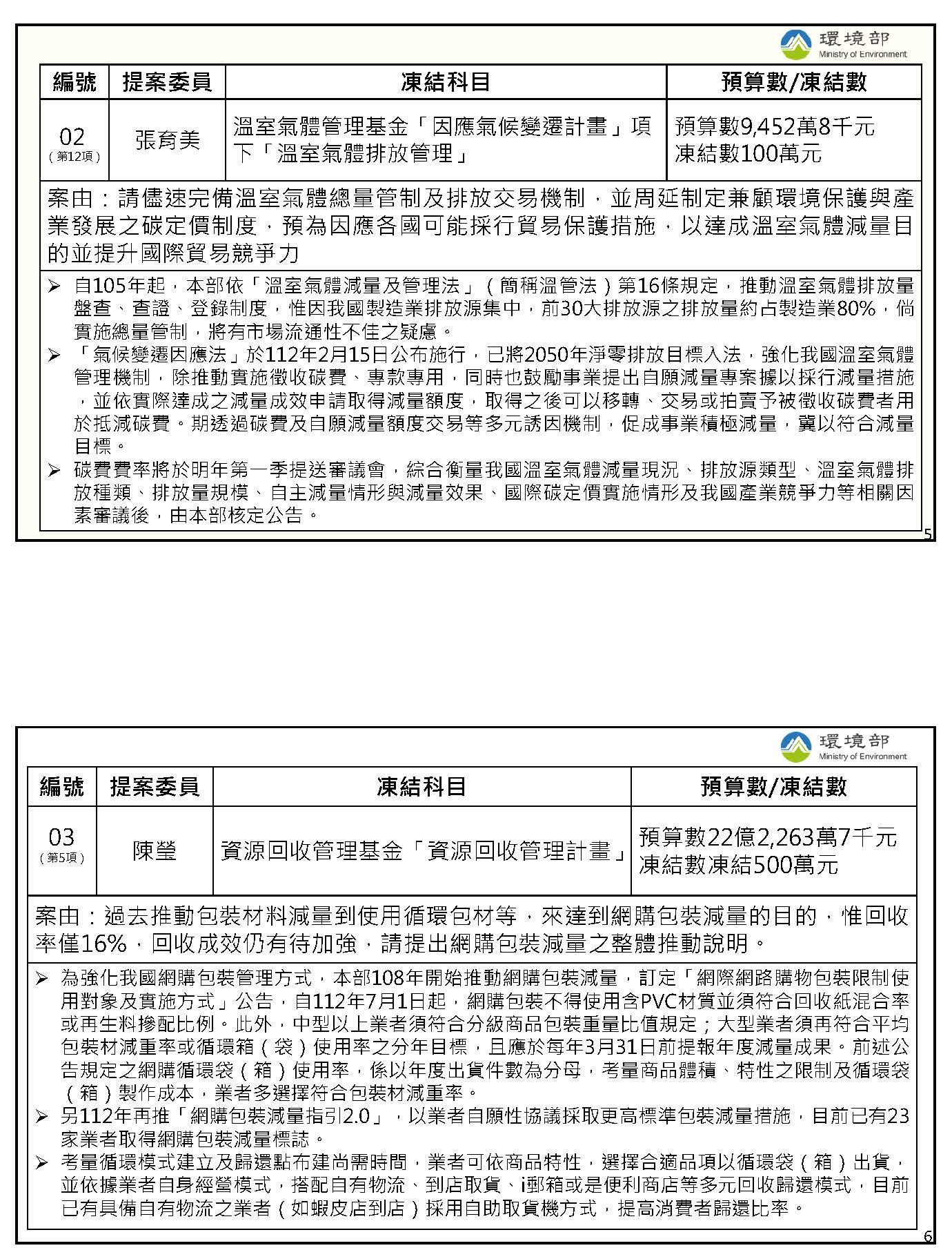 行政院環境保護署112年度中央政府總預算附屬單位預算凍結案明細表(討論事項) | |||