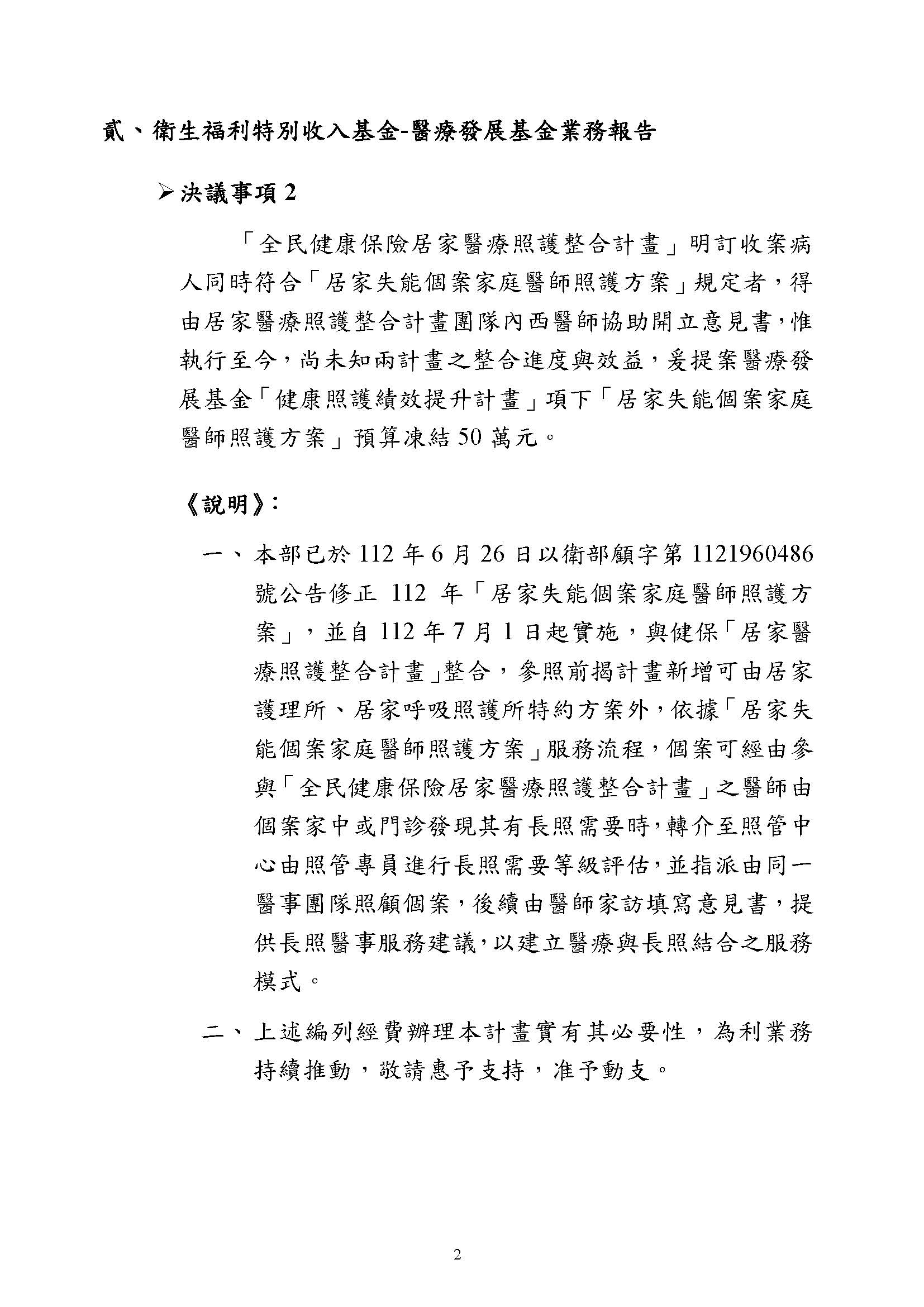報告事項一,本部主管的112年度附屬單位預算凍結案,討論事項共有一案,這是凍結醫療發展基金所辦理的「居家失能個案家庭醫師照顧方案」,本部業將該方案與全民健康保險「居家醫療照護整合計畫」整合效益的書面資料函送貴委員會及各委員辦公室,鑑於所凍結的經費確為業務推動需要,敬請各位委員惠予支持,准予動支,俾利該基金依既定的業務計畫及內容來執行。