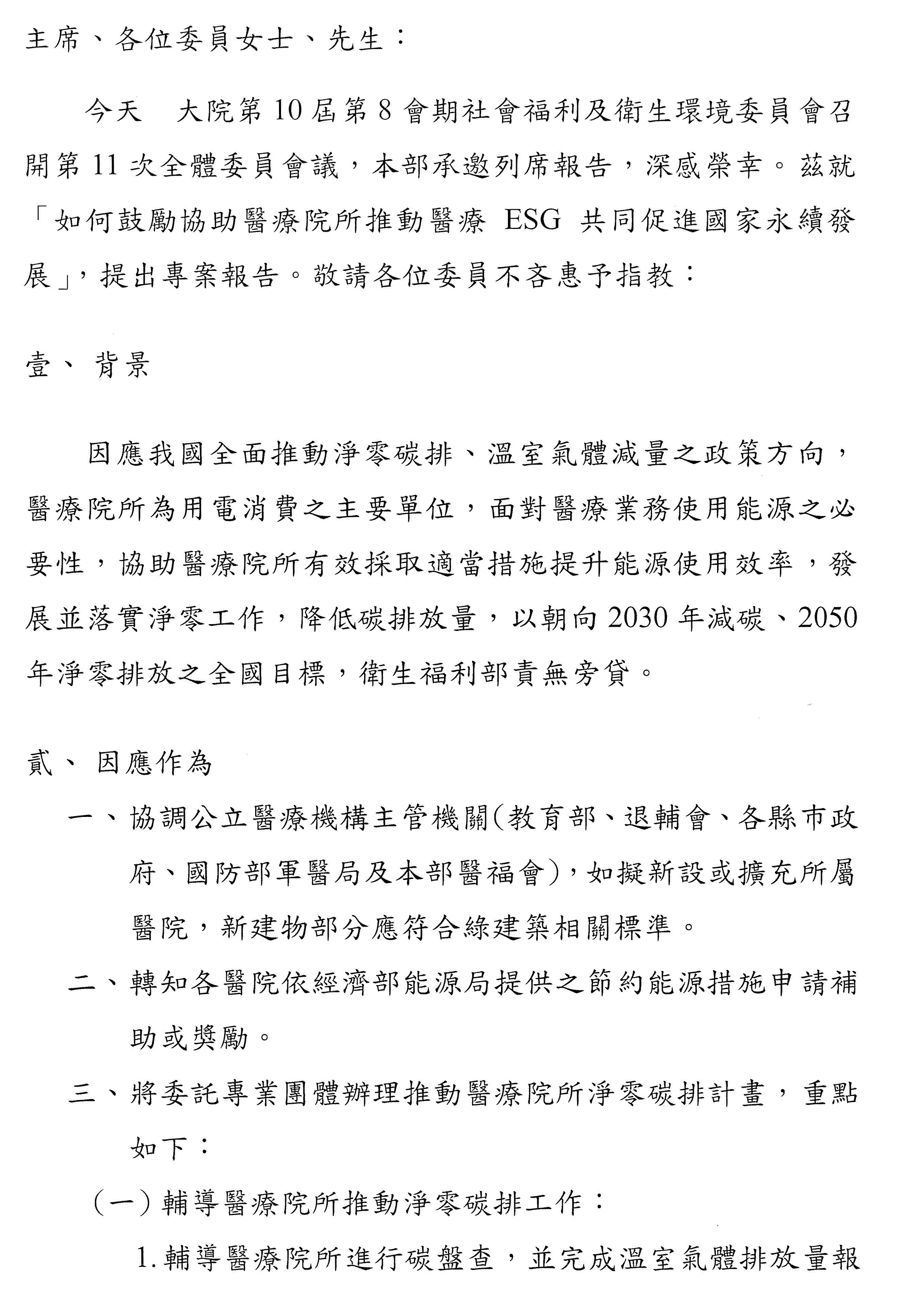 邀請環境部、衛生福利部就「如何鼓勵協助醫療院所推動醫療ESG共同促進國家永續發展」進行專題報告,並備質詢。