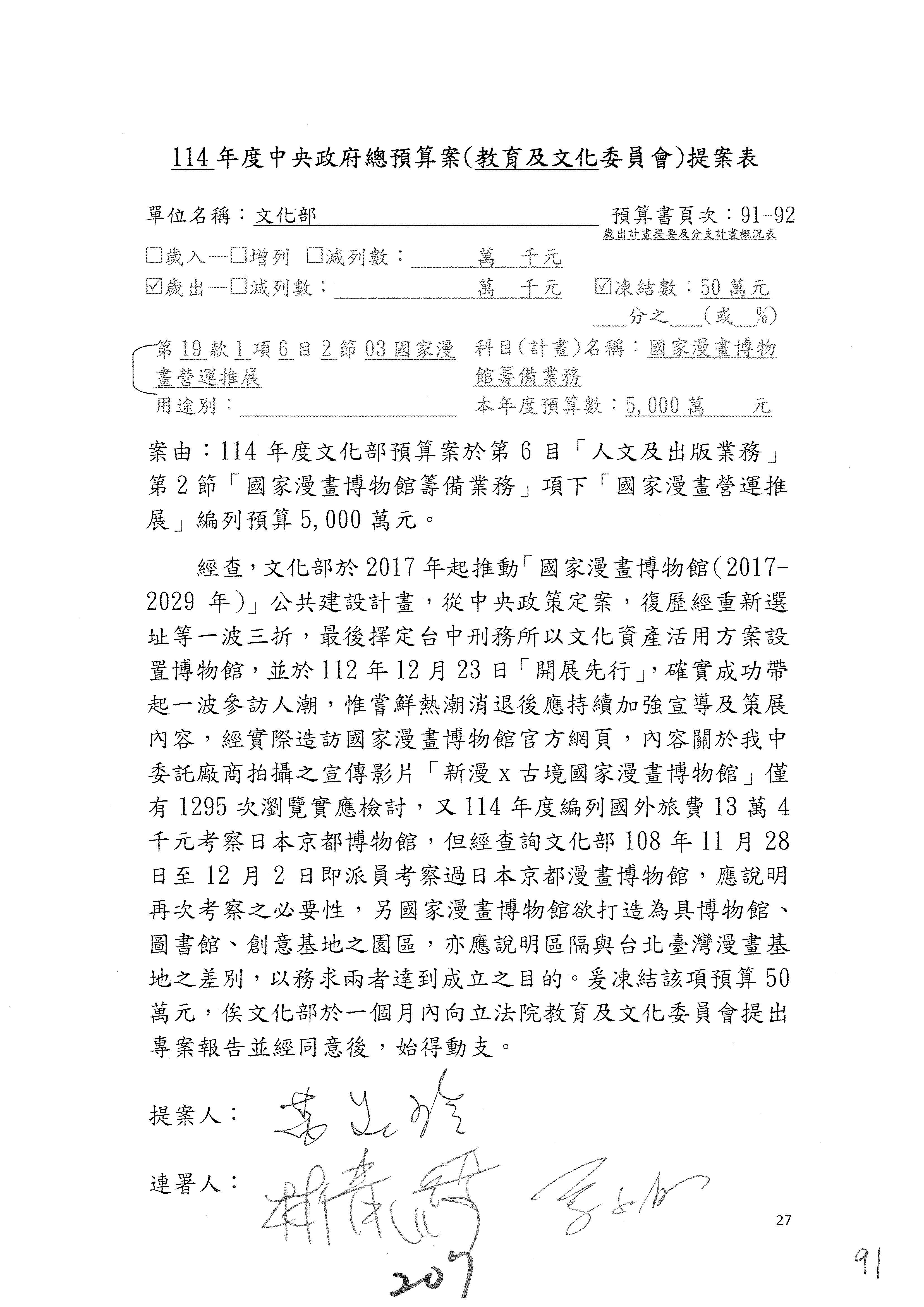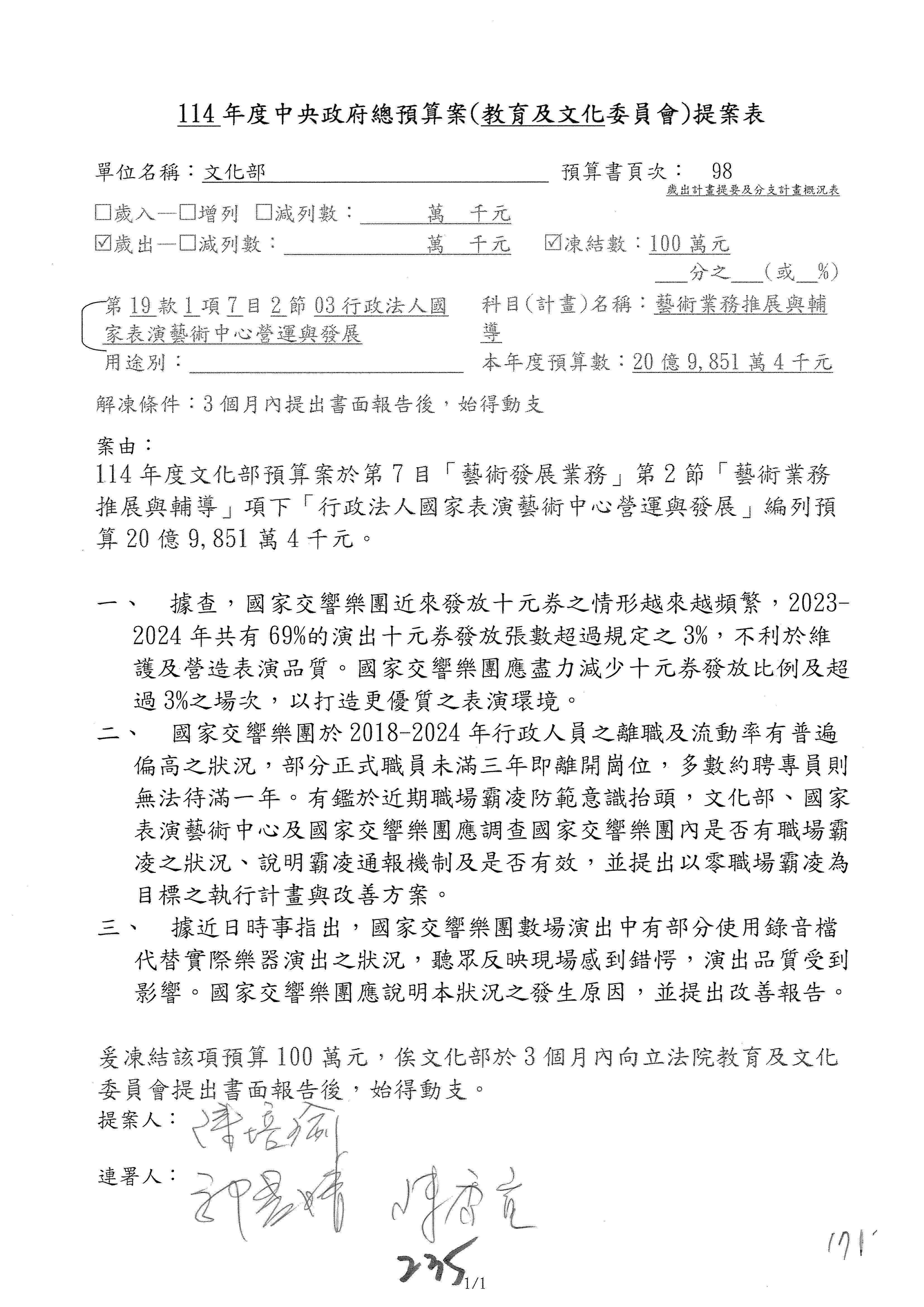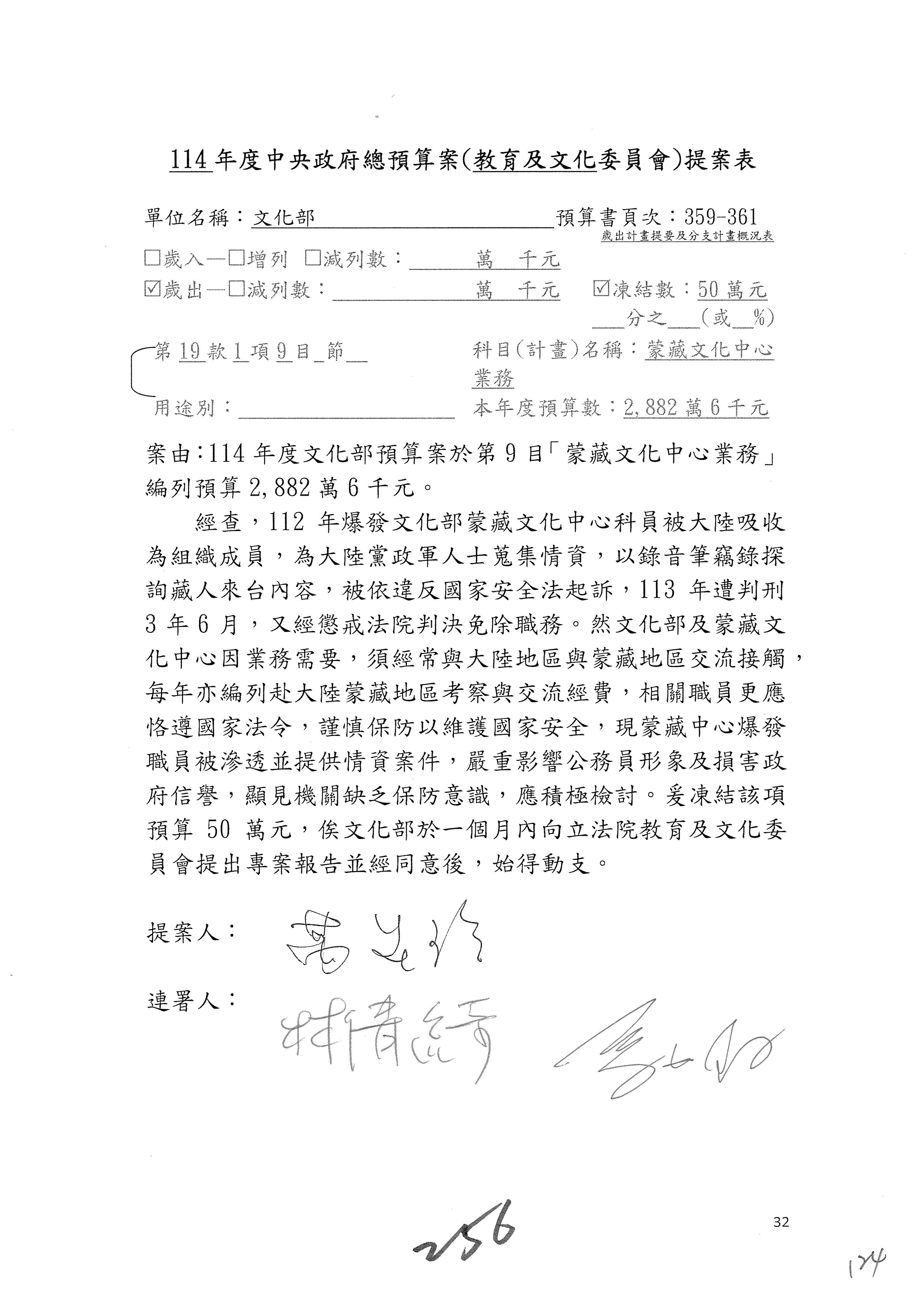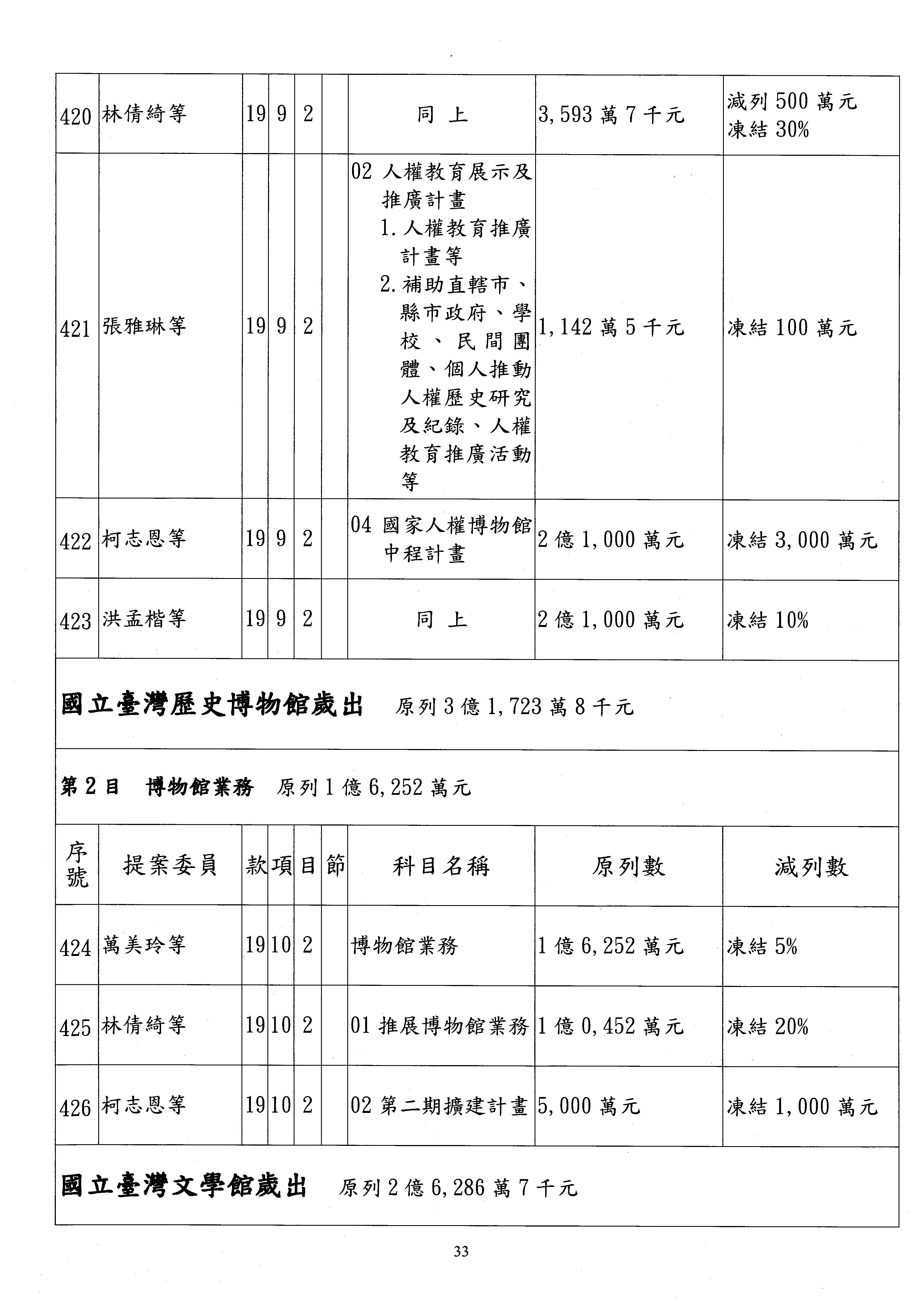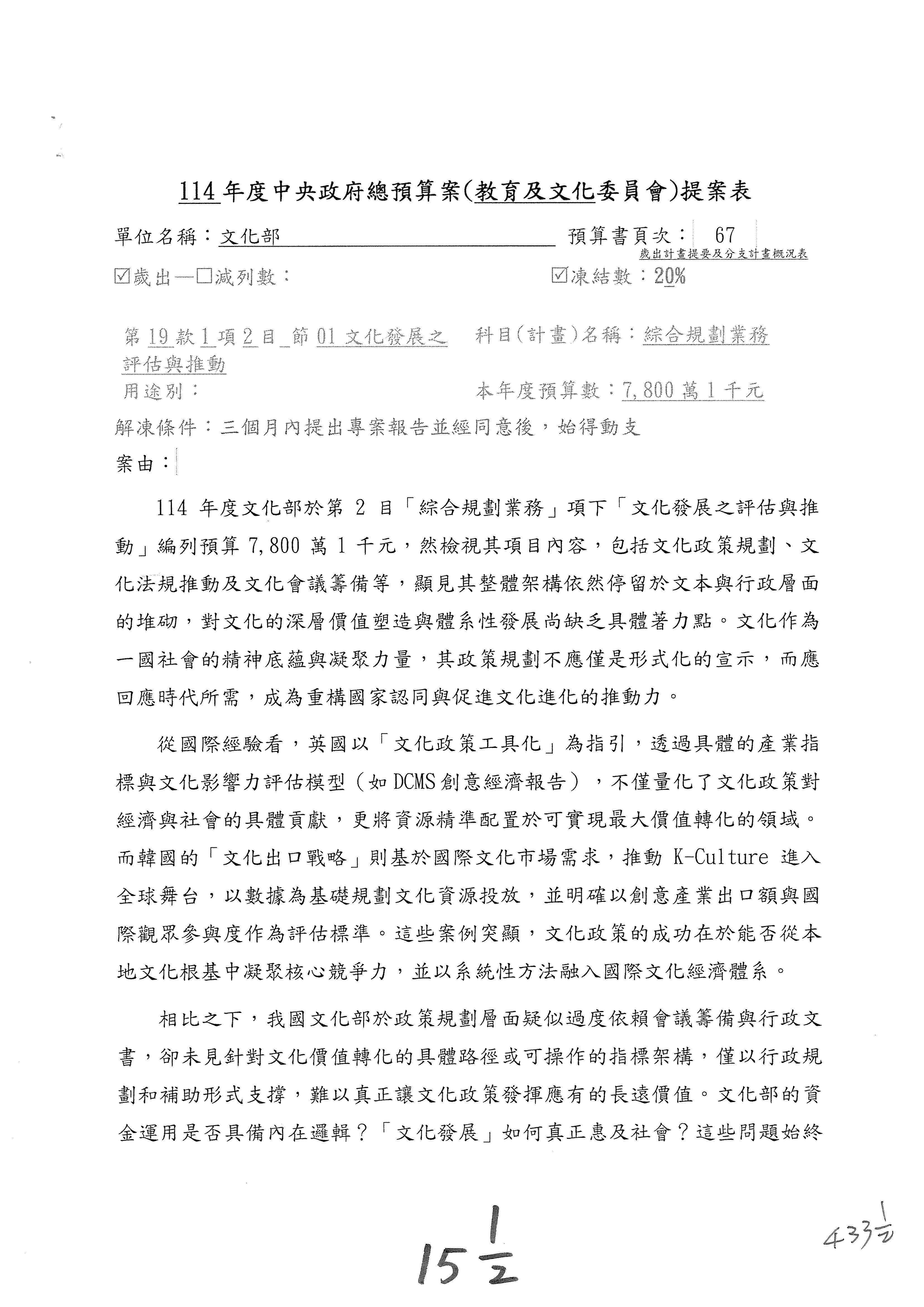 (三)114年度核能安全委員會及所屬第2目「原子能管理發展業務」第1節「原子能科學發展」預算編列27億5,477萬9千元,凍結5,000萬元,俟核能安全委員會向立法院教育及文化委員會提出書面報告後,始得動支。15-42