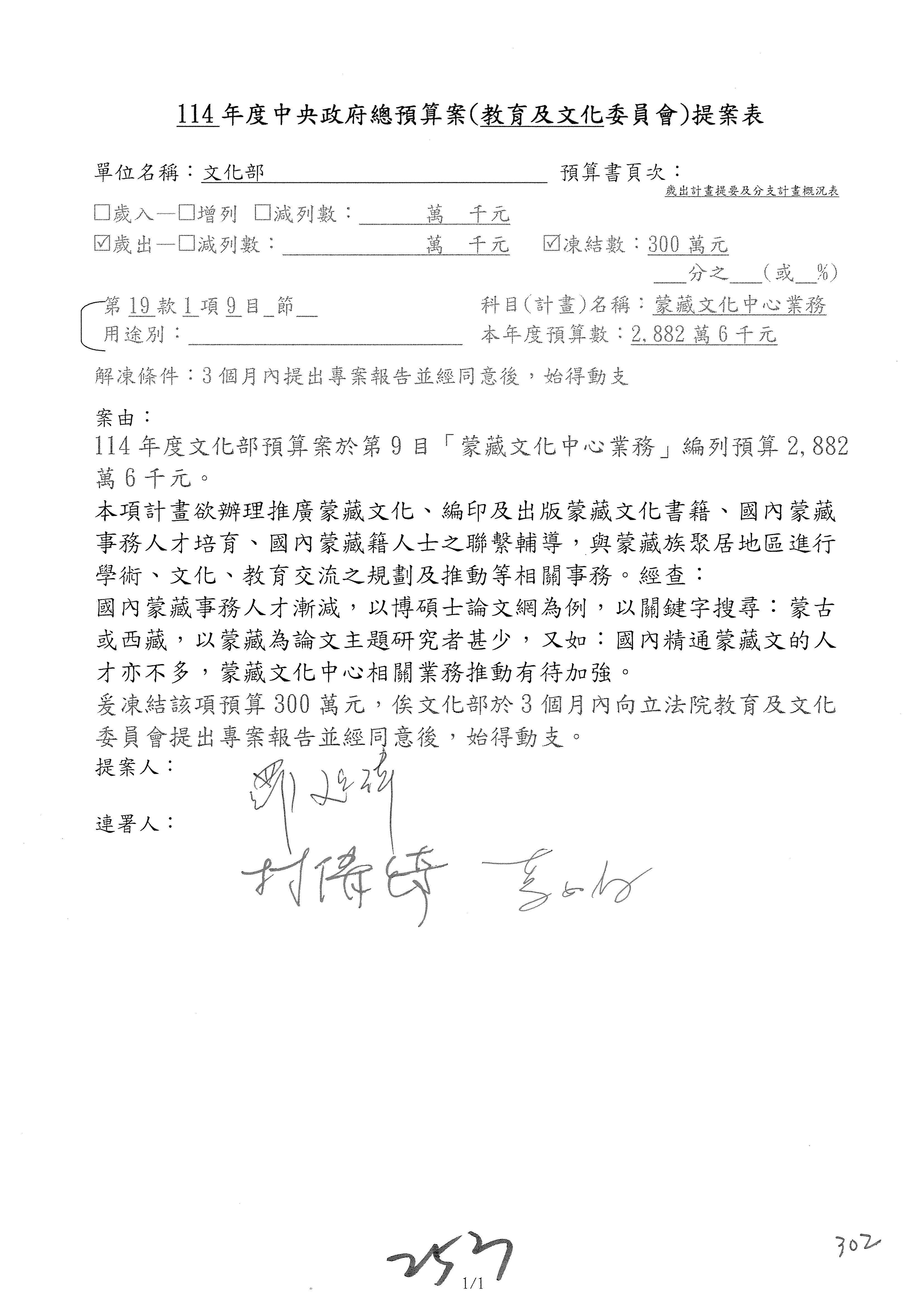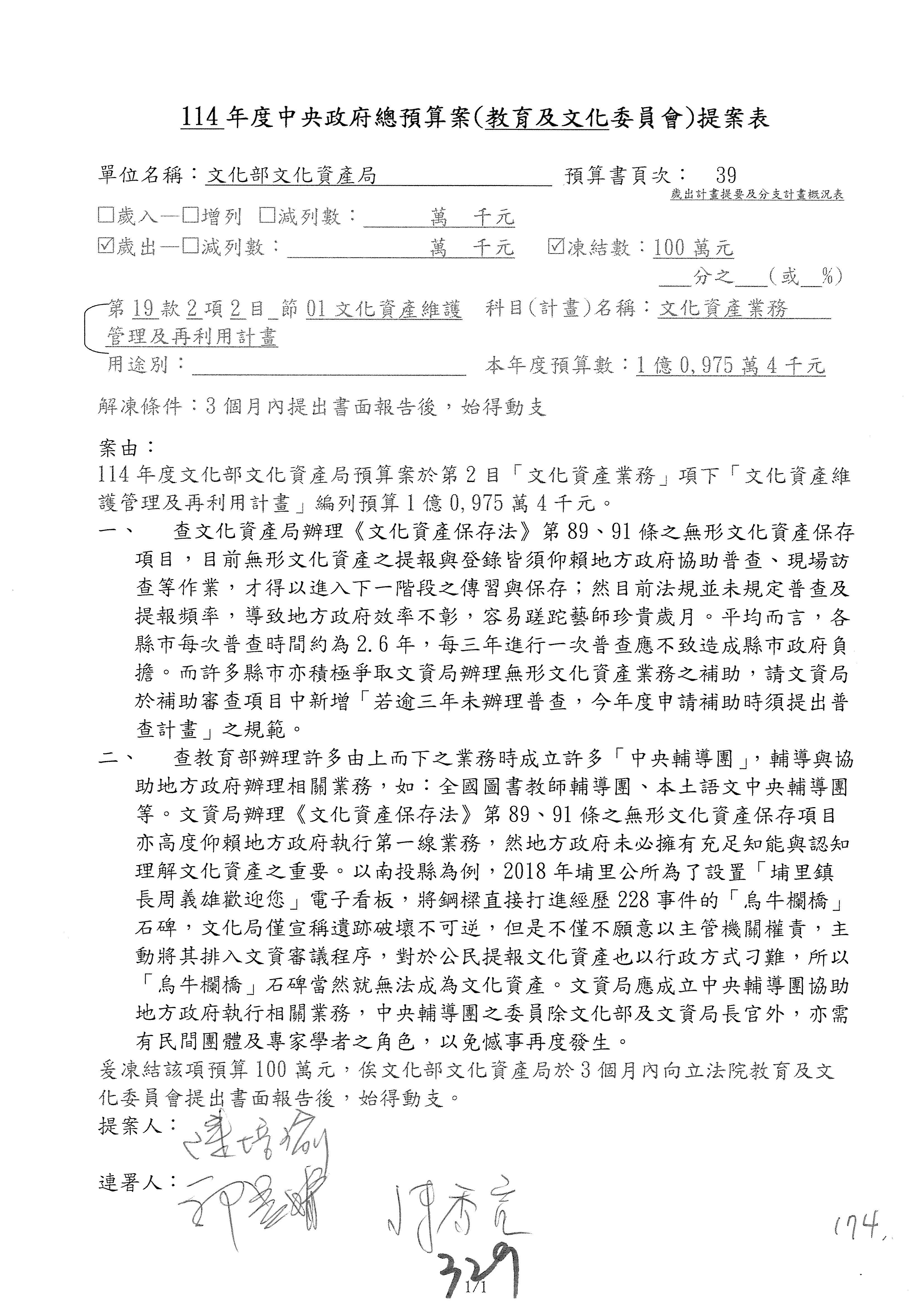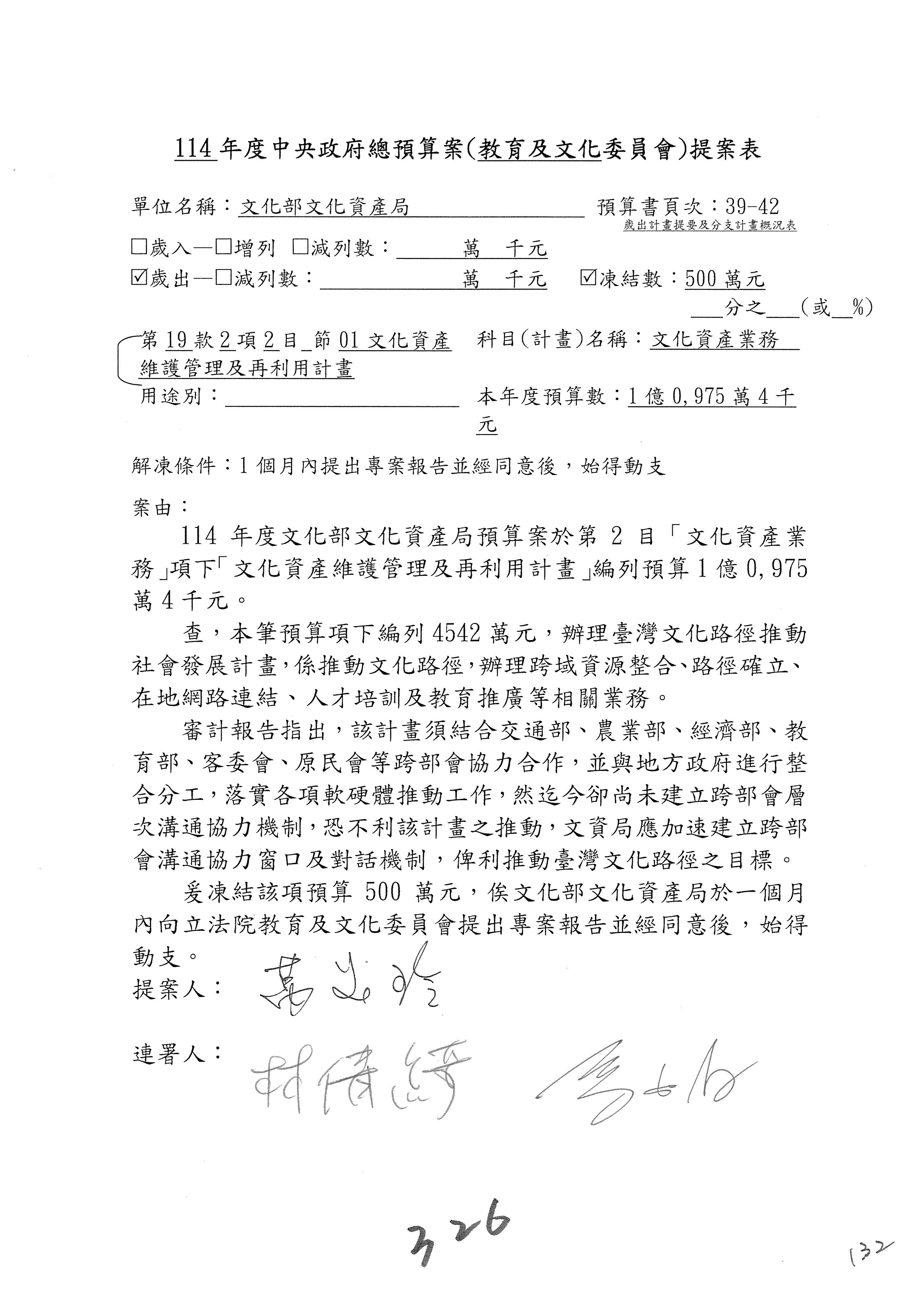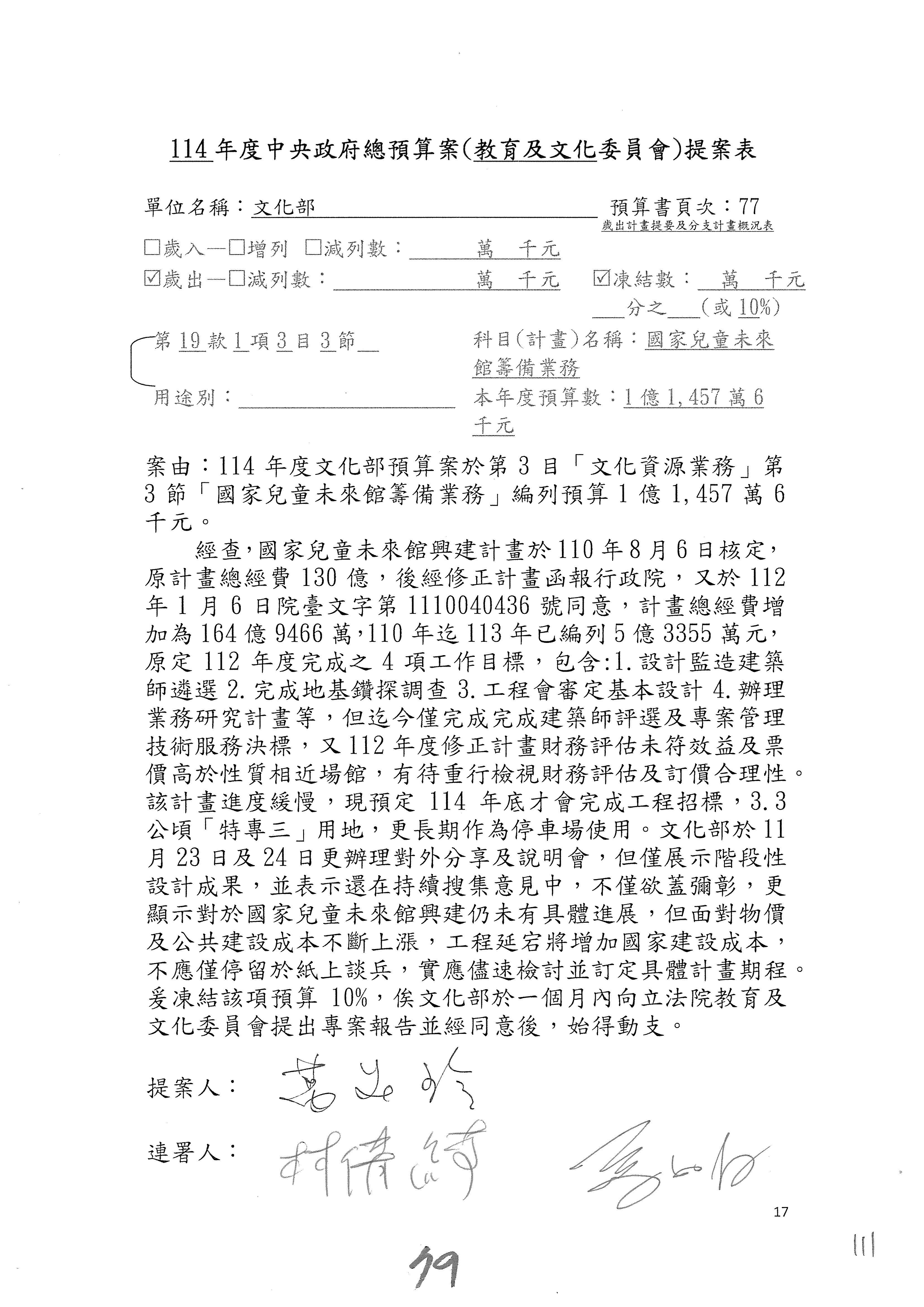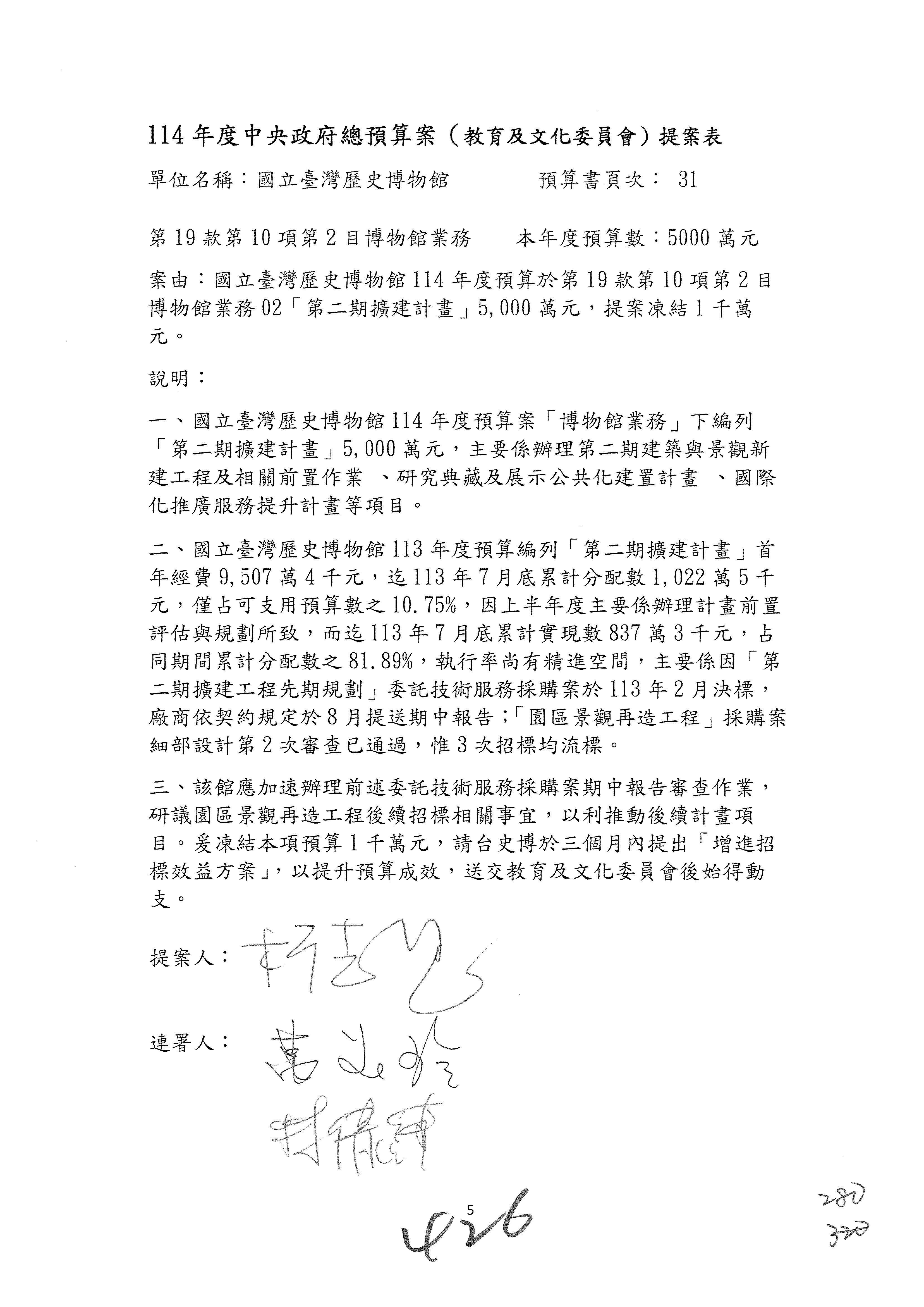 (三)114年度核能安全委員會及所屬第2目「原子能管理發展業務」第1節「原子能科學發展」預算編列27億5,477萬9千元,凍結5,000萬元,俟核能安全委員會向立法院教育及文化委員會提出書面報告後,始得動支。15-42