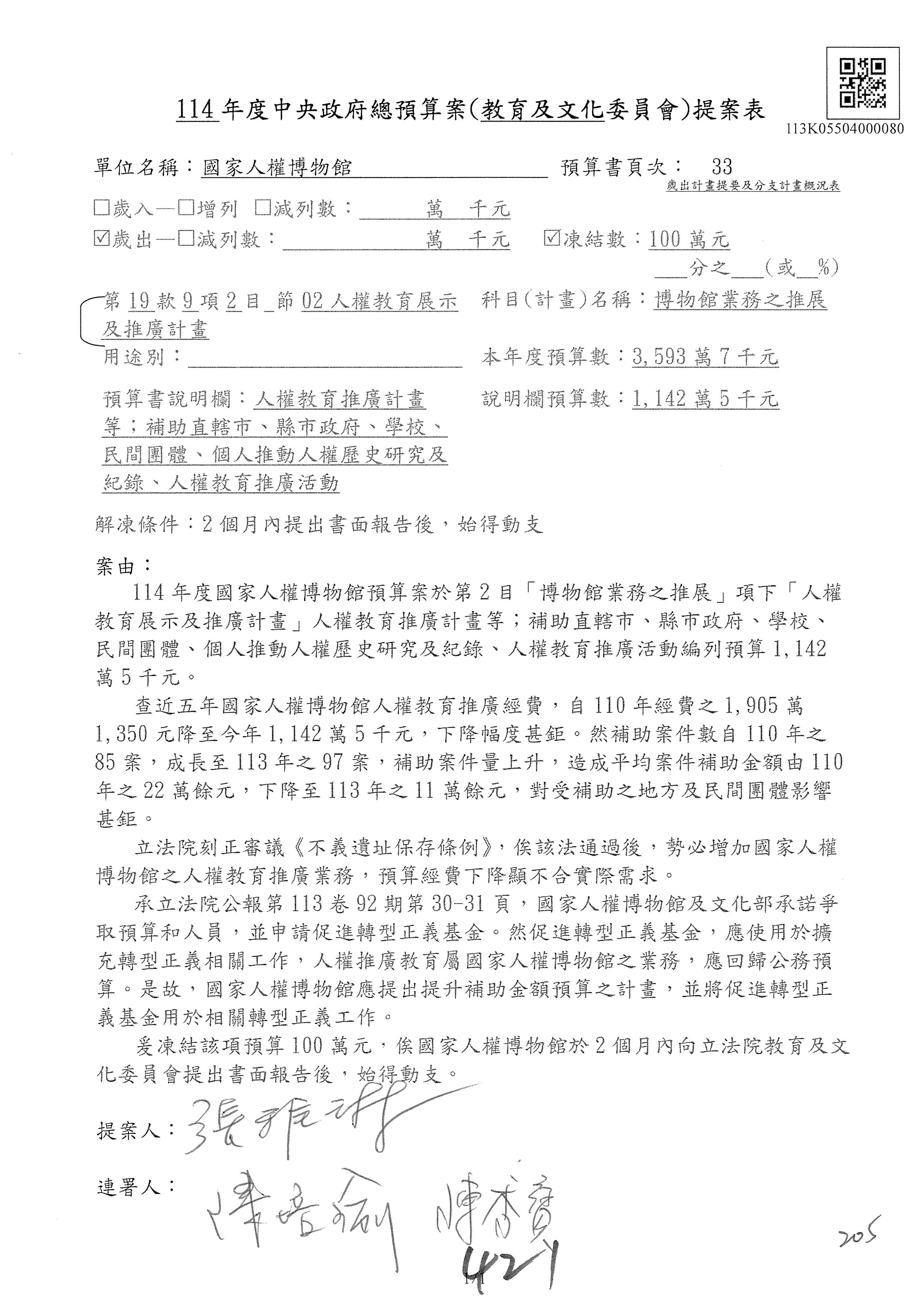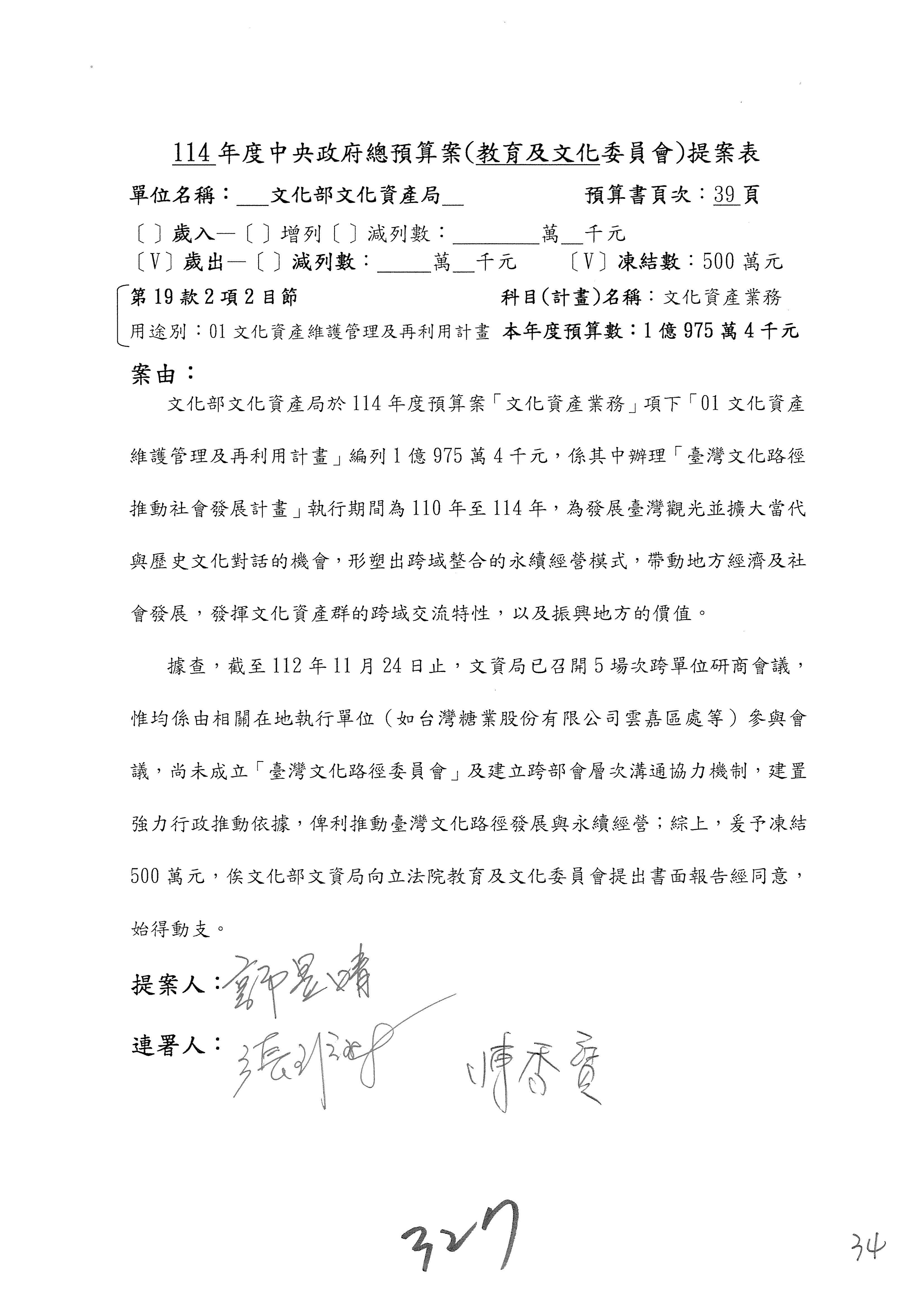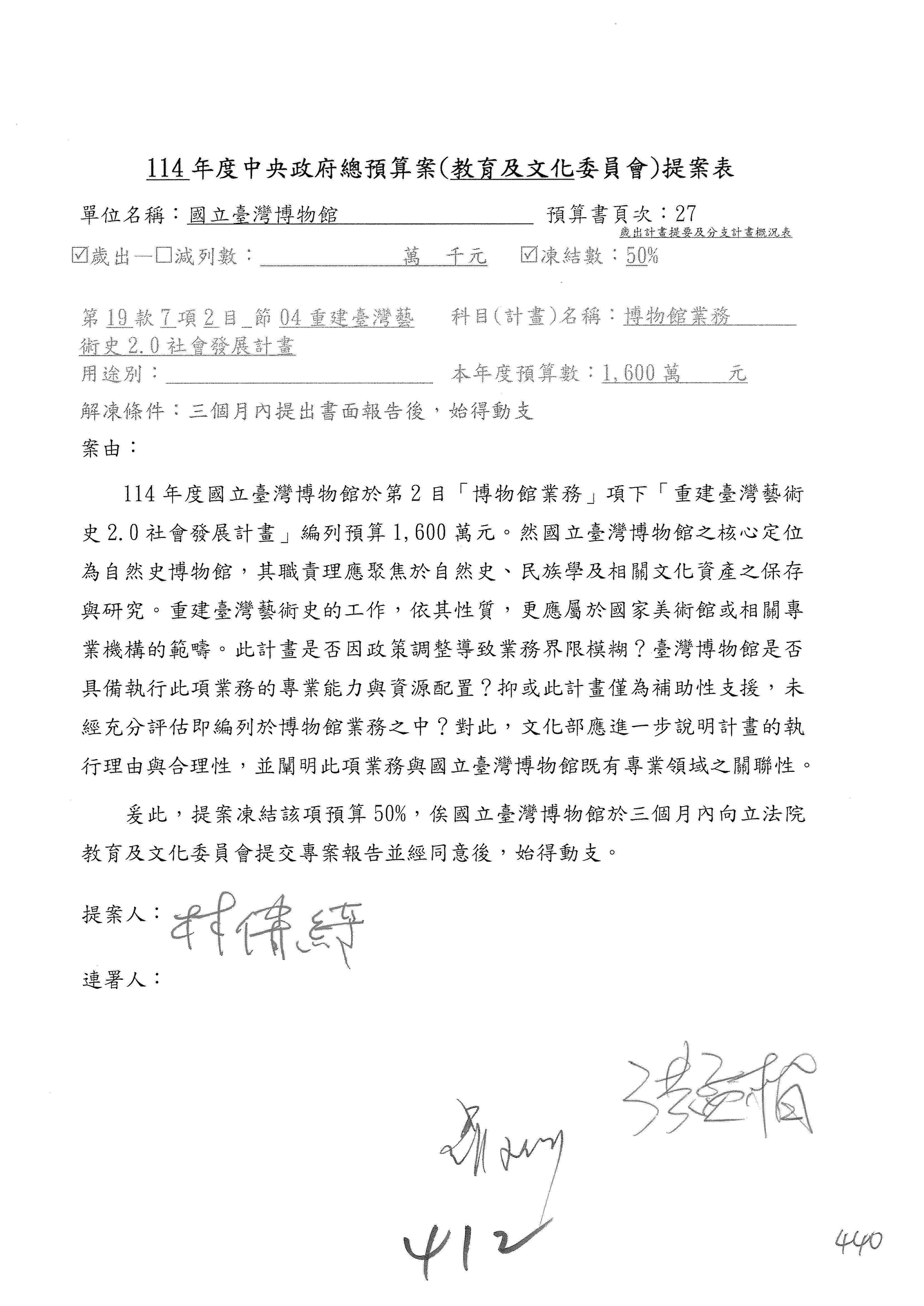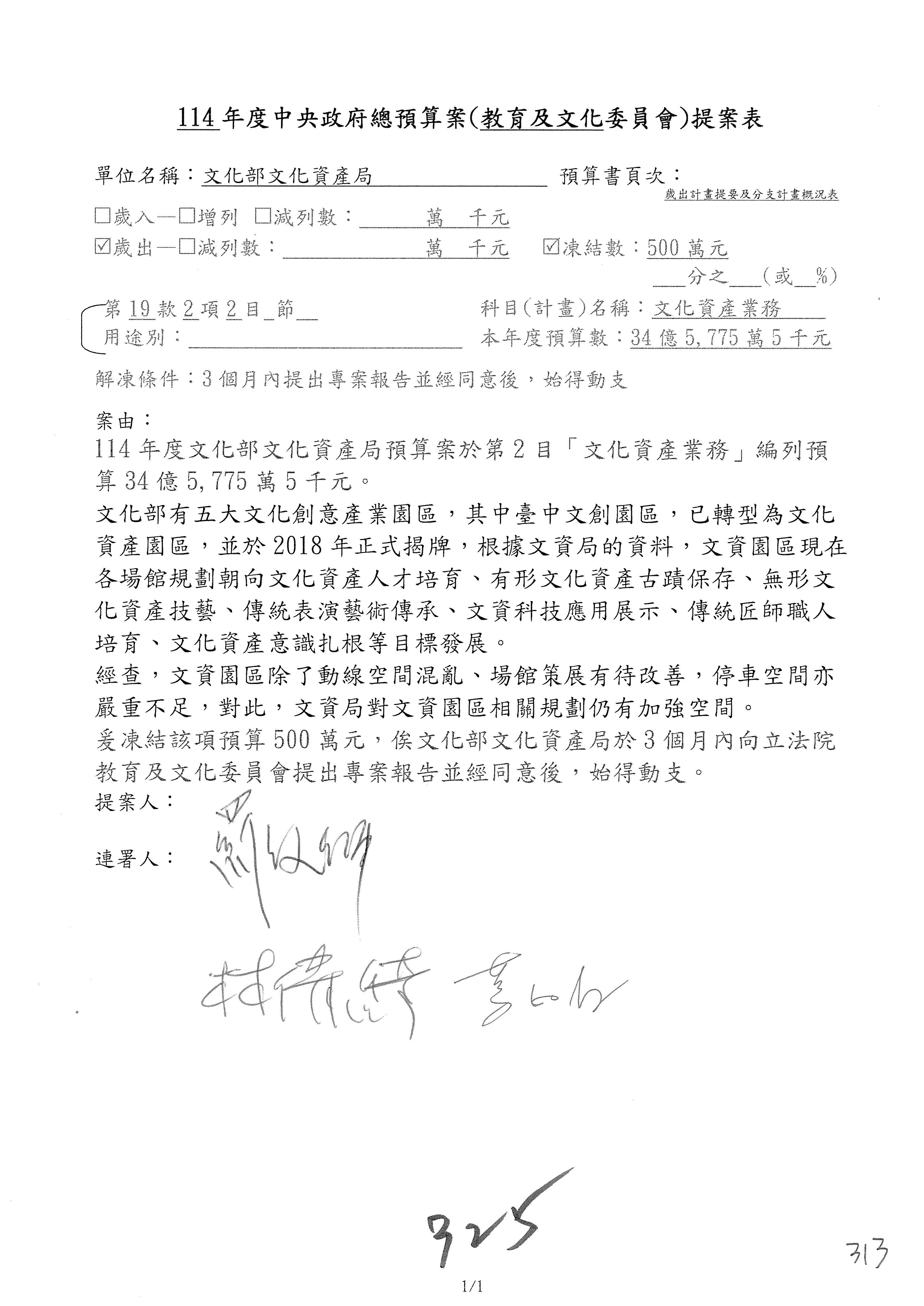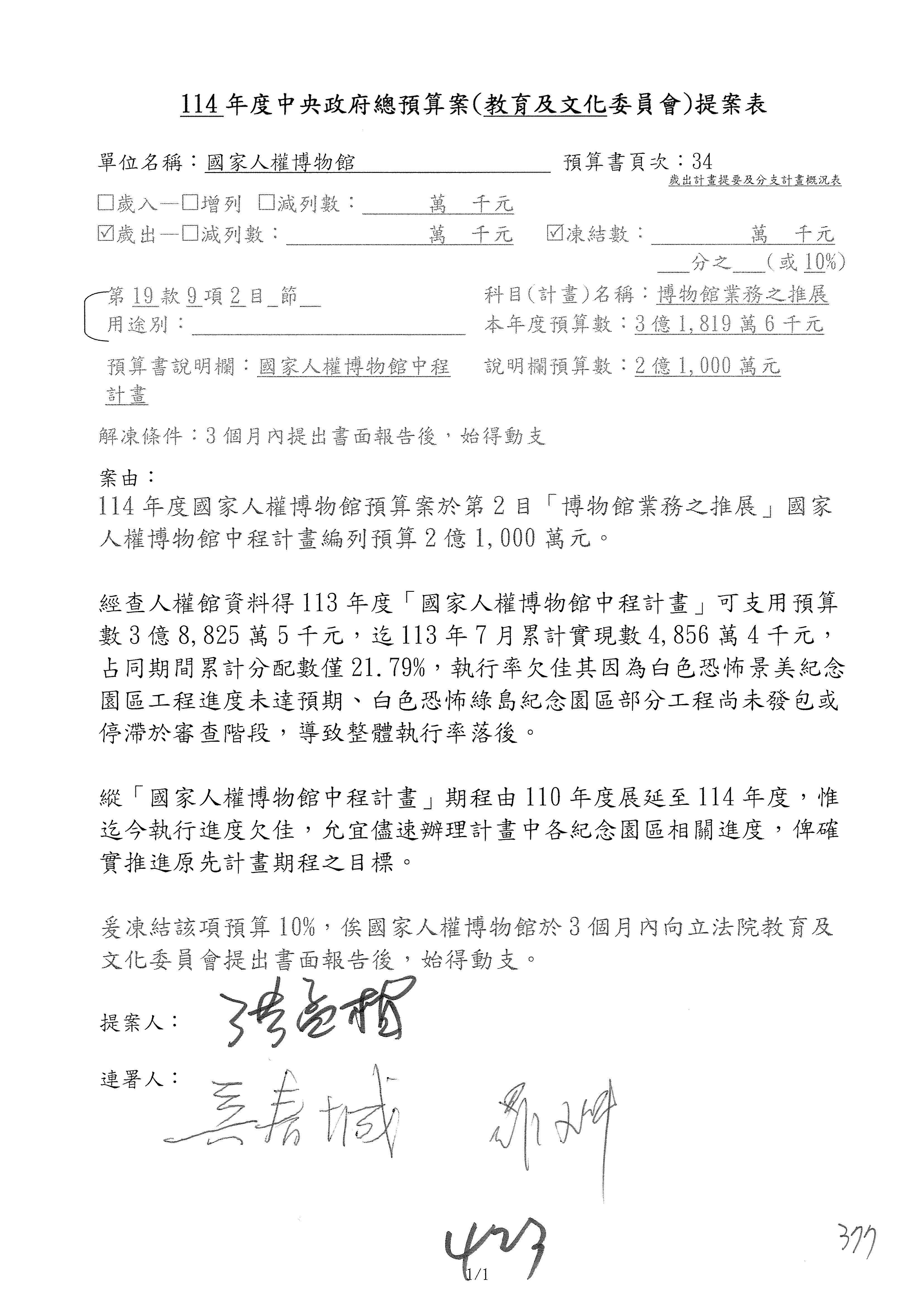 (三)114年度核能安全委員會及所屬第2目「原子能管理發展業務」第1節「原子能科學發展」預算編列27億5,477萬9千元,凍結5,000萬元,俟核能安全委員會向立法院教育及文化委員會提出書面報告後,始得動支。15-42