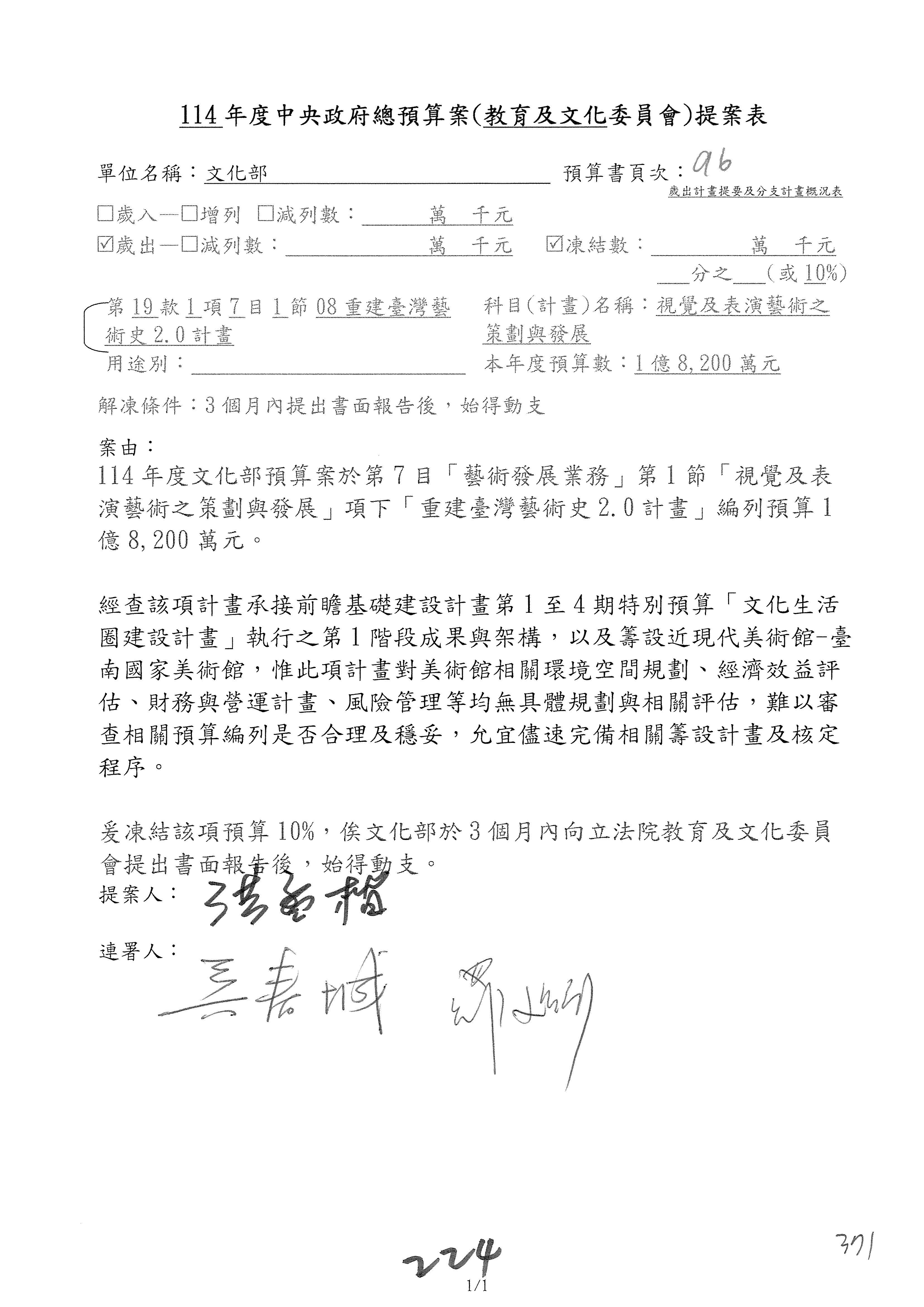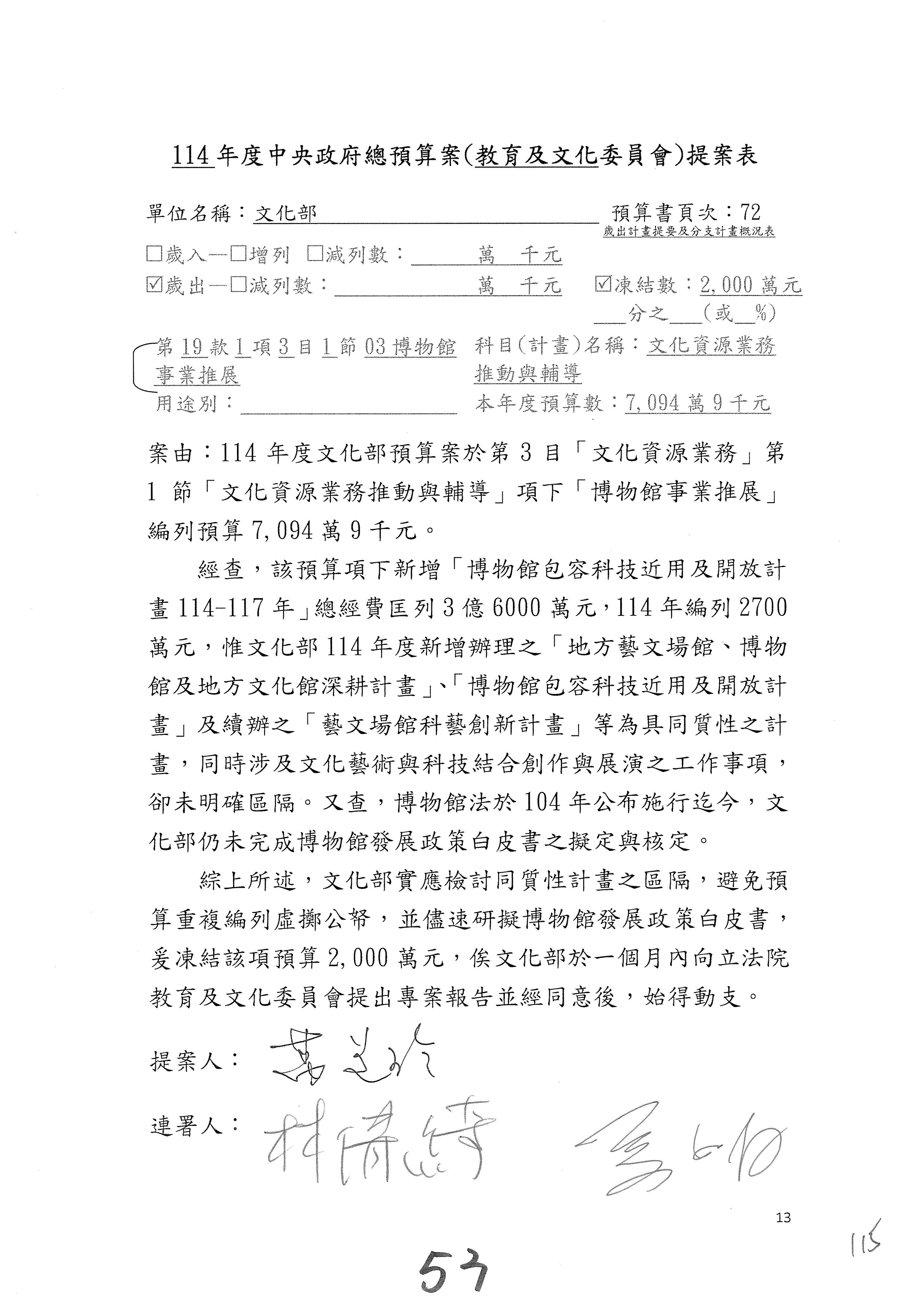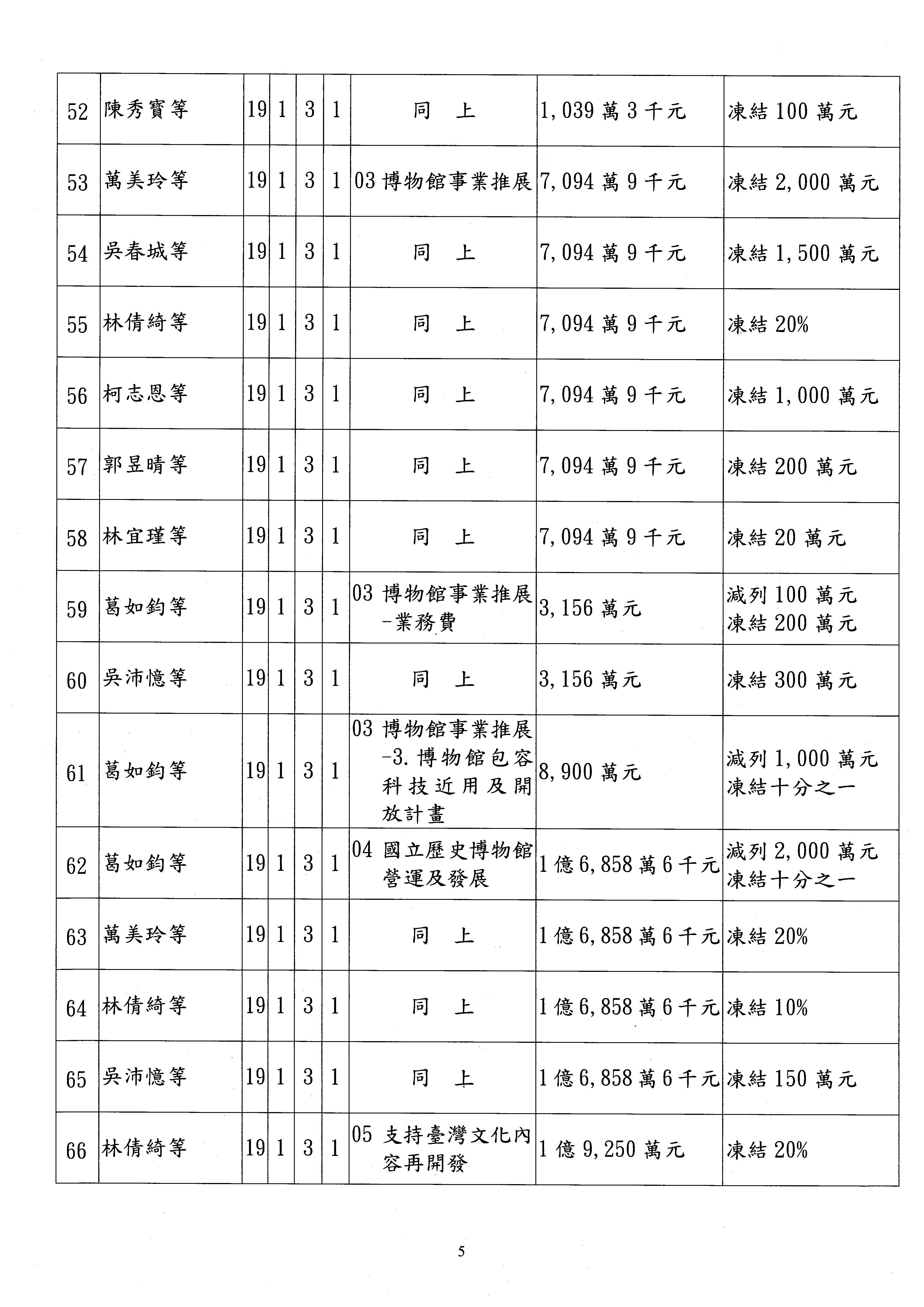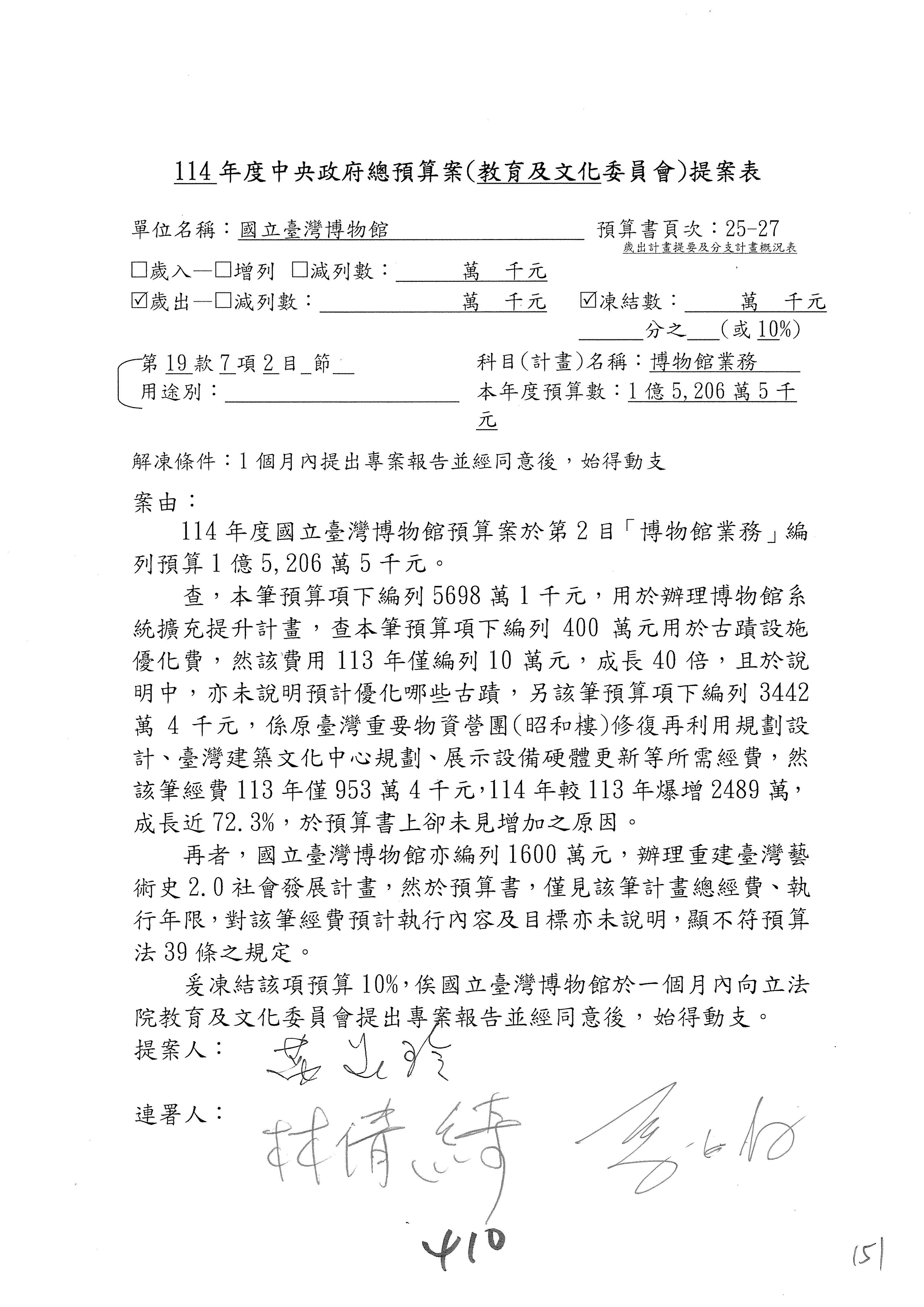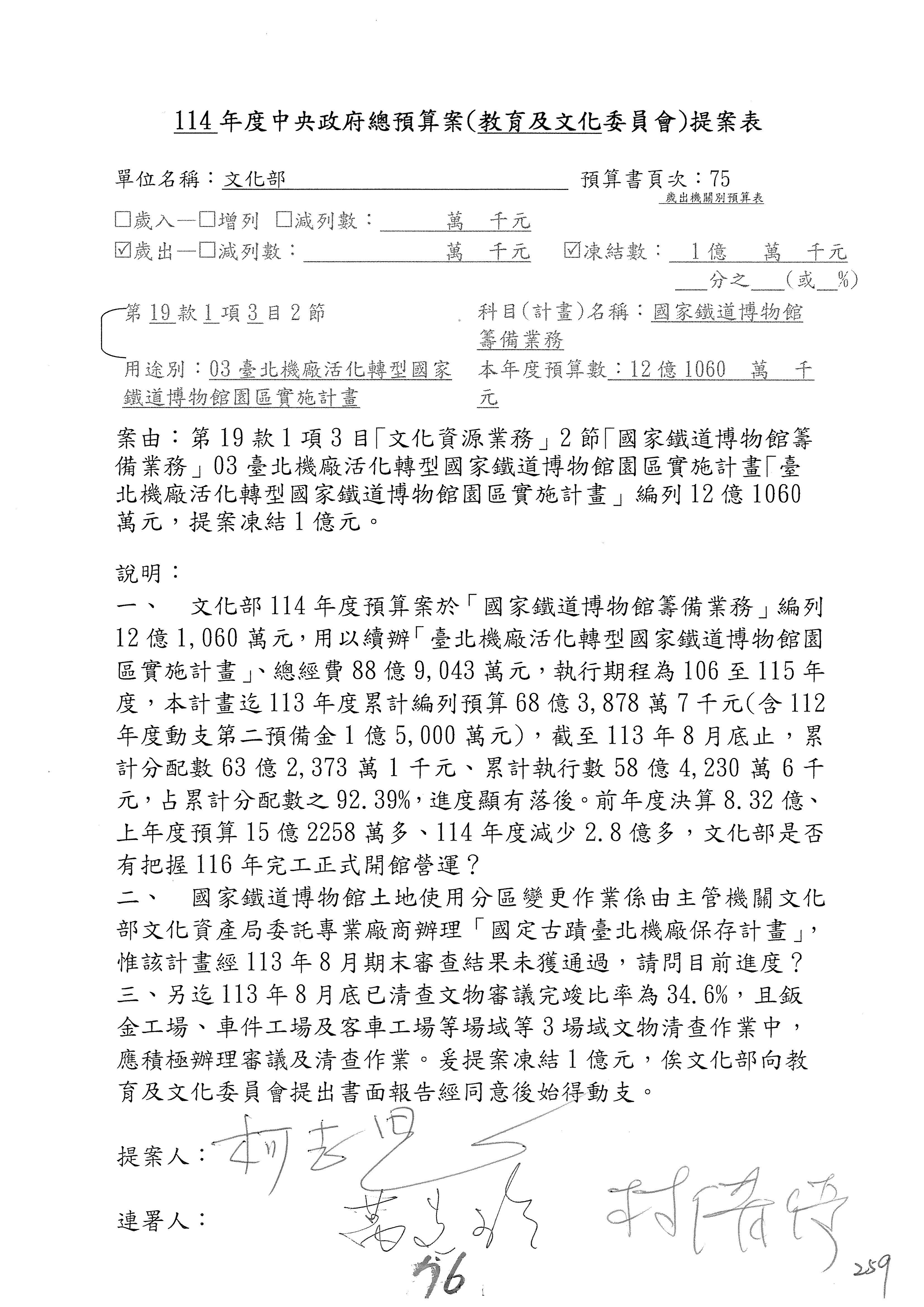 (三)114年度核能安全委員會及所屬第2目「原子能管理發展業務」第1節「原子能科學發展」預算編列27億5,477萬9千元,凍結5,000萬元,俟核能安全委員會向立法院教育及文化委員會提出書面報告後,始得動支。15-42