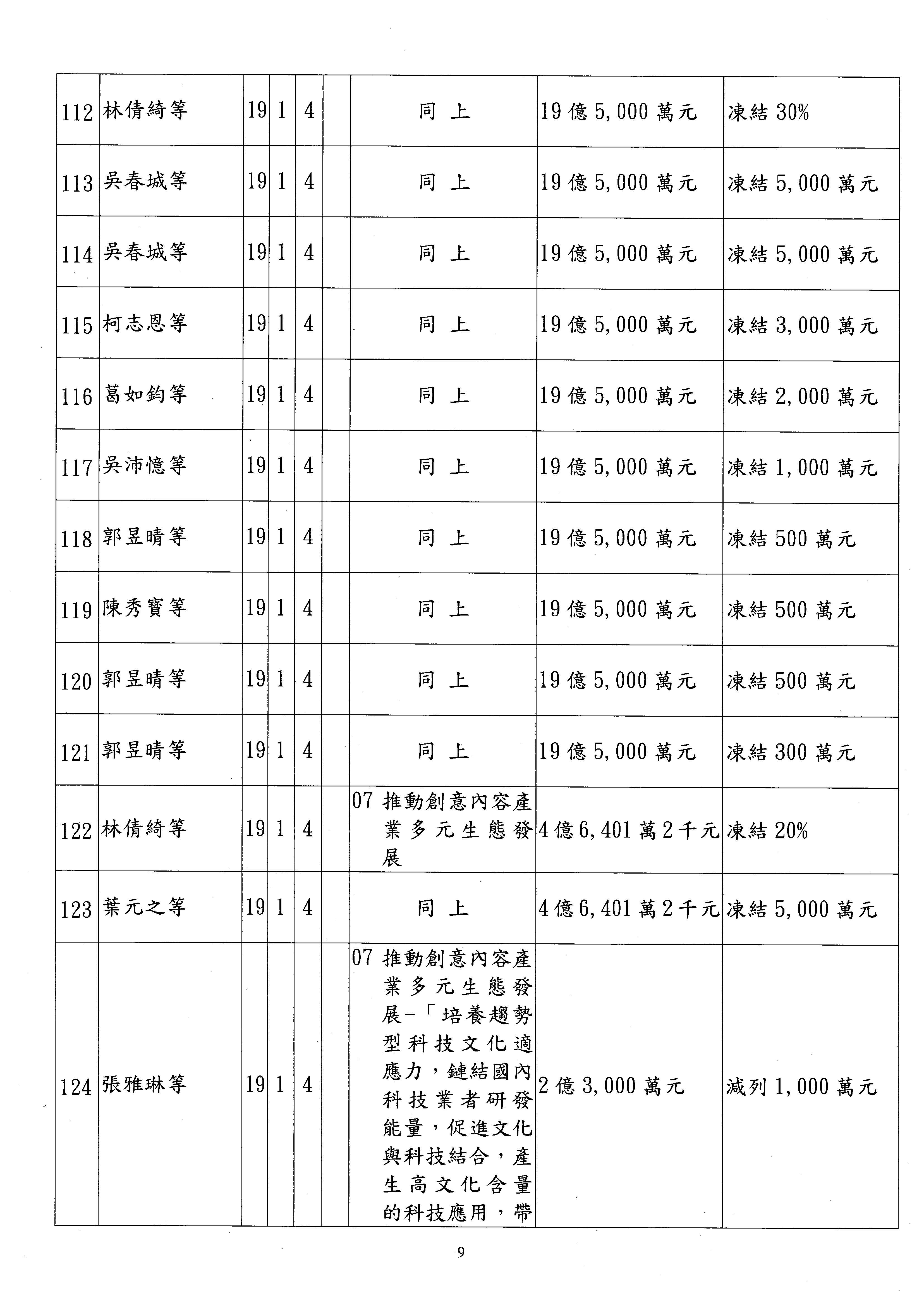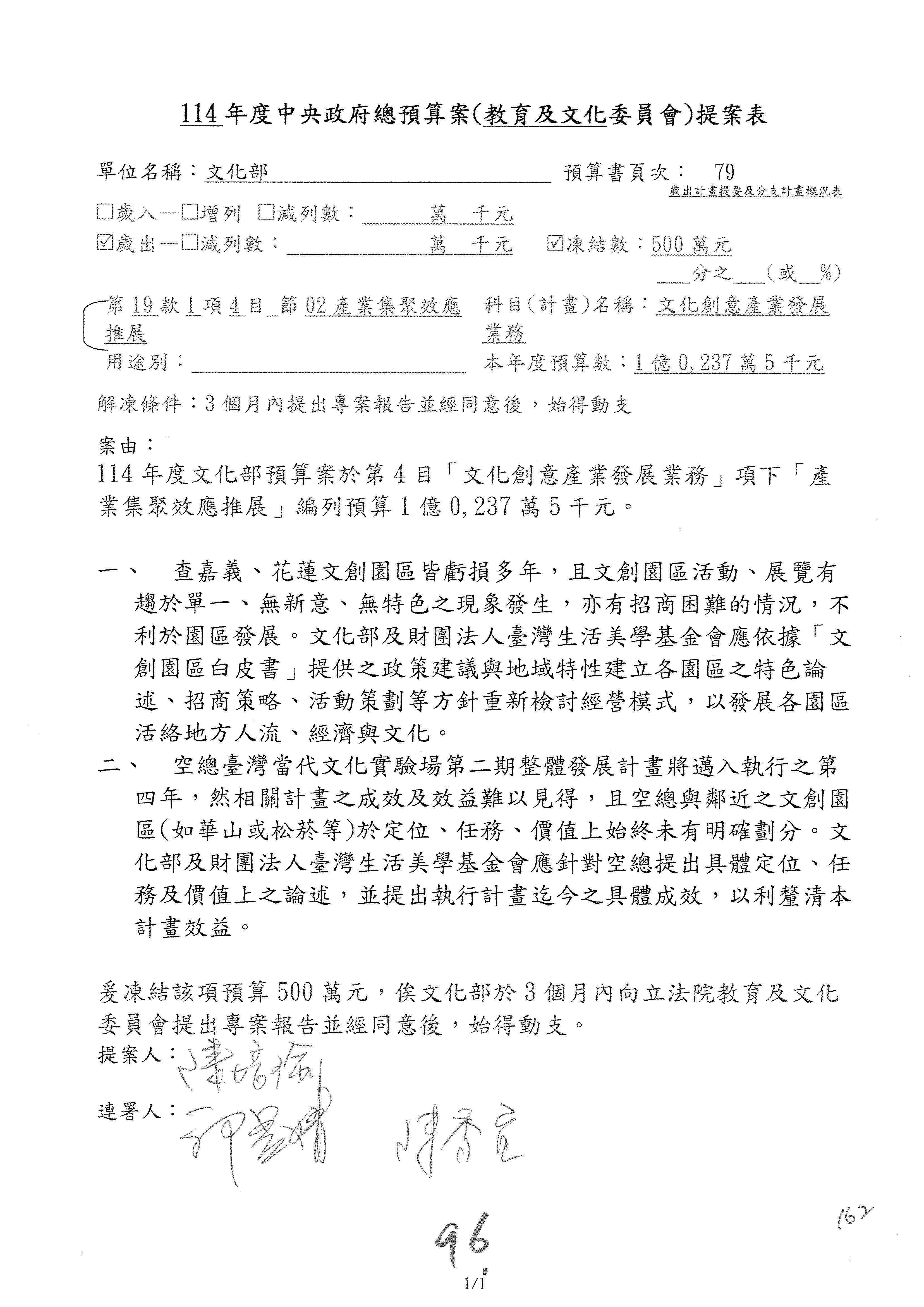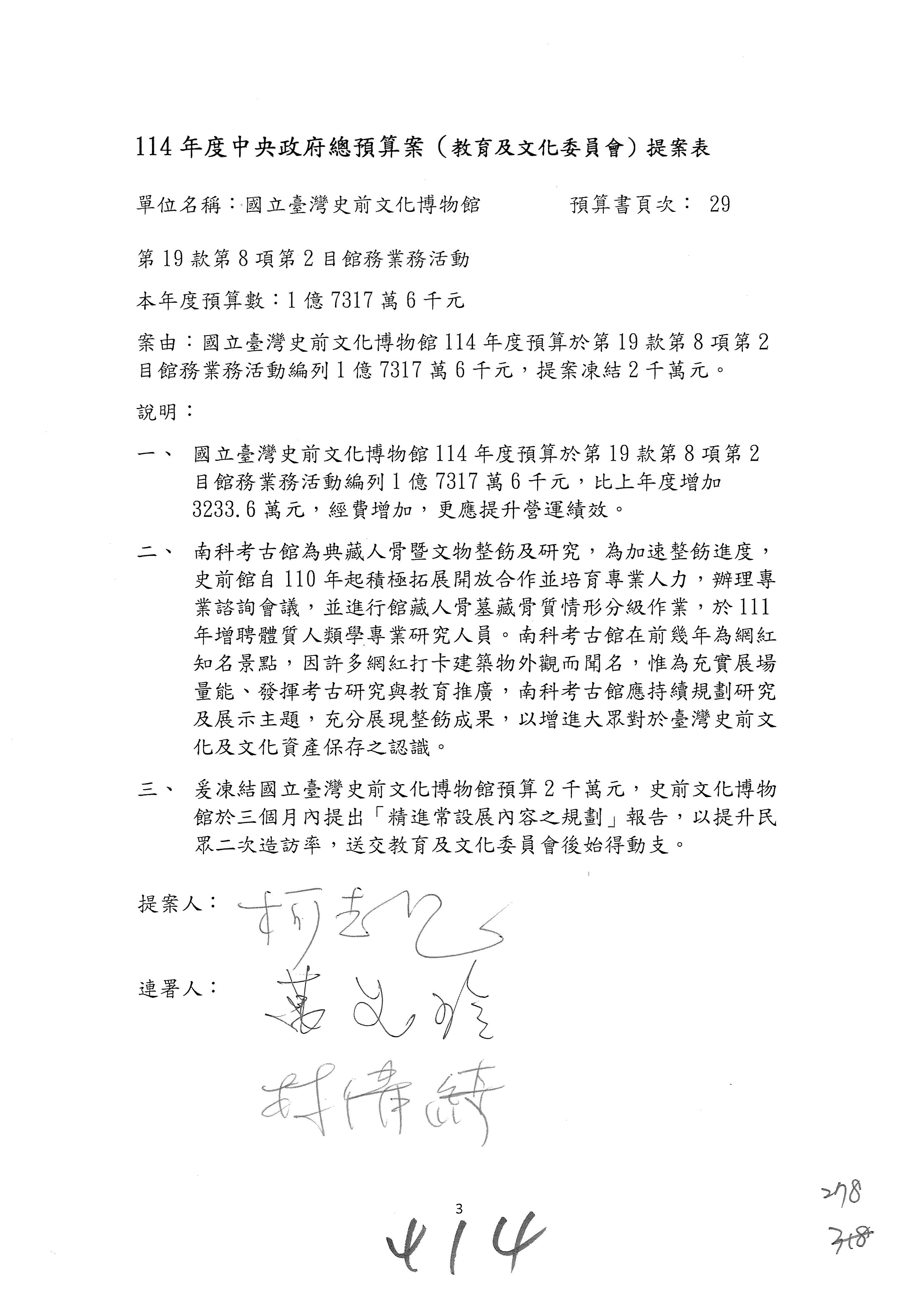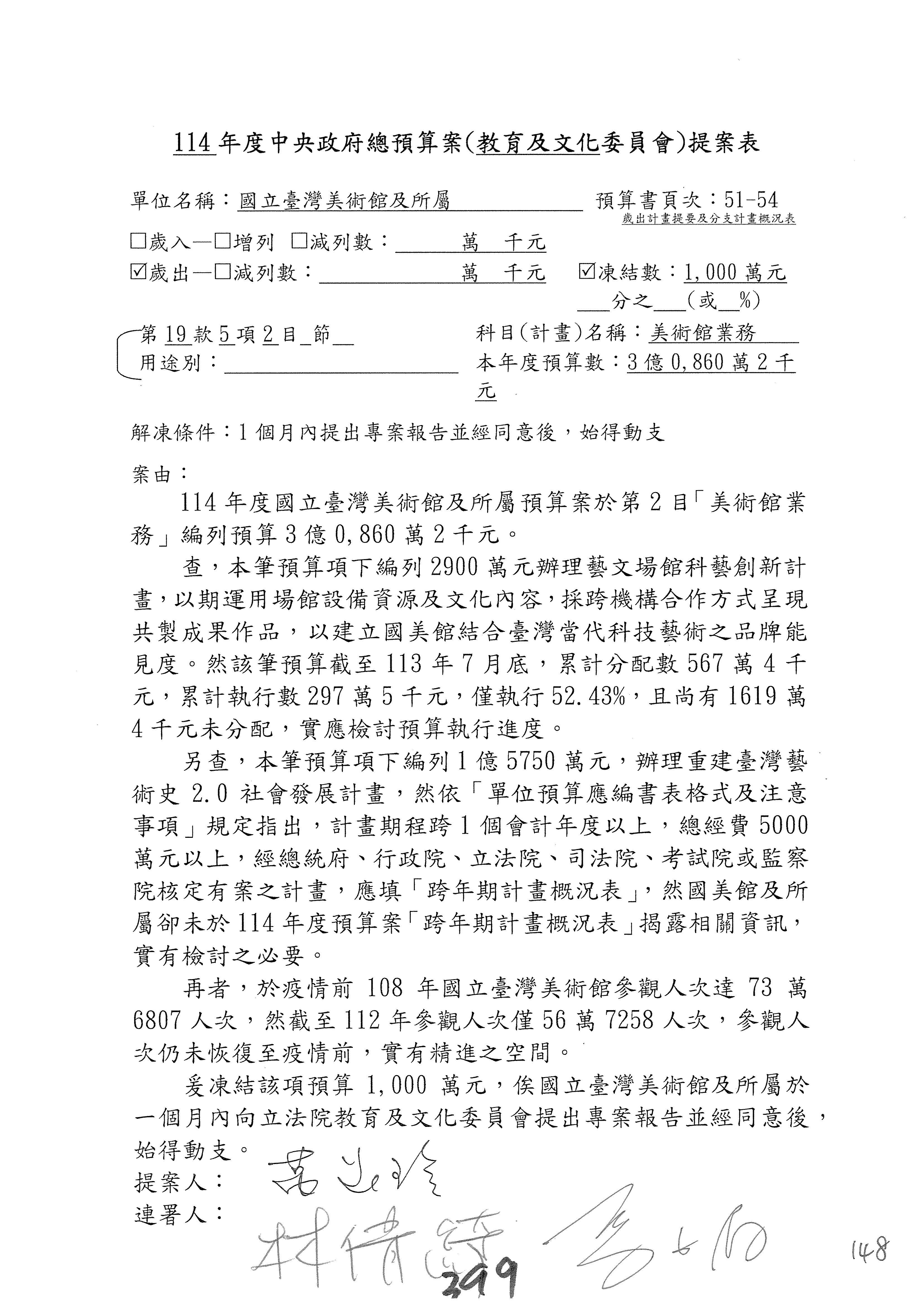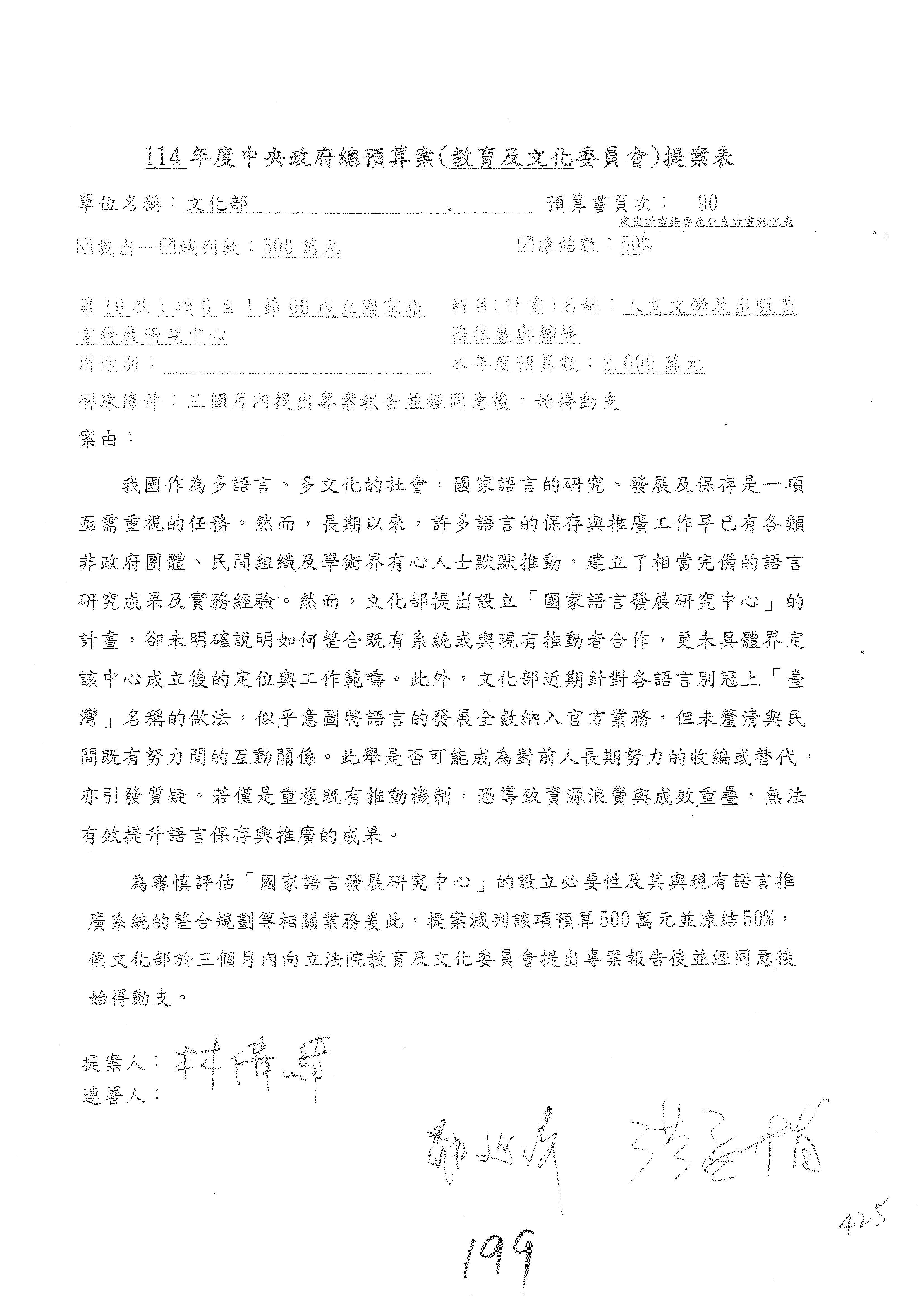 (三)114年度核能安全委員會及所屬第2目「原子能管理發展業務」第1節「原子能科學發展」預算編列27億5,477萬9千元,凍結5,000萬元,俟核能安全委員會向立法院教育及文化委員會提出書面報告後,始得動支。15-42
