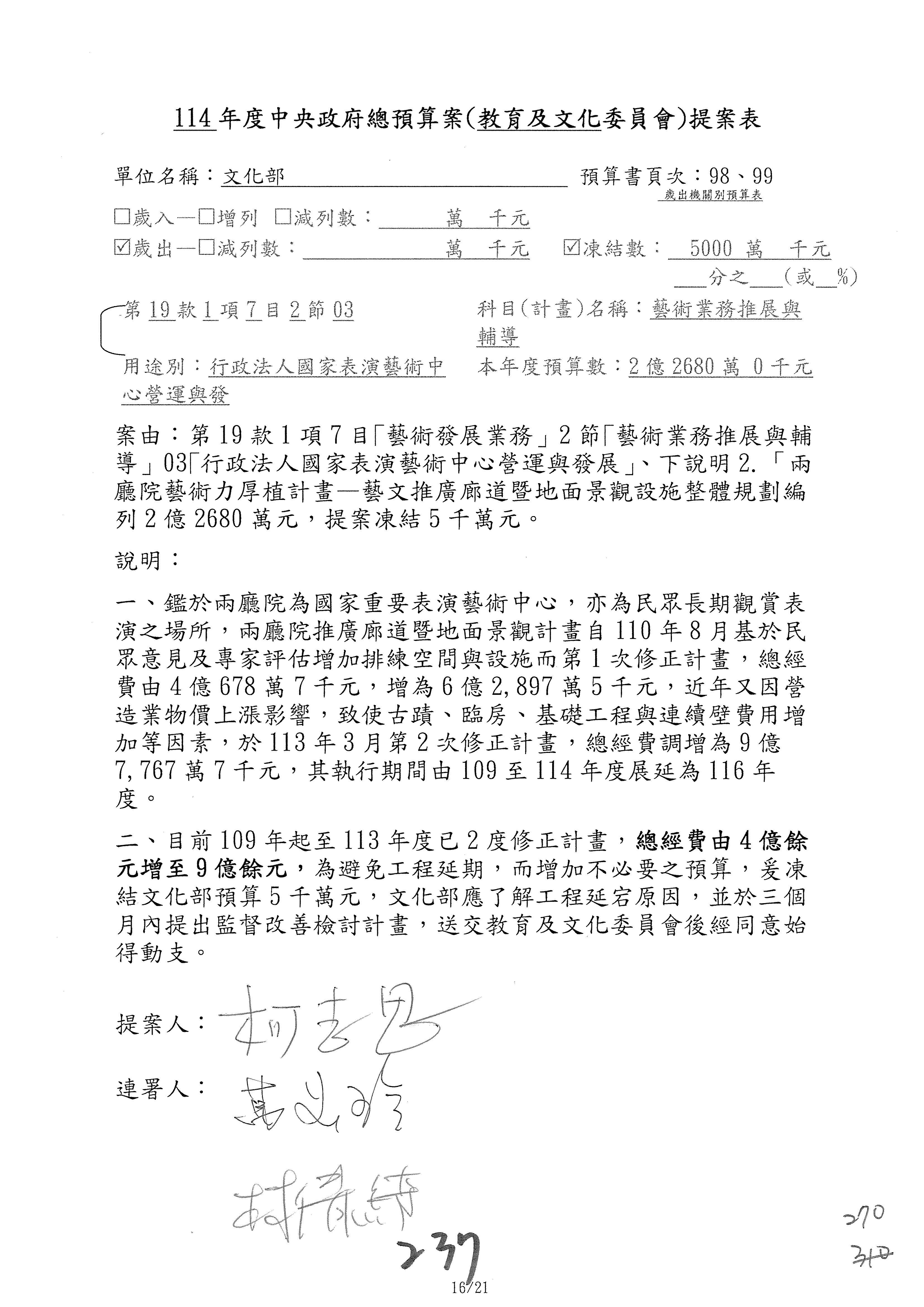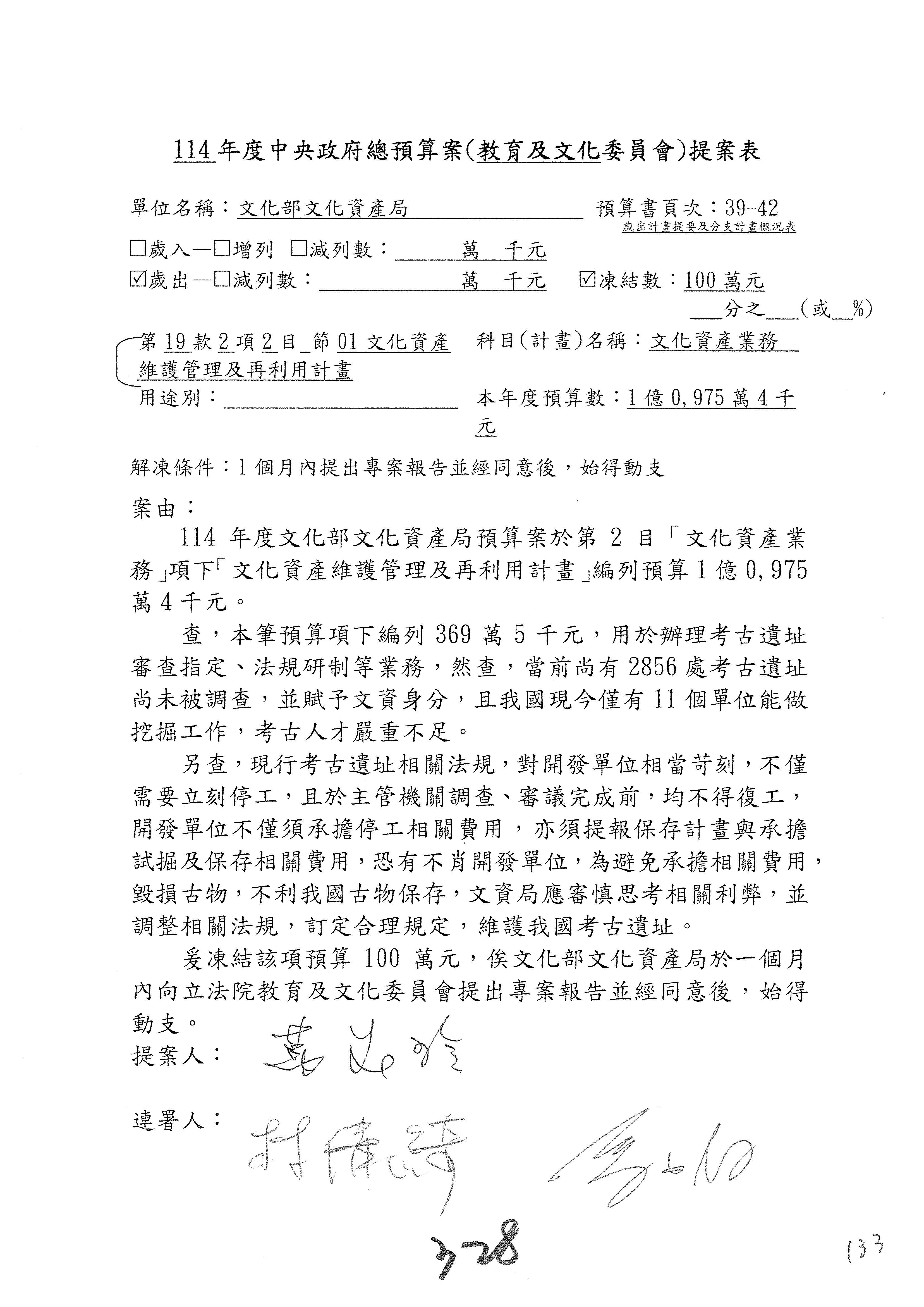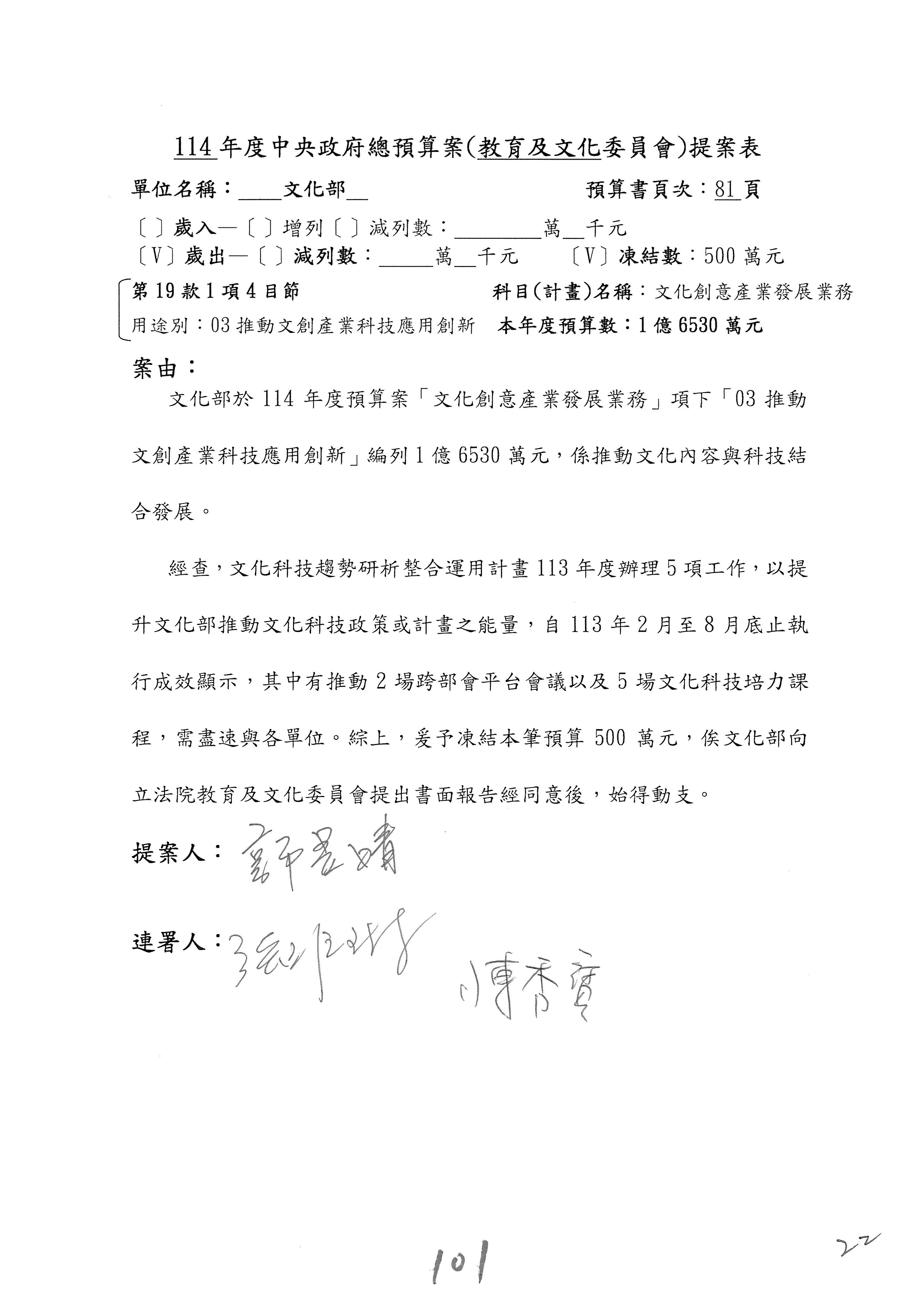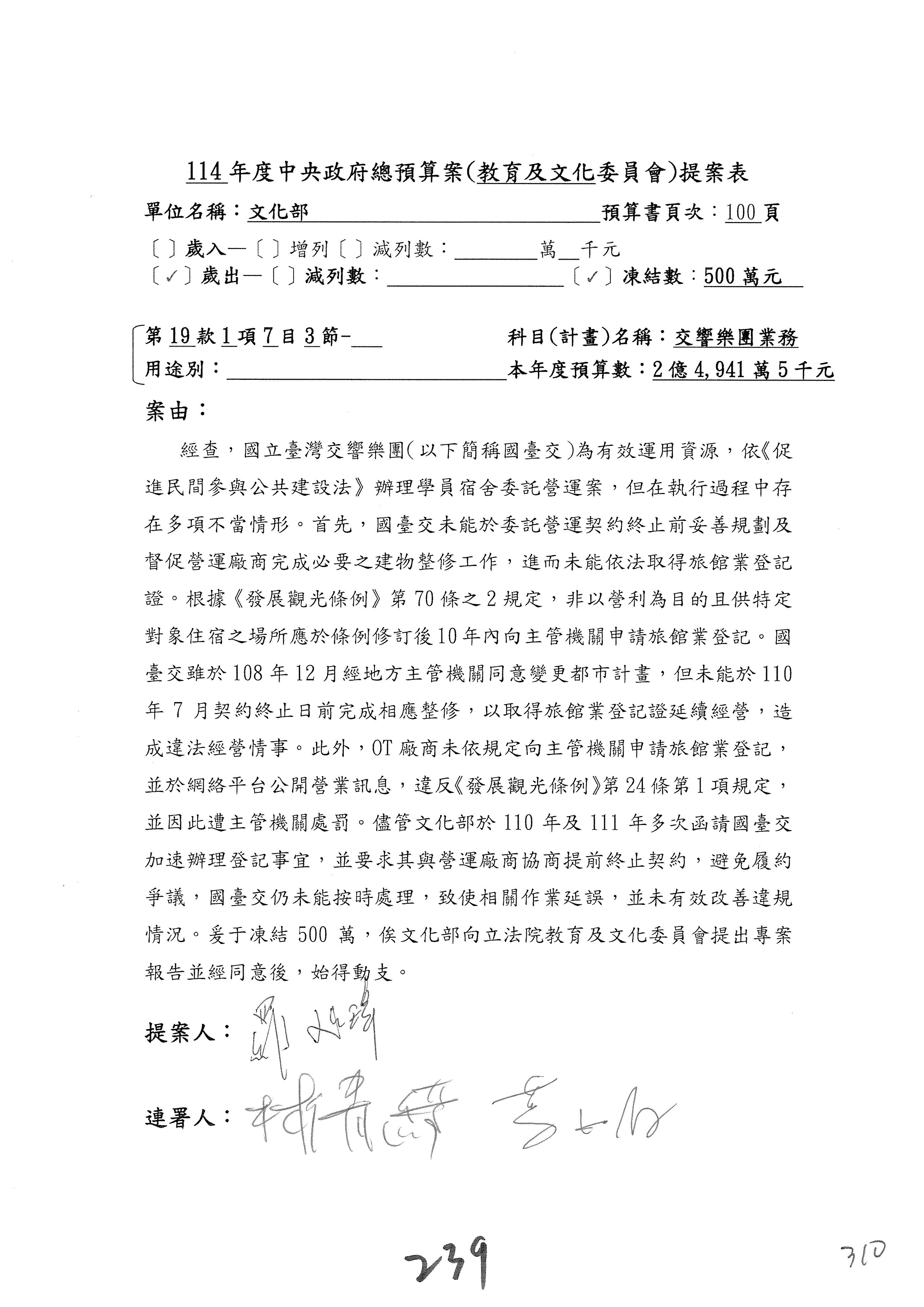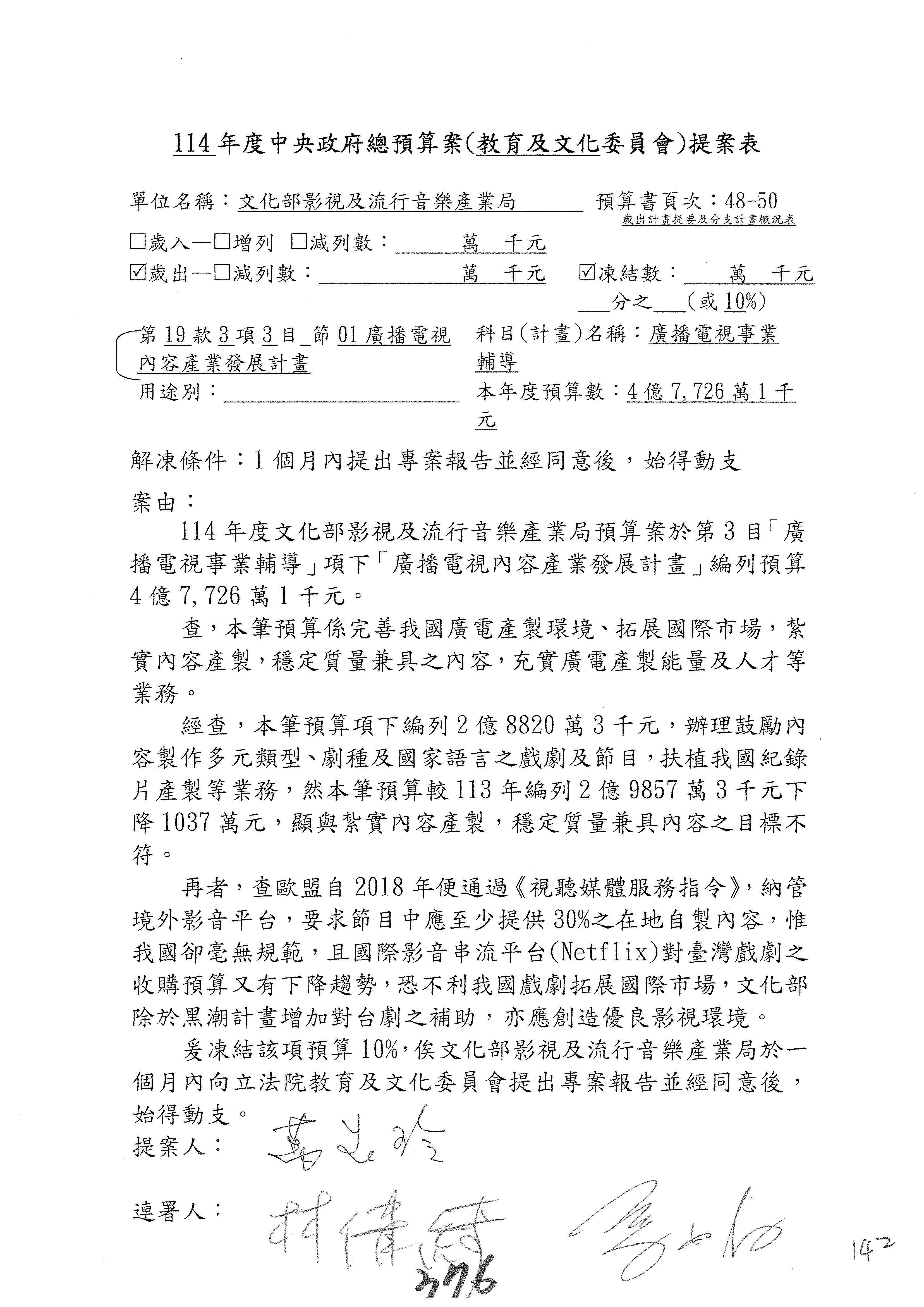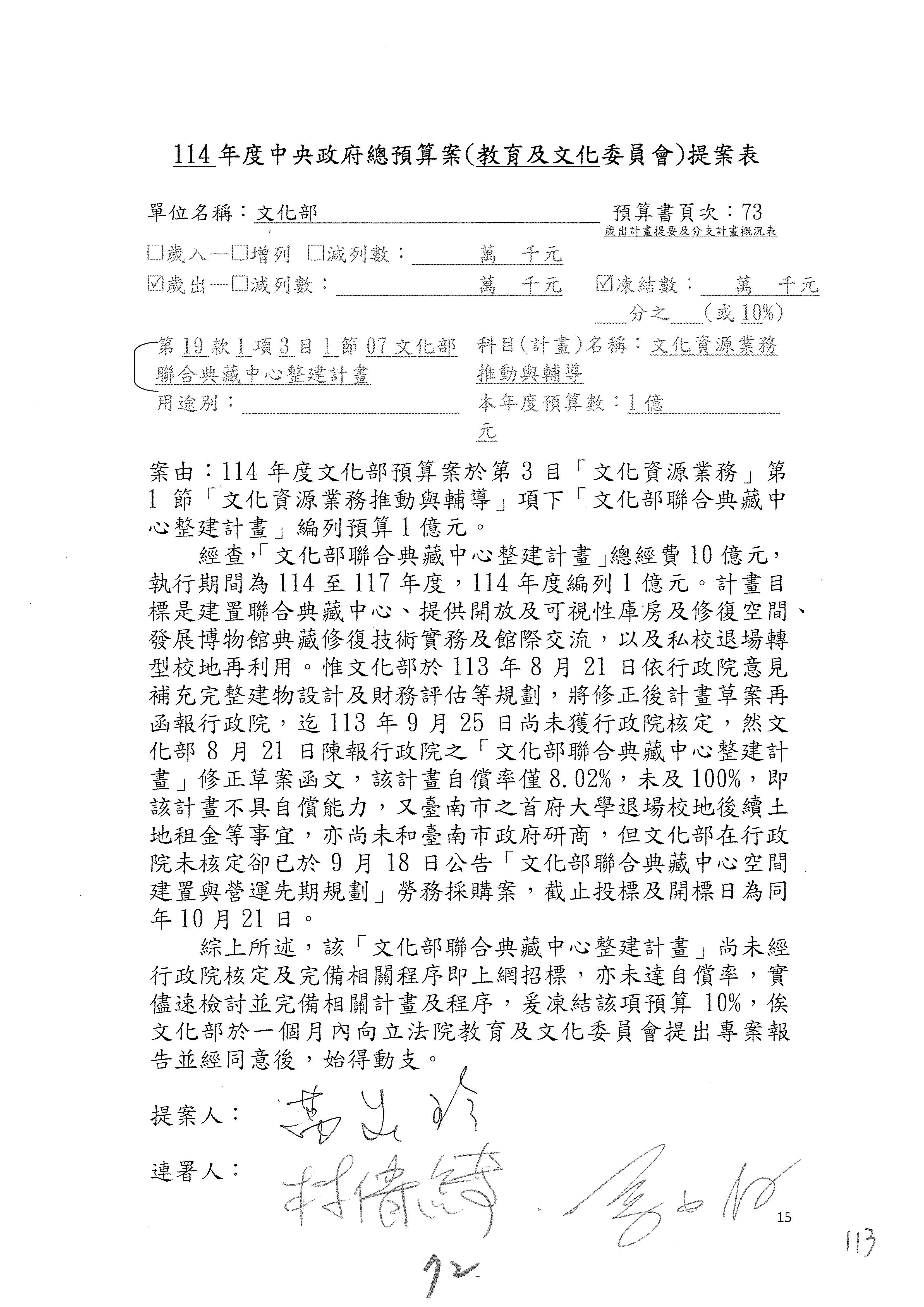 (三)114年度核能安全委員會及所屬第2目「原子能管理發展業務」第1節「原子能科學發展」預算編列27億5,477萬9千元,凍結5,000萬元,俟核能安全委員會向立法院教育及文化委員會提出書面報告後,始得動支。15-42