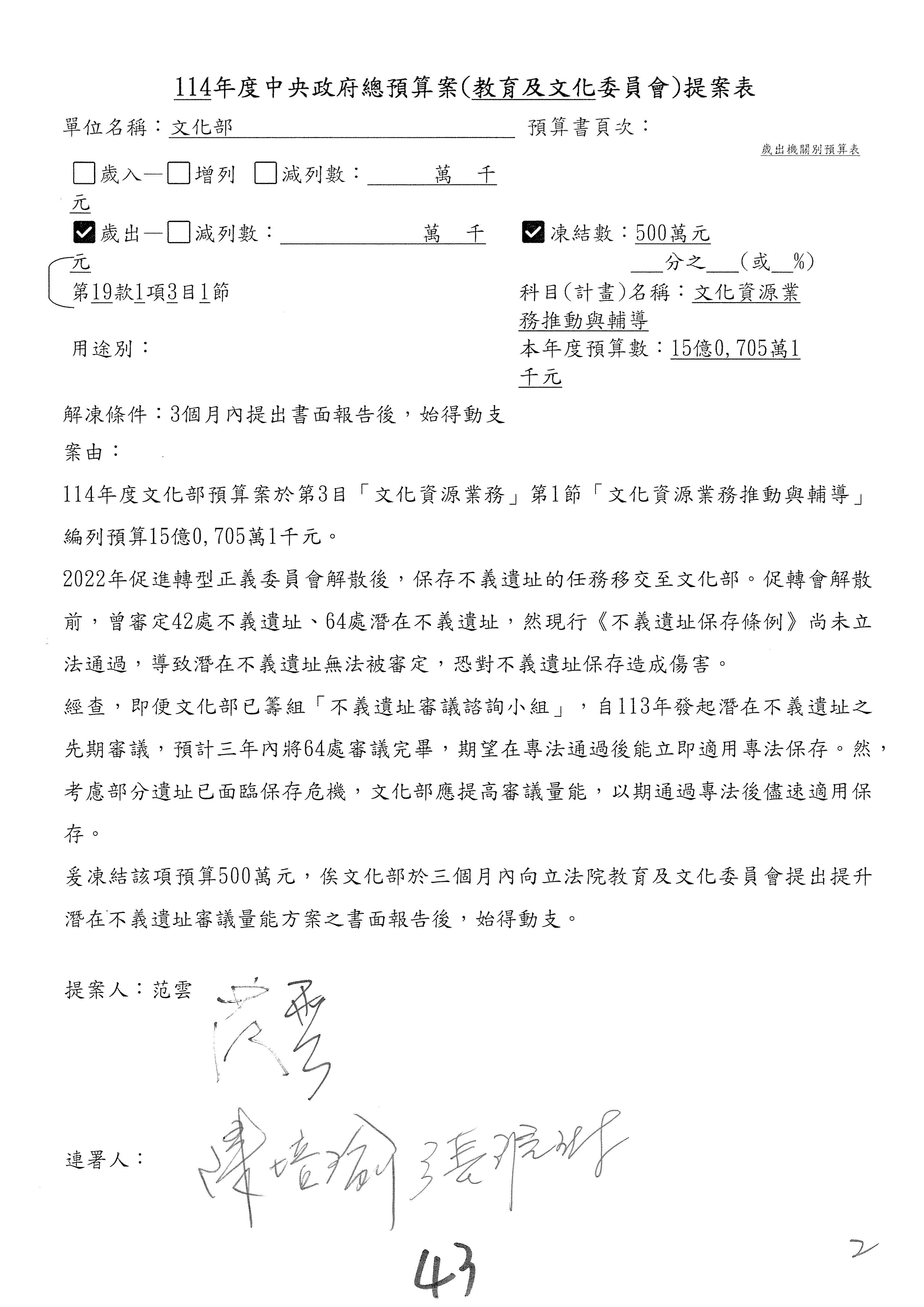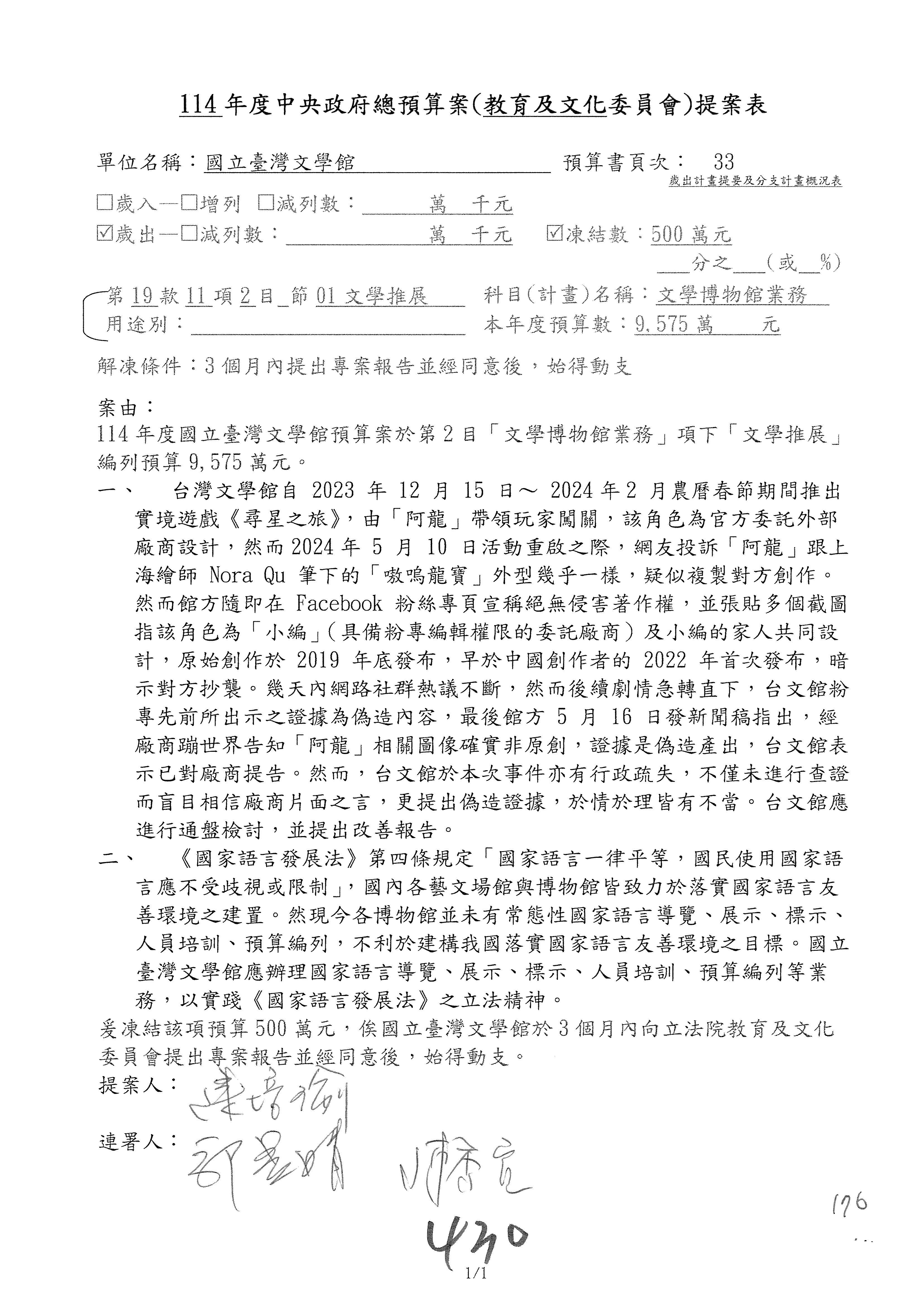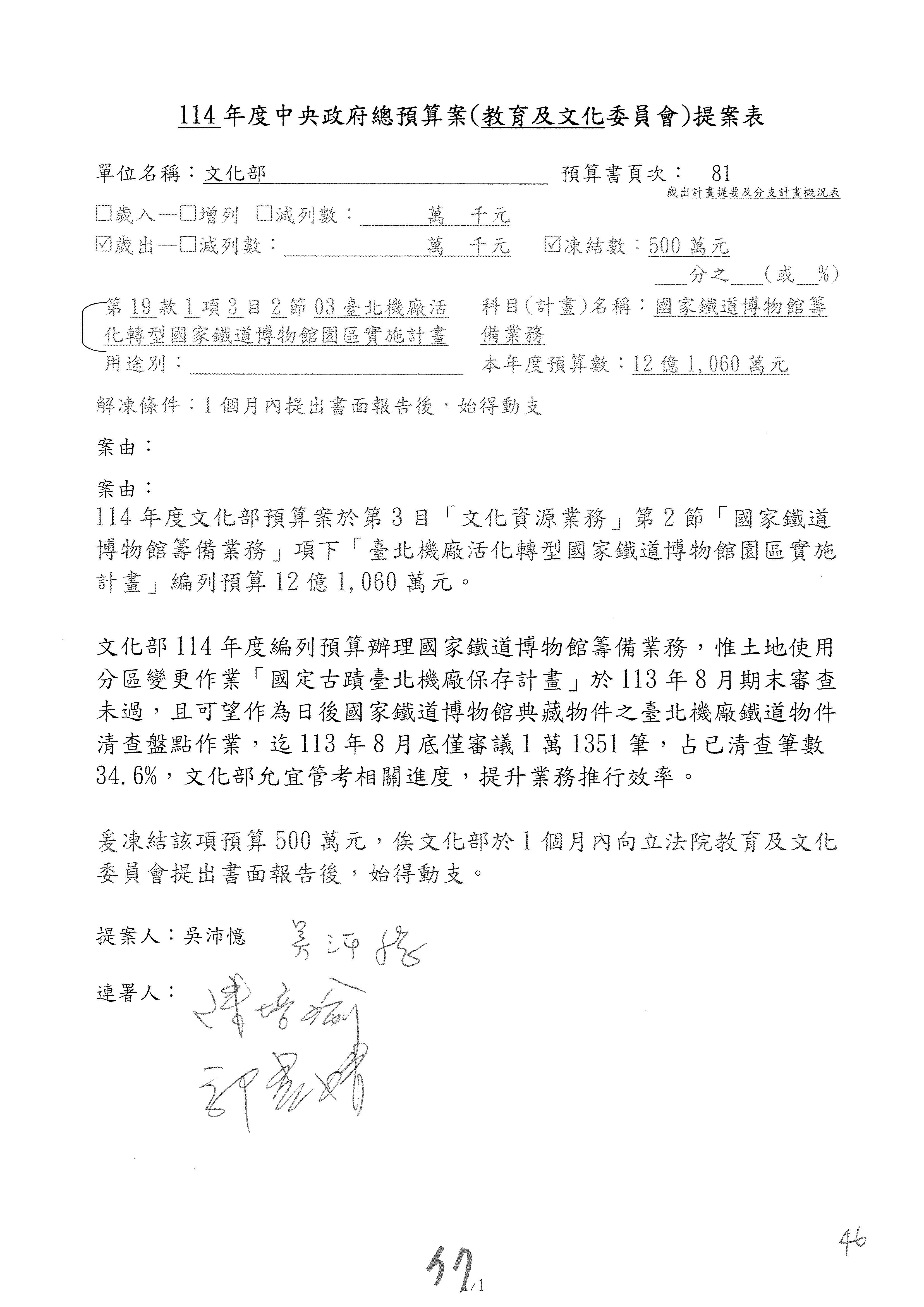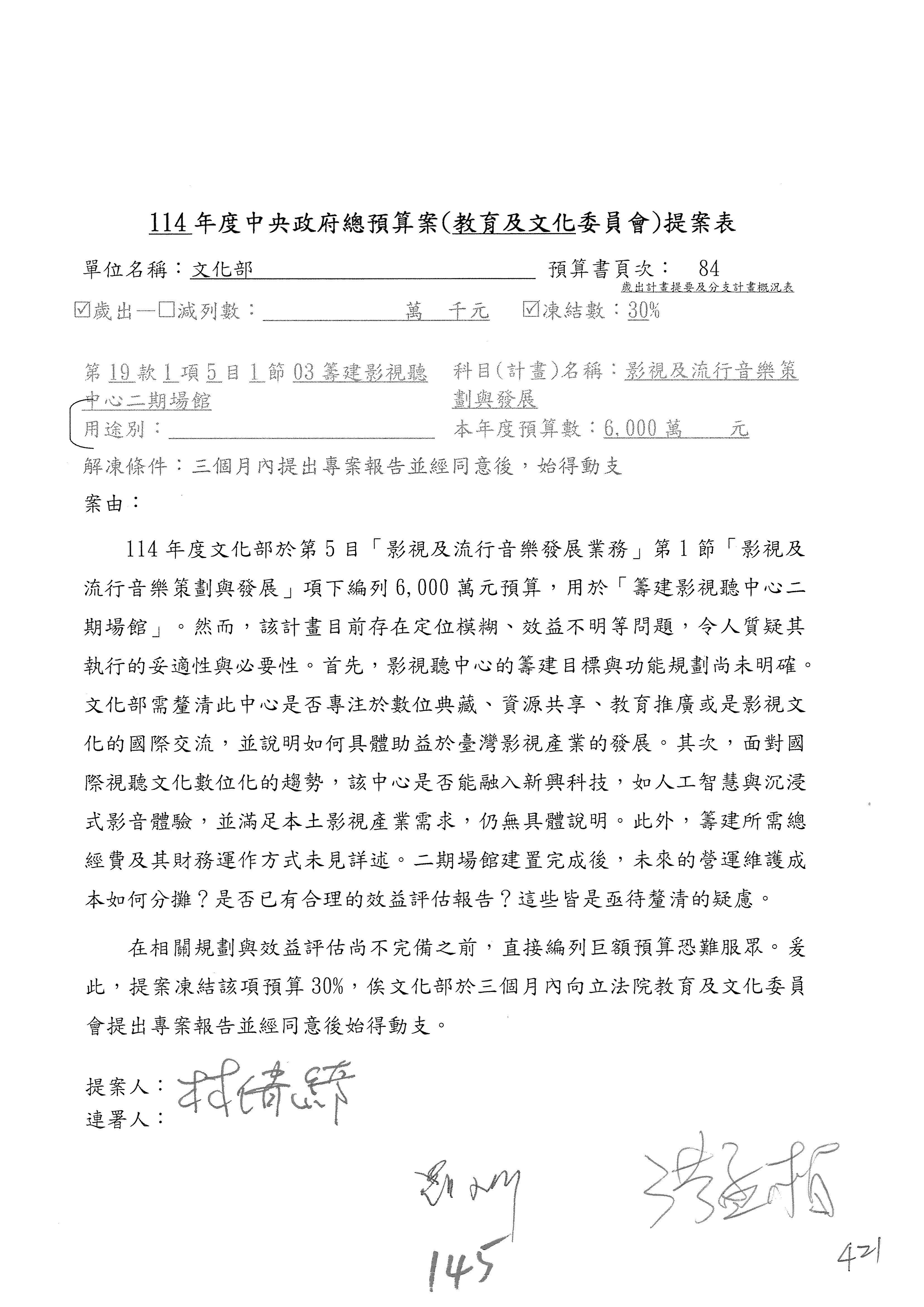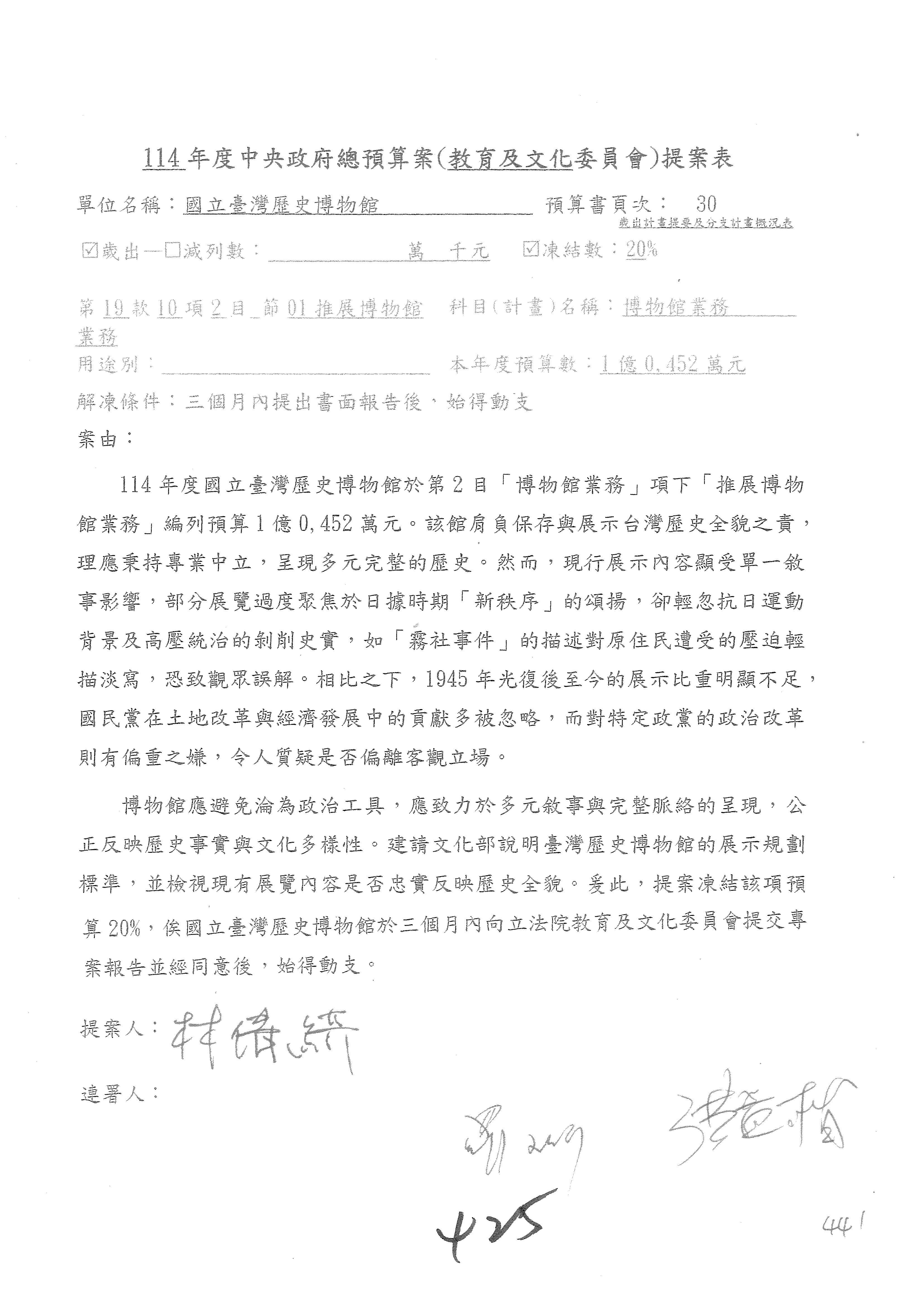 (三)114年度核能安全委員會及所屬第2目「原子能管理發展業務」第1節「原子能科學發展」預算編列27億5,477萬9千元,凍結5,000萬元,俟核能安全委員會向立法院教育及文化委員會提出書面報告後,始得動支。15-42