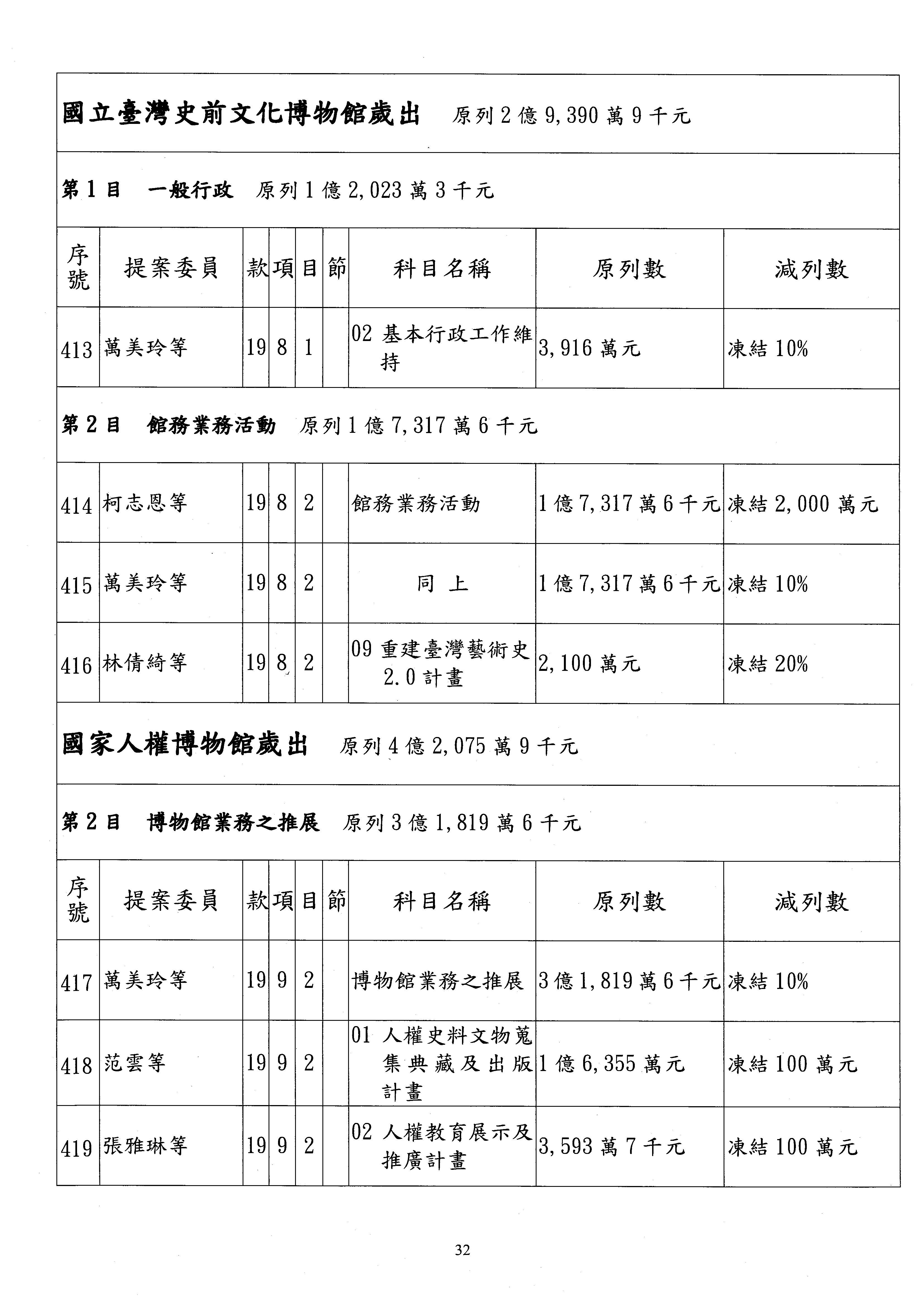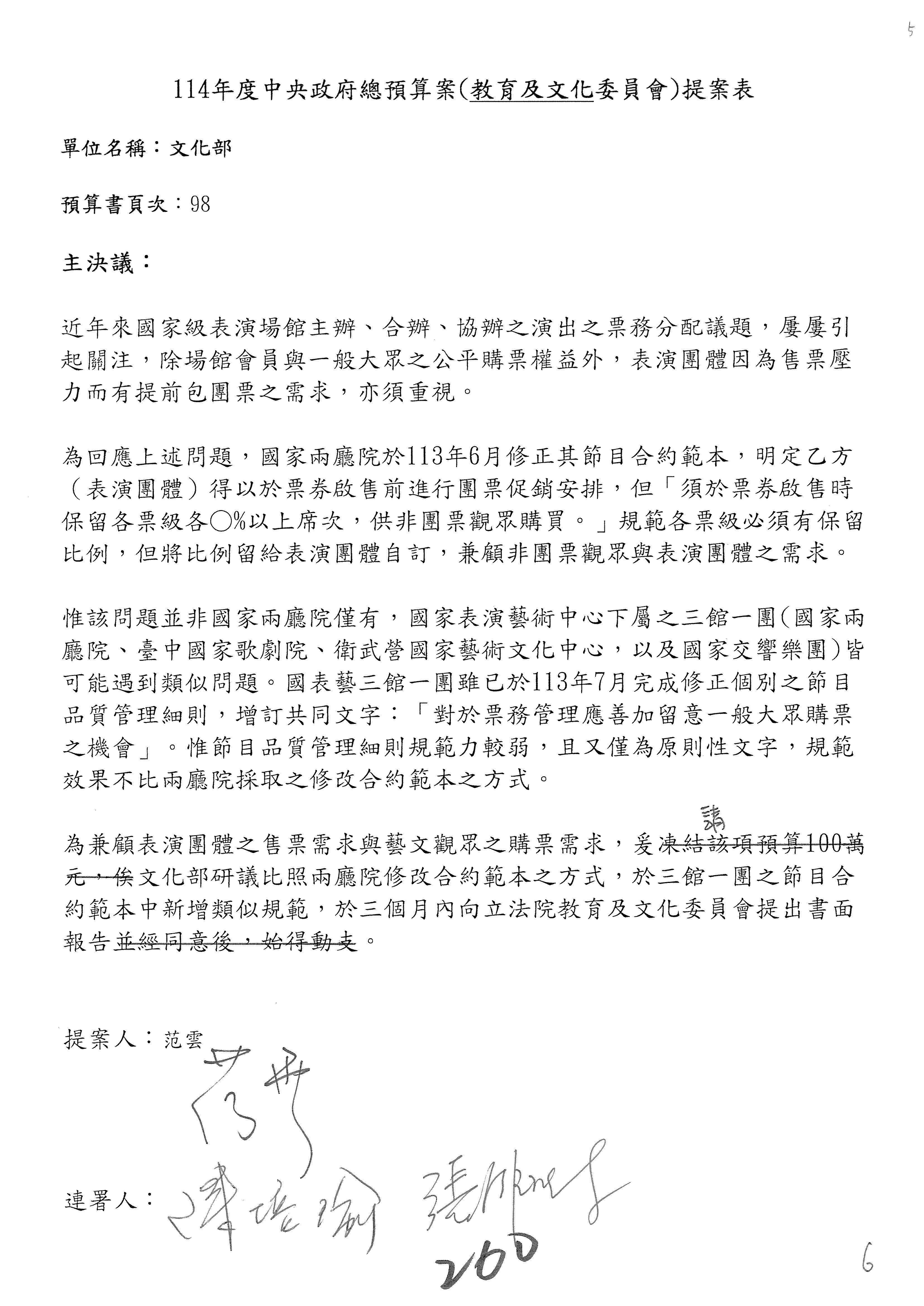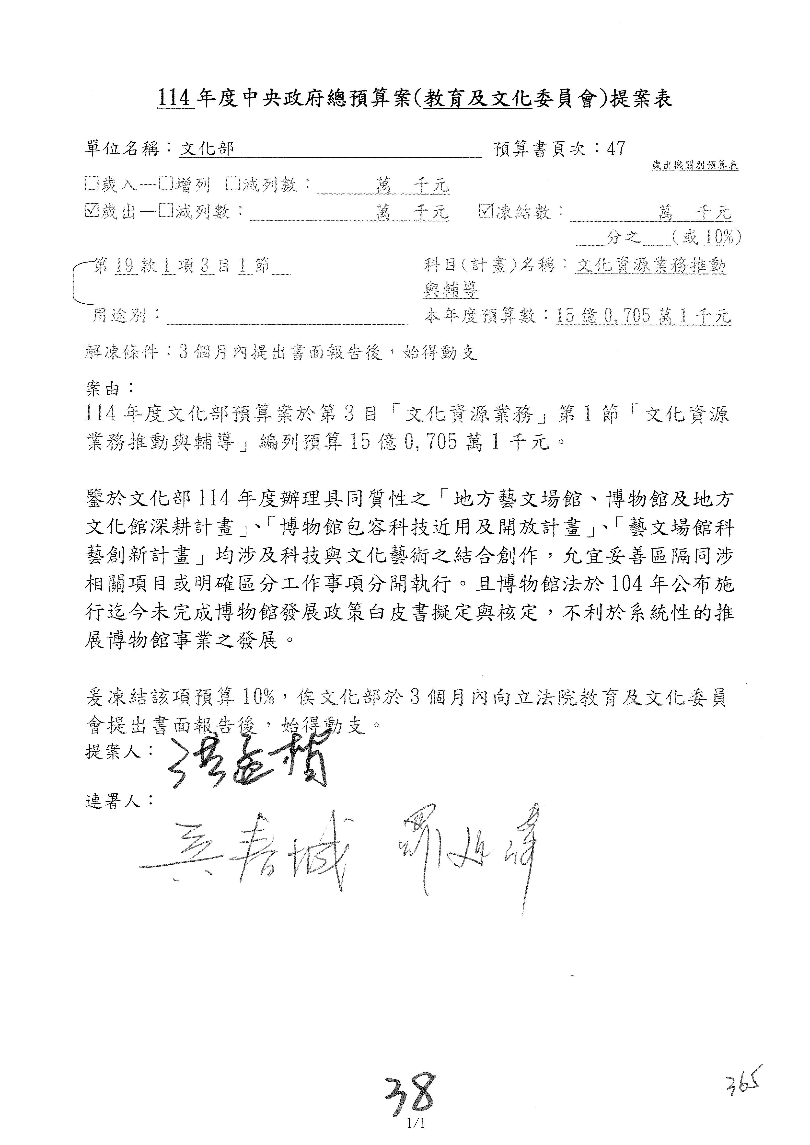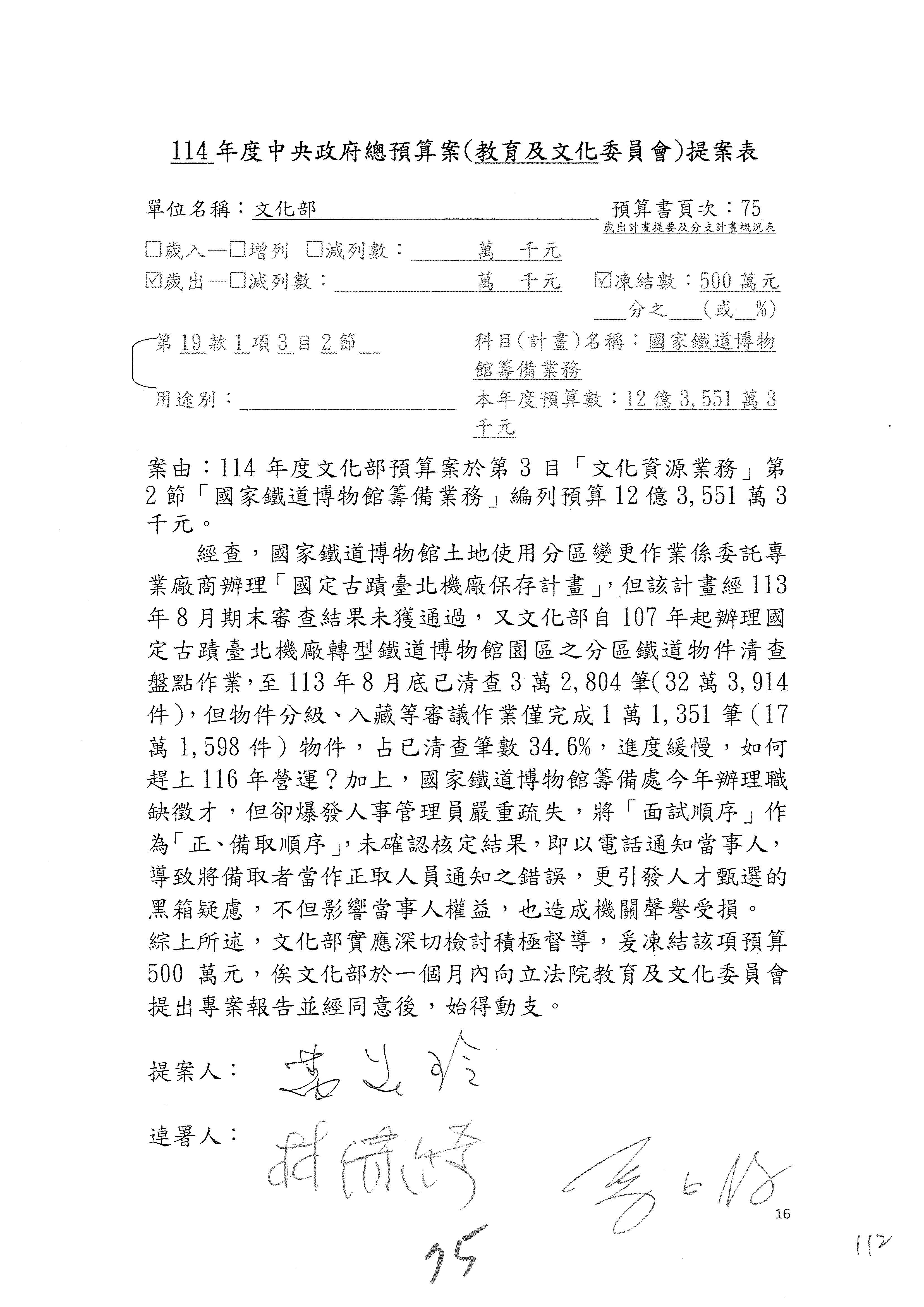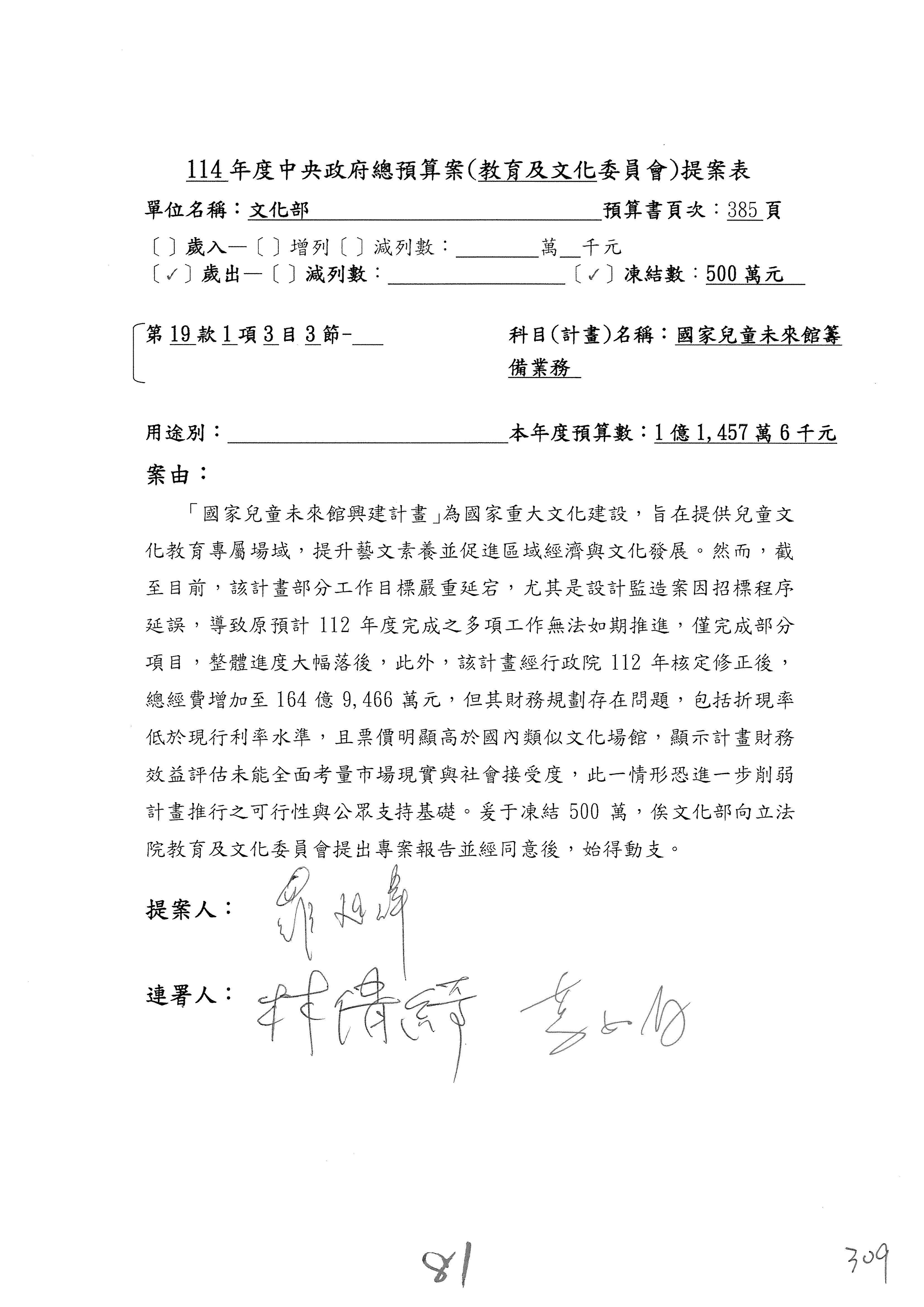 (三)114年度核能安全委員會及所屬第2目「原子能管理發展業務」第1節「原子能科學發展」預算編列27億5,477萬9千元,凍結5,000萬元,俟核能安全委員會向立法院教育及文化委員會提出書面報告後,始得動支。15-42