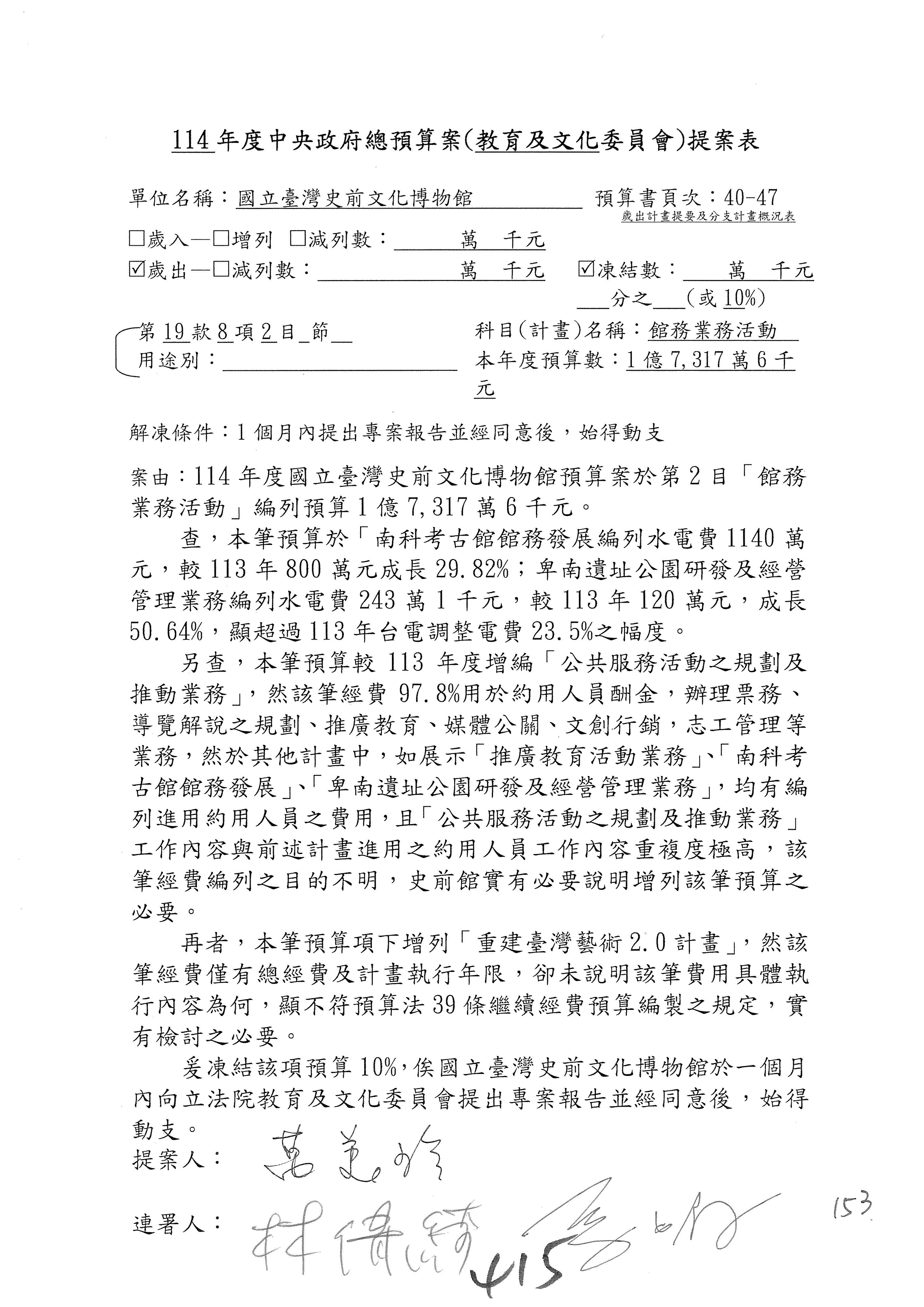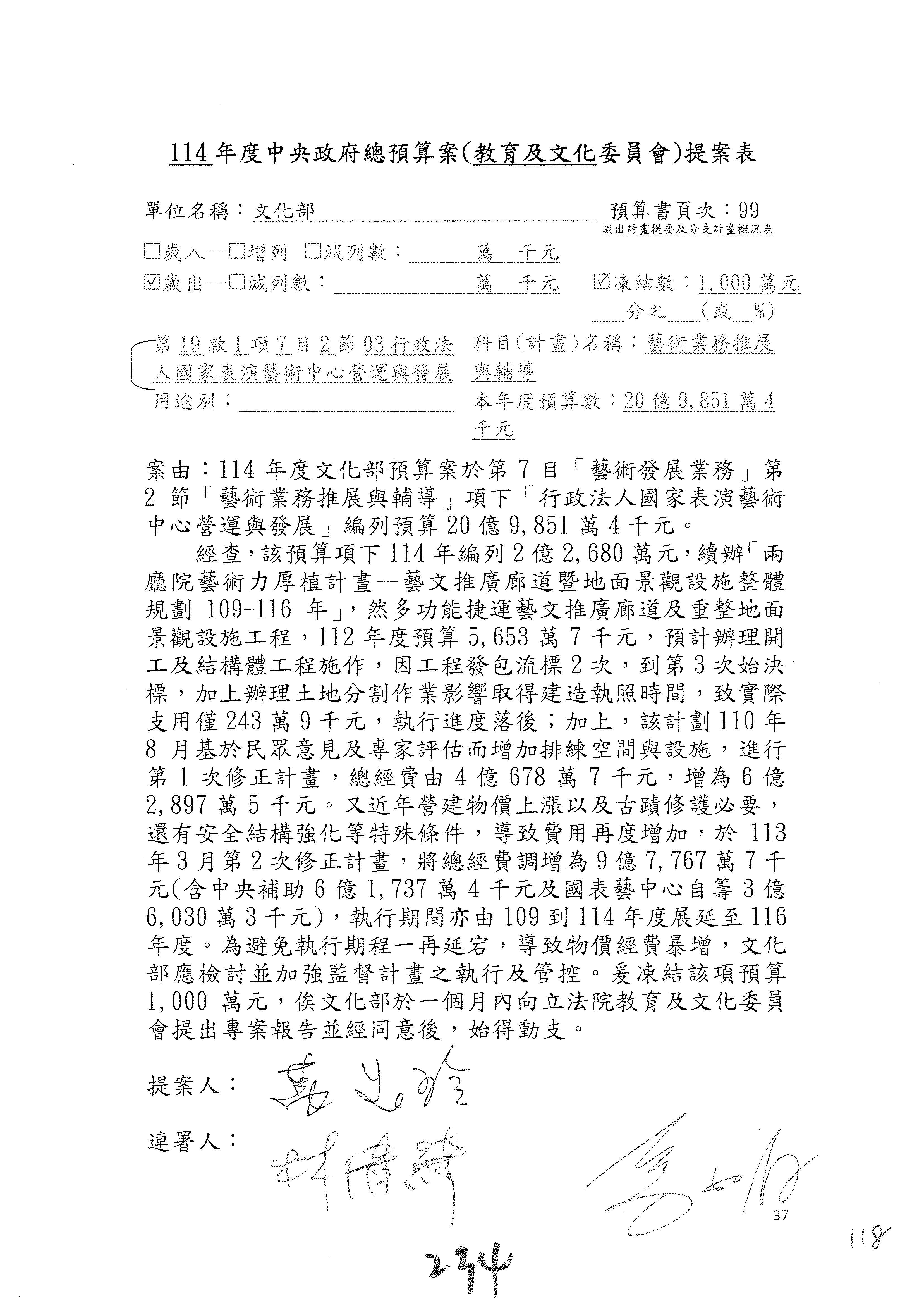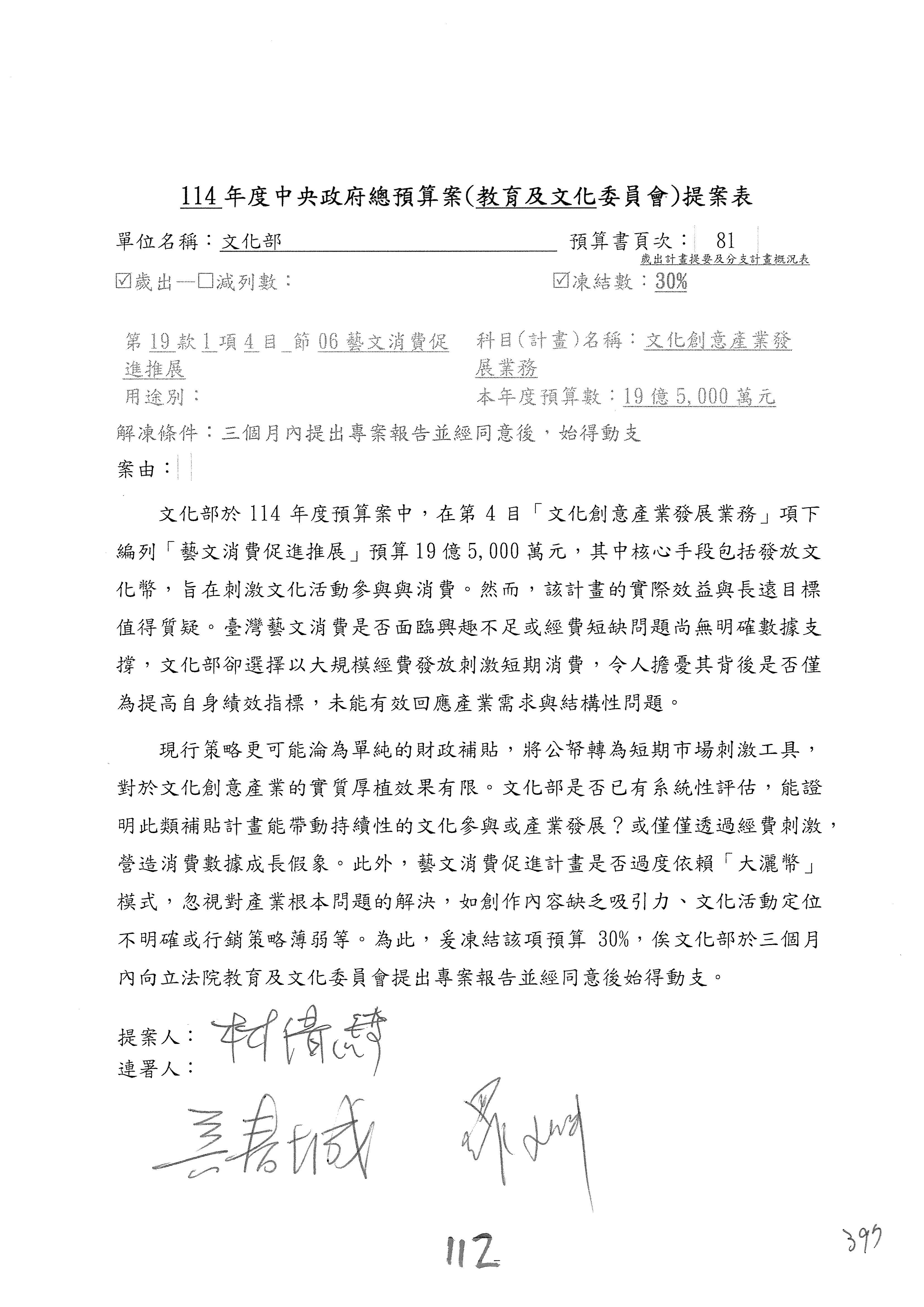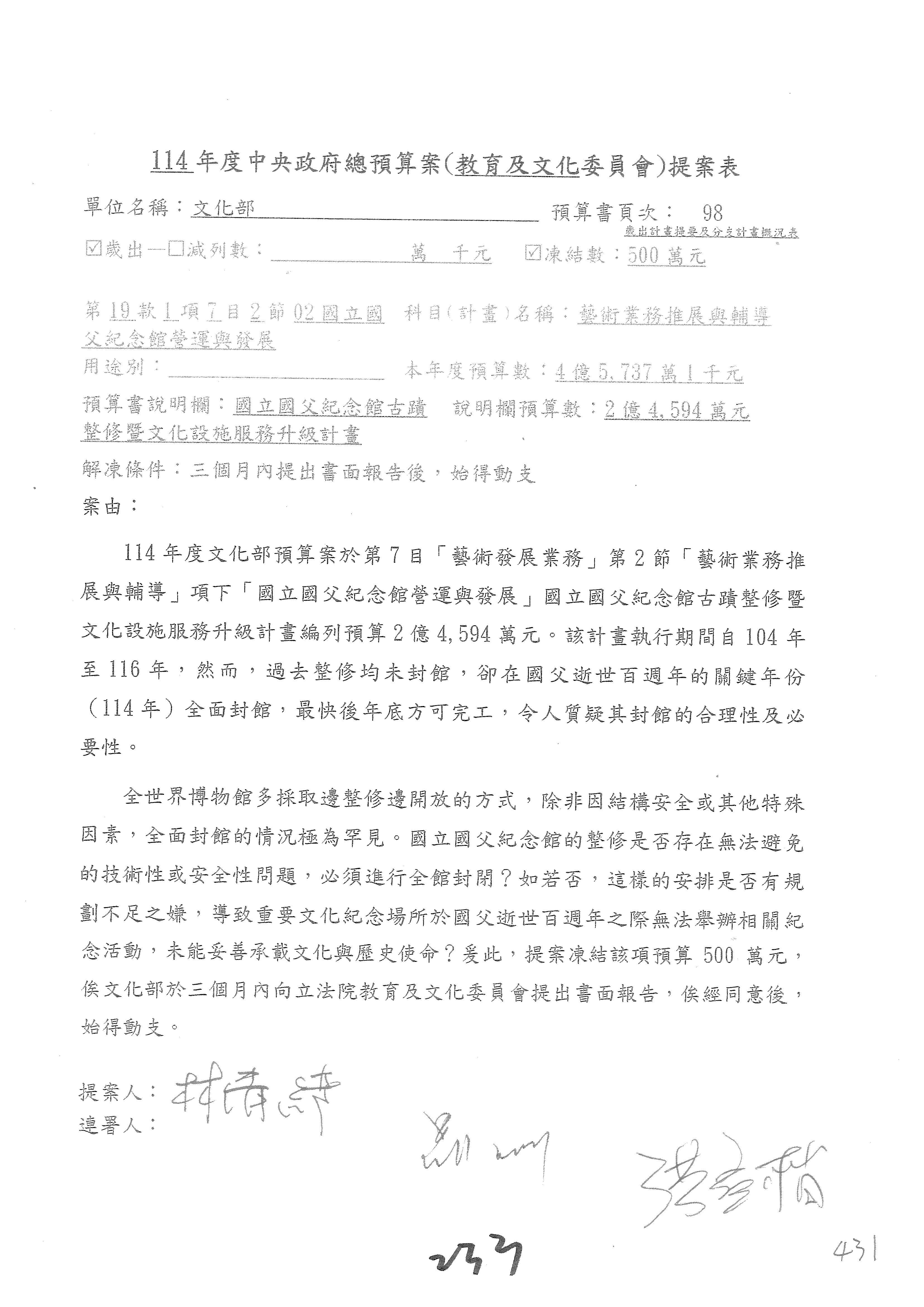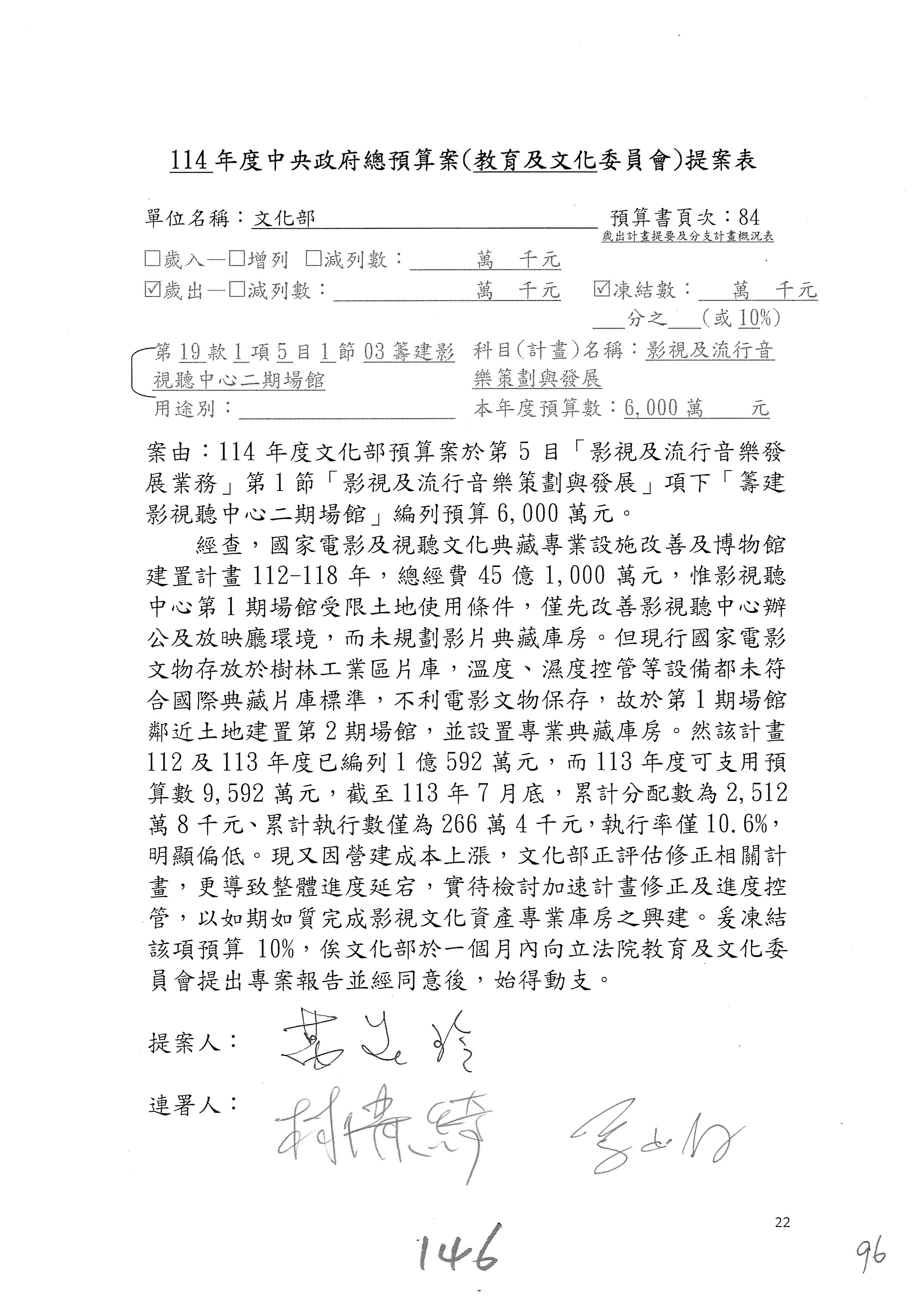 (三)114年度核能安全委員會及所屬第2目「原子能管理發展業務」第1節「原子能科學發展」預算編列27億5,477萬9千元,凍結5,000萬元,俟核能安全委員會向立法院教育及文化委員會提出書面報告後,始得動支。15-42