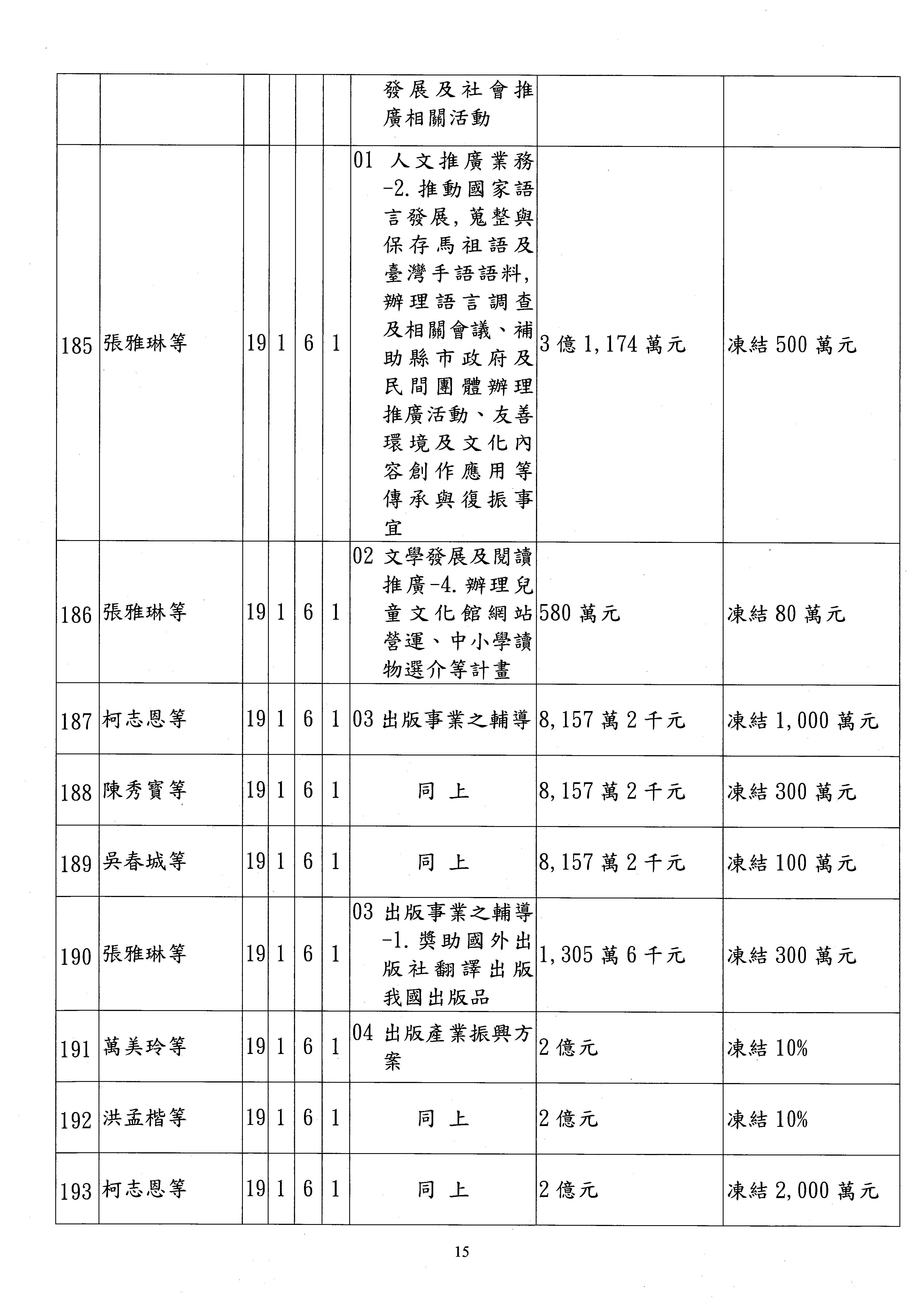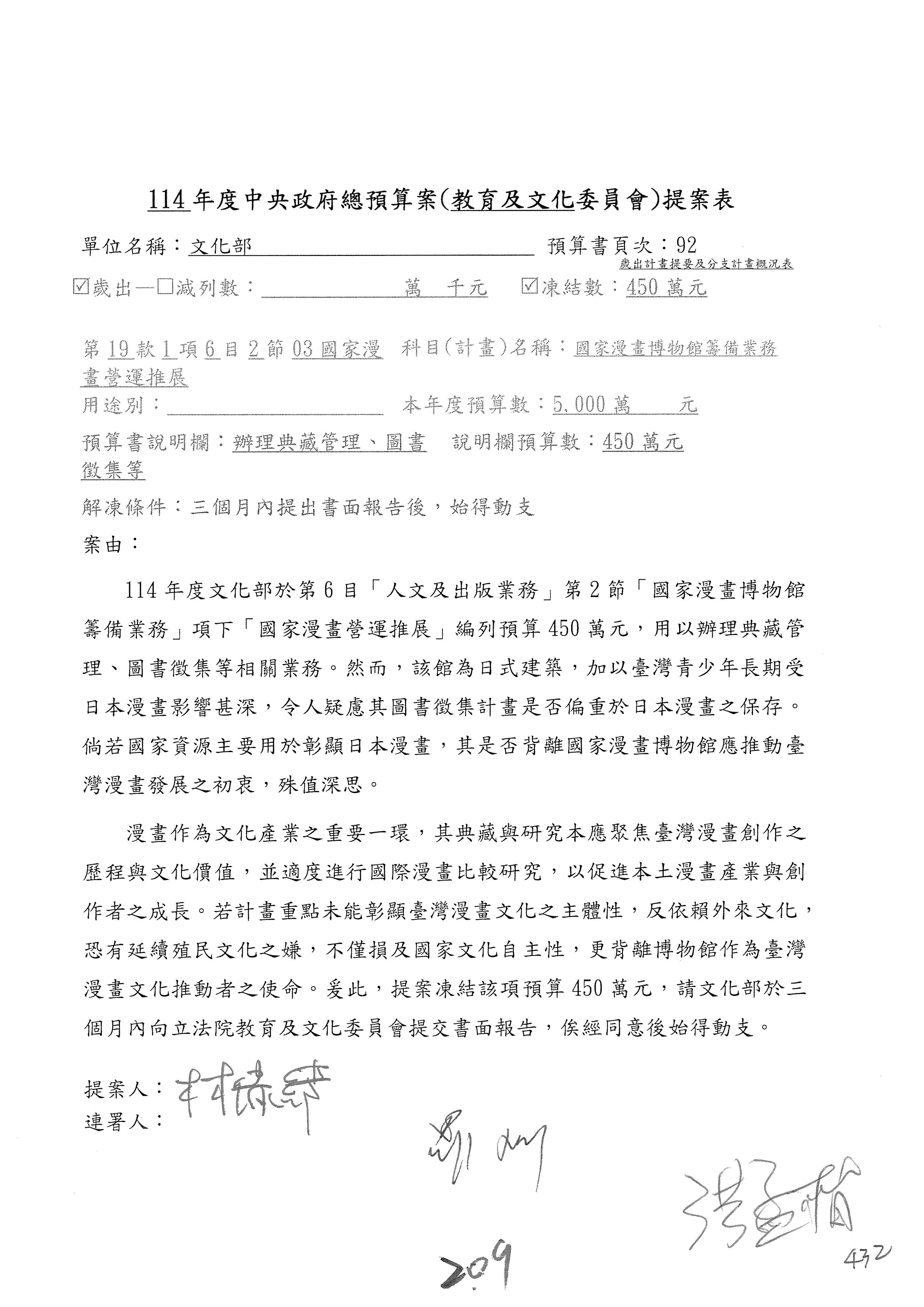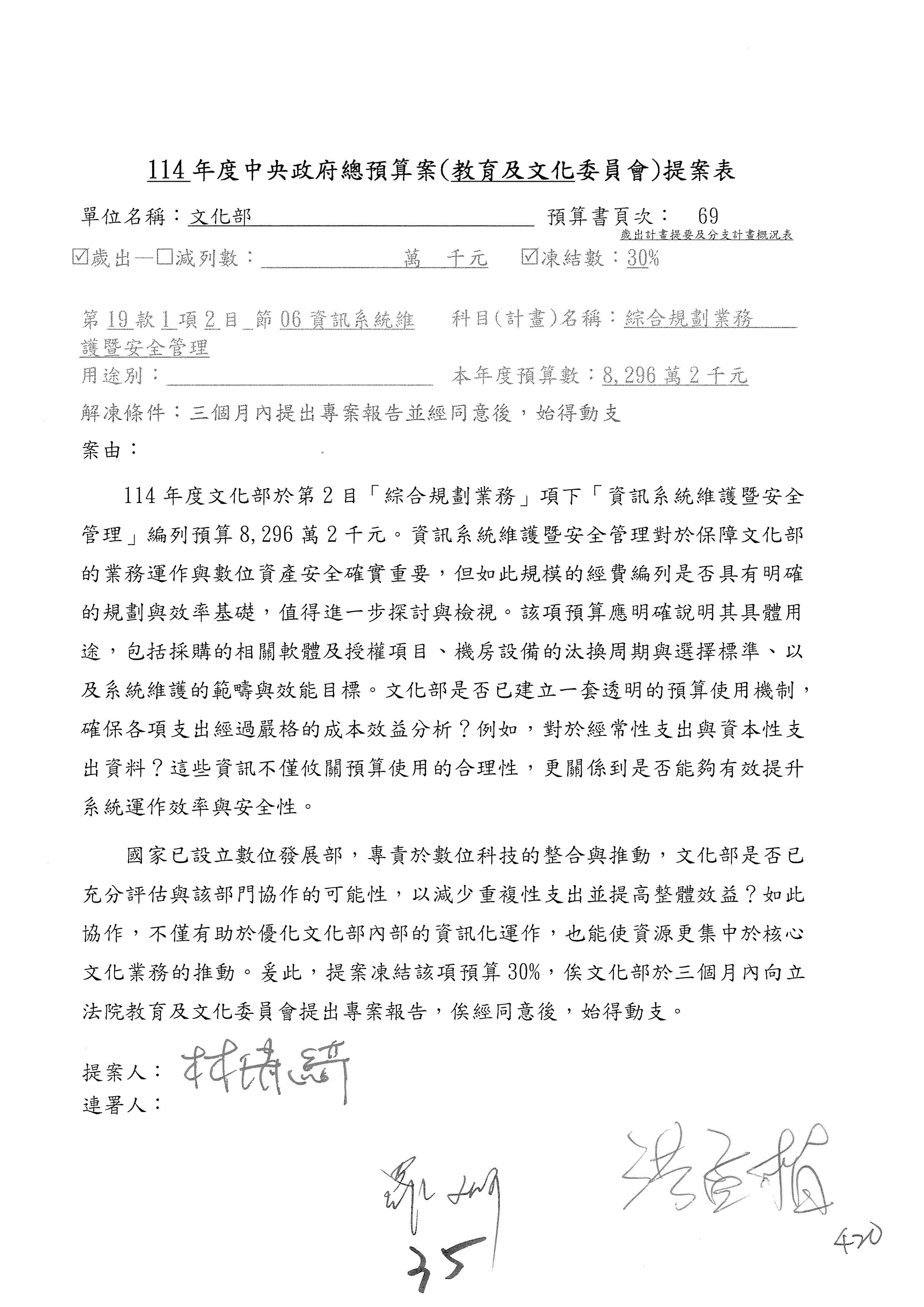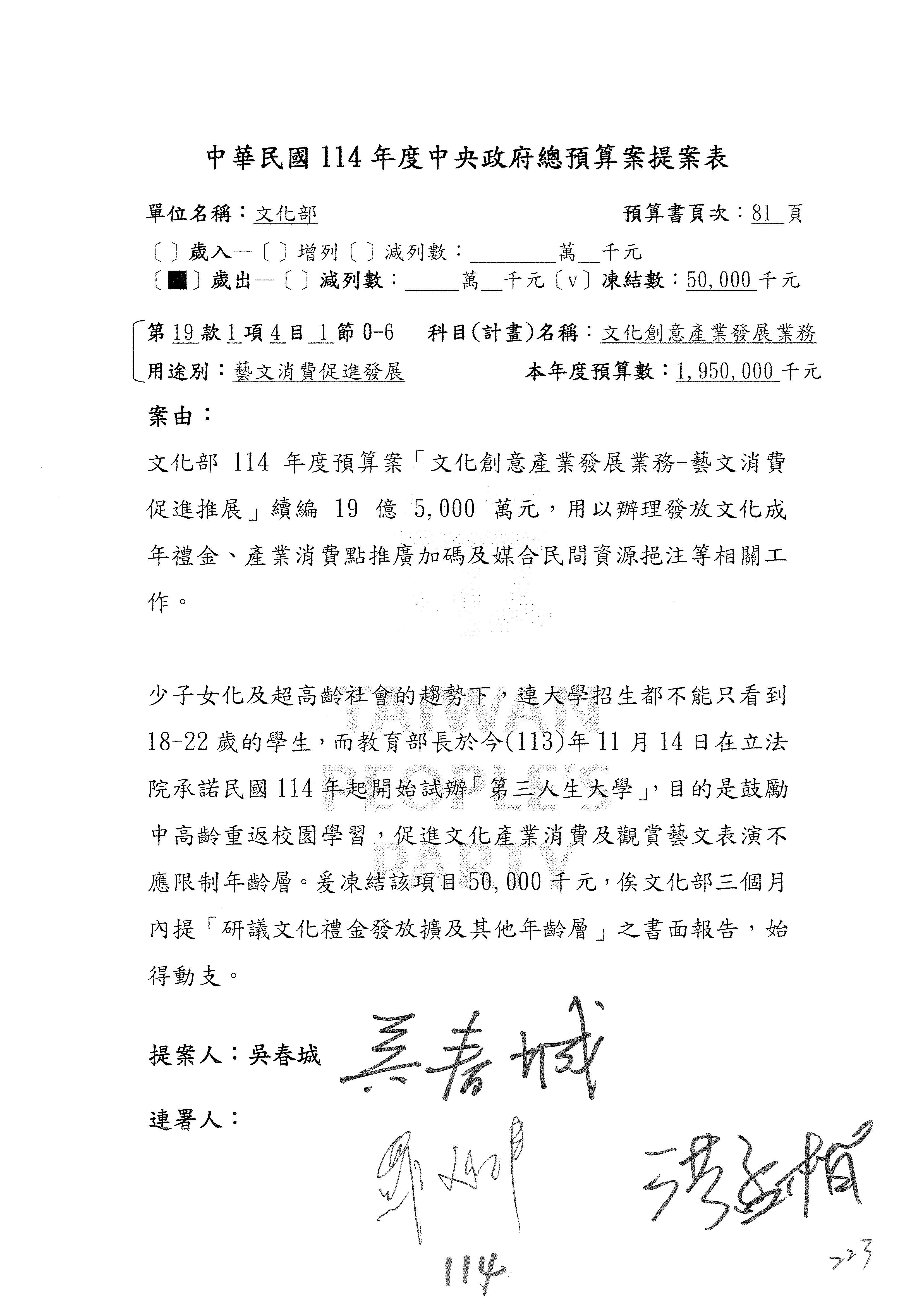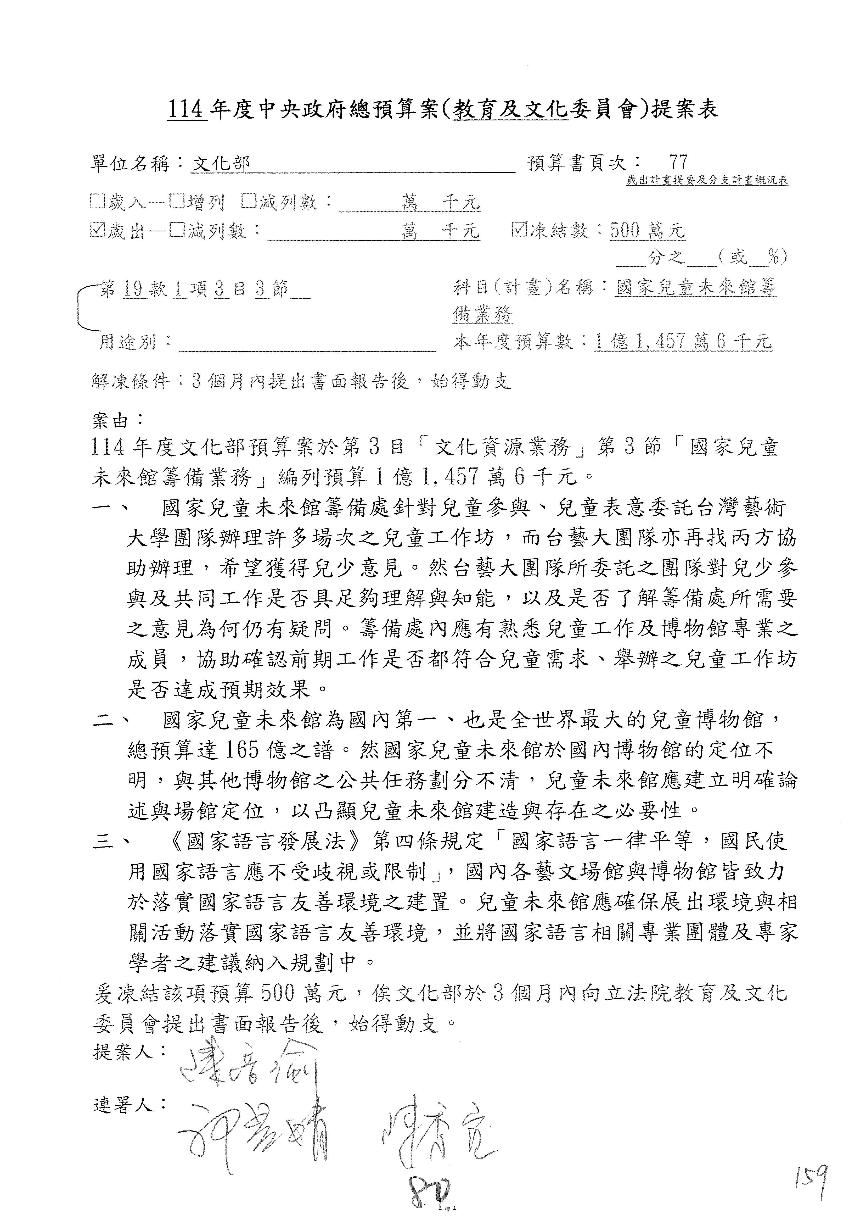 (三)114年度核能安全委員會及所屬第2目「原子能管理發展業務」第1節「原子能科學發展」預算編列27億5,477萬9千元,凍結5,000萬元,俟核能安全委員會向立法院教育及文化委員會提出書面報告後,始得動支。15-42
