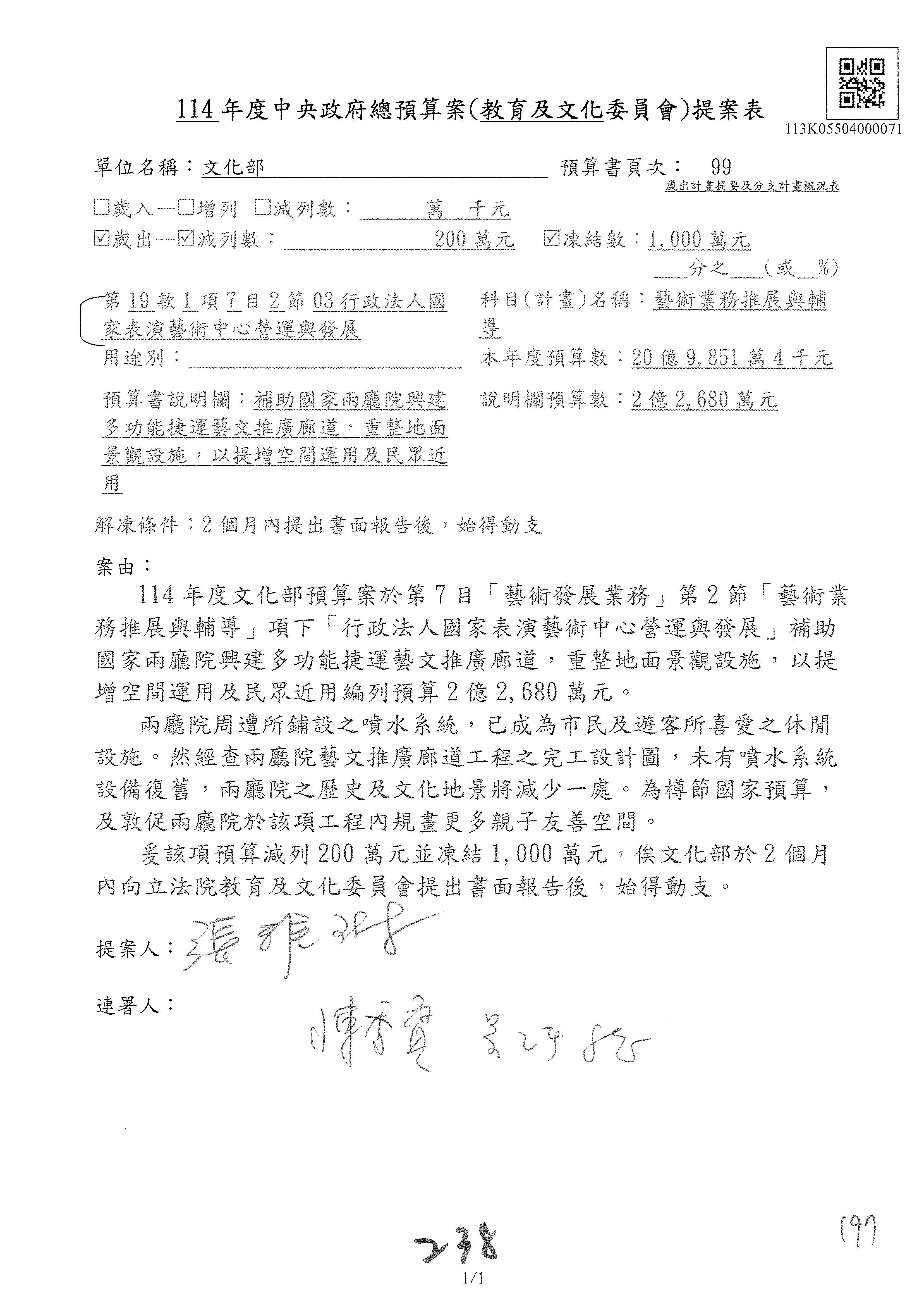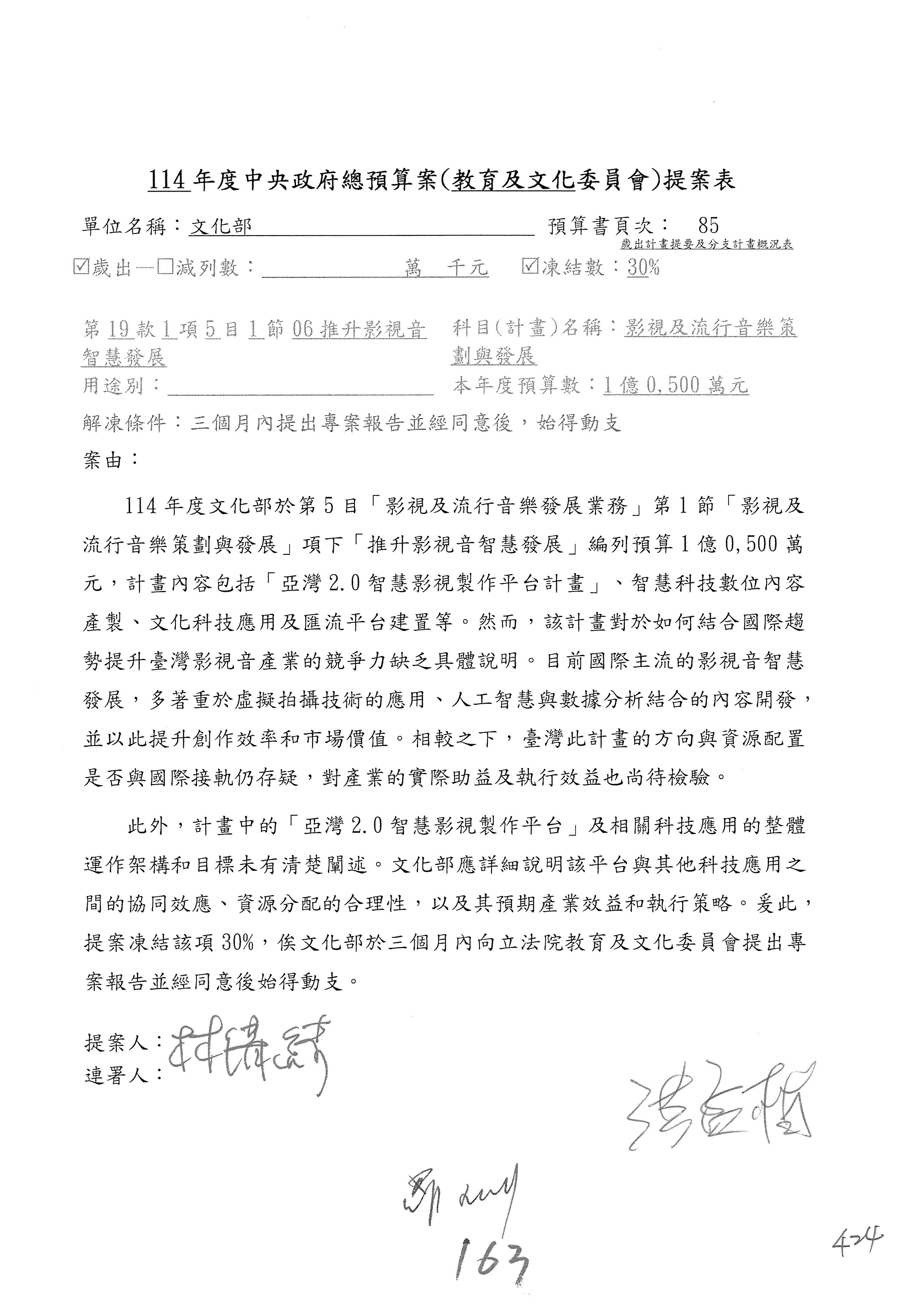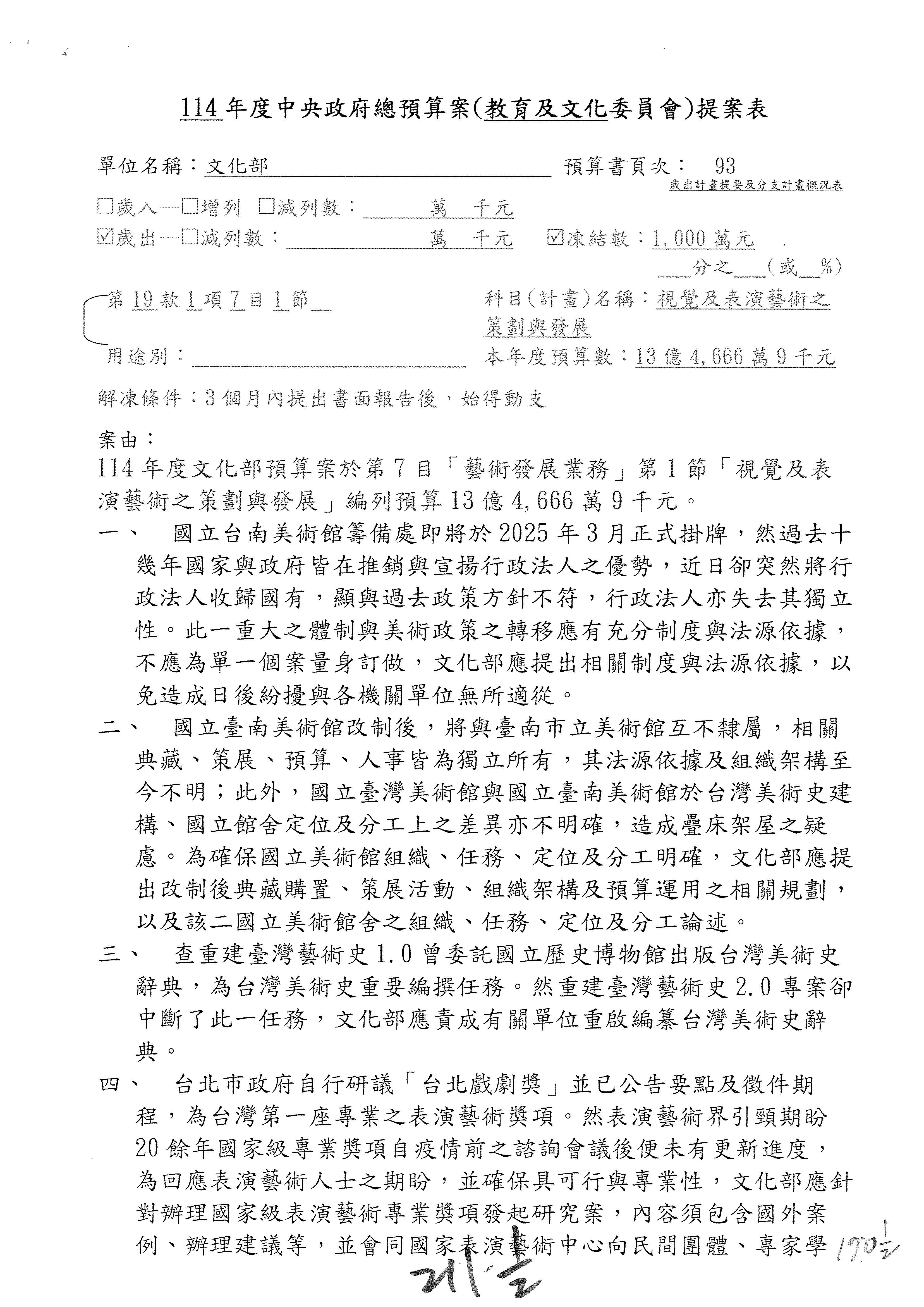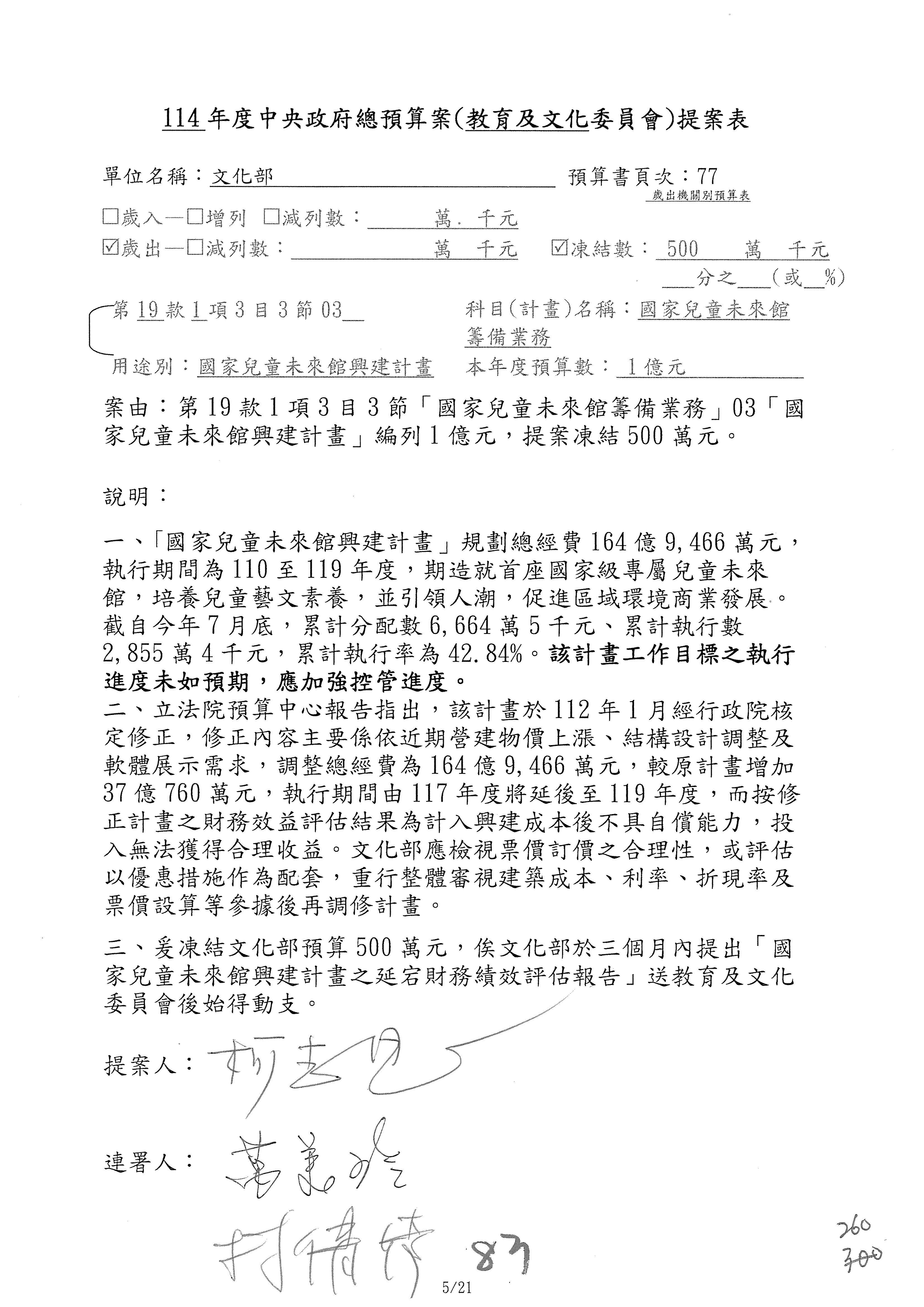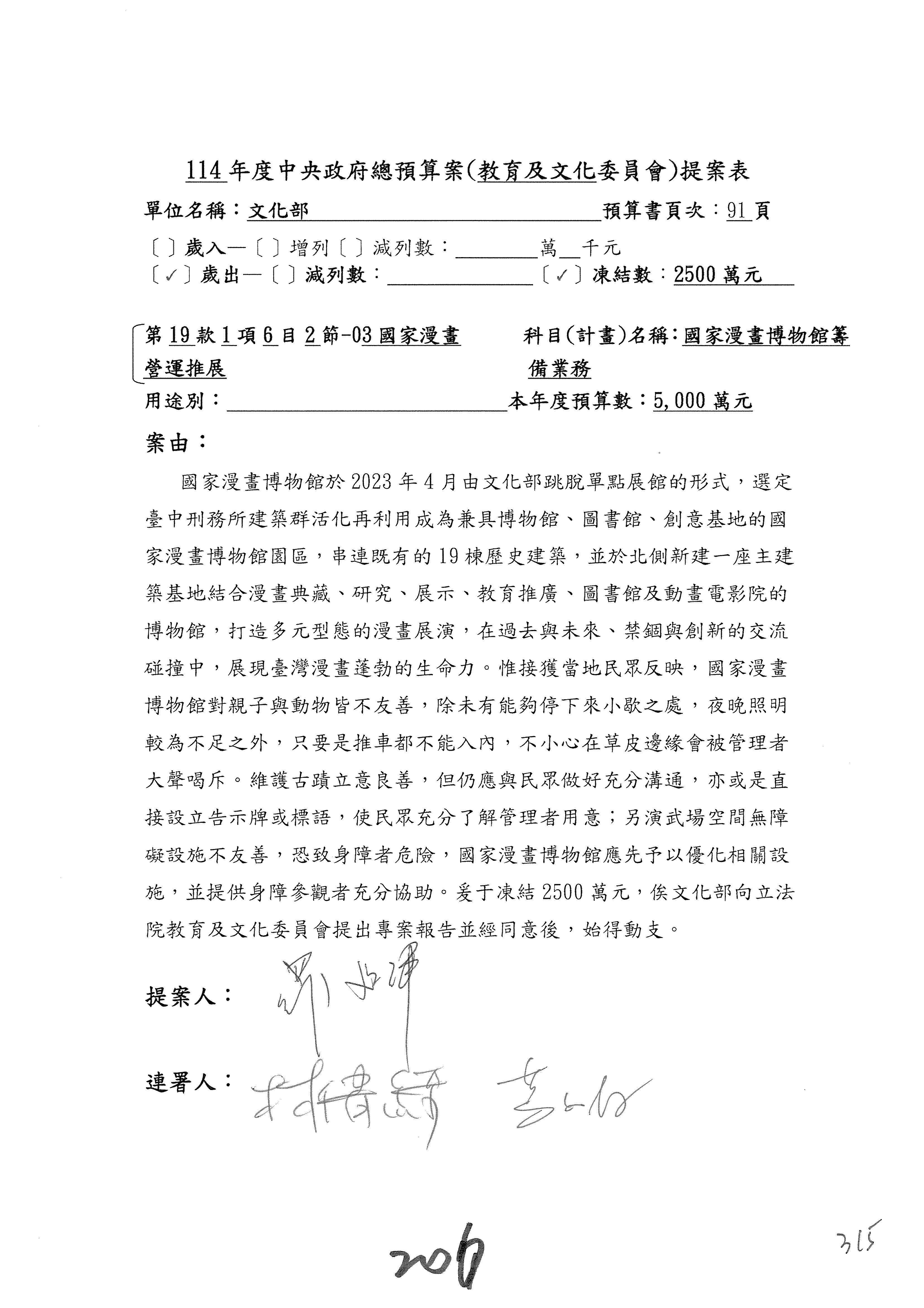 (三)114年度核能安全委員會及所屬第2目「原子能管理發展業務」第1節「原子能科學發展」預算編列27億5,477萬9千元,凍結5,000萬元,俟核能安全委員會向立法院教育及文化委員會提出書面報告後,始得動支。15-42