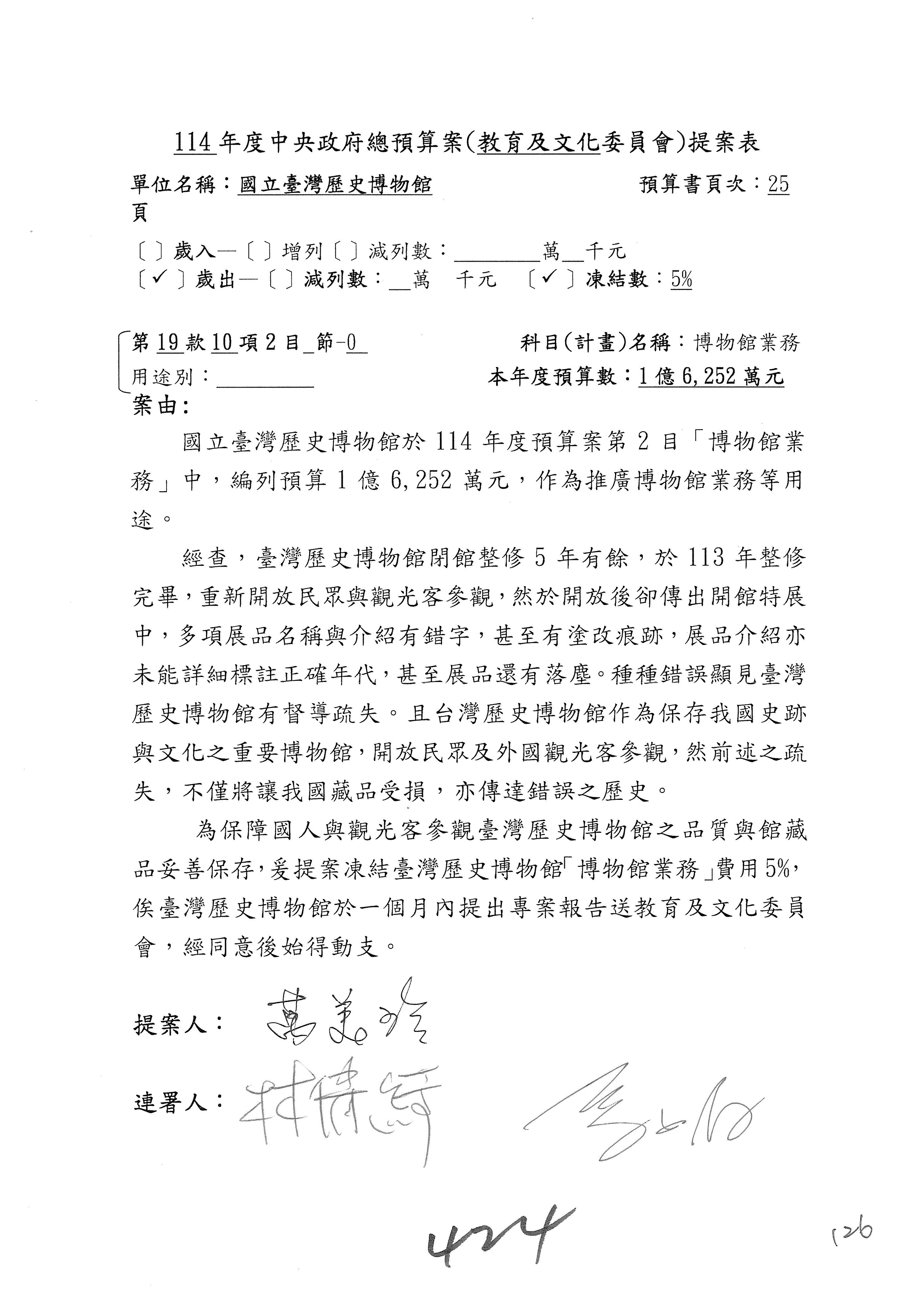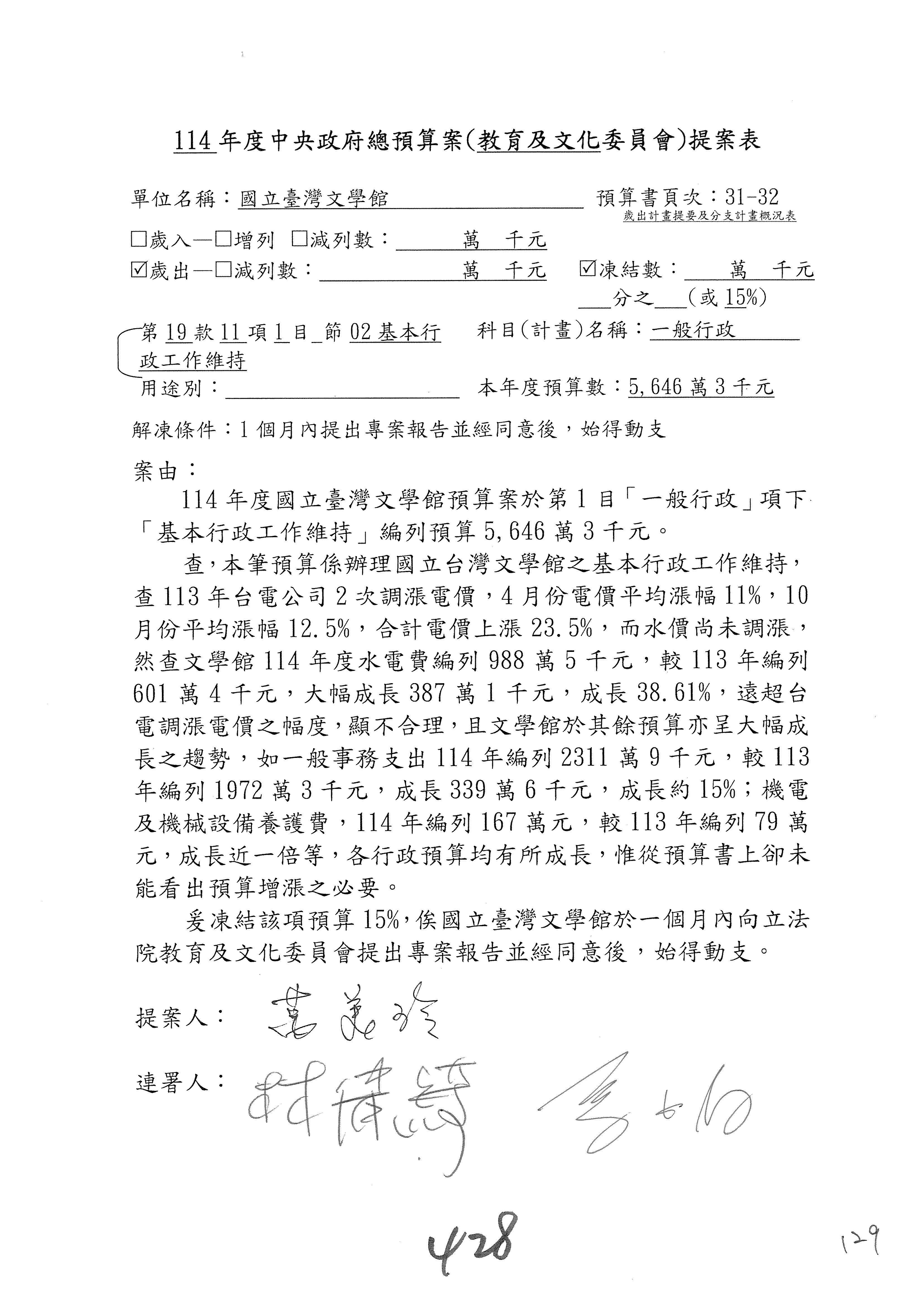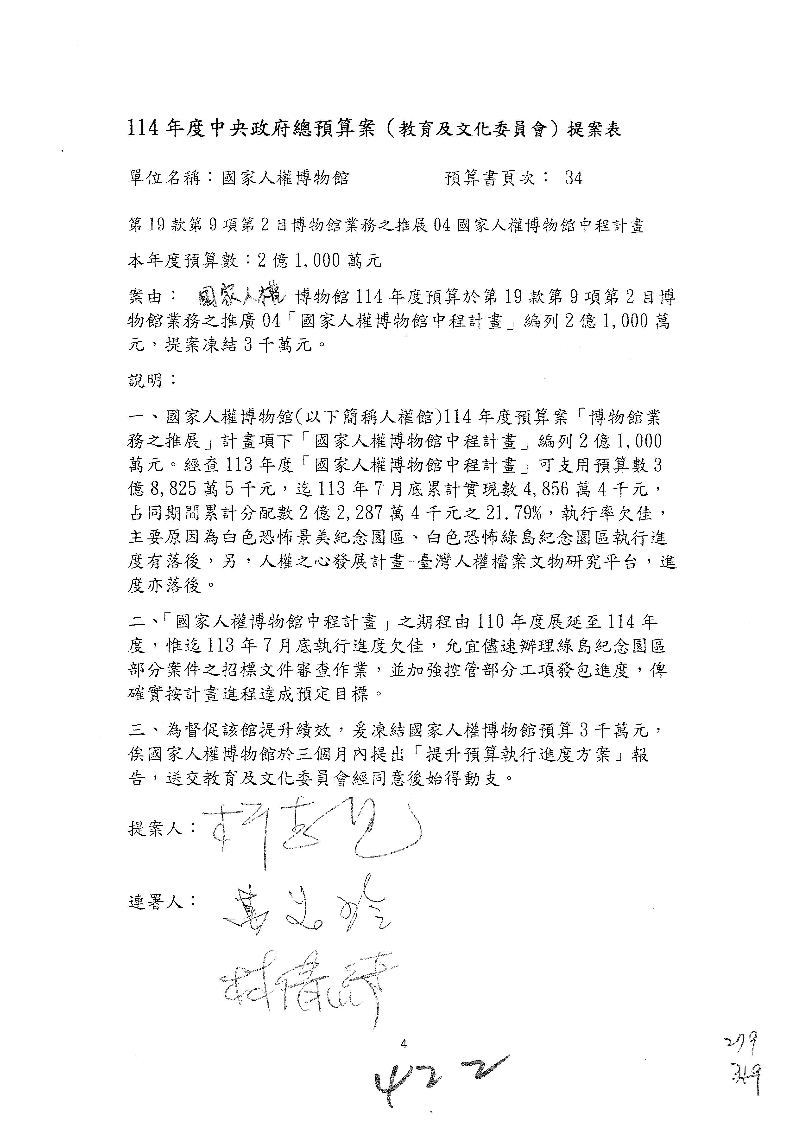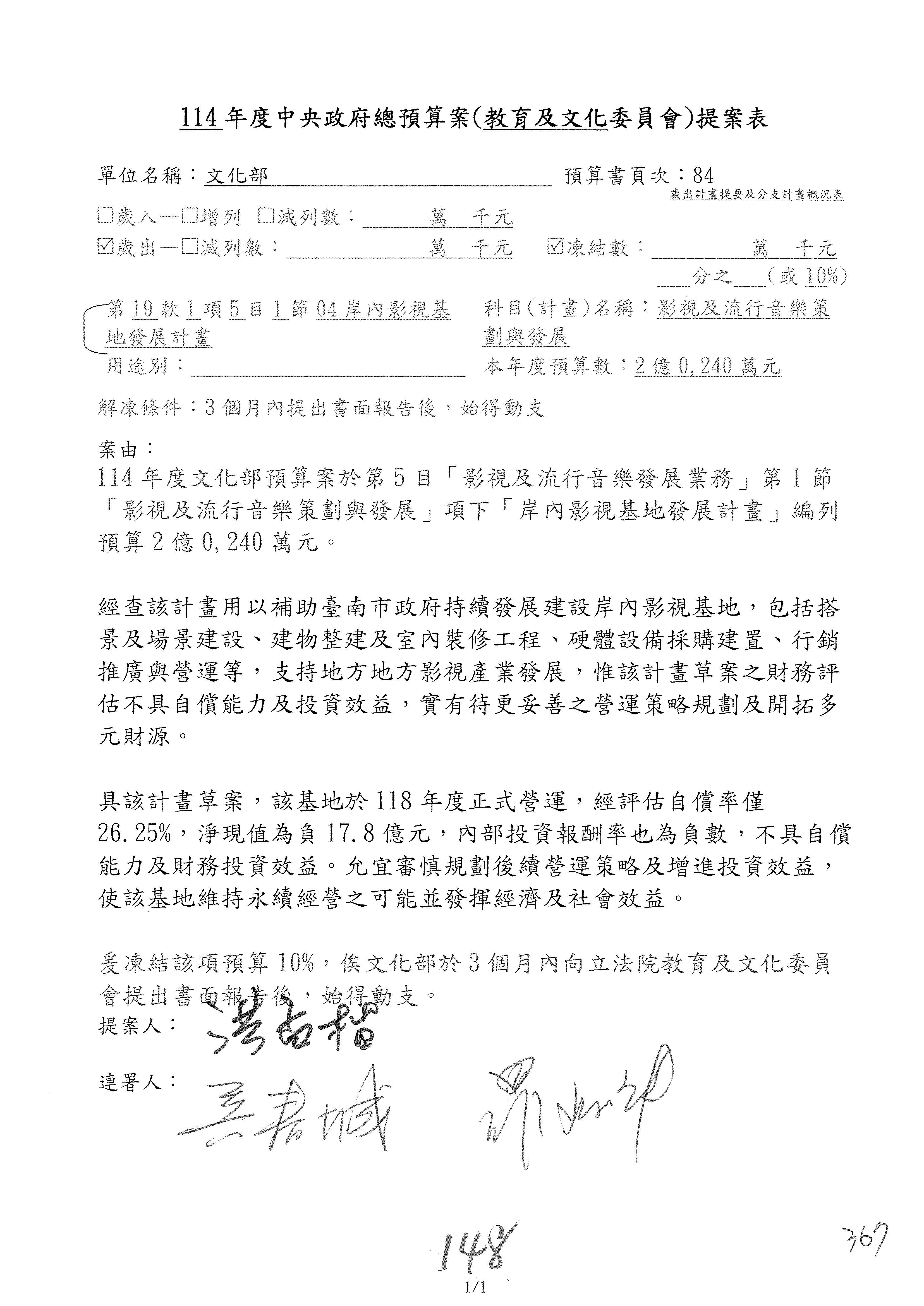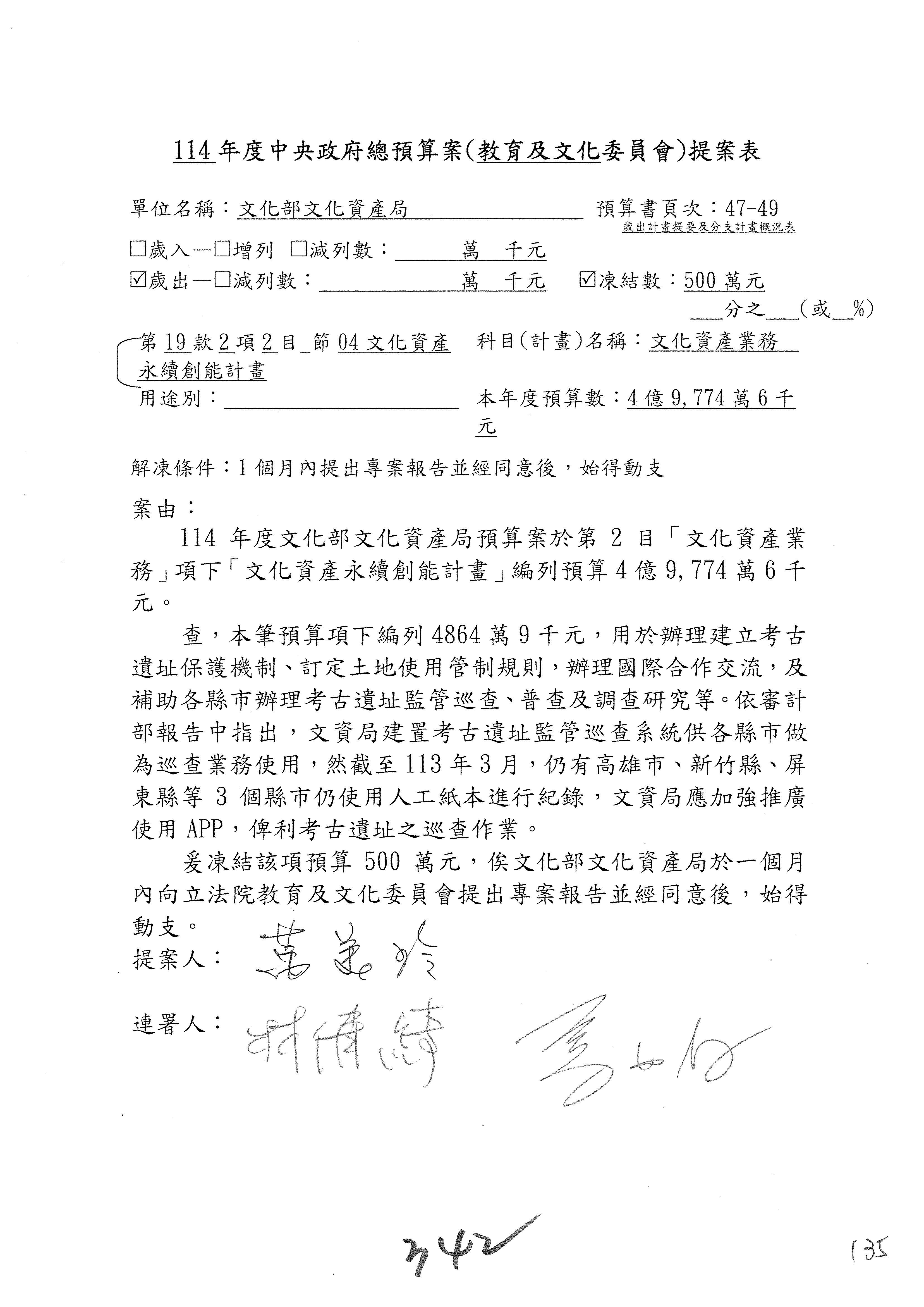 (三)114年度核能安全委員會及所屬第2目「原子能管理發展業務」第1節「原子能科學發展」預算編列27億5,477萬9千元,凍結5,000萬元,俟核能安全委員會向立法院教育及文化委員會提出書面報告後,始得動支。15-42