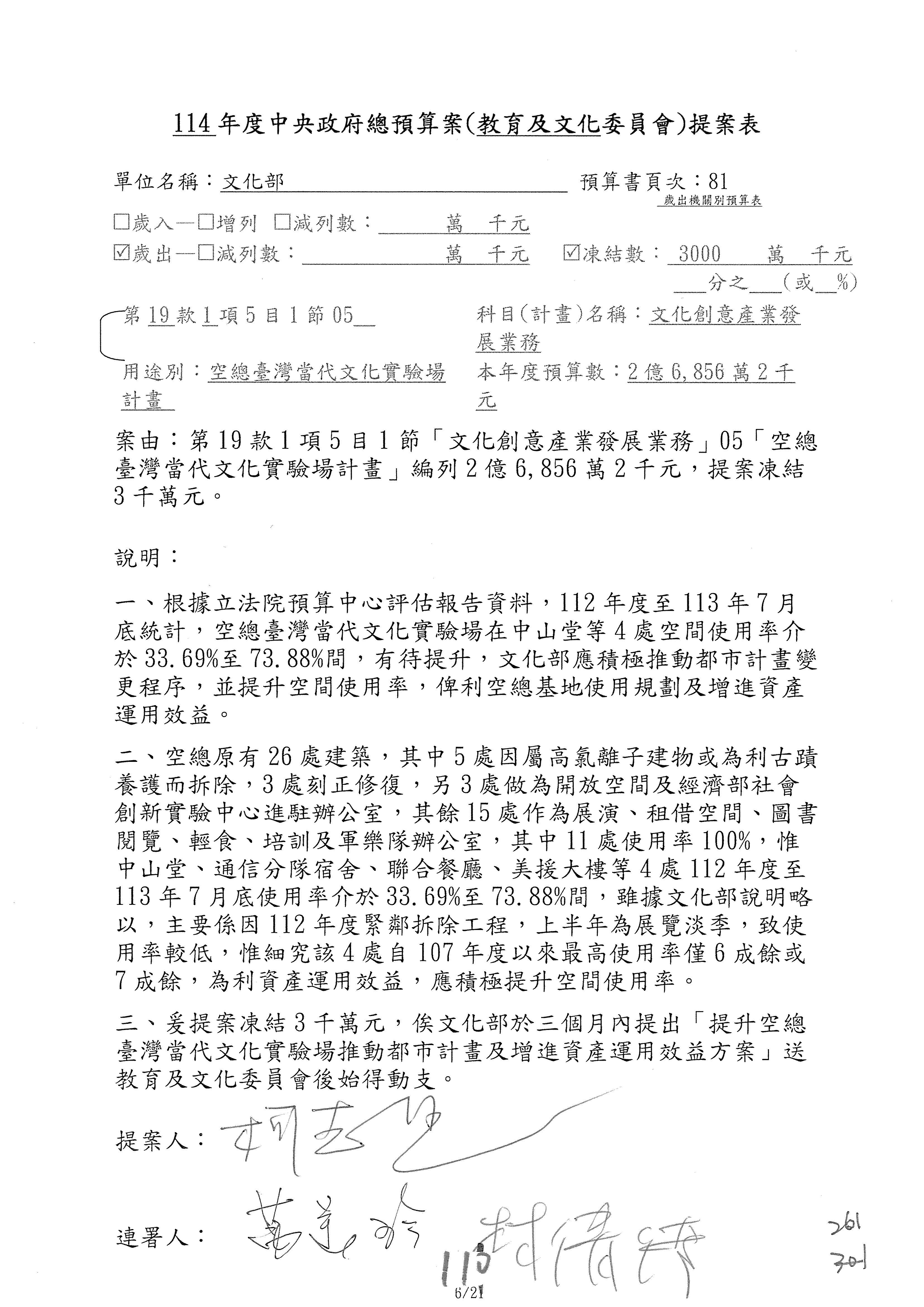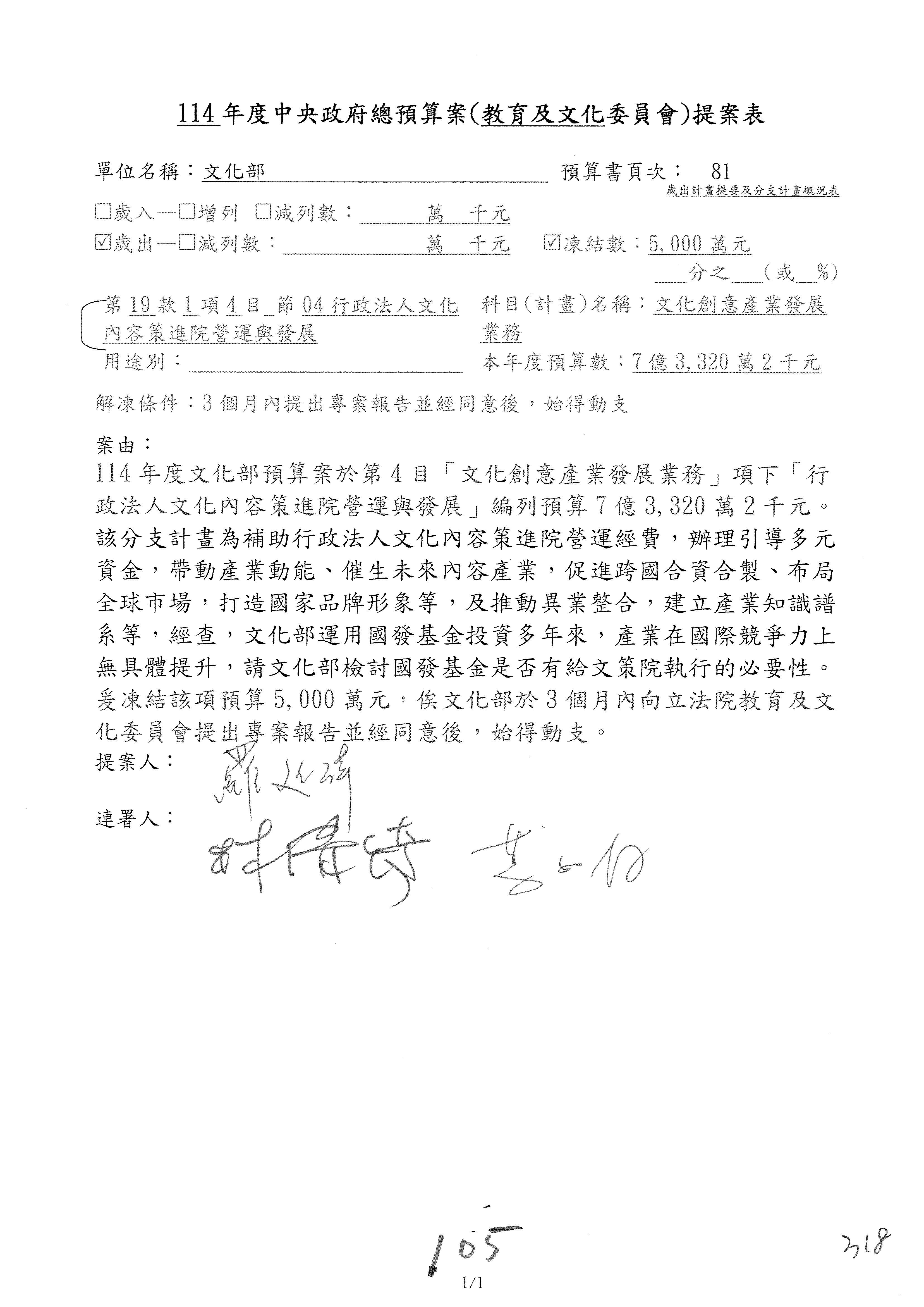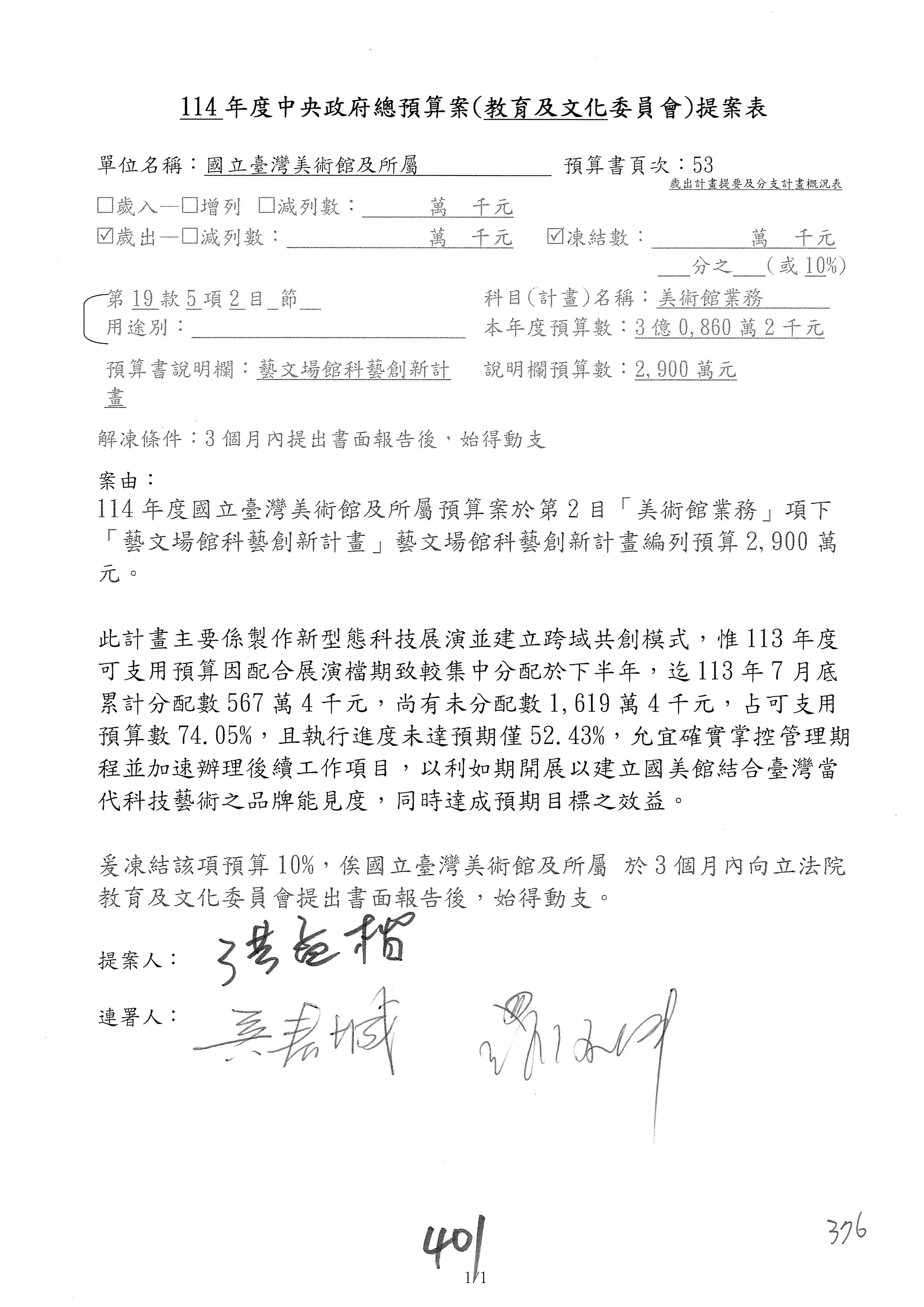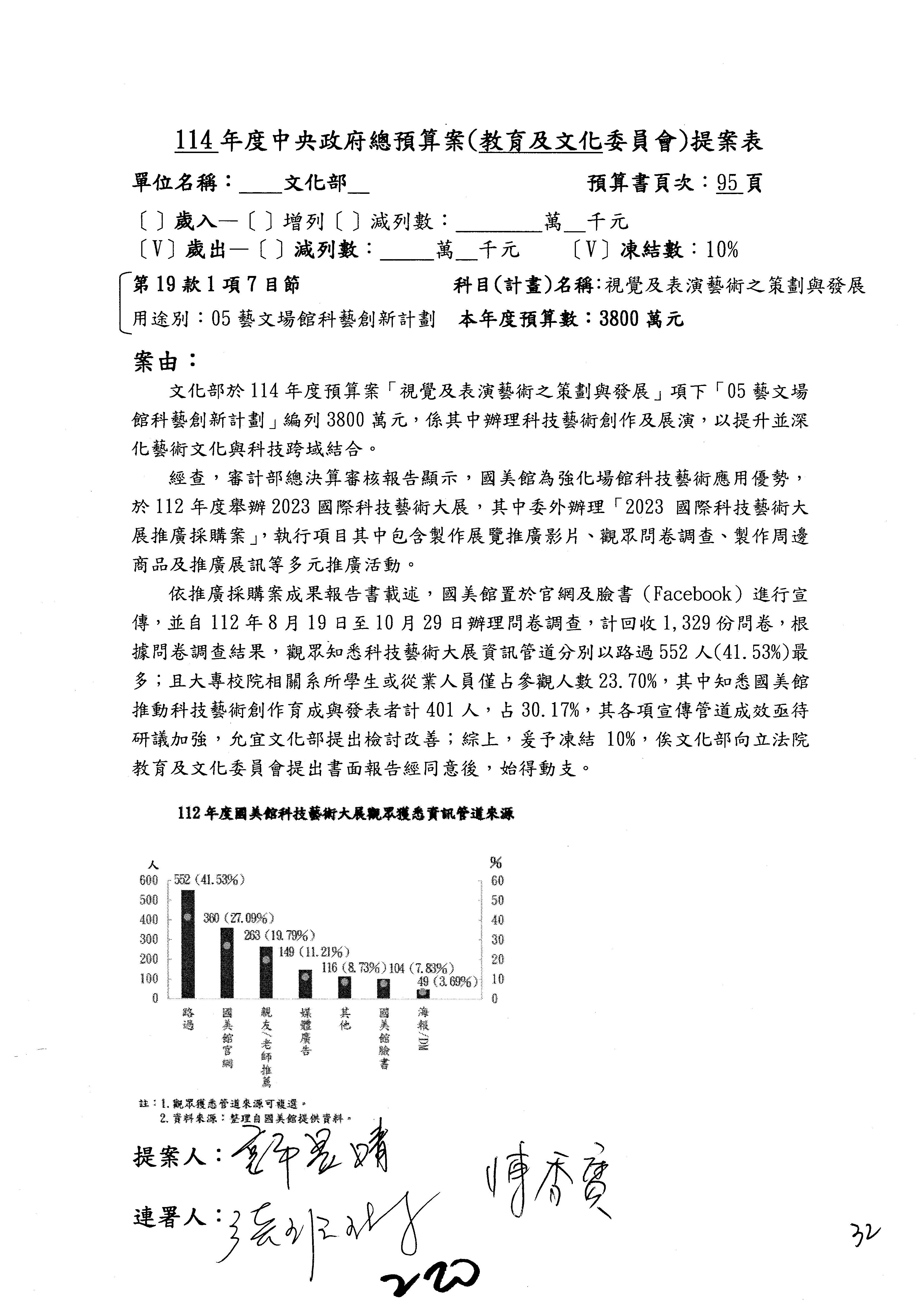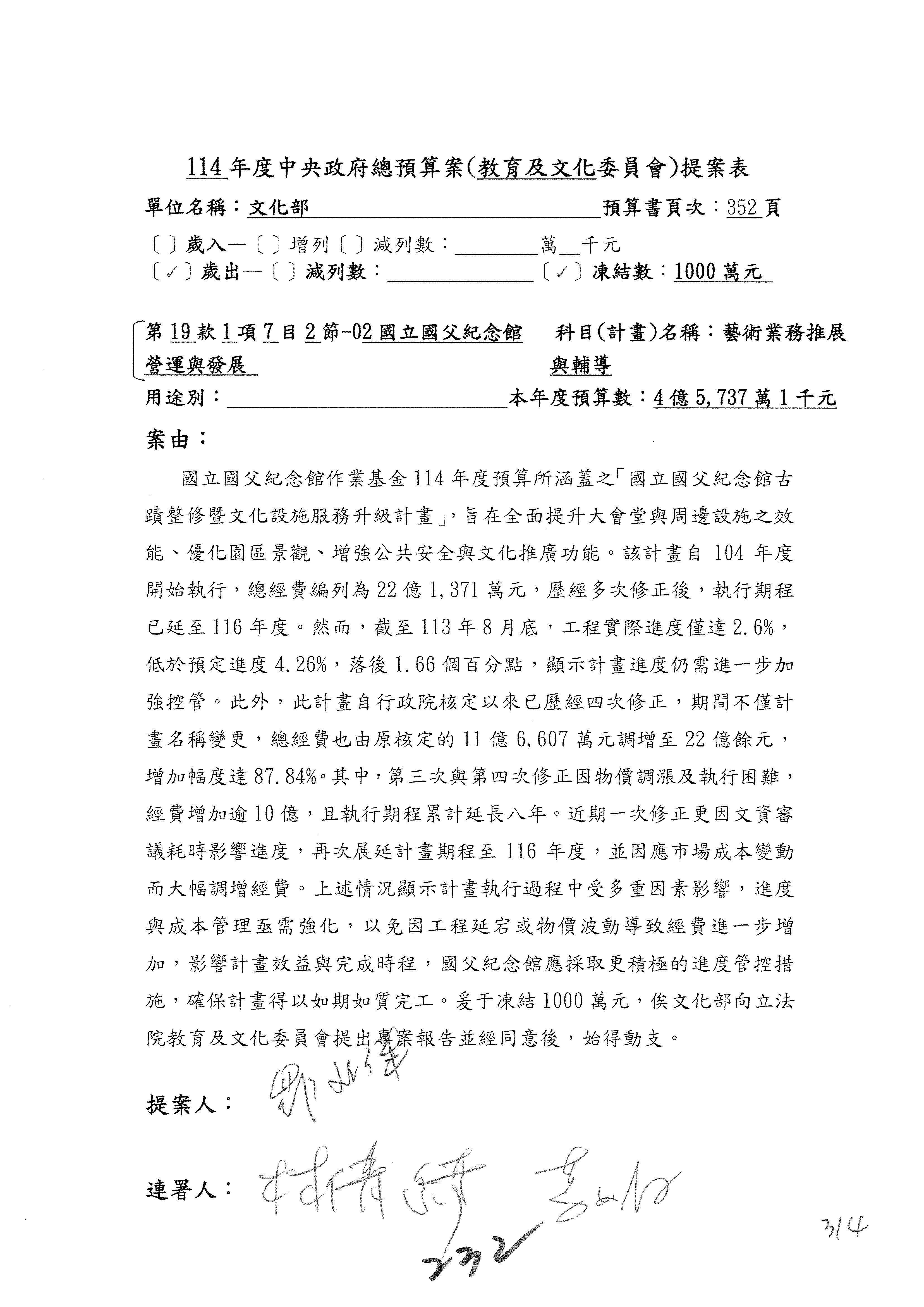 (三)114年度核能安全委員會及所屬第2目「原子能管理發展業務」第1節「原子能科學發展」預算編列27億5,477萬9千元,凍結5,000萬元,俟核能安全委員會向立法院教育及文化委員會提出書面報告後,始得動支。15-42