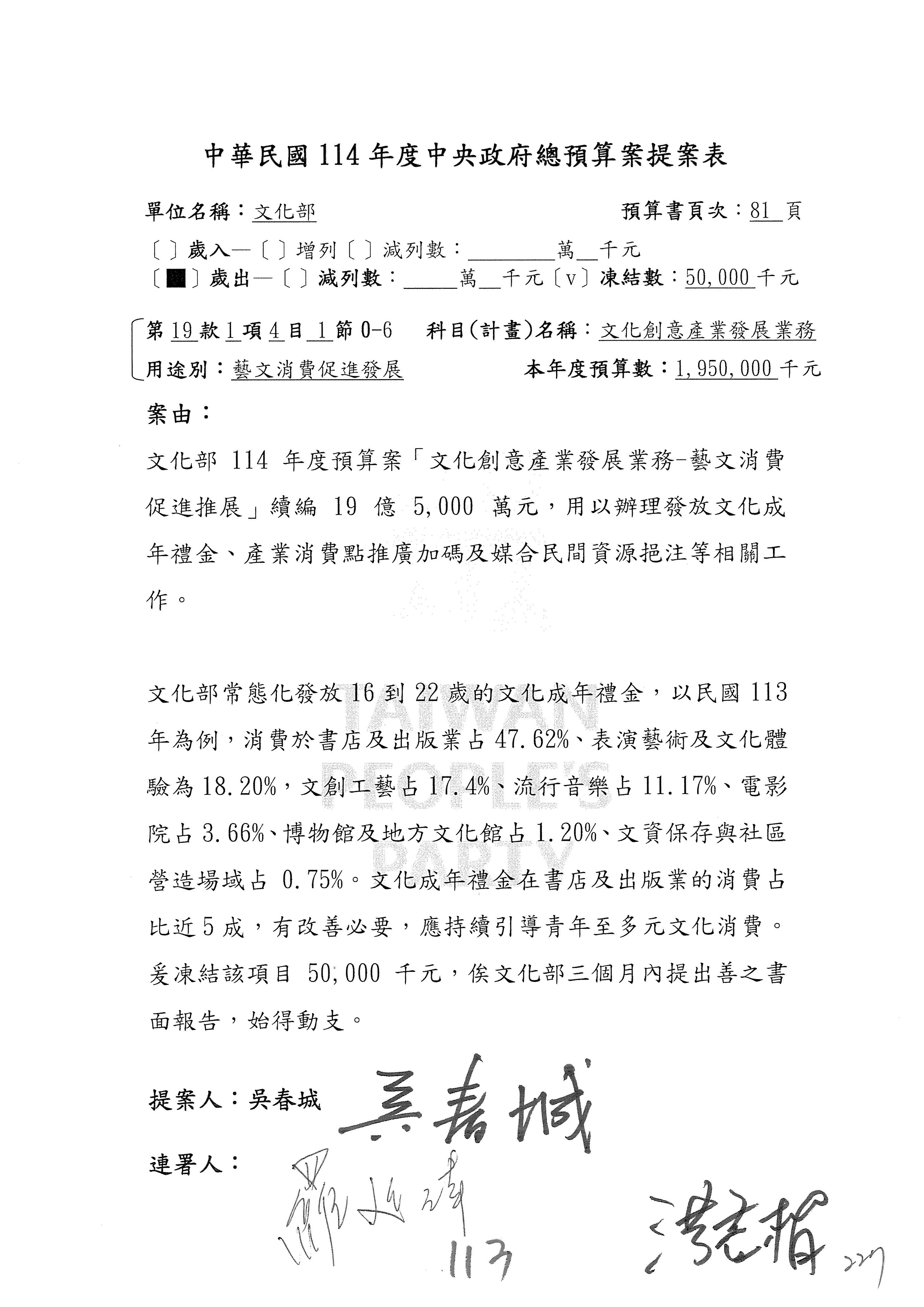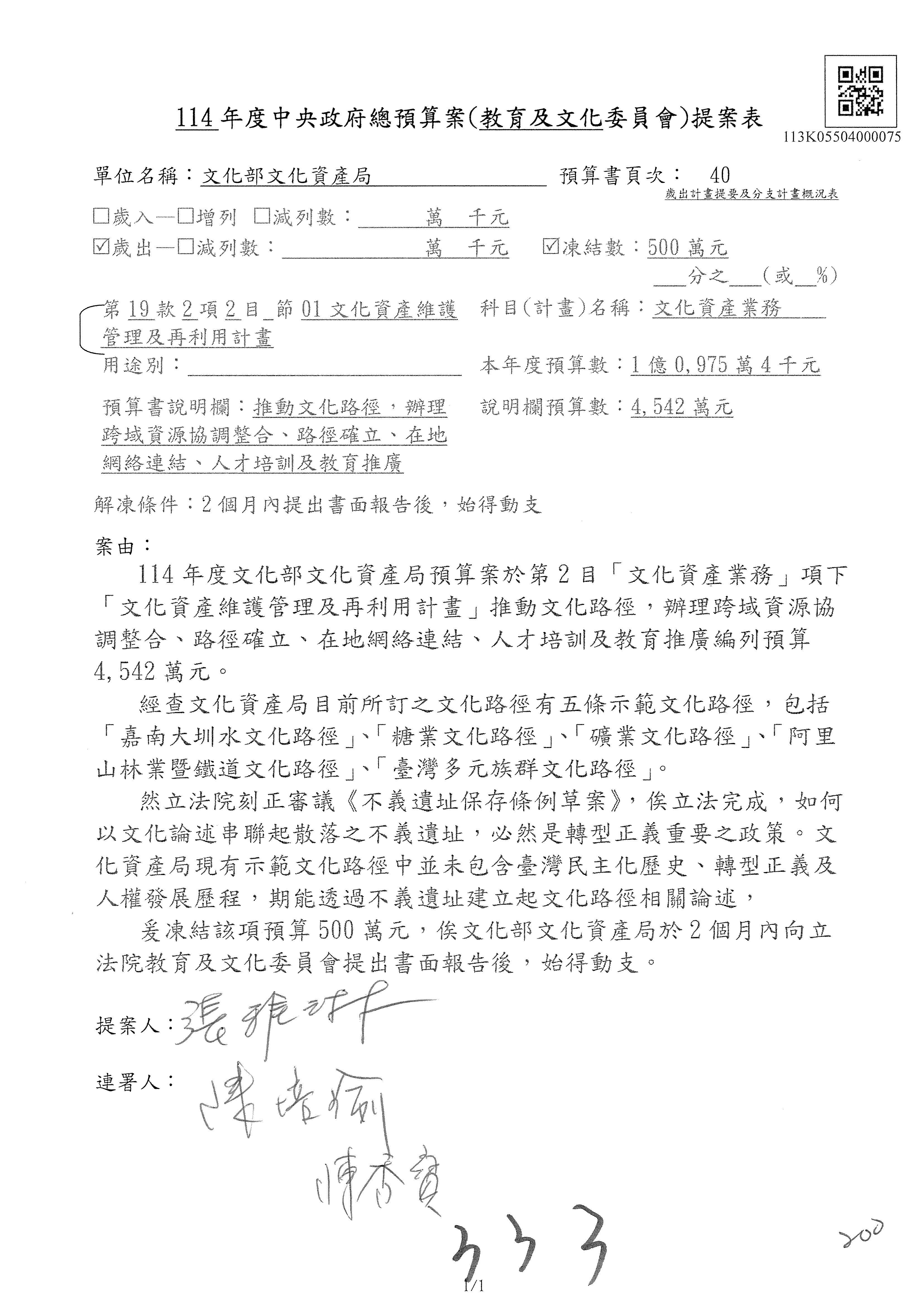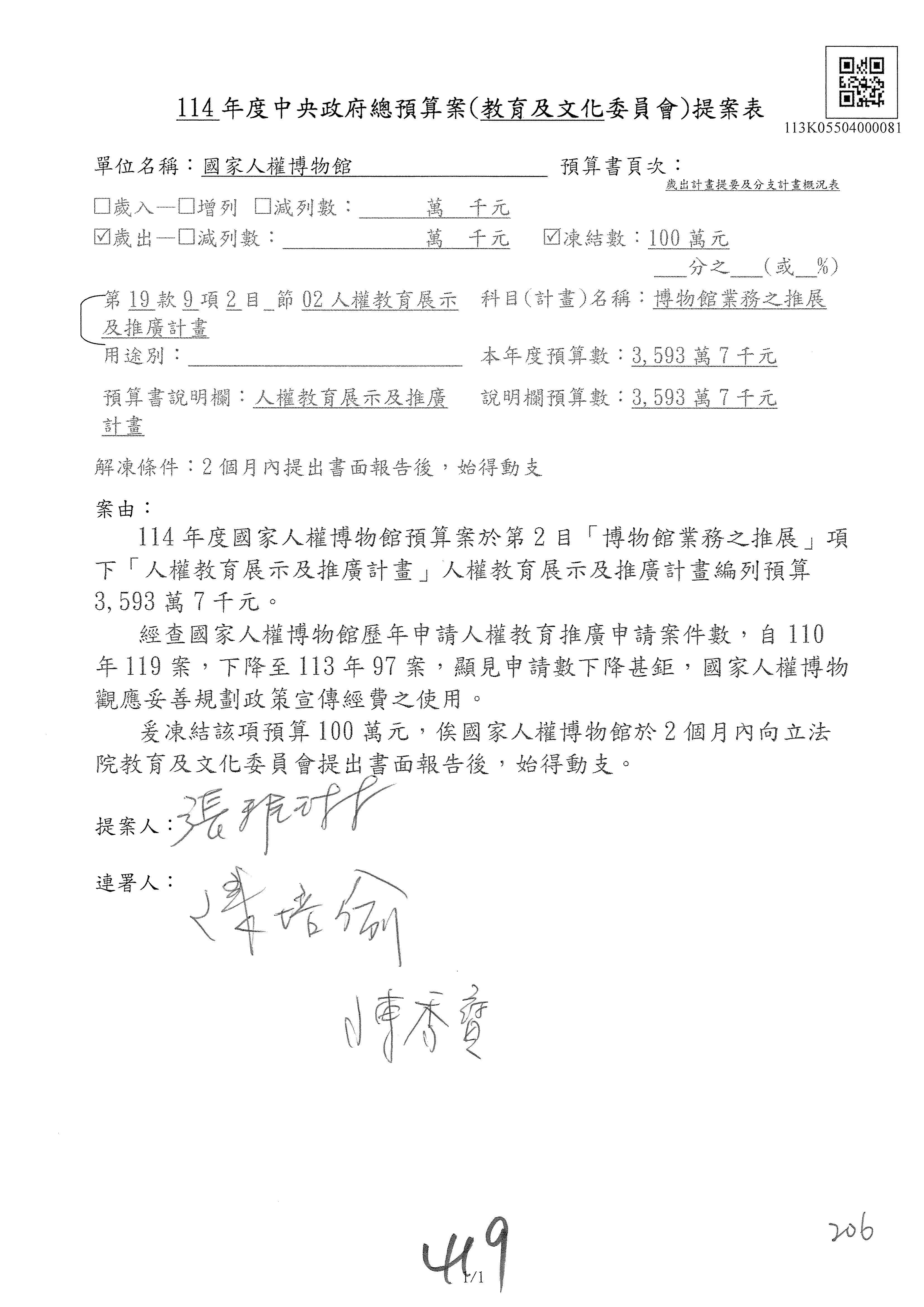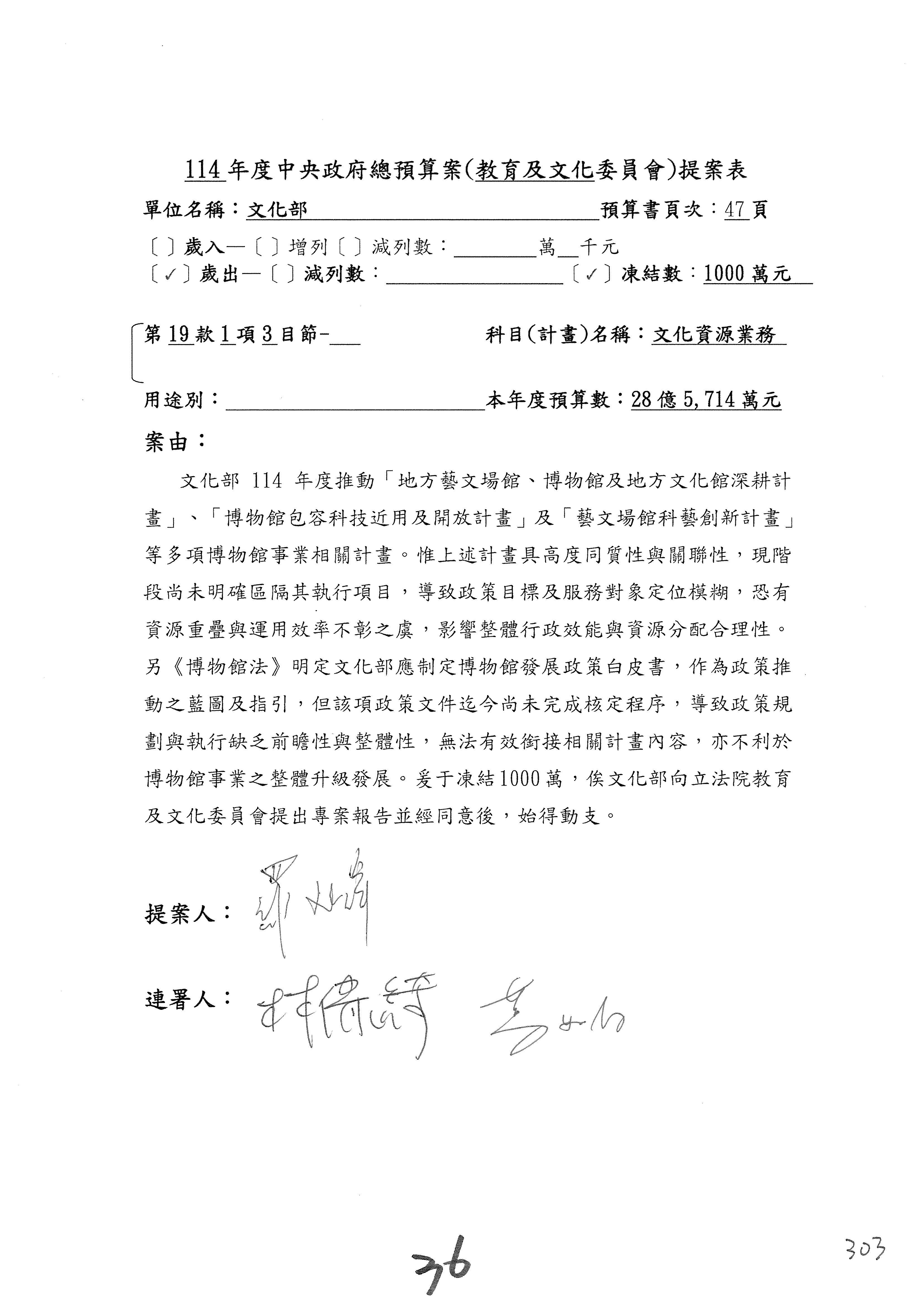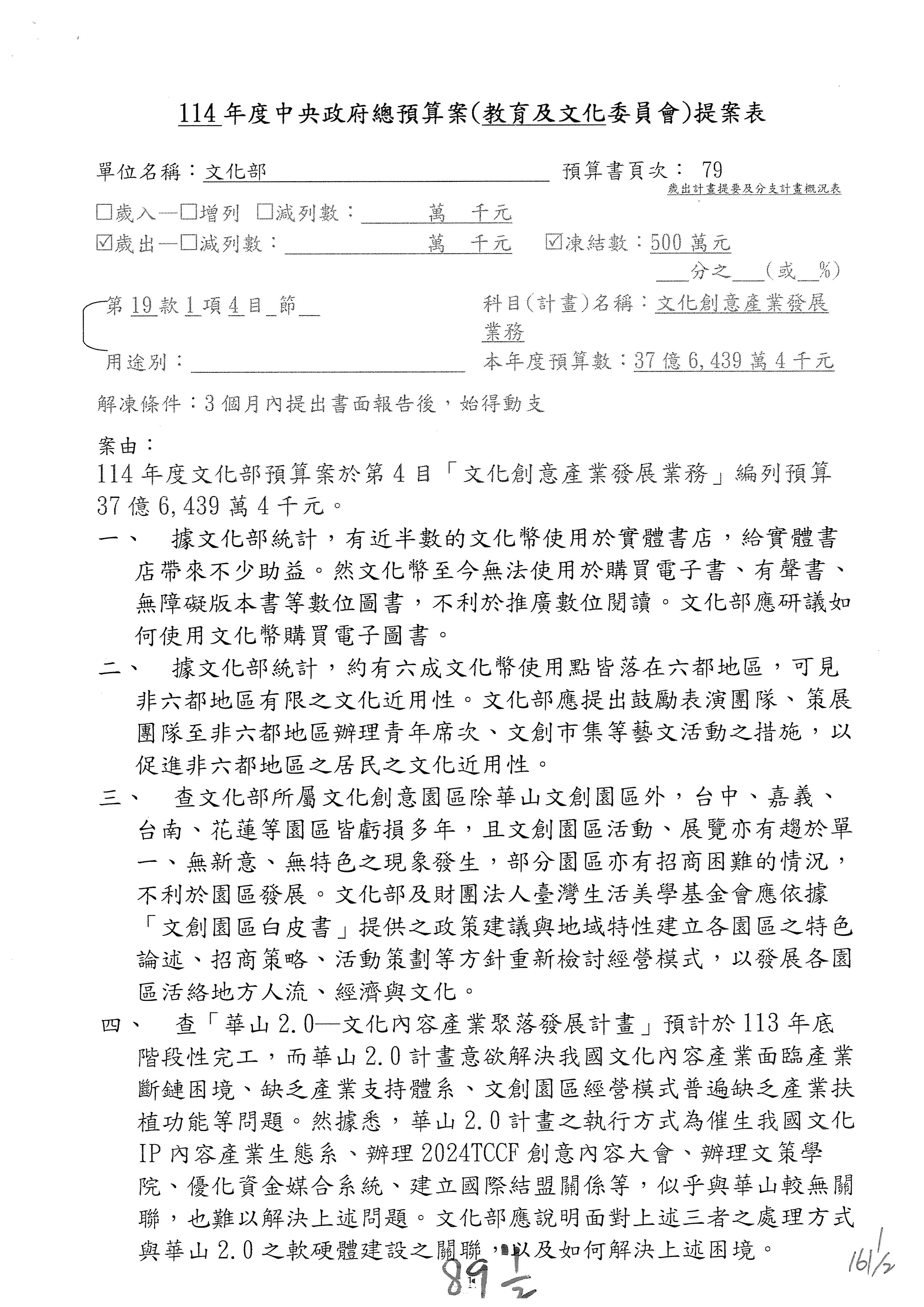 (三)114年度核能安全委員會及所屬第2目「原子能管理發展業務」第1節「原子能科學發展」預算編列27億5,477萬9千元,凍結5,000萬元,俟核能安全委員會向立法院教育及文化委員會提出書面報告後,始得動支。15-42
