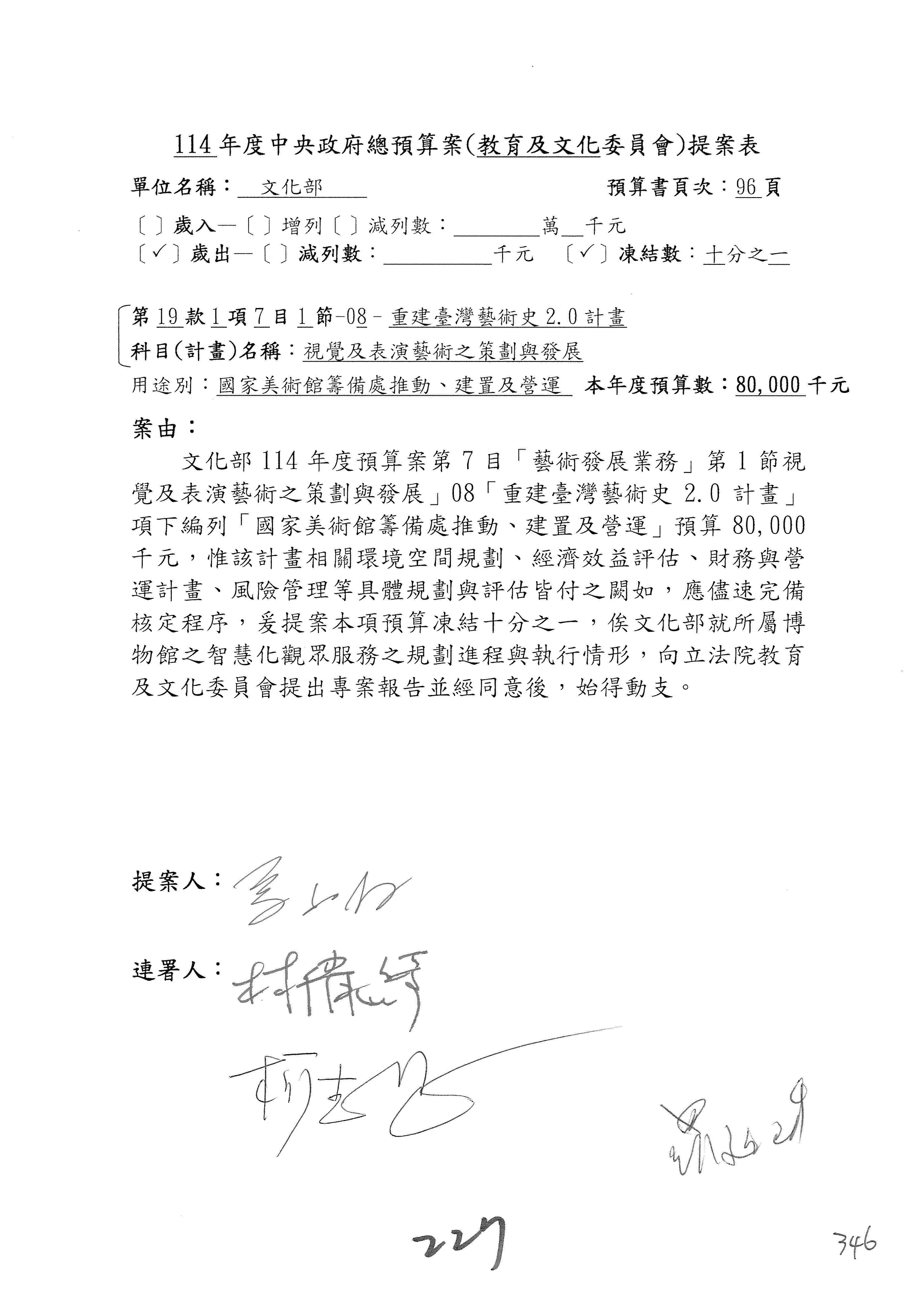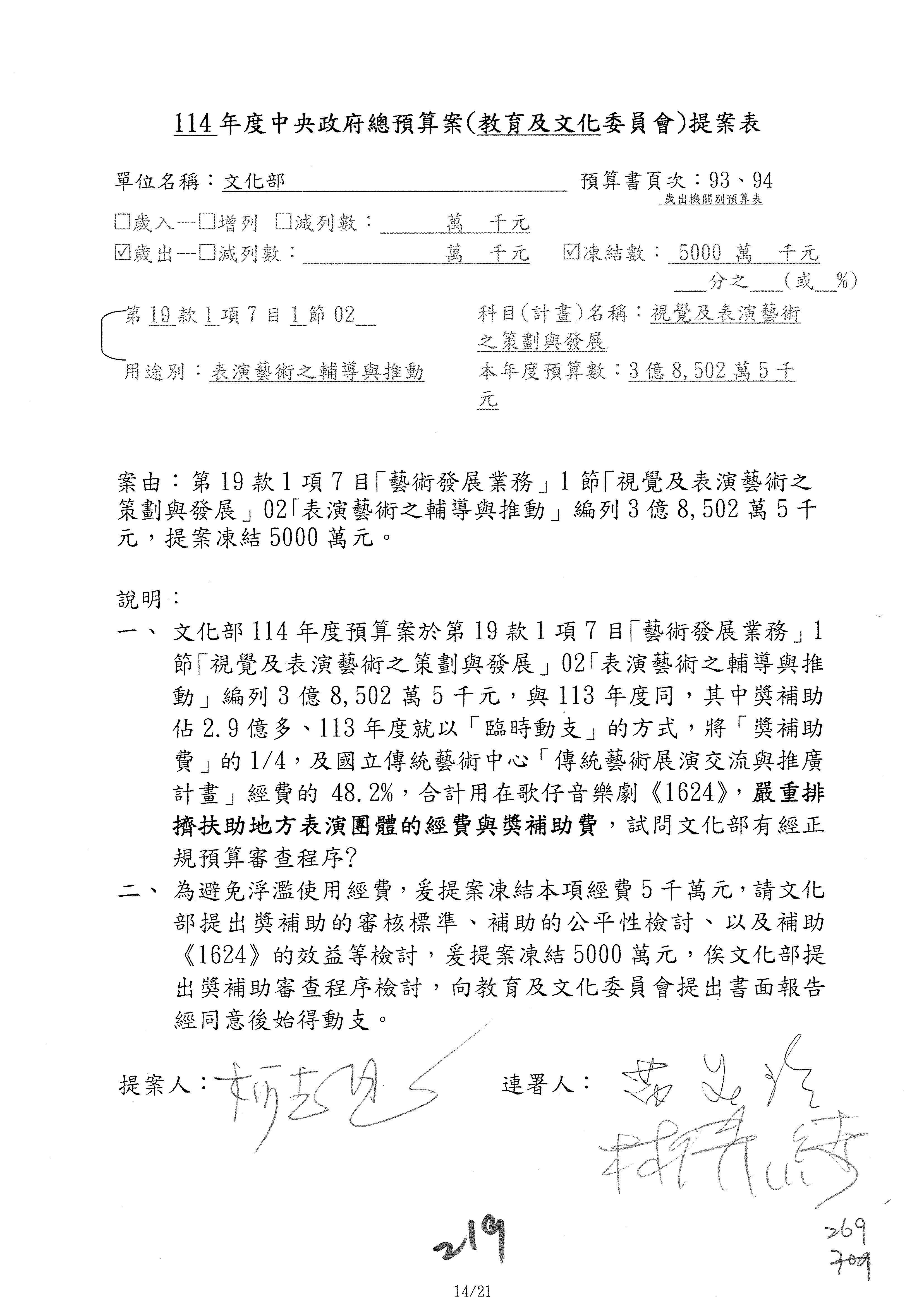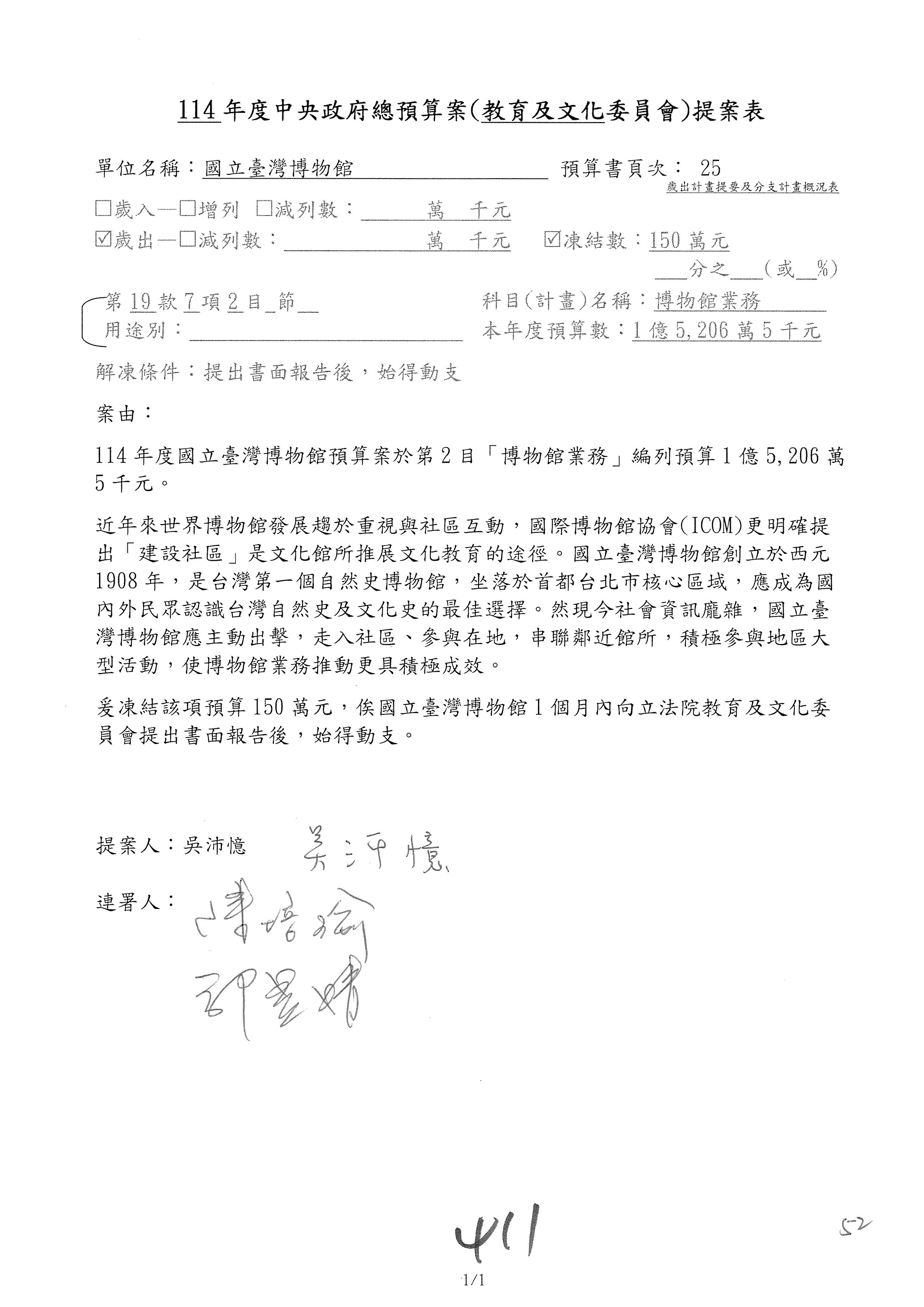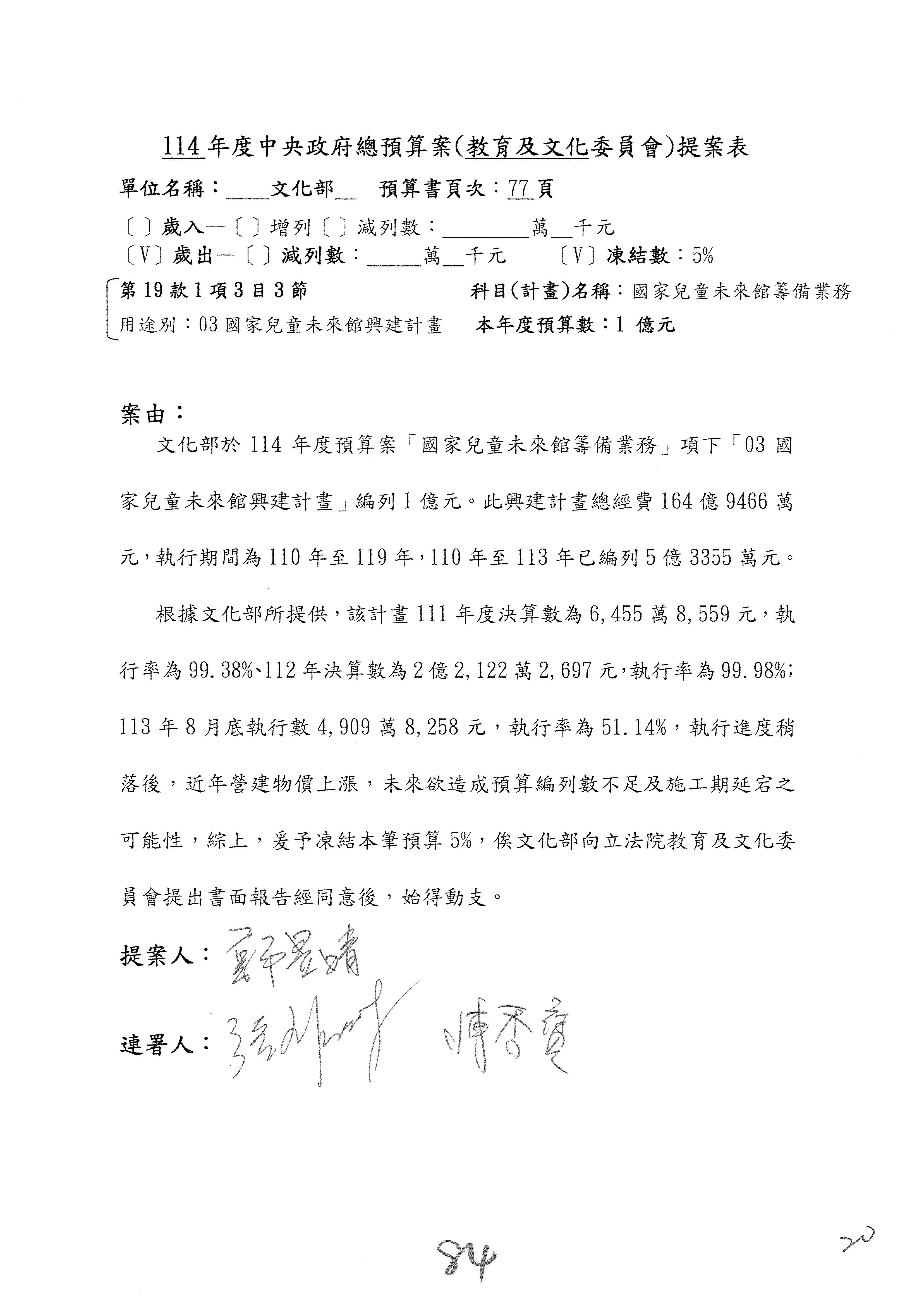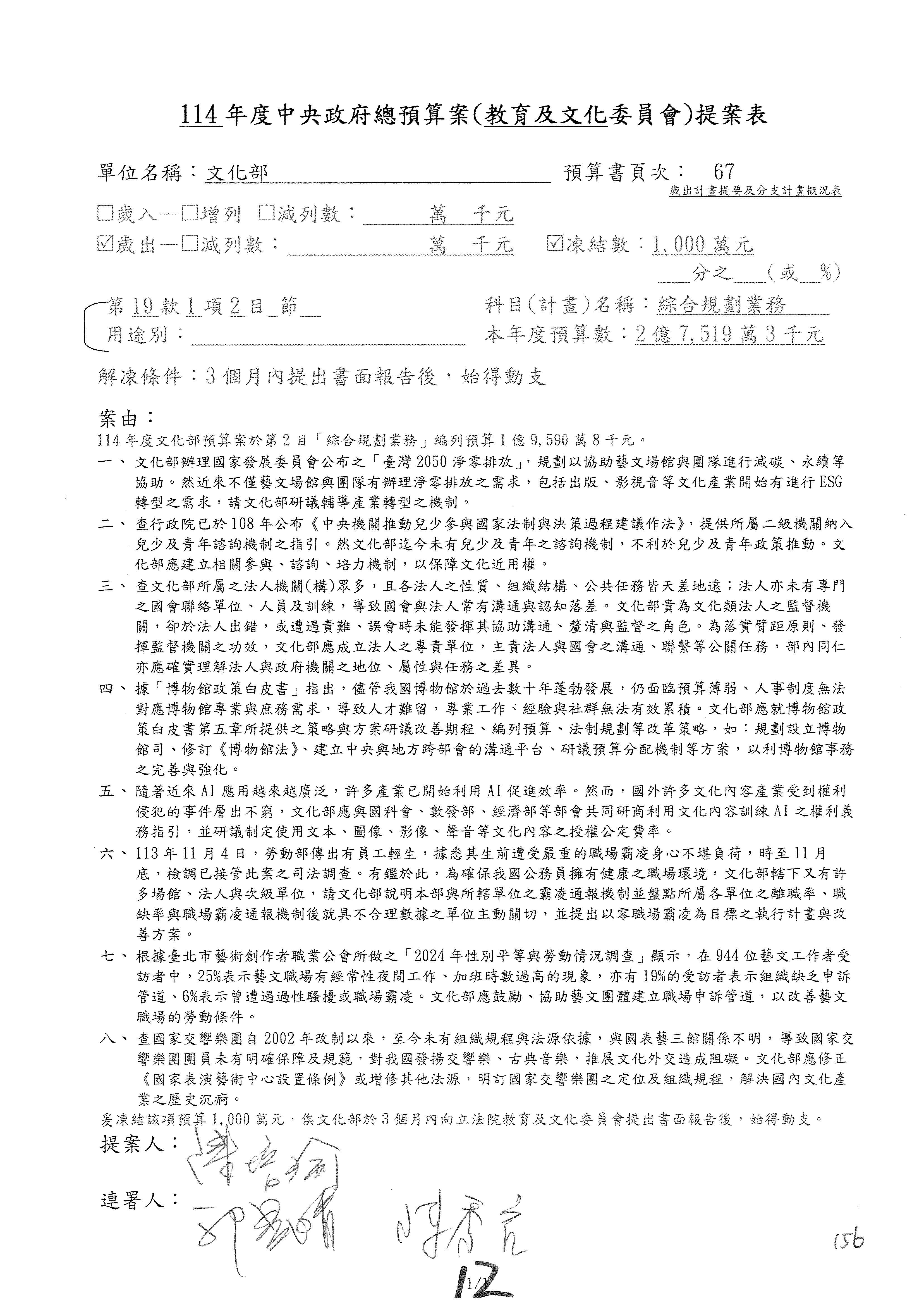 (三)114年度核能安全委員會及所屬第2目「原子能管理發展業務」第1節「原子能科學發展」預算編列27億5,477萬9千元,凍結5,000萬元,俟核能安全委員會向立法院教育及文化委員會提出書面報告後,始得動支。15-42