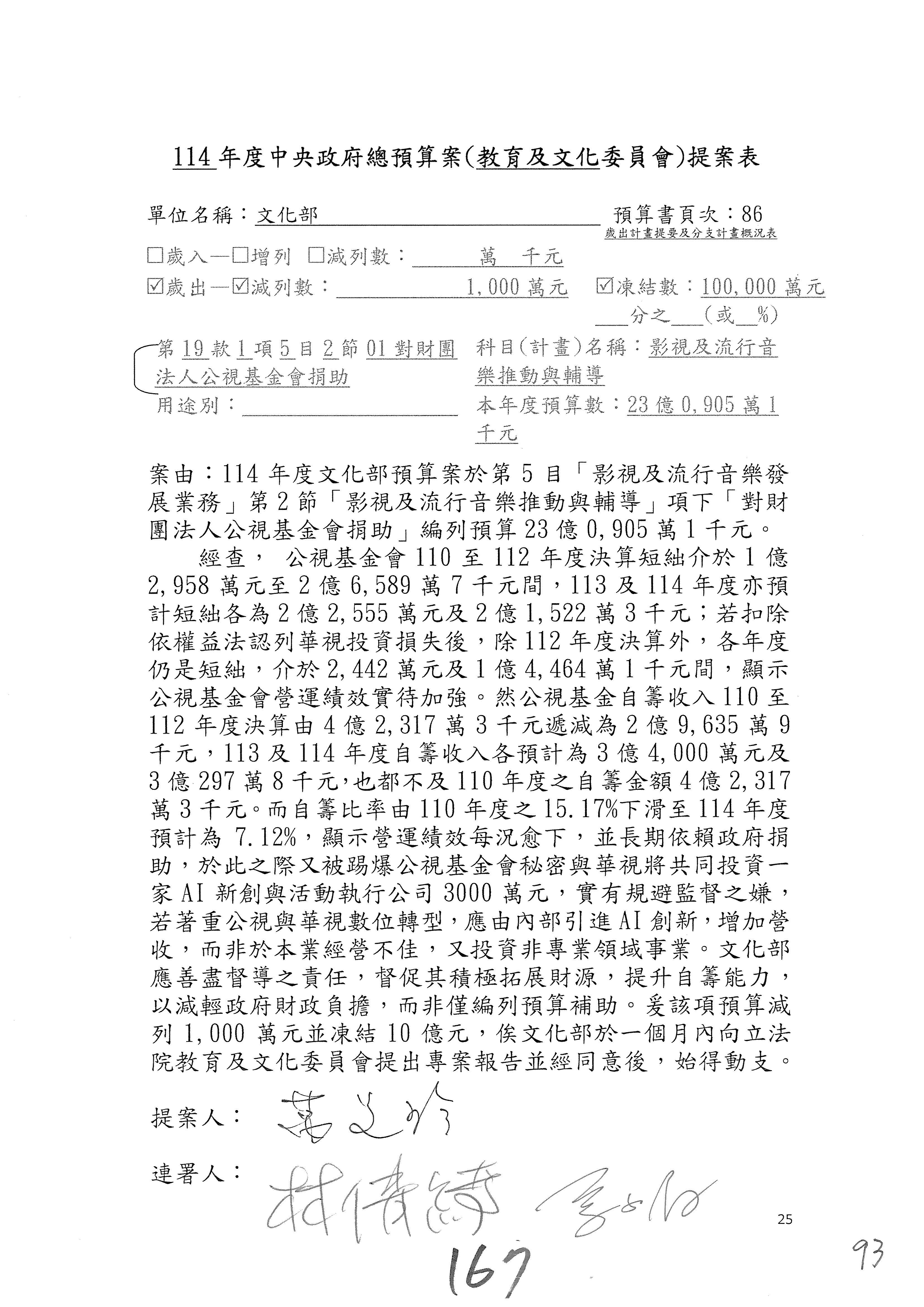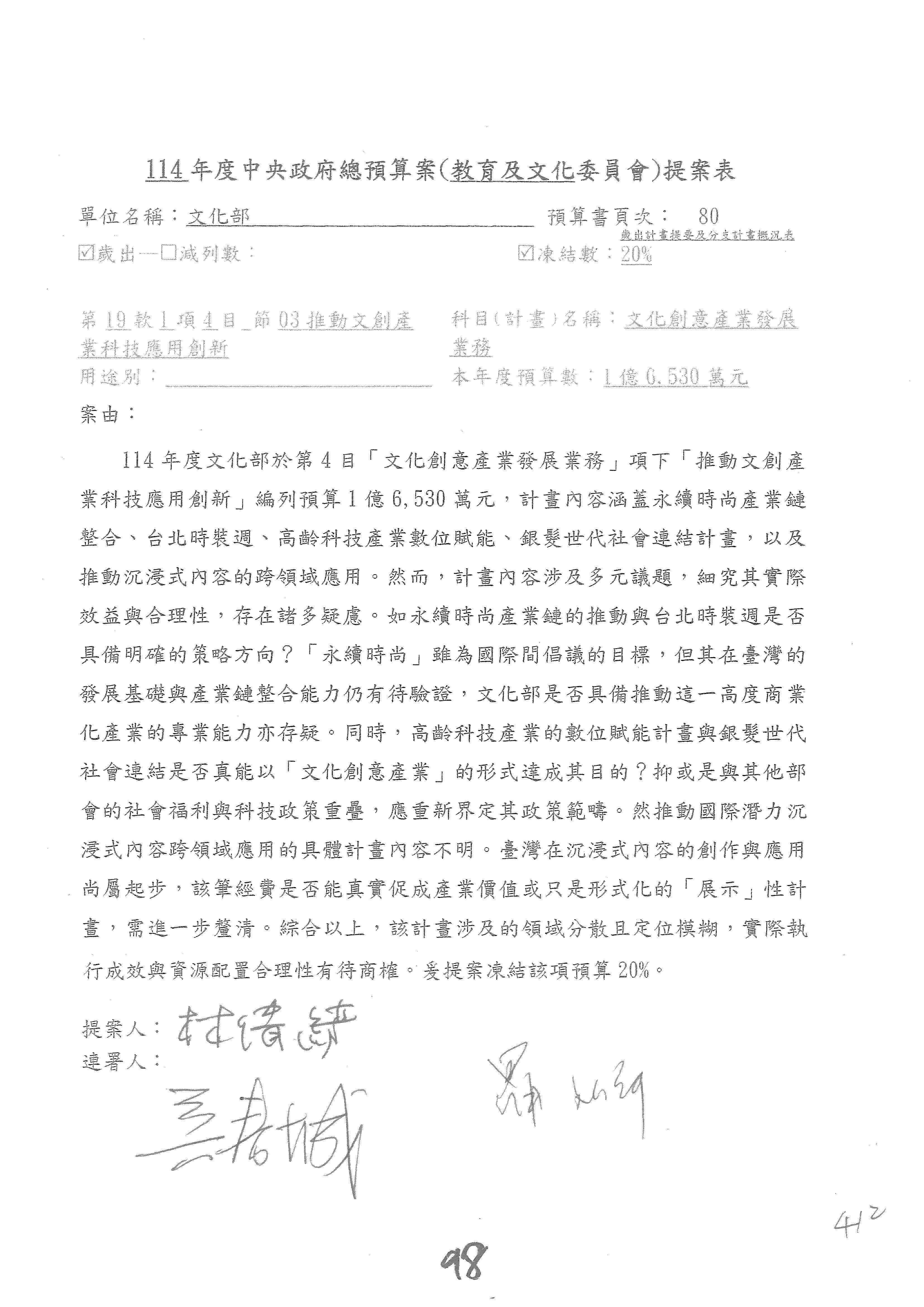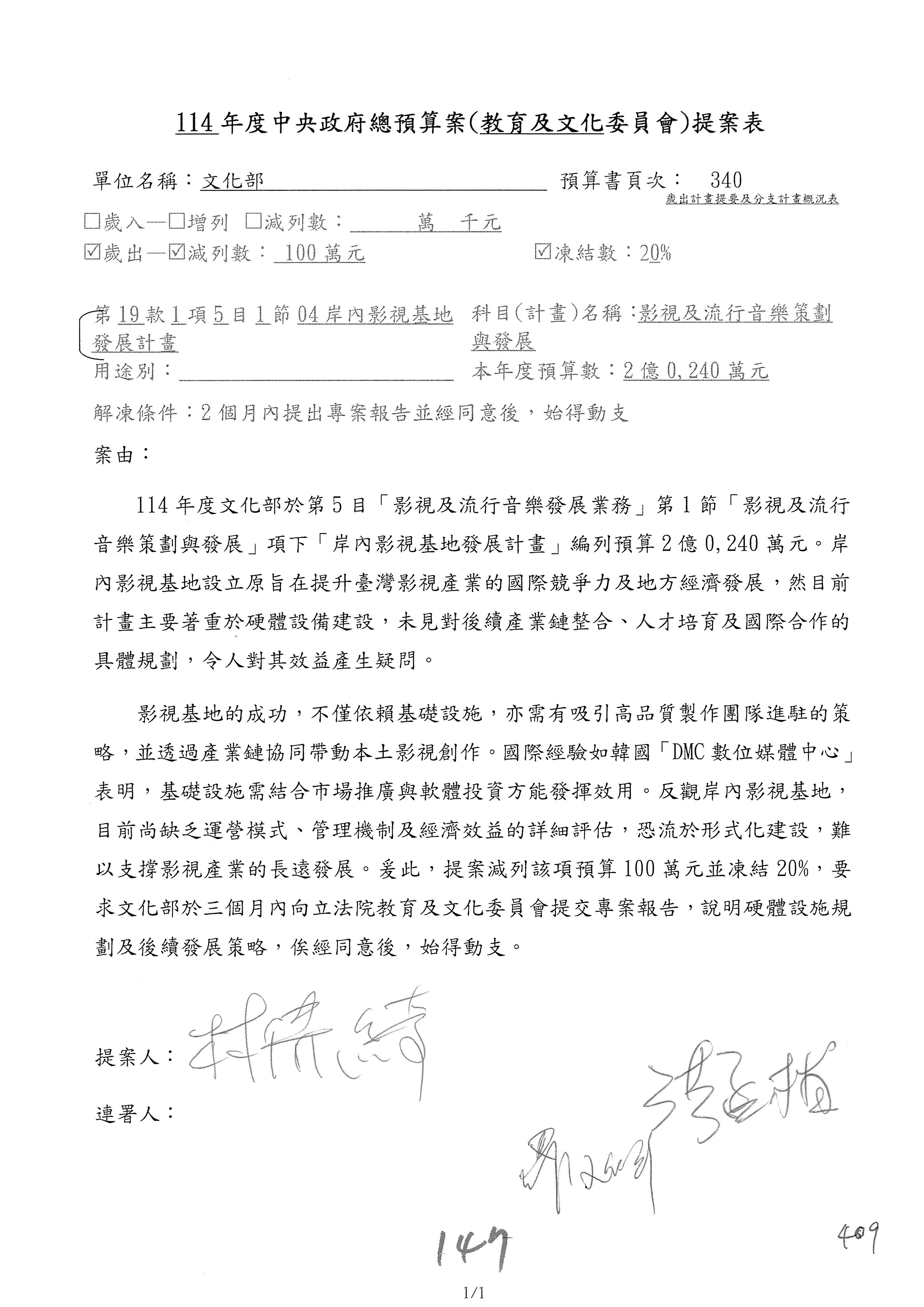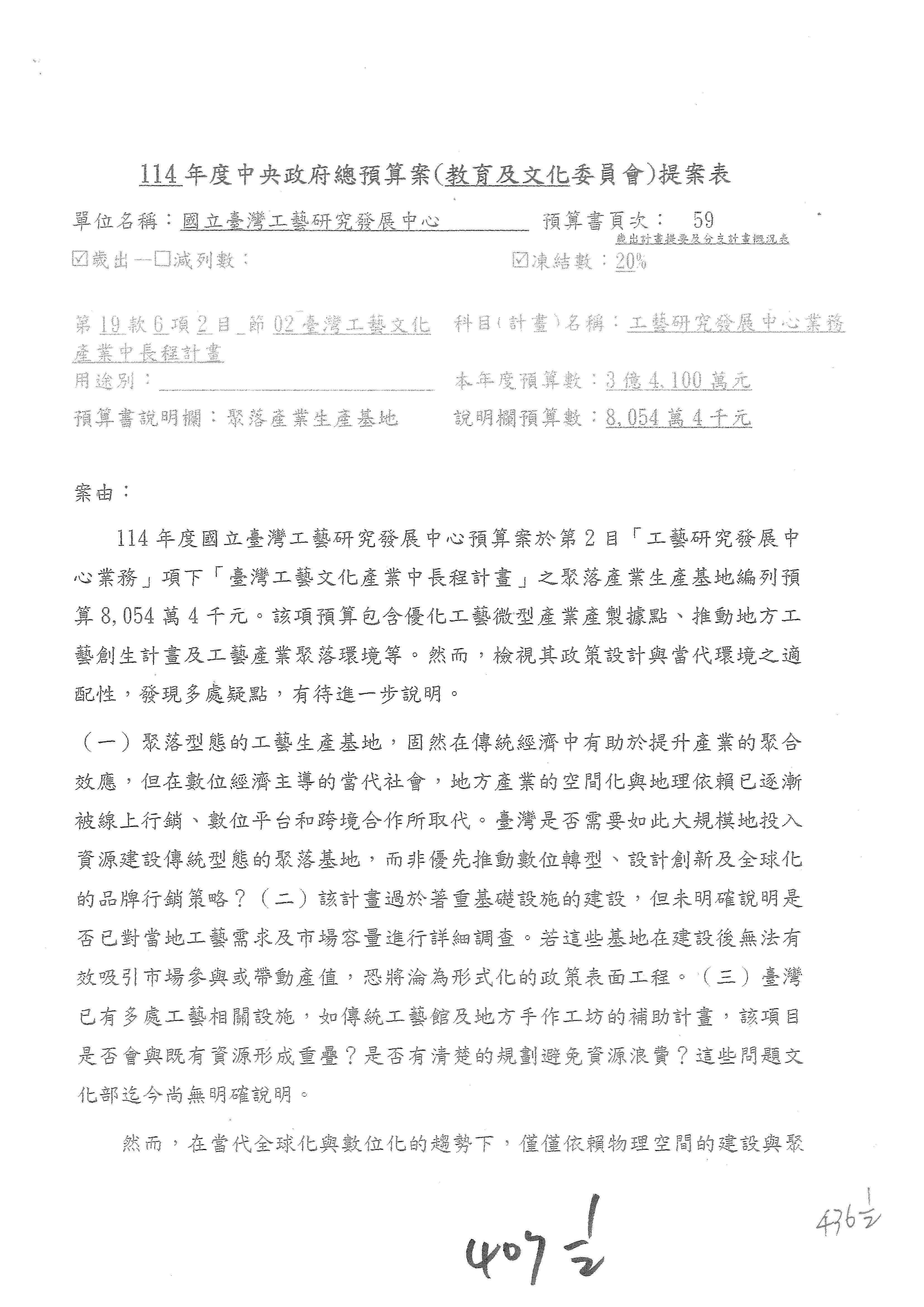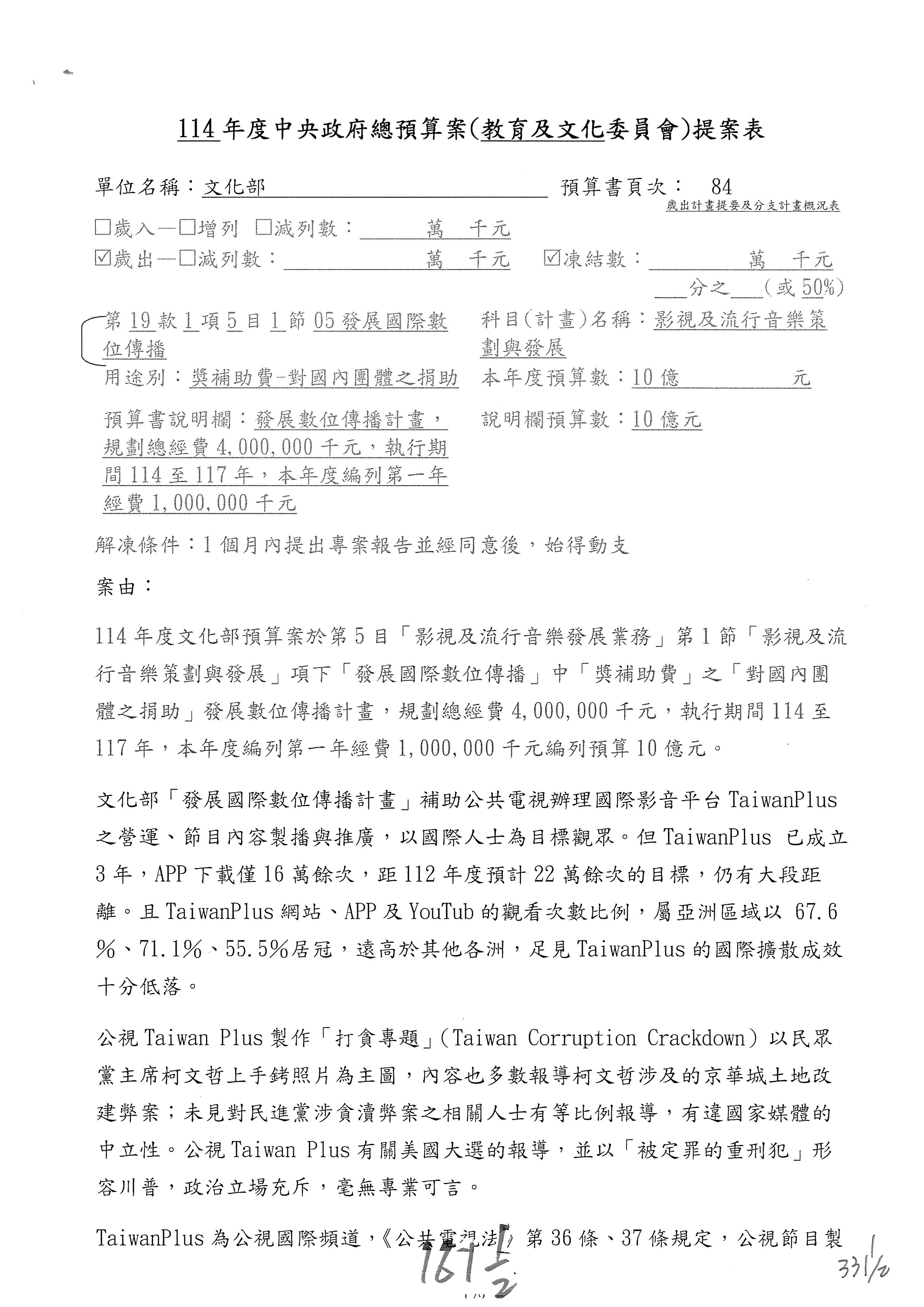 (三)114年度核能安全委員會及所屬第2目「原子能管理發展業務」第1節「原子能科學發展」預算編列27億5,477萬9千元,凍結5,000萬元,俟核能安全委員會向立法院教育及文化委員會提出書面報告後,始得動支。15-42