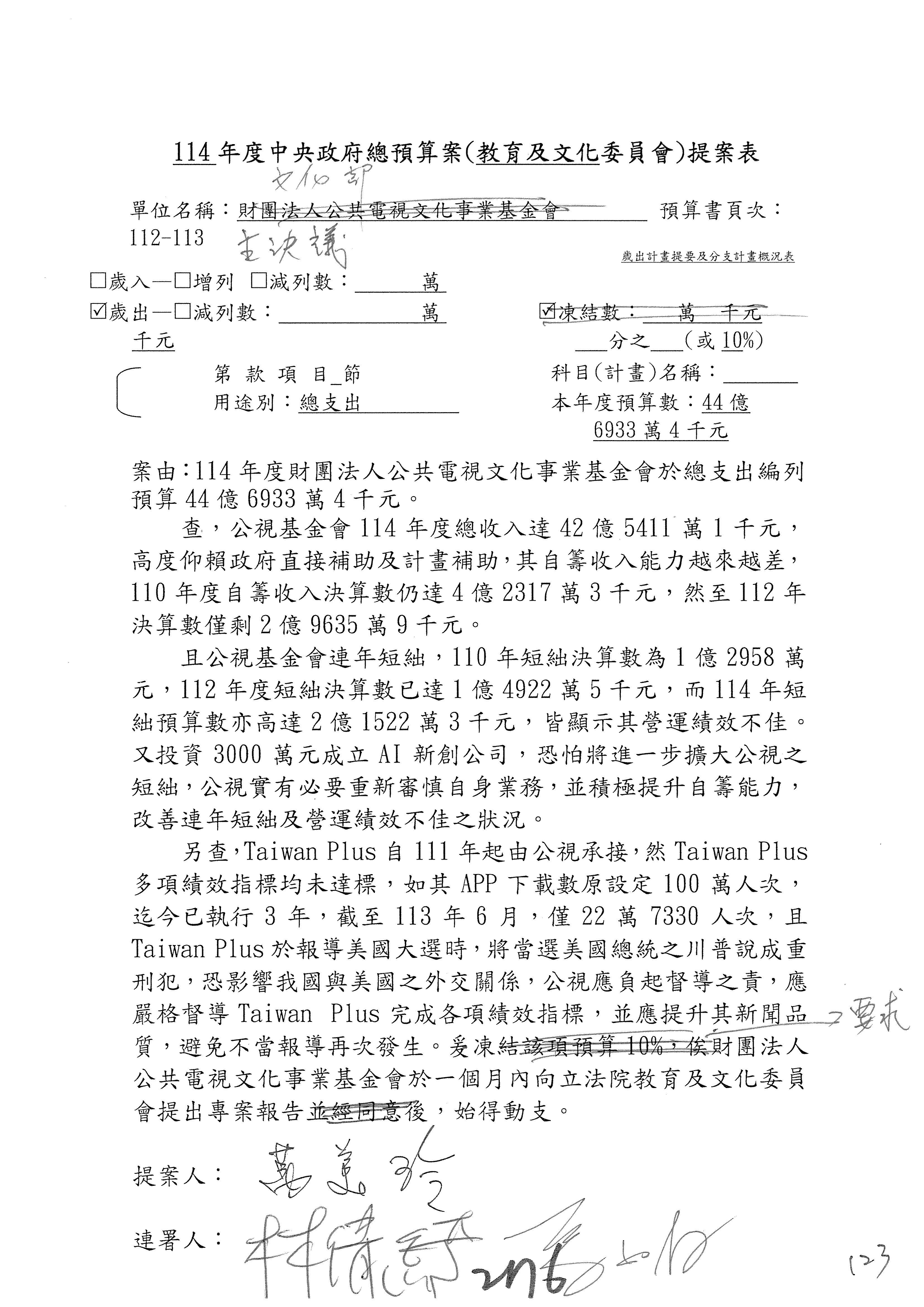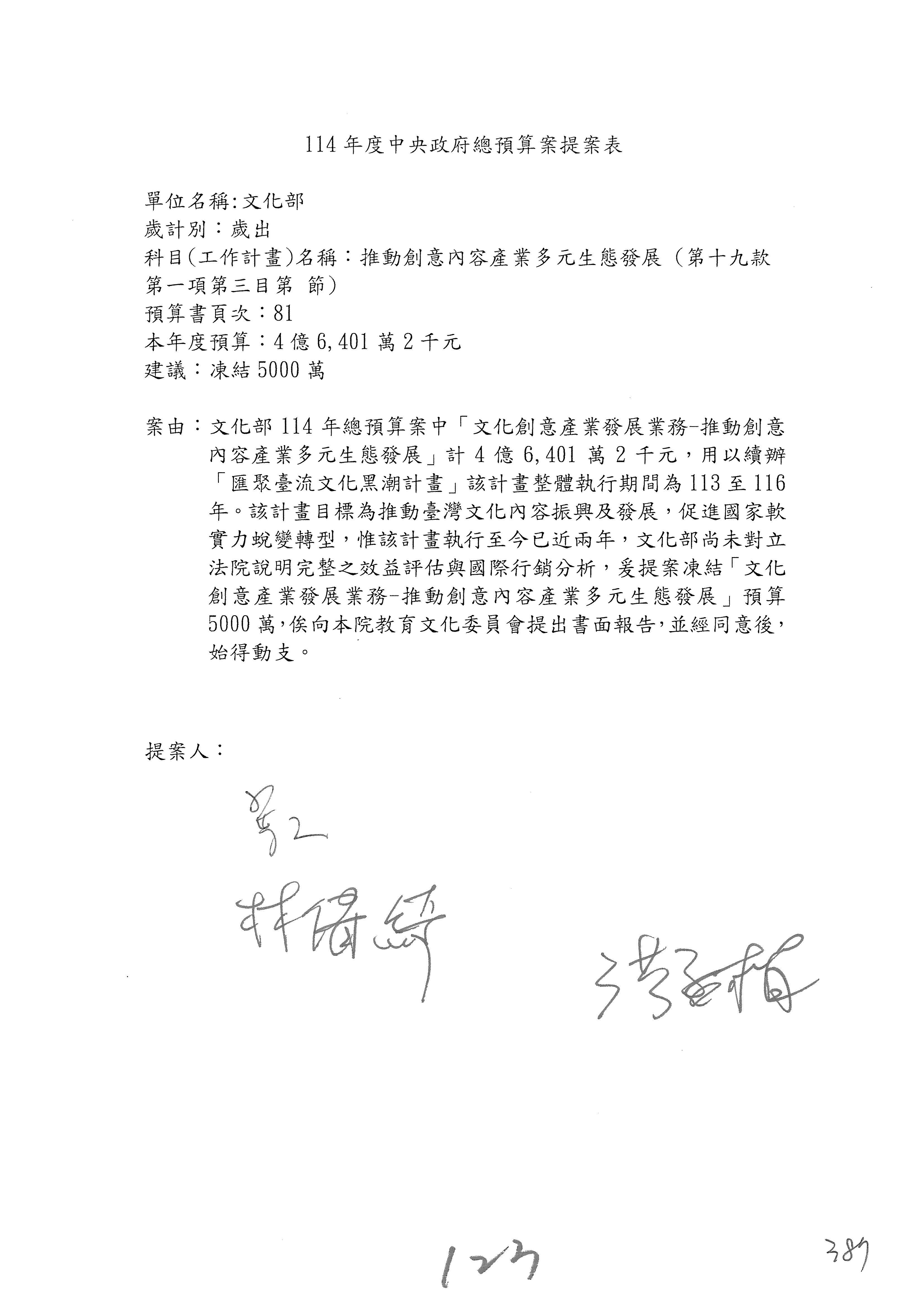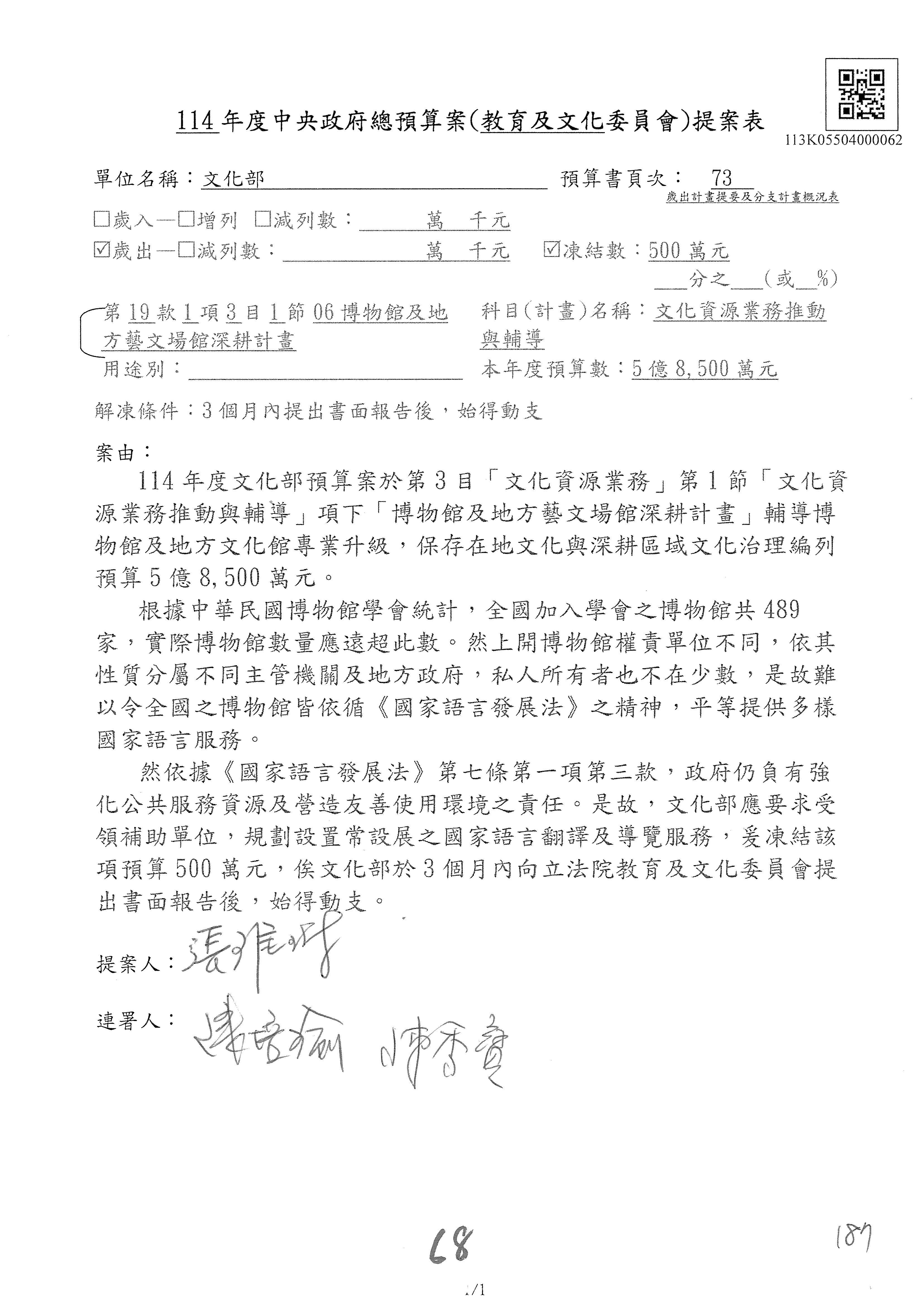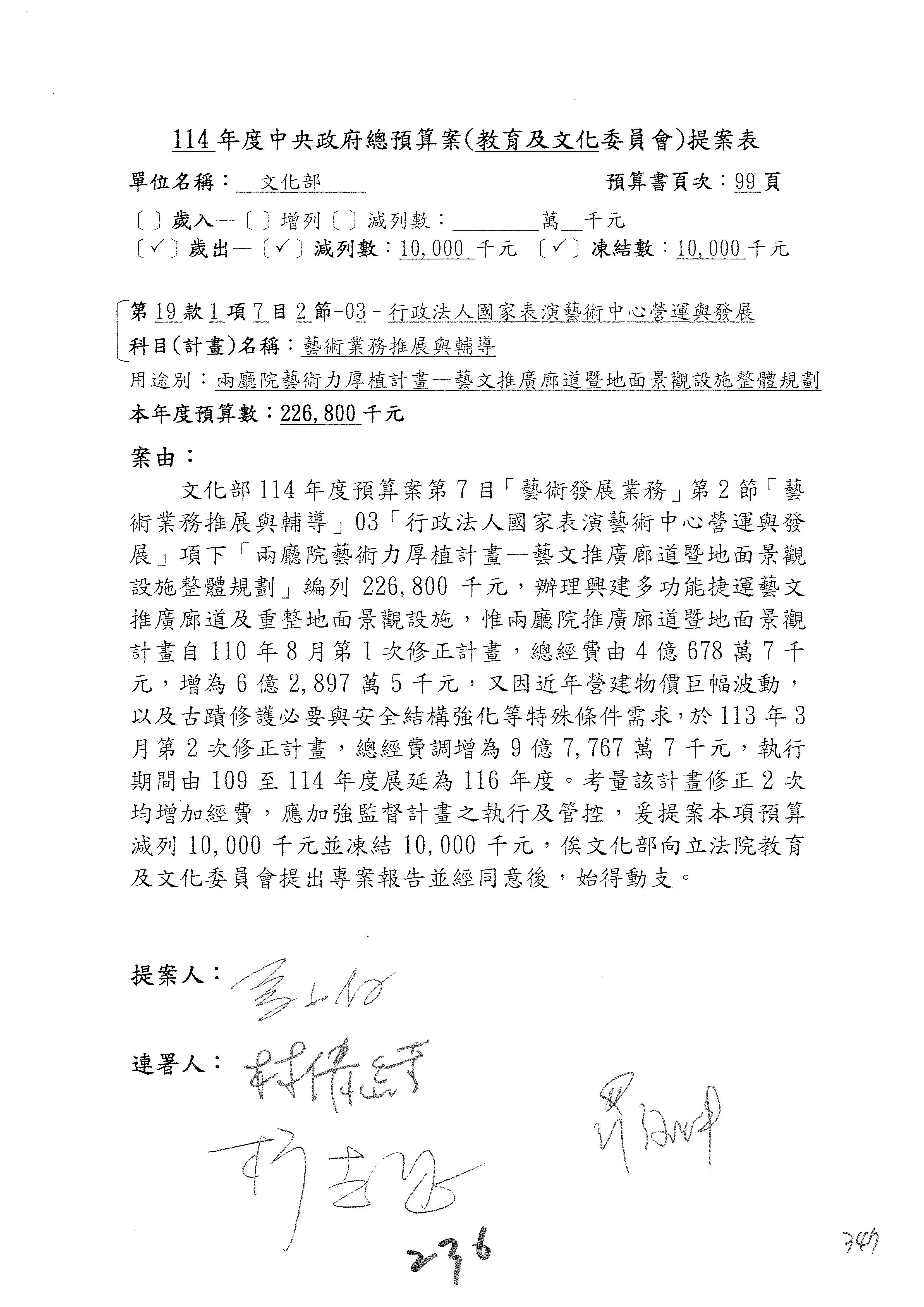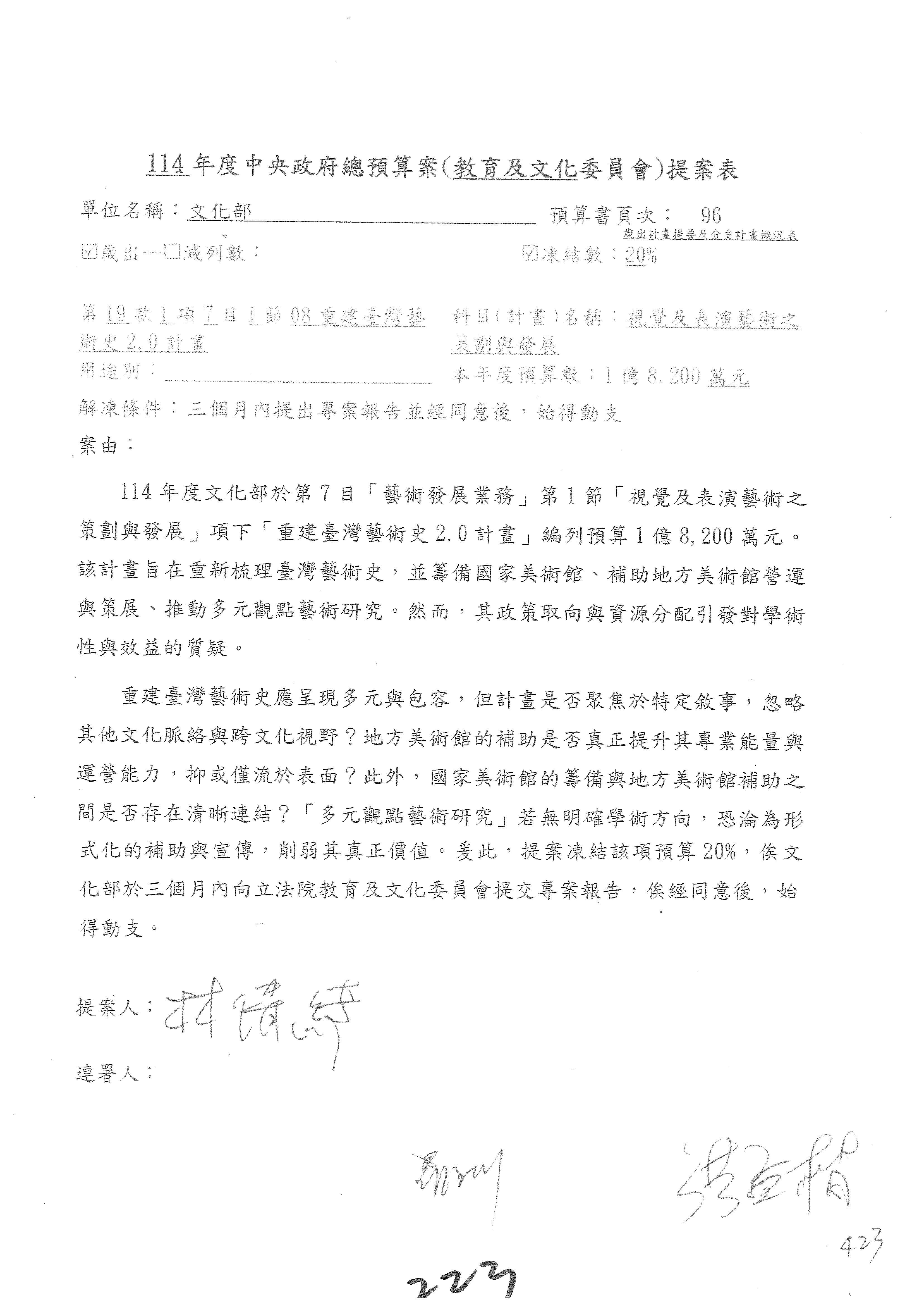 (三)114年度核能安全委員會及所屬第2目「原子能管理發展業務」第1節「原子能科學發展」預算編列27億5,477萬9千元,凍結5,000萬元,俟核能安全委員會向立法院教育及文化委員會提出書面報告後,始得動支。15-42