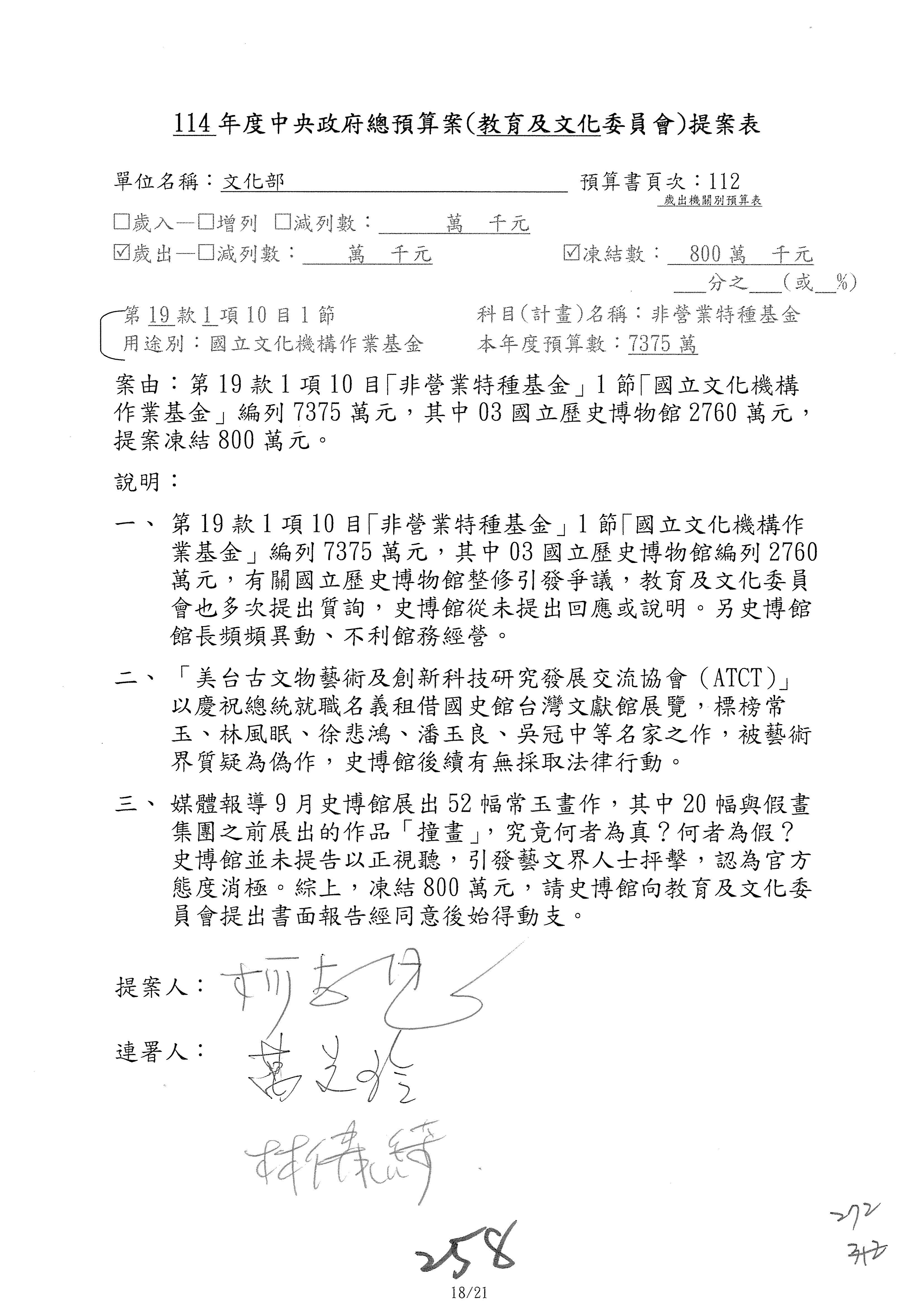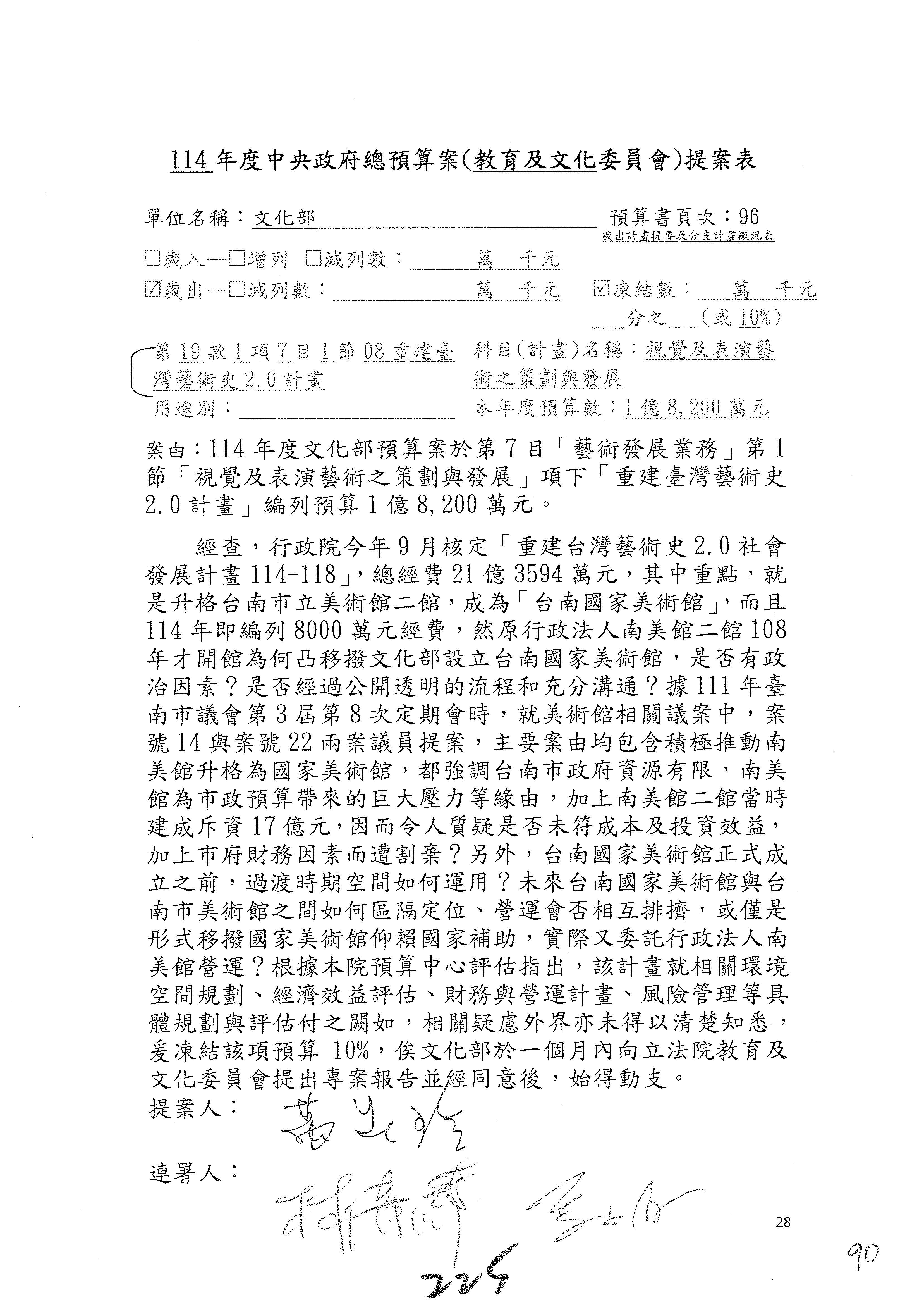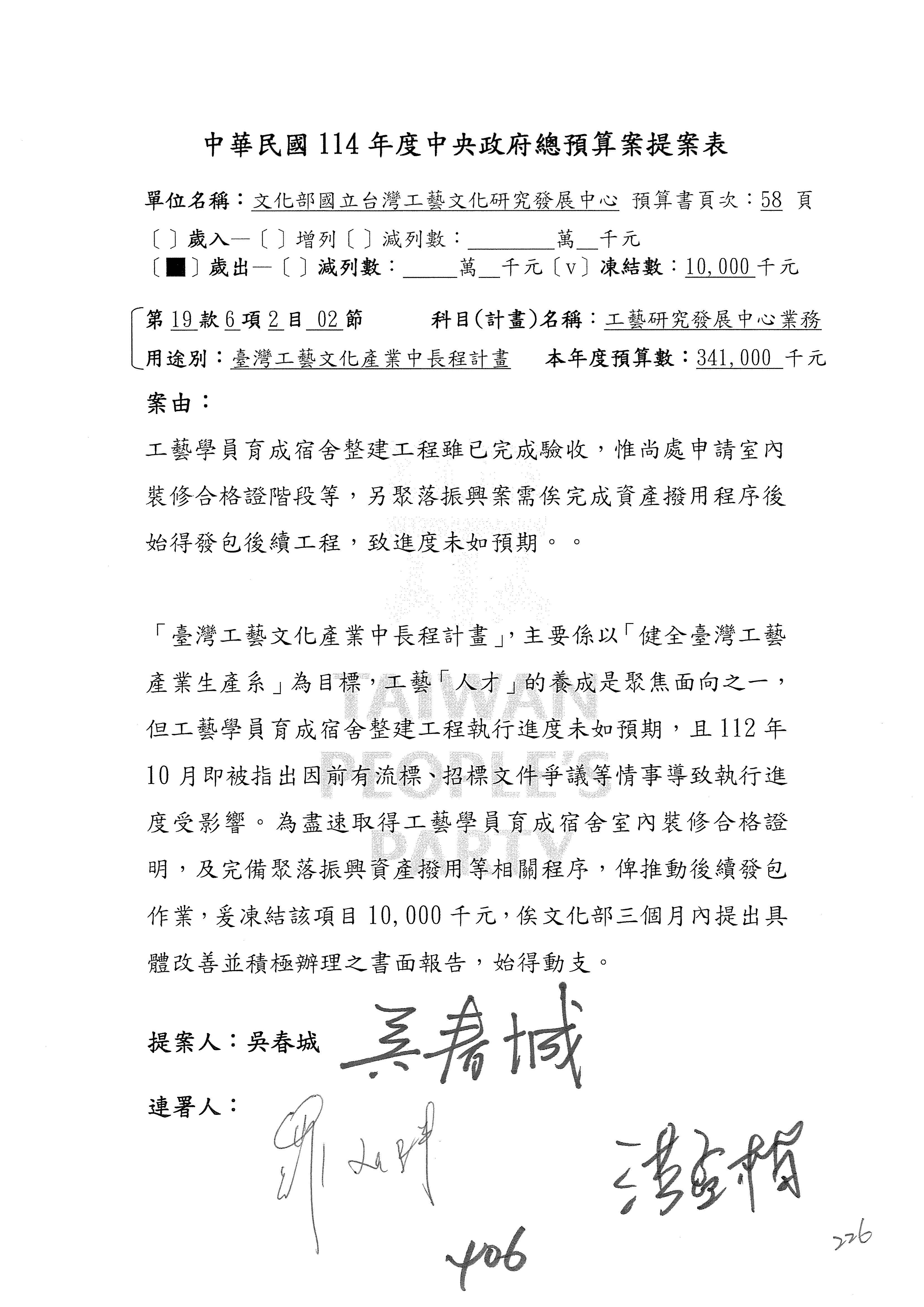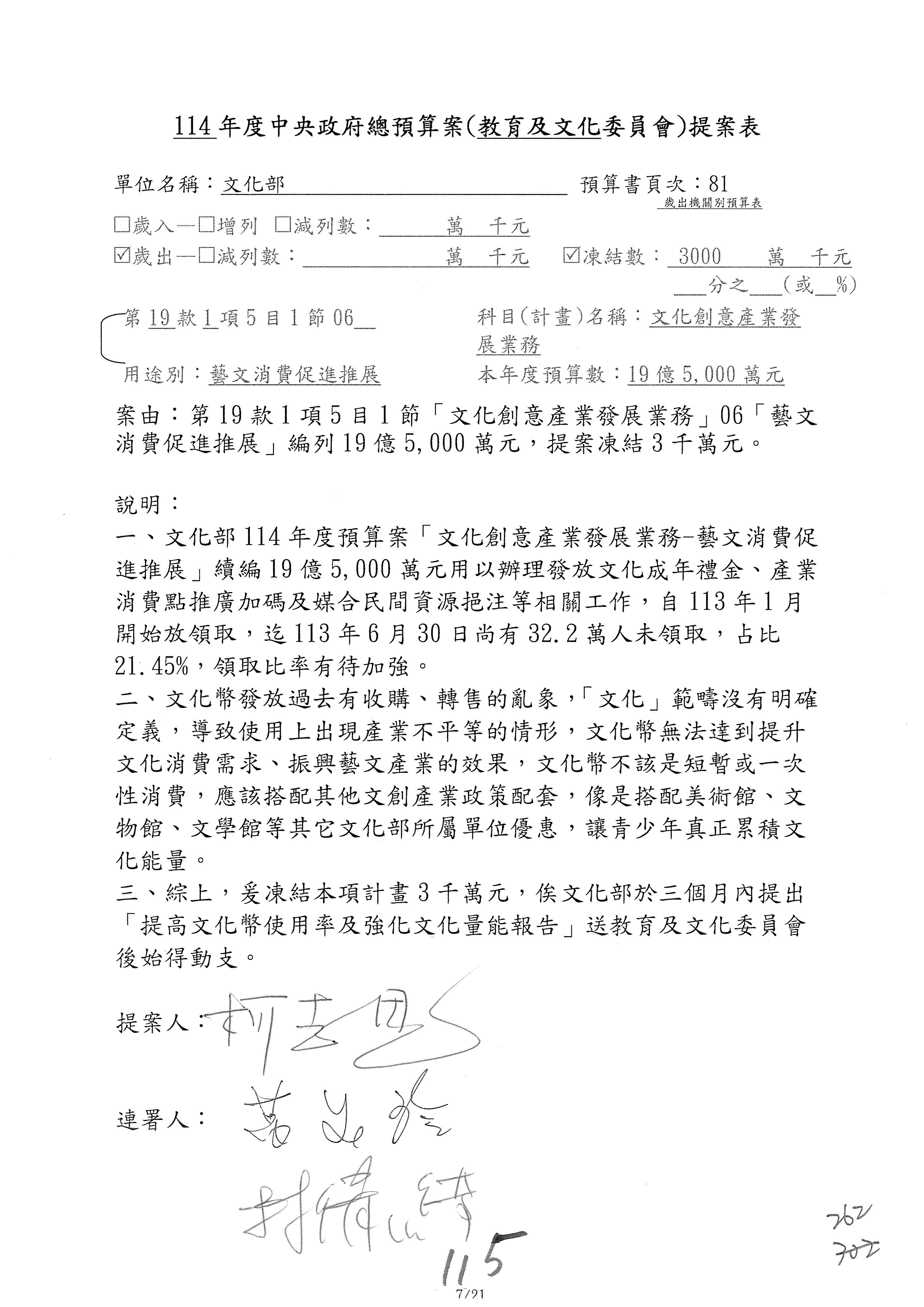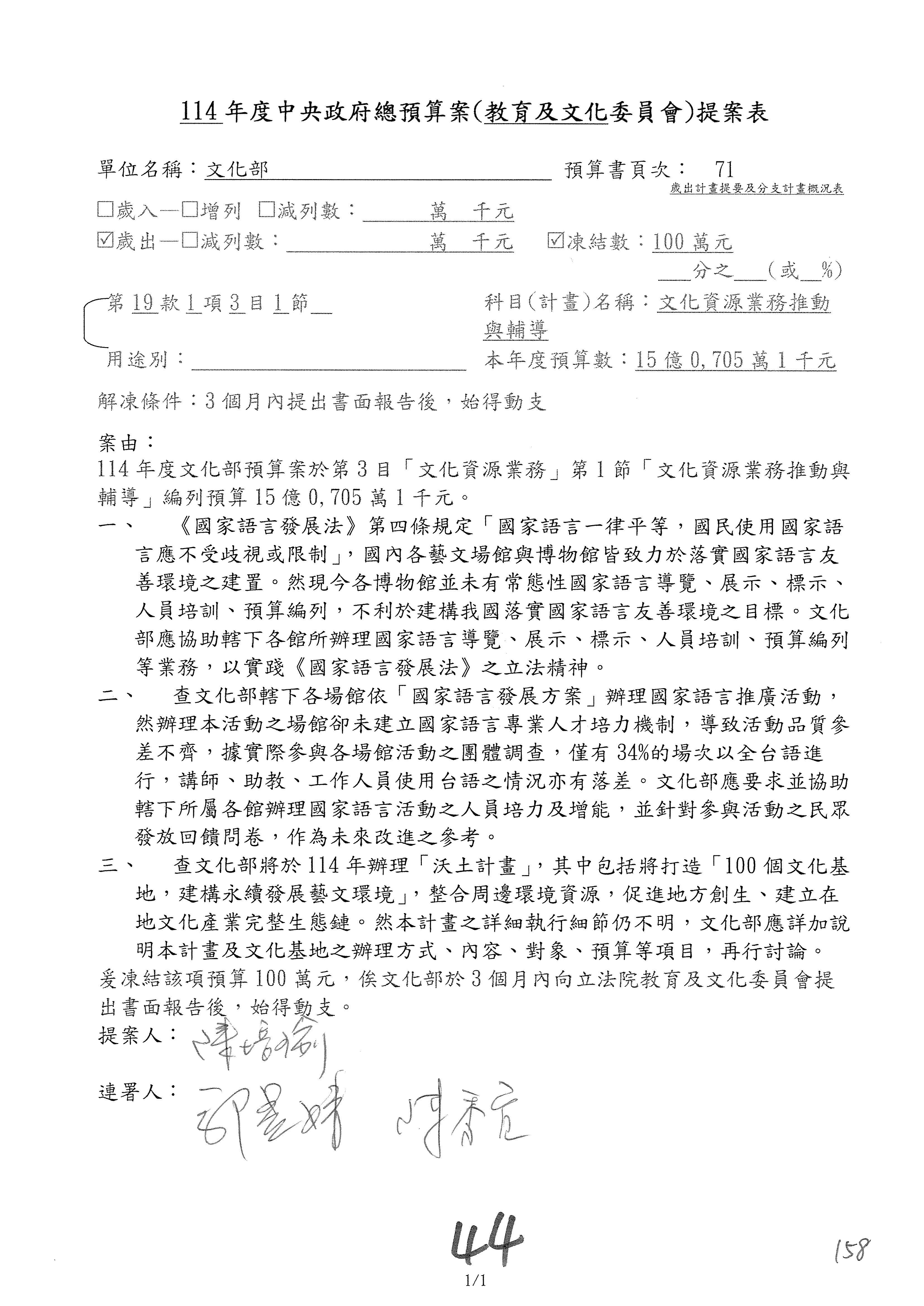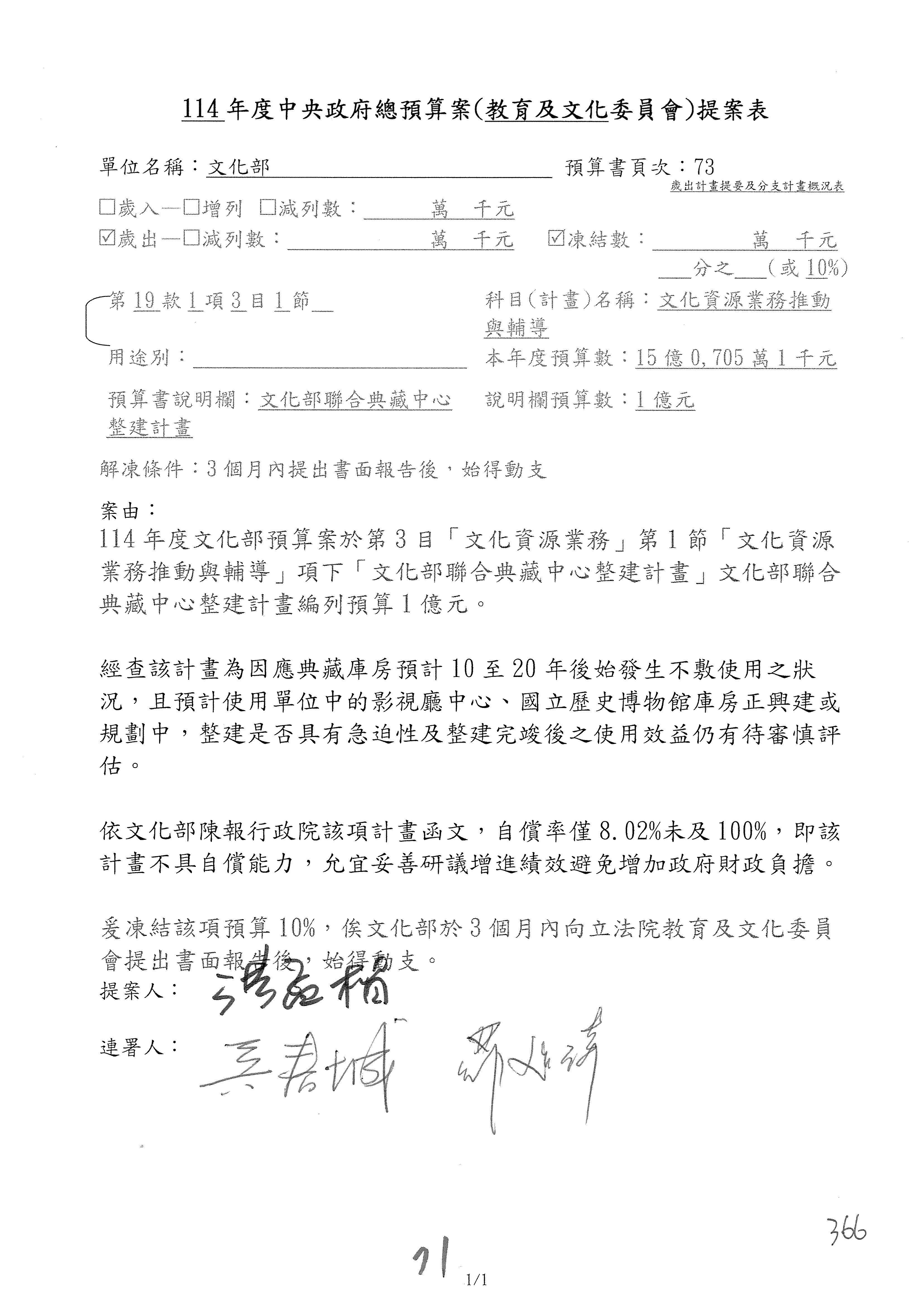 (三)114年度核能安全委員會及所屬第2目「原子能管理發展業務」第1節「原子能科學發展」預算編列27億5,477萬9千元,凍結5,000萬元,俟核能安全委員會向立法院教育及文化委員會提出書面報告後,始得動支。15-42