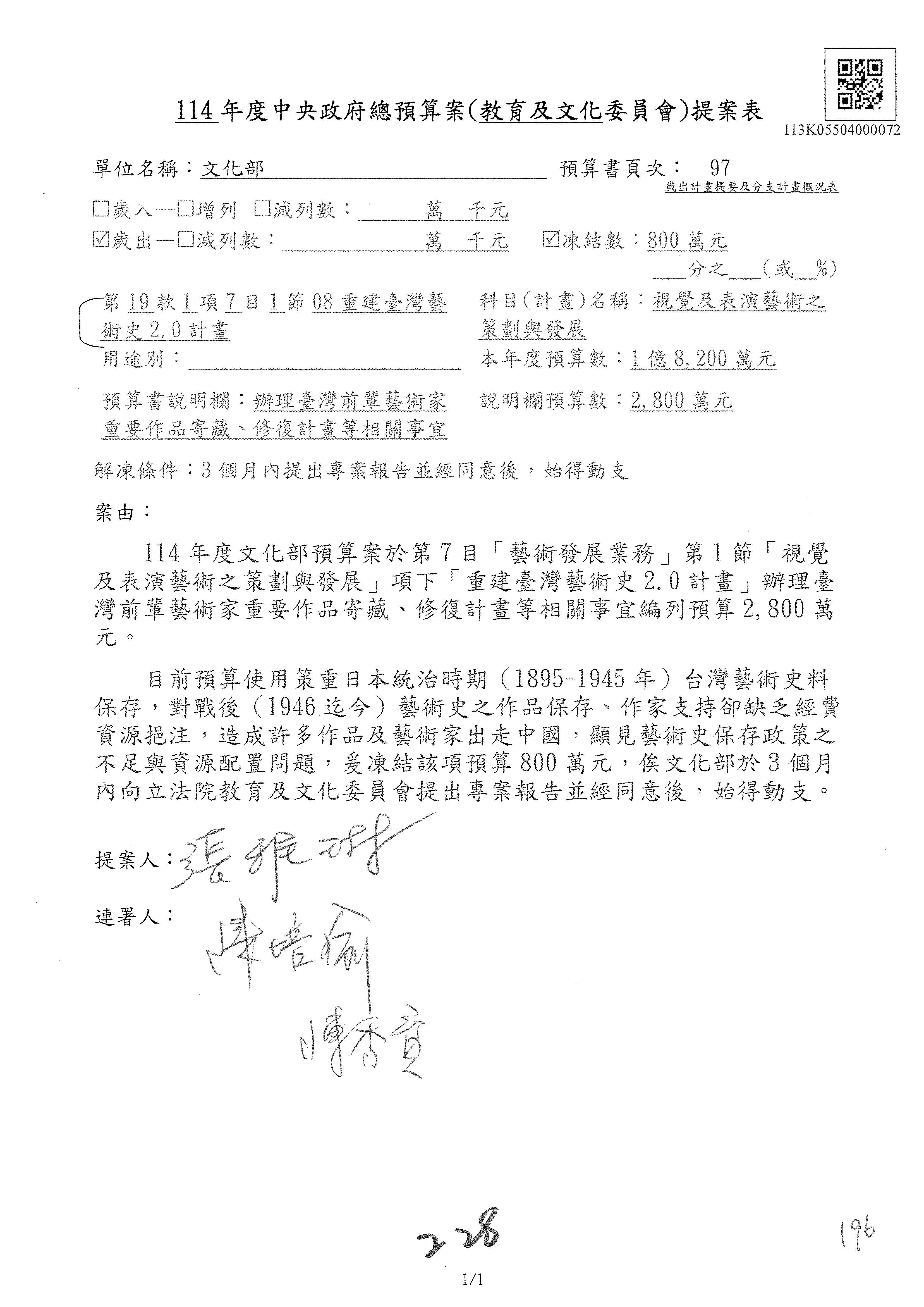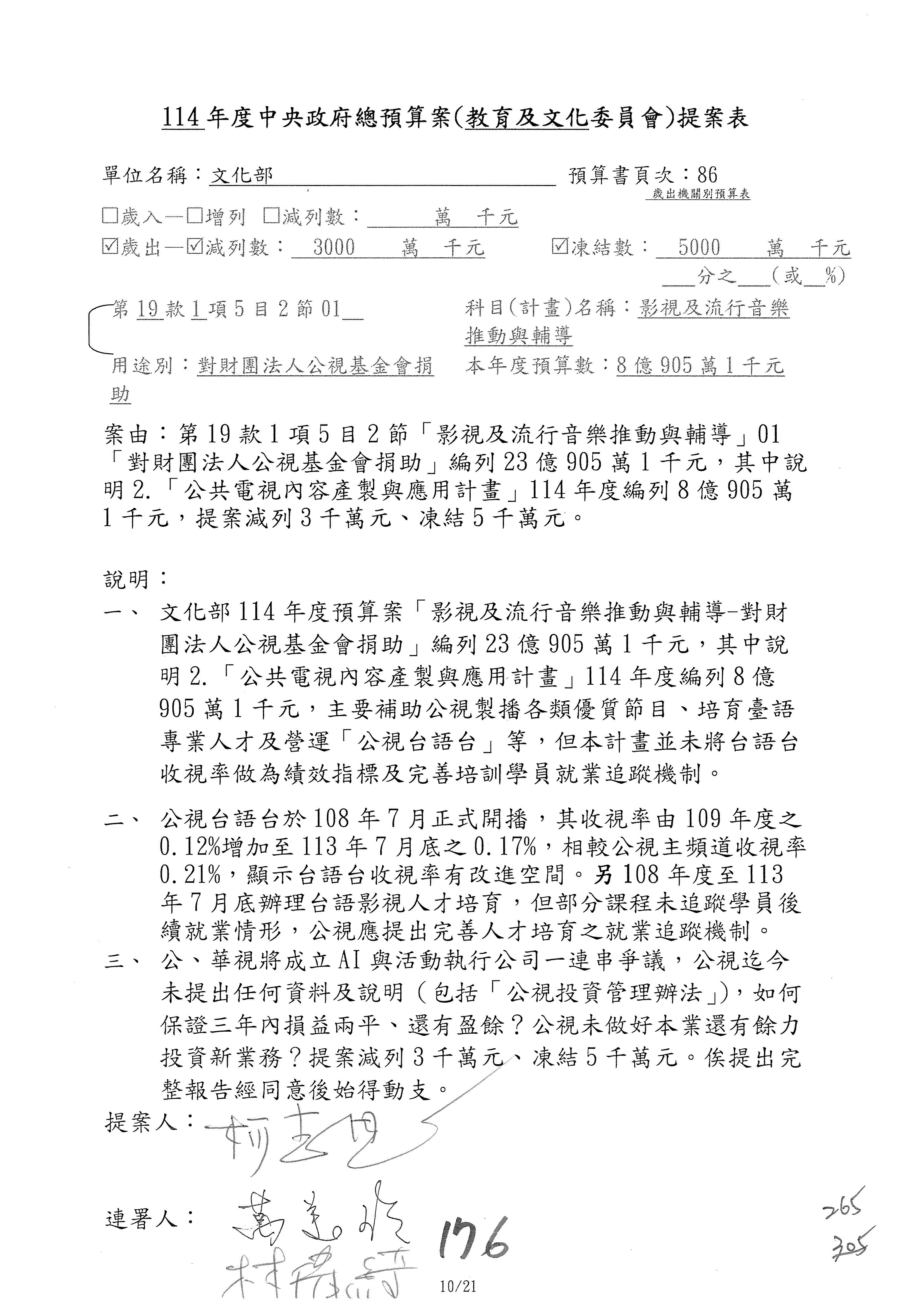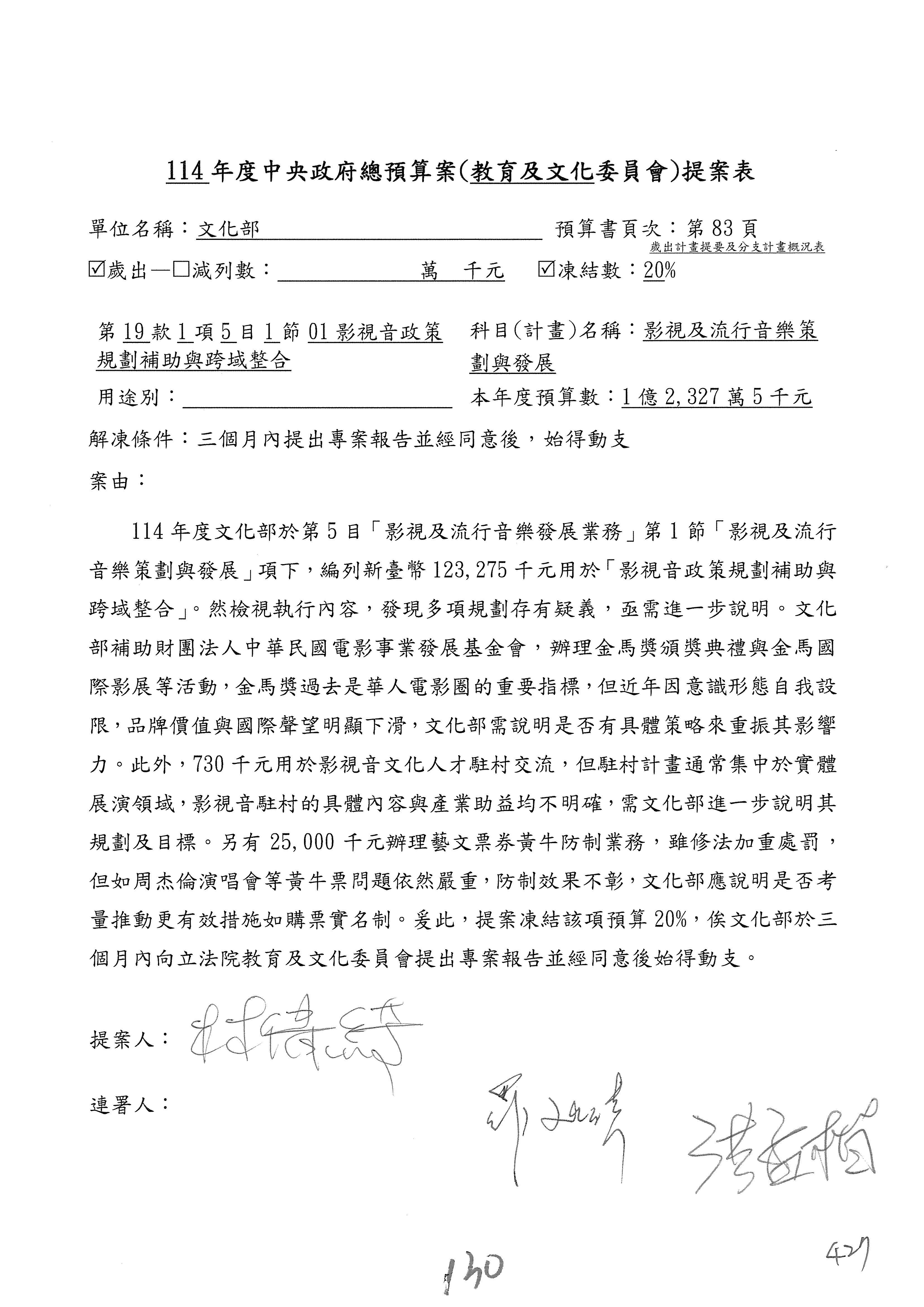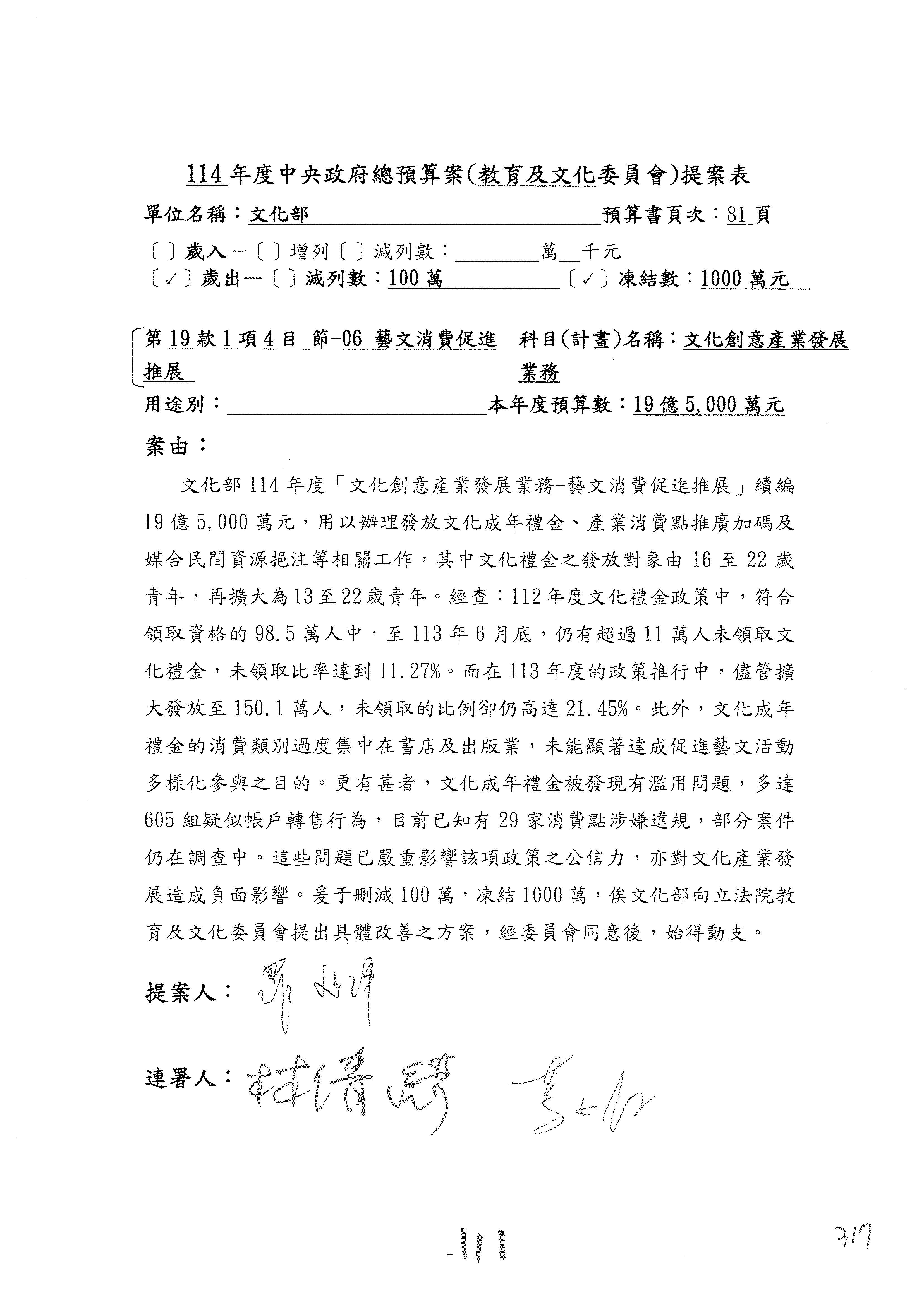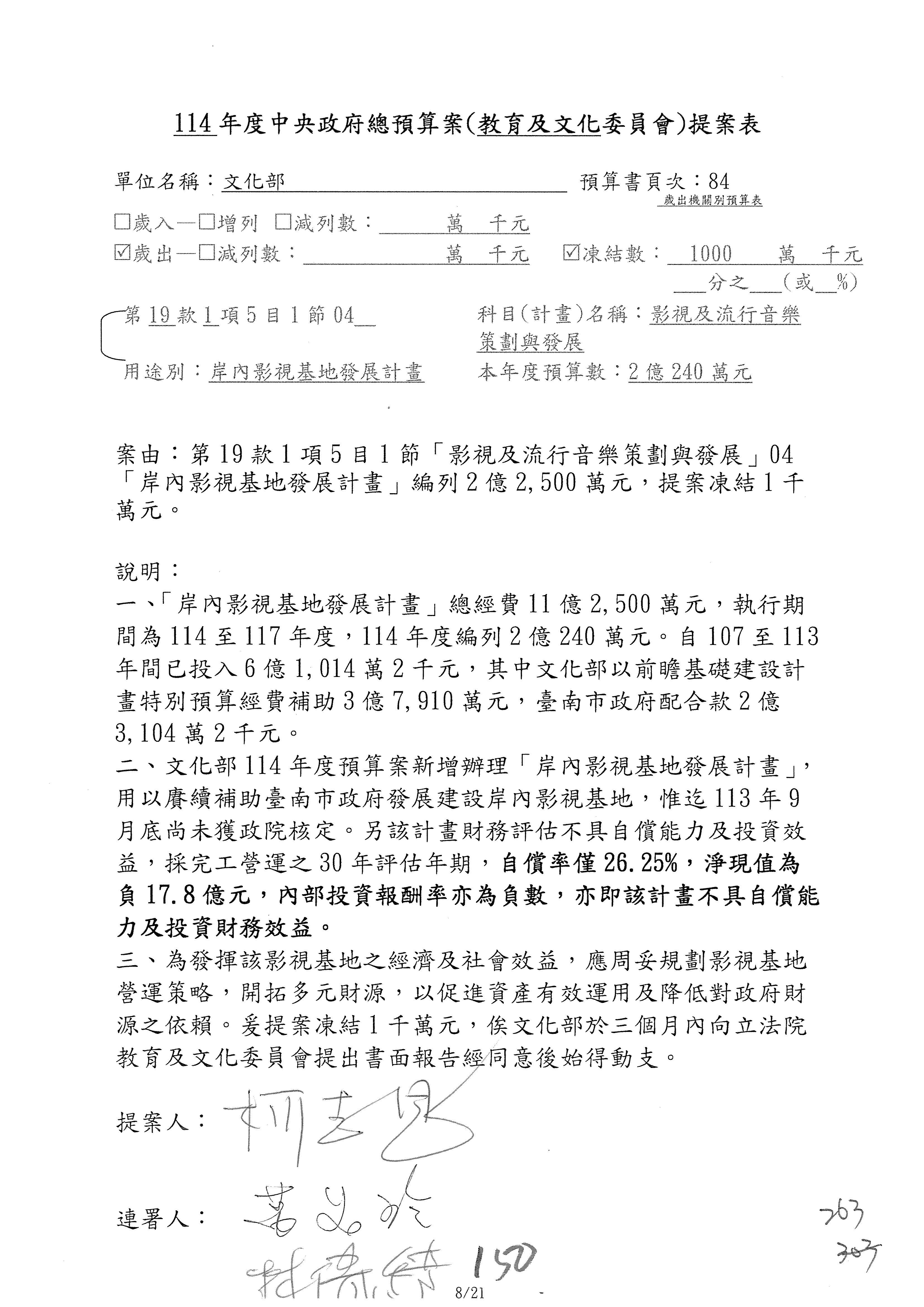 (三)114年度核能安全委員會及所屬第2目「原子能管理發展業務」第1節「原子能科學發展」預算編列27億5,477萬9千元,凍結5,000萬元,俟核能安全委員會向立法院教育及文化委員會提出書面報告後,始得動支。15-42