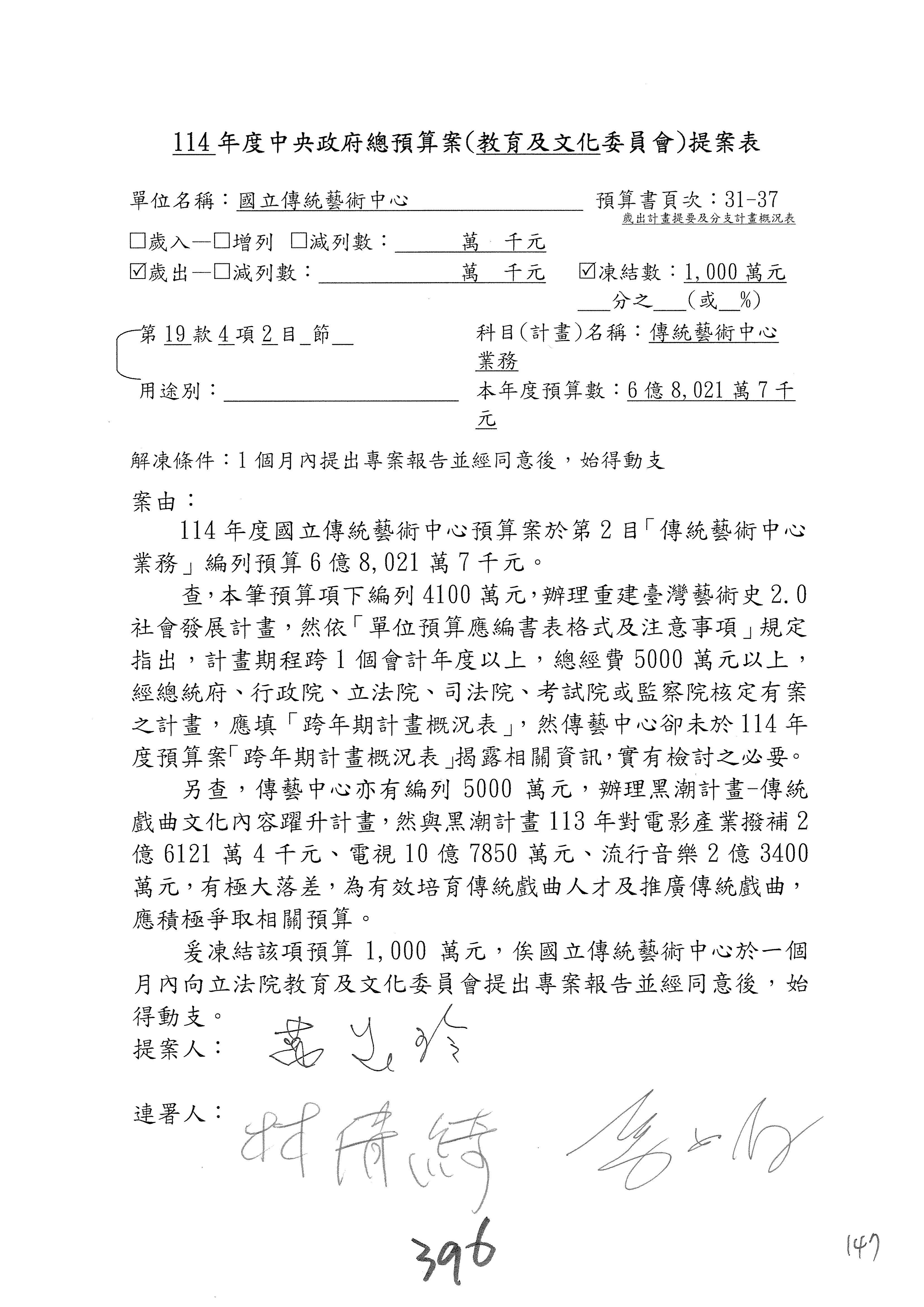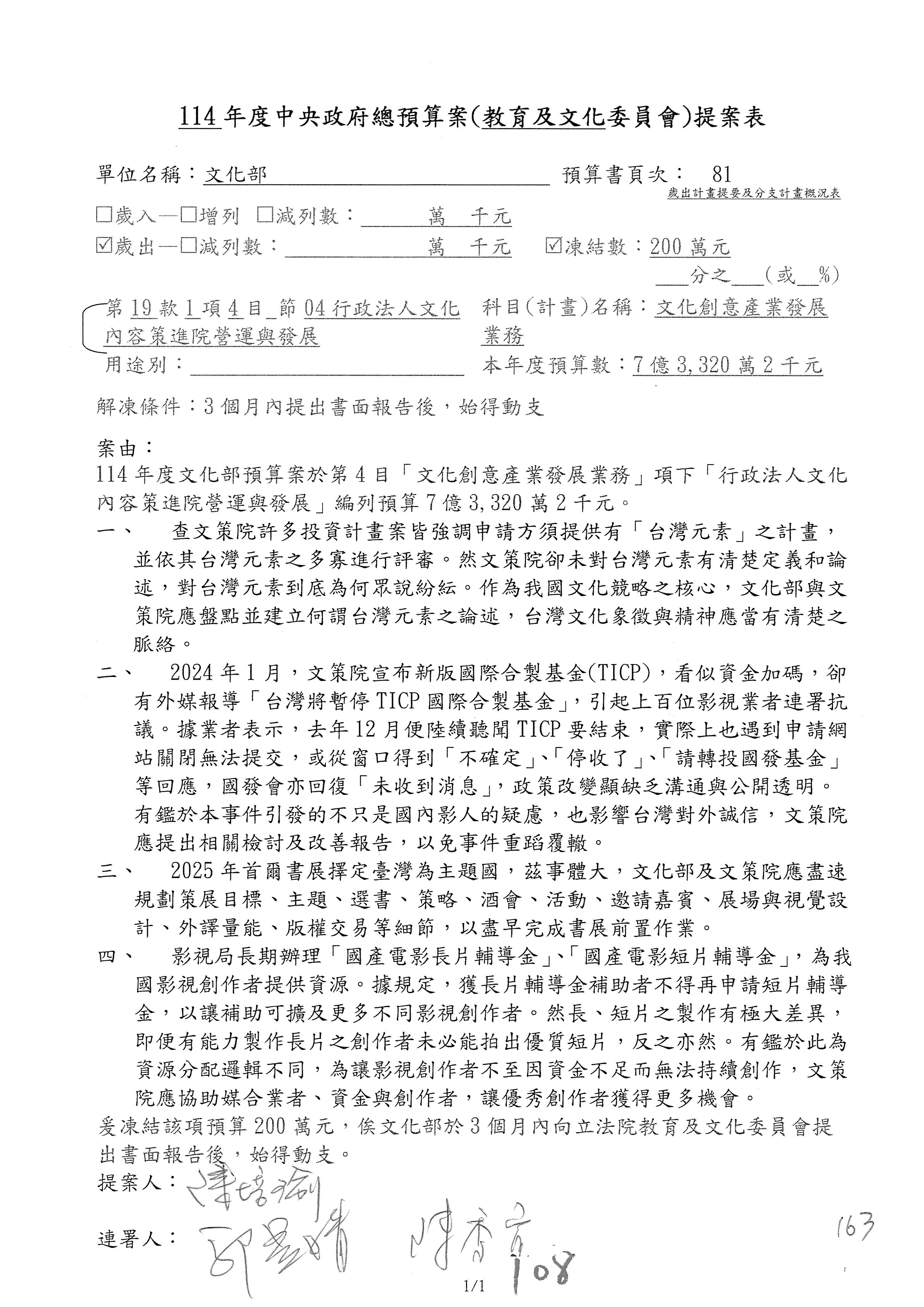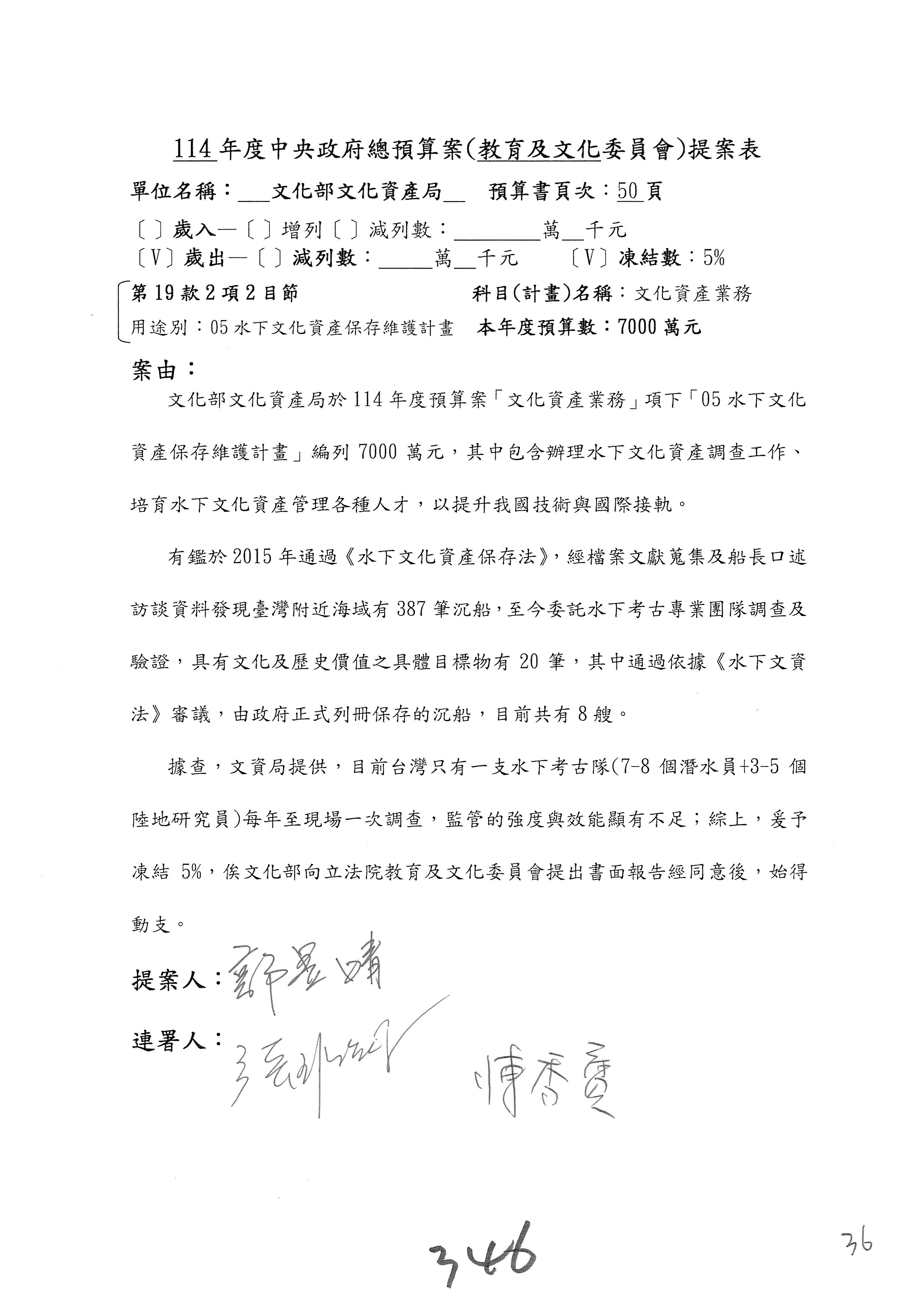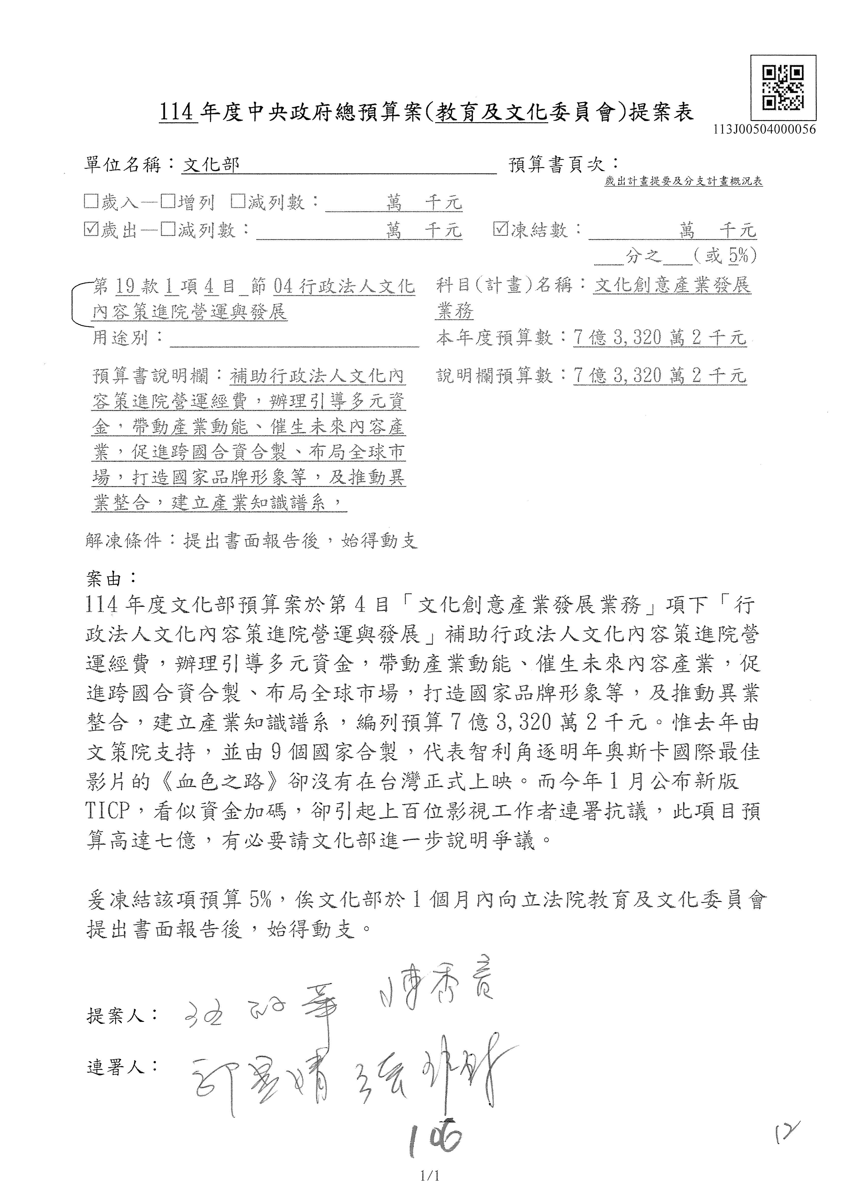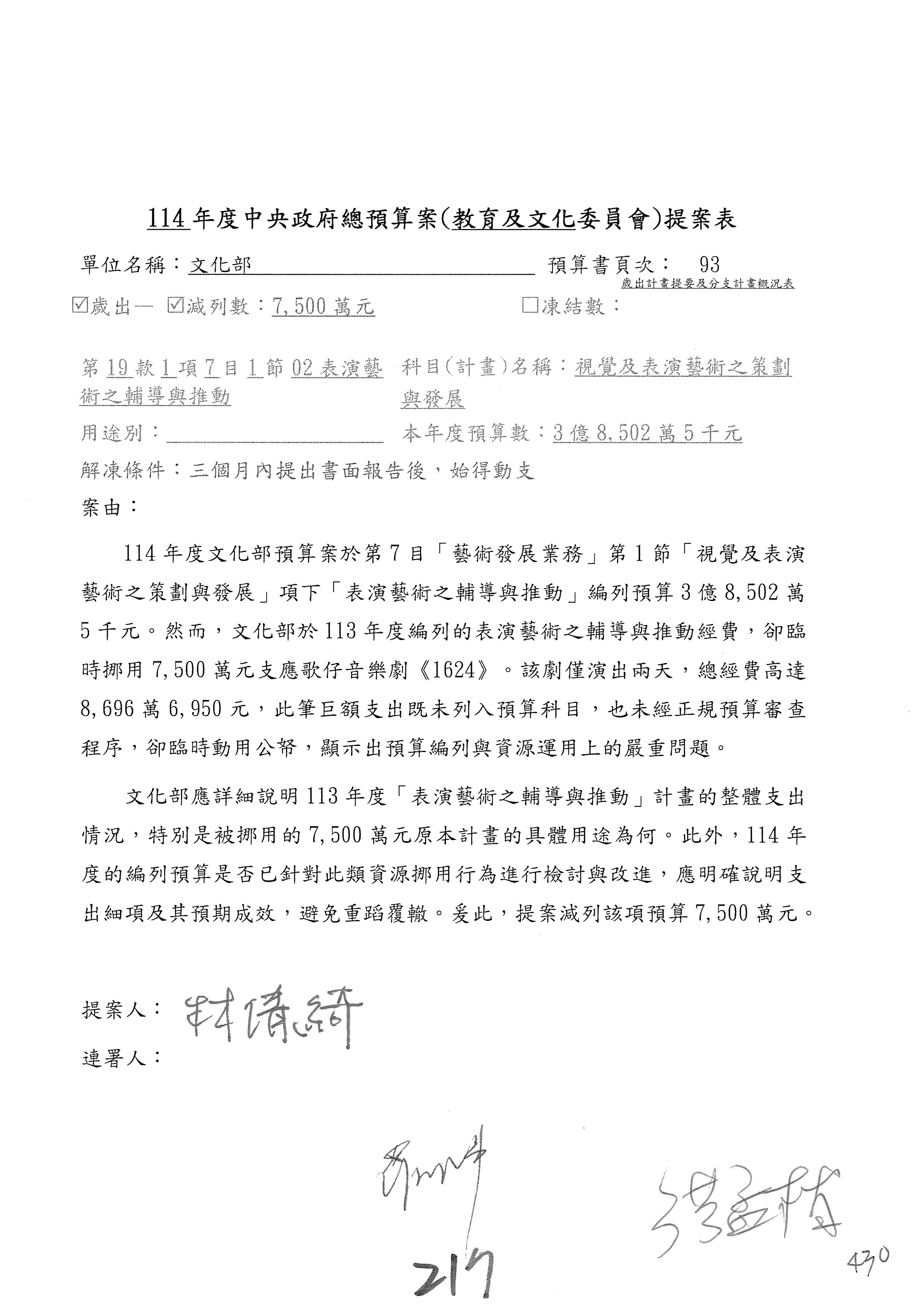 (三)114年度核能安全委員會及所屬第2目「原子能管理發展業務」第1節「原子能科學發展」預算編列27億5,477萬9千元,凍結5,000萬元,俟核能安全委員會向立法院教育及文化委員會提出書面報告後,始得動支。15-42