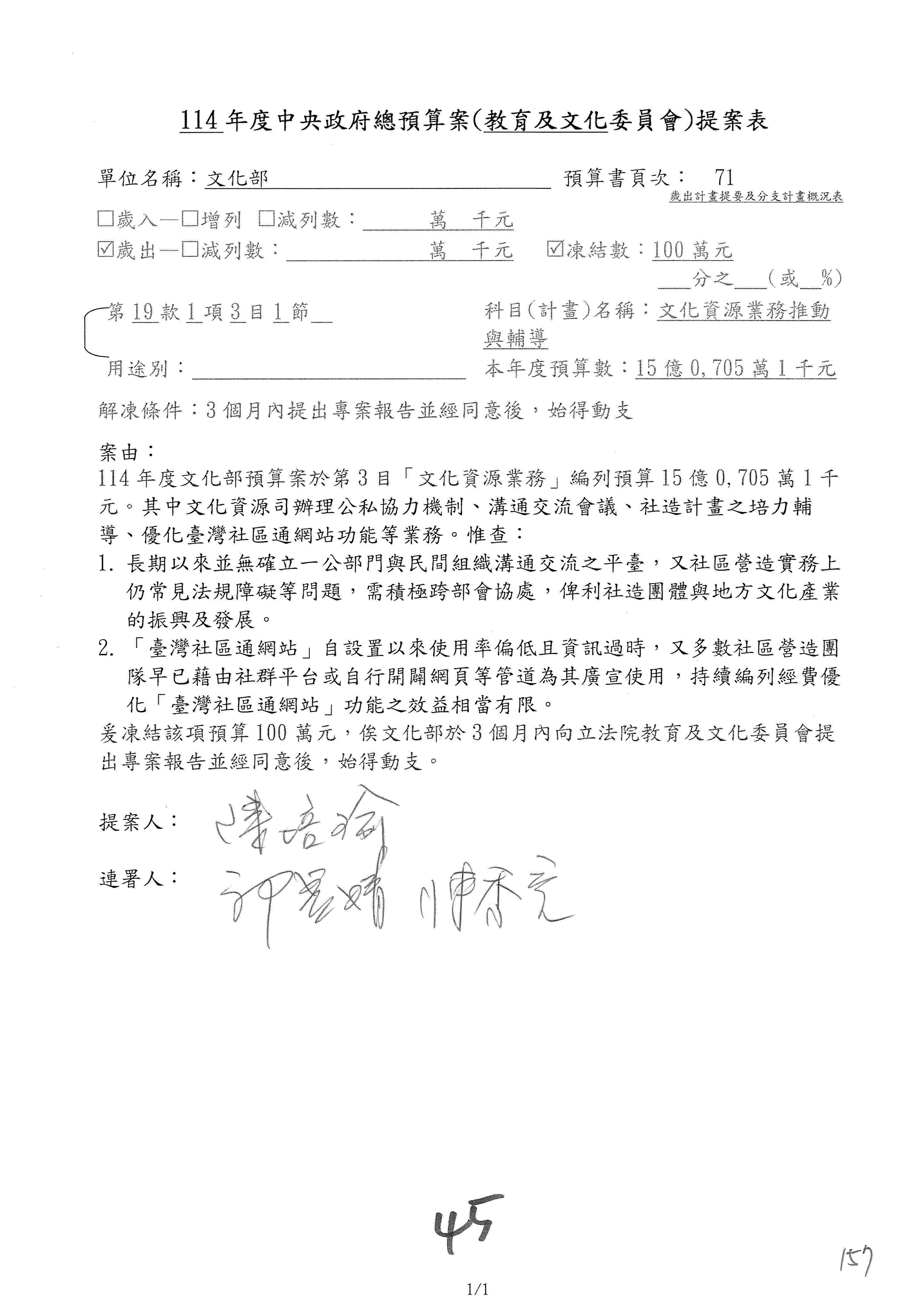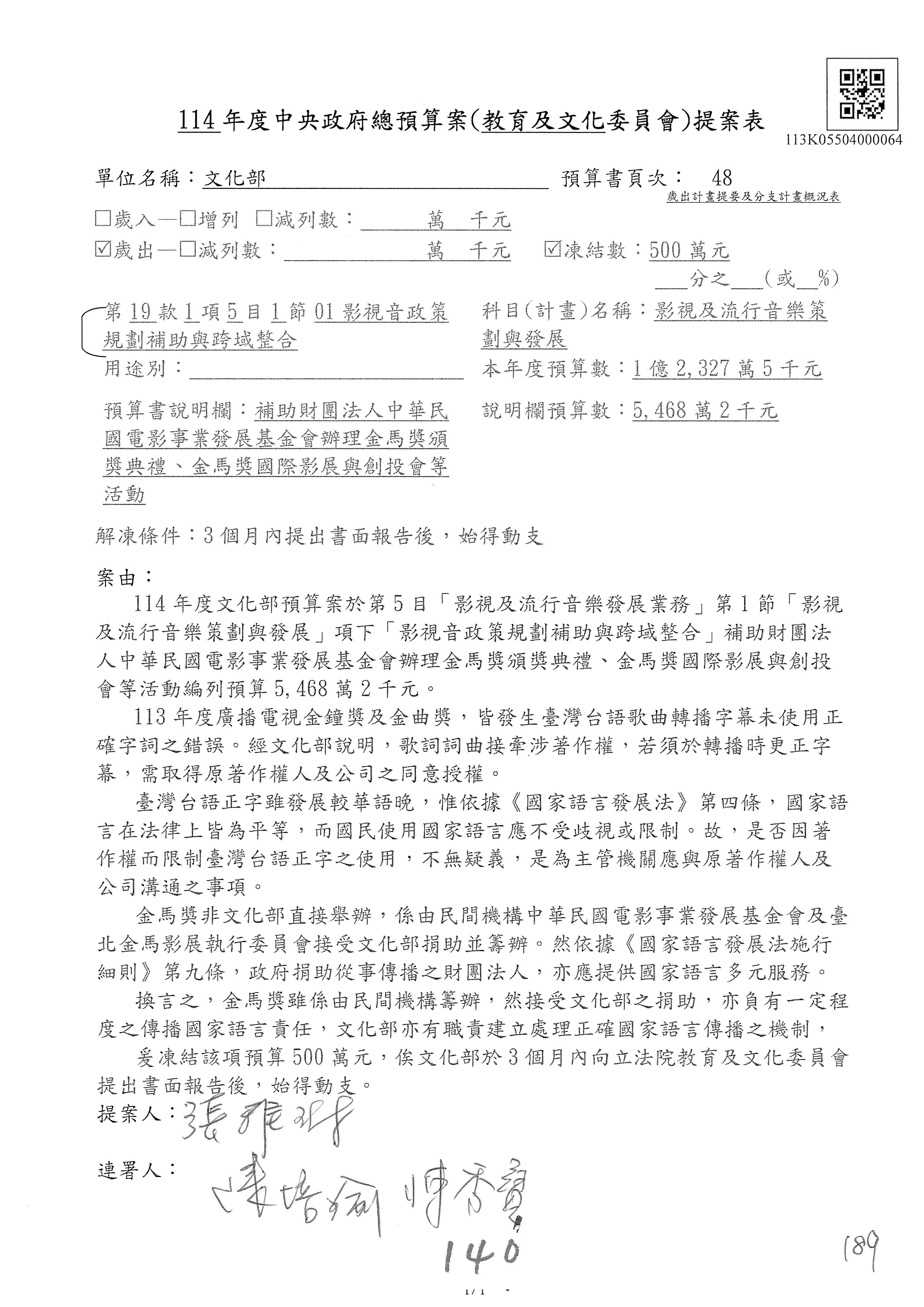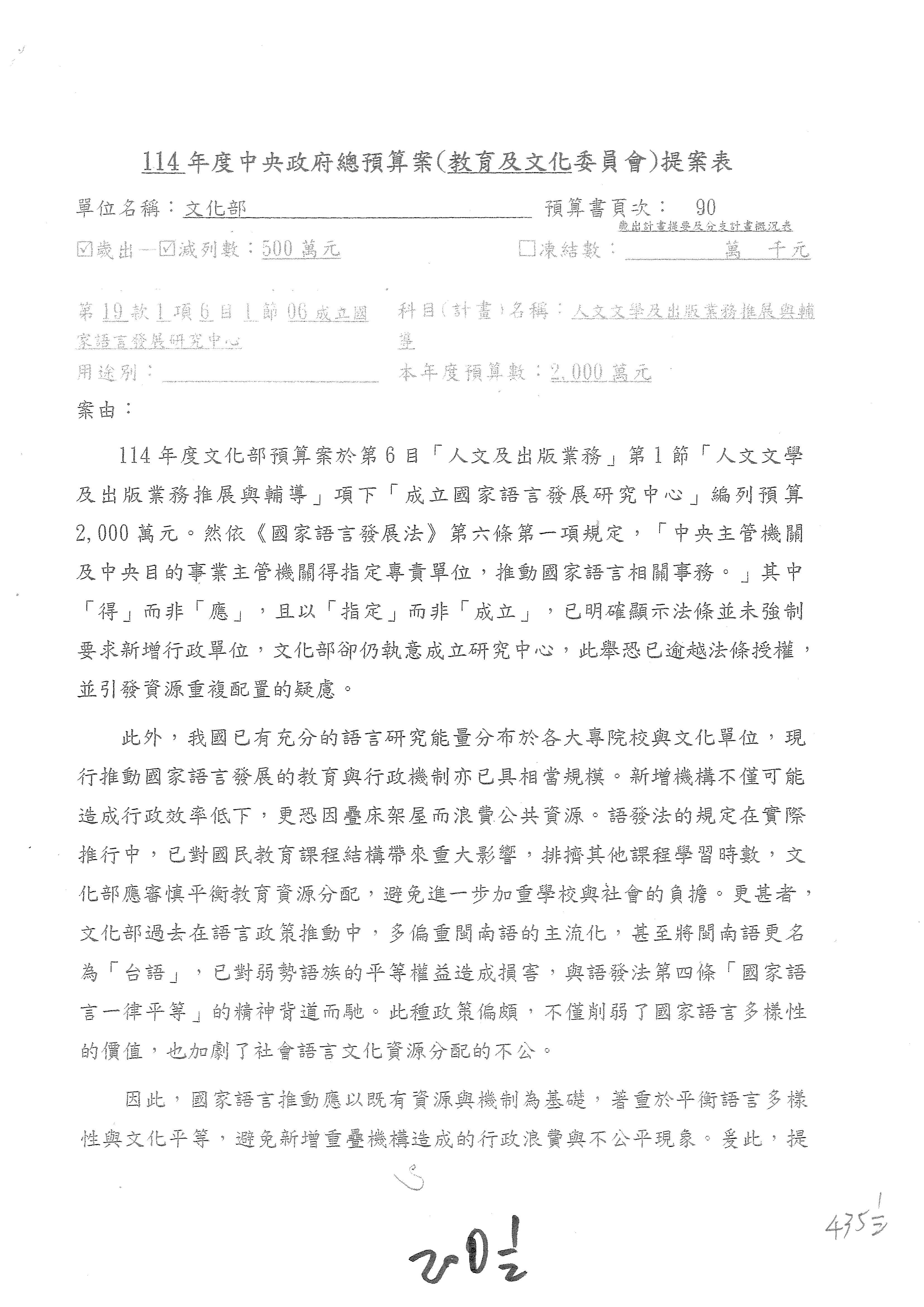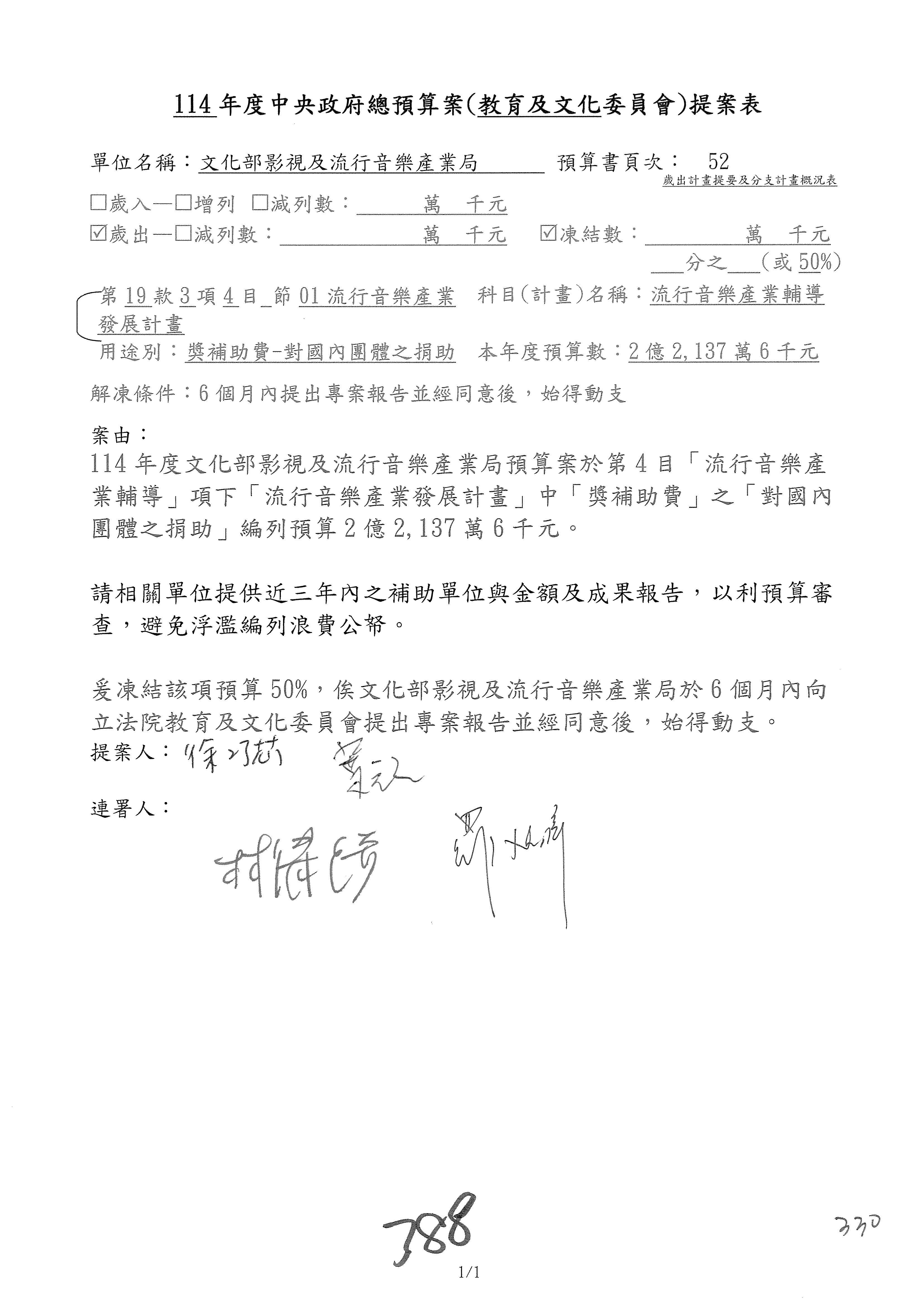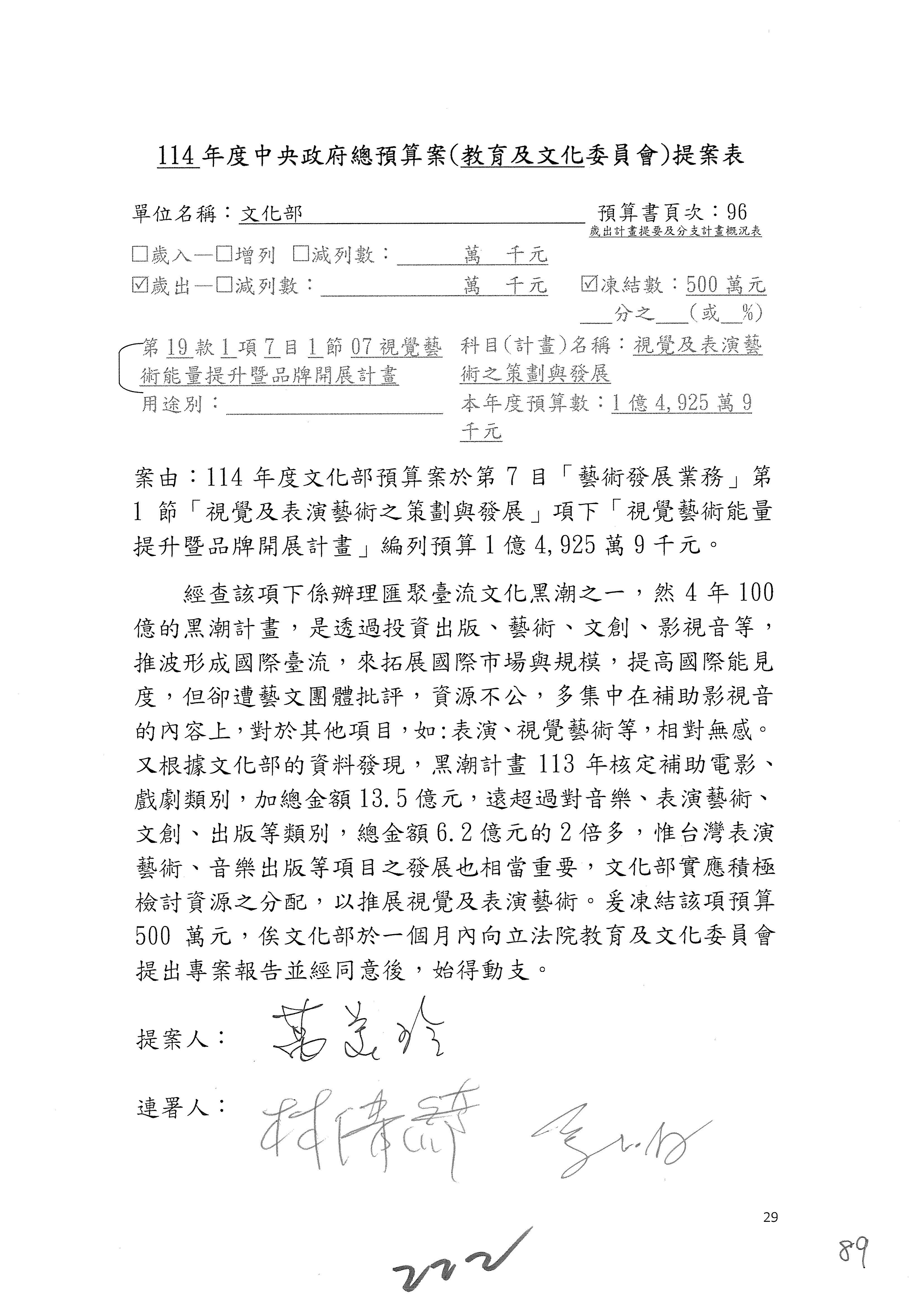 (三)114年度核能安全委員會及所屬第2目「原子能管理發展業務」第1節「原子能科學發展」預算編列27億5,477萬9千元,凍結5,000萬元,俟核能安全委員會向立法院教育及文化委員會提出書面報告後,始得動支。15-42