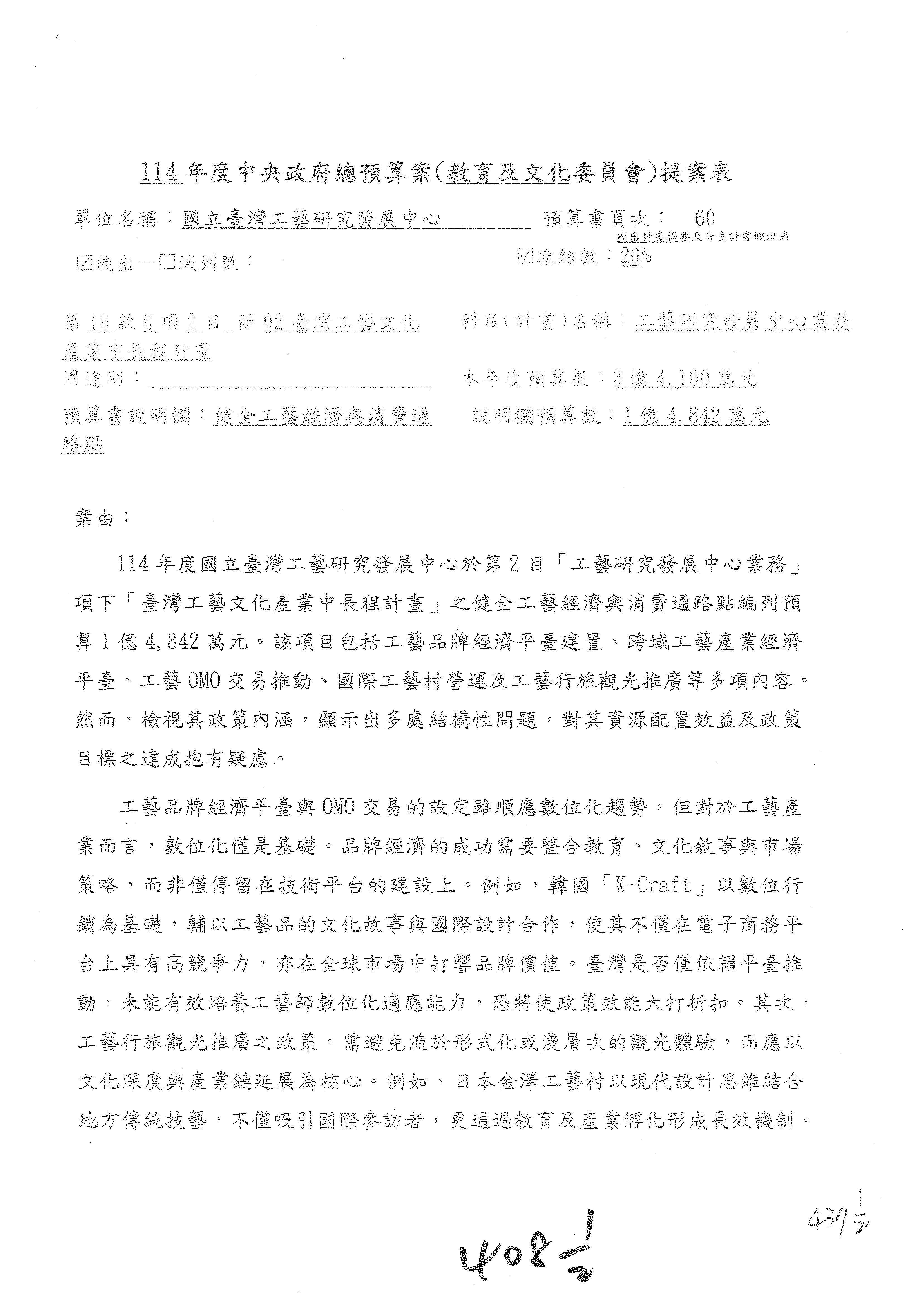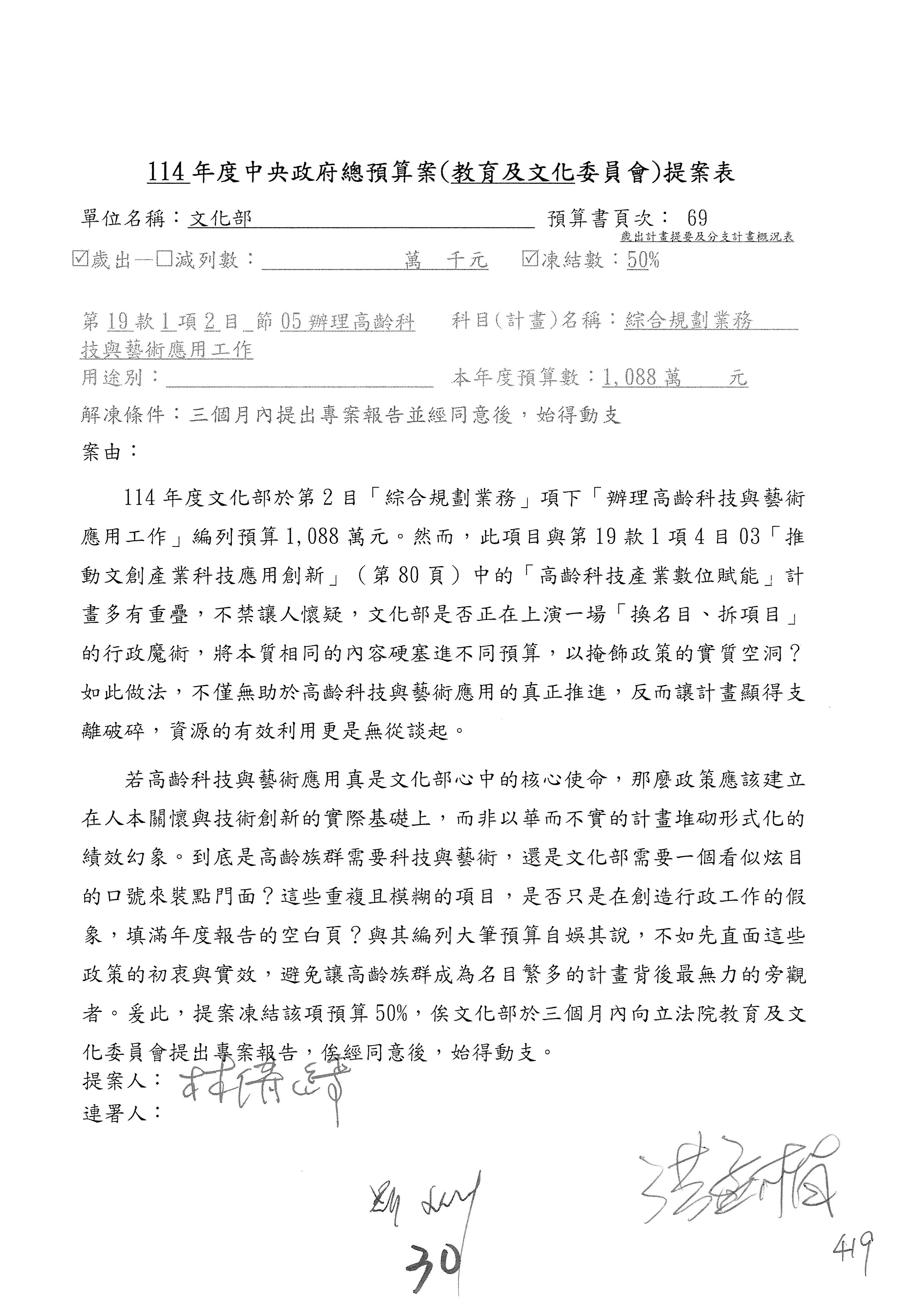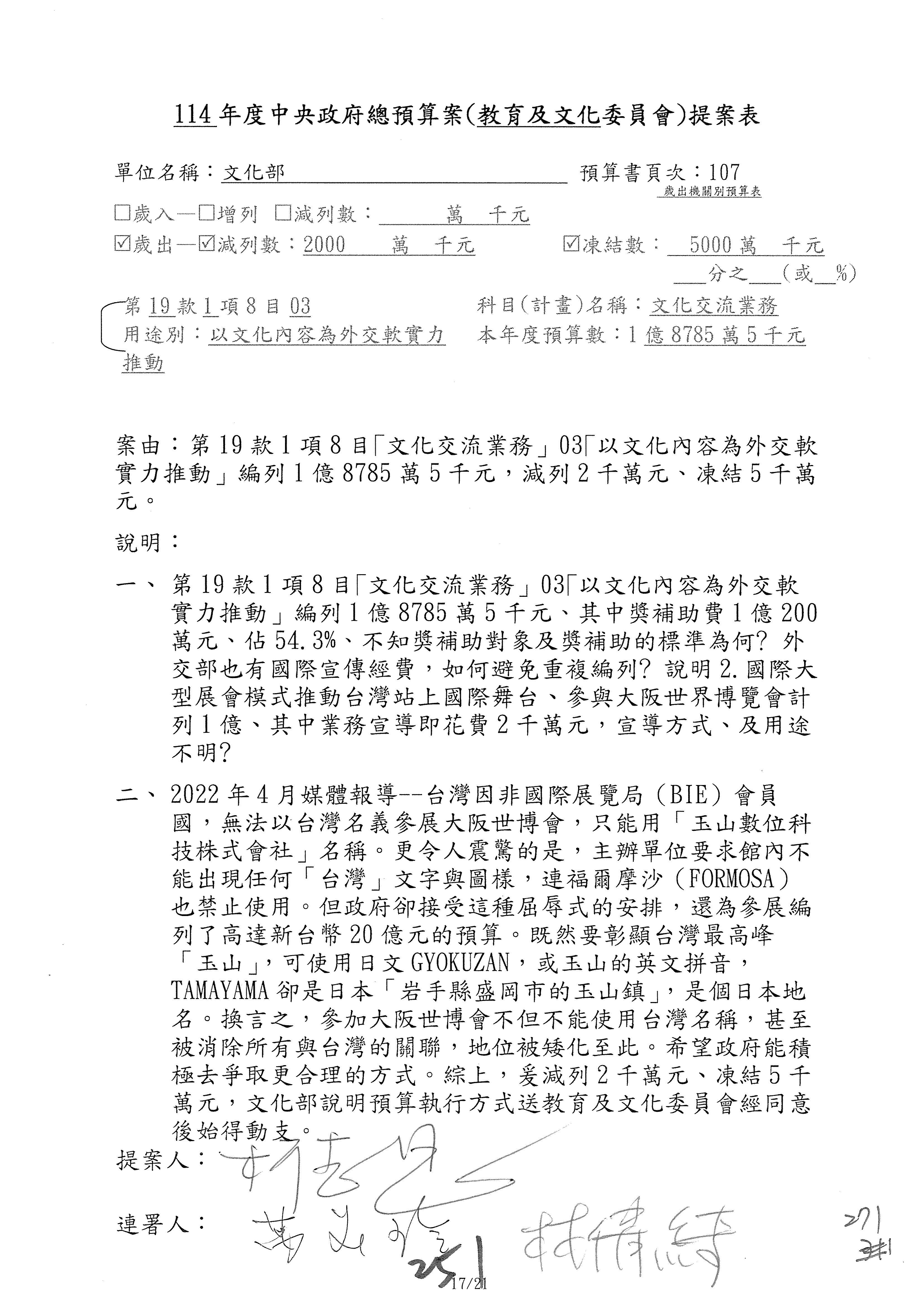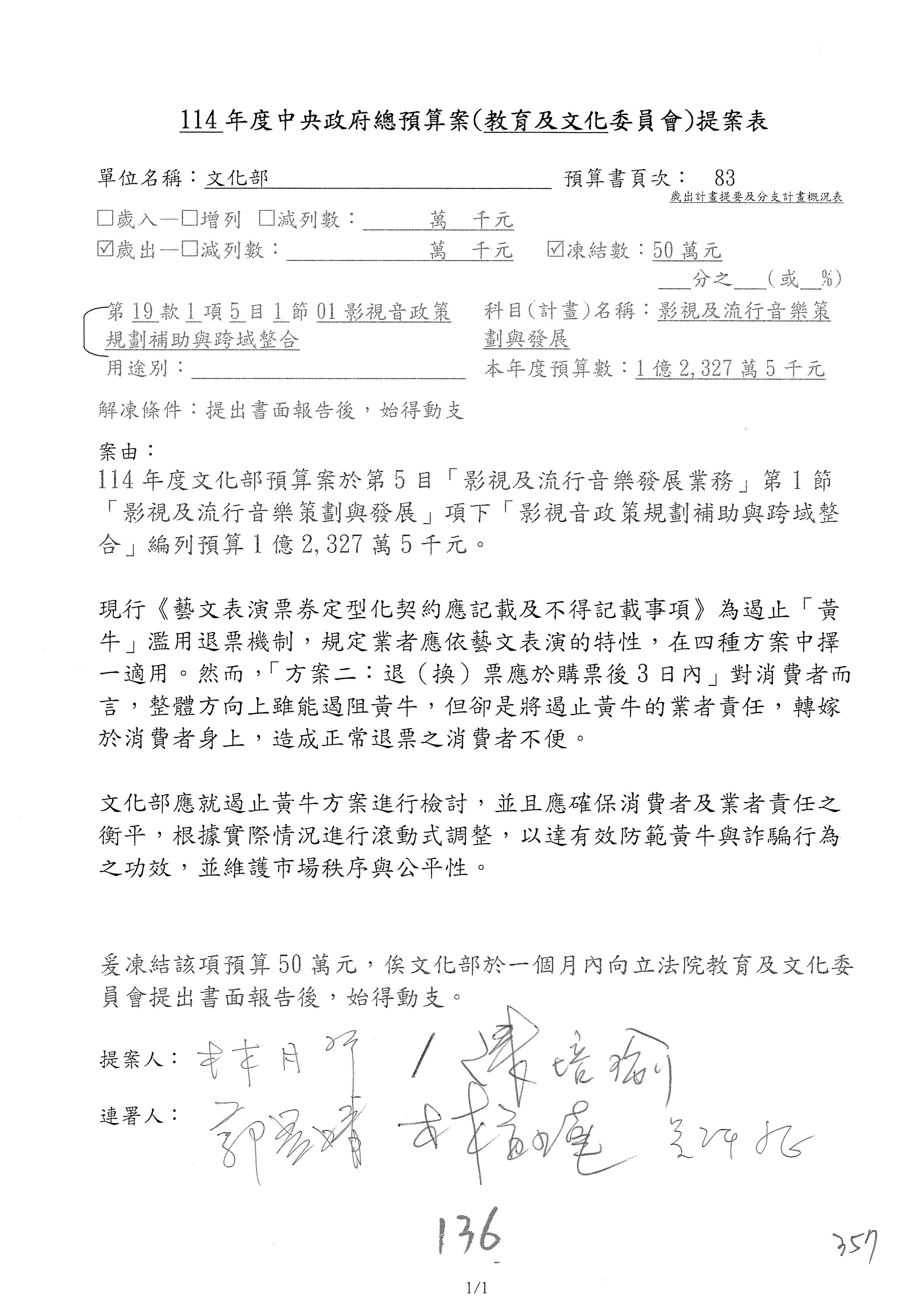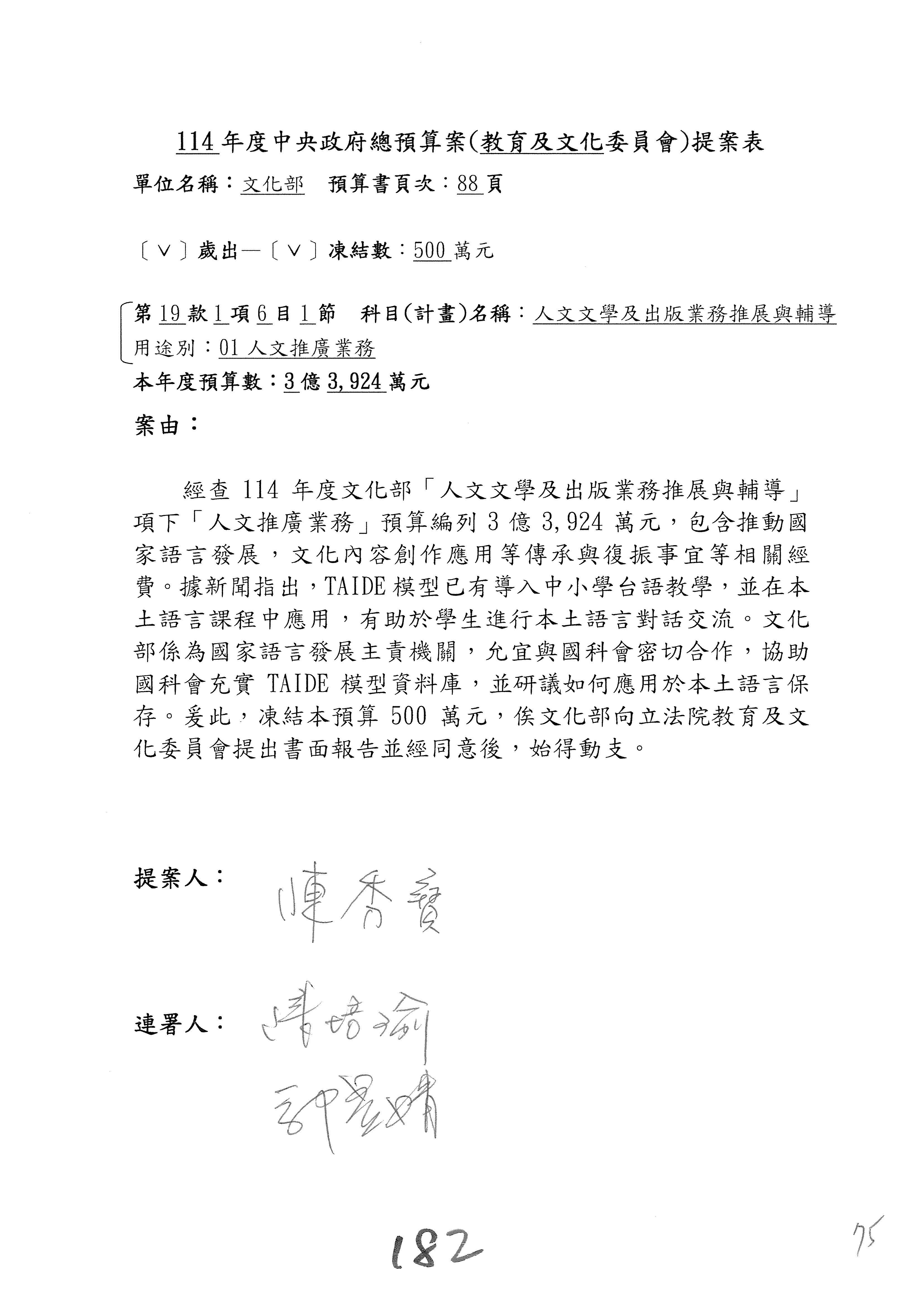 (三)114年度核能安全委員會及所屬第2目「原子能管理發展業務」第1節「原子能科學發展」預算編列27億5,477萬9千元,凍結5,000萬元,俟核能安全委員會向立法院教育及文化委員會提出書面報告後,始得動支。15-42