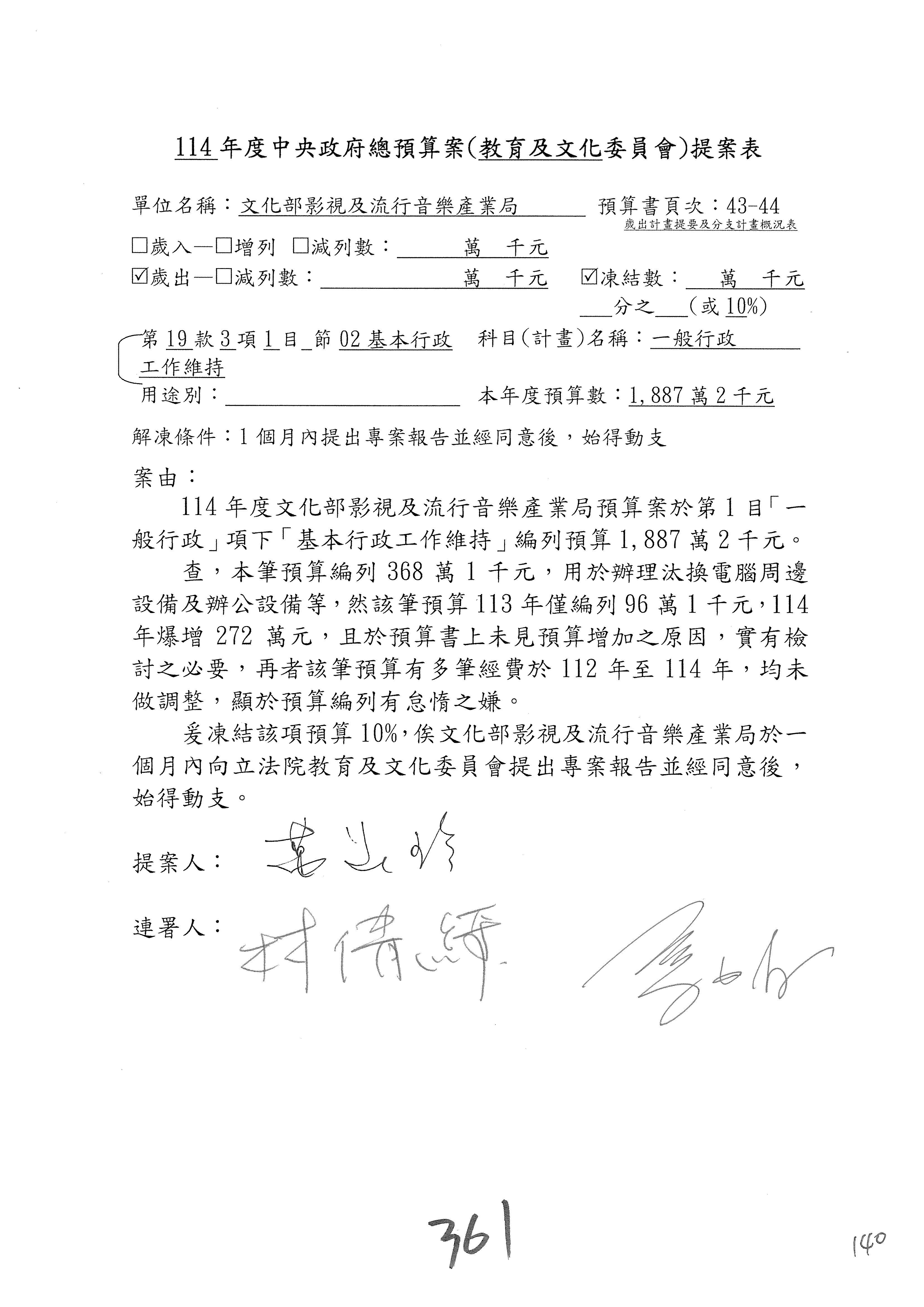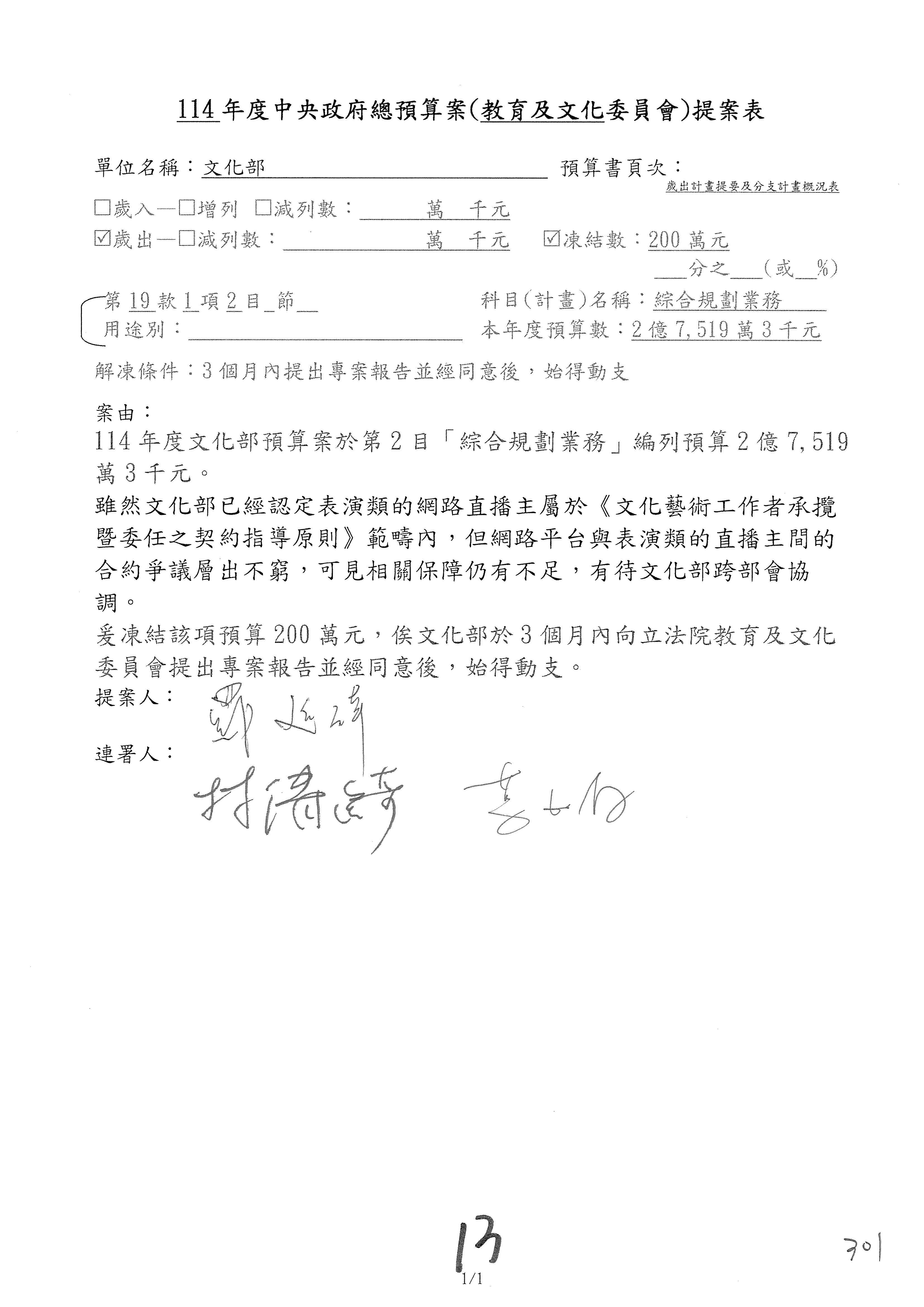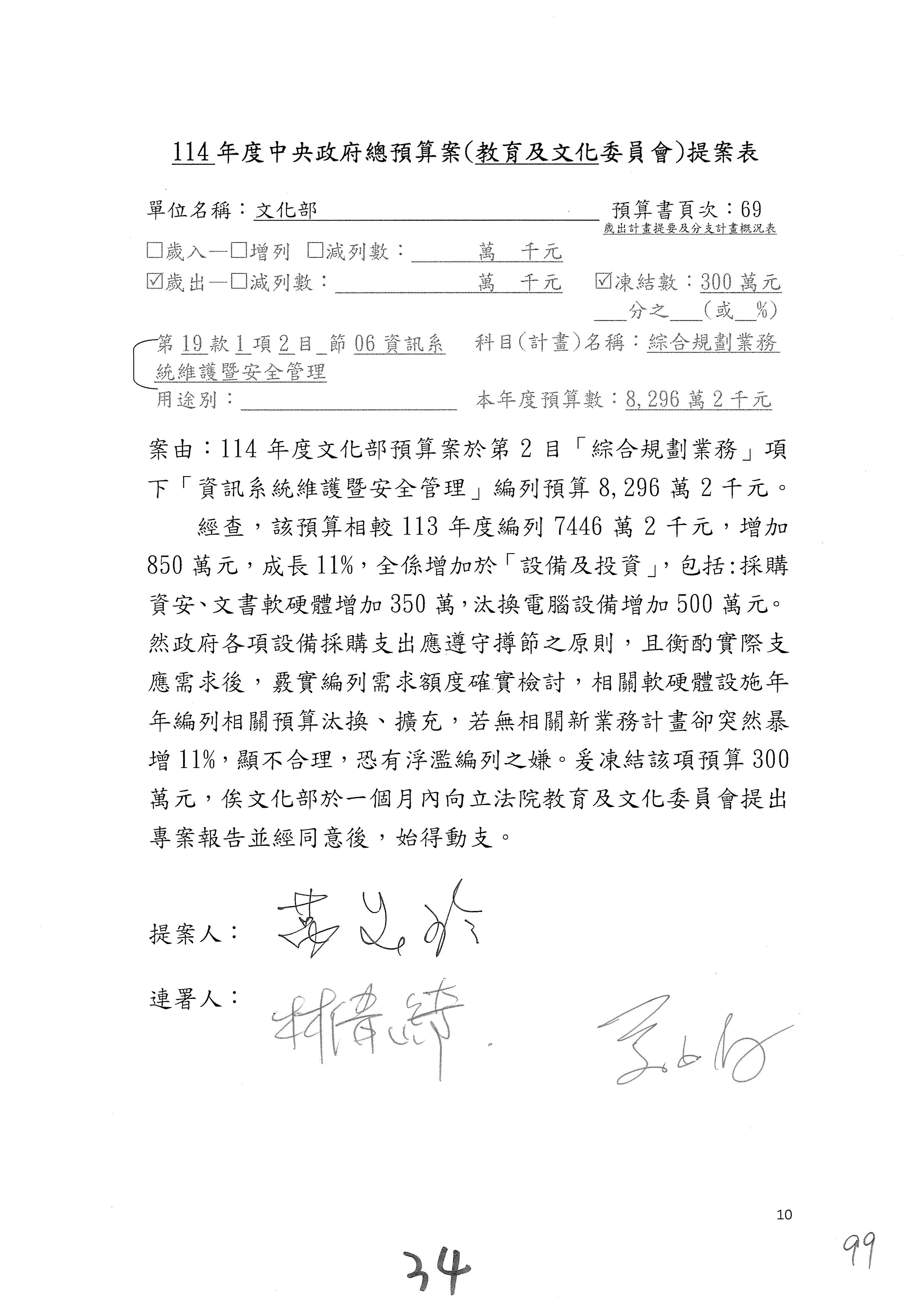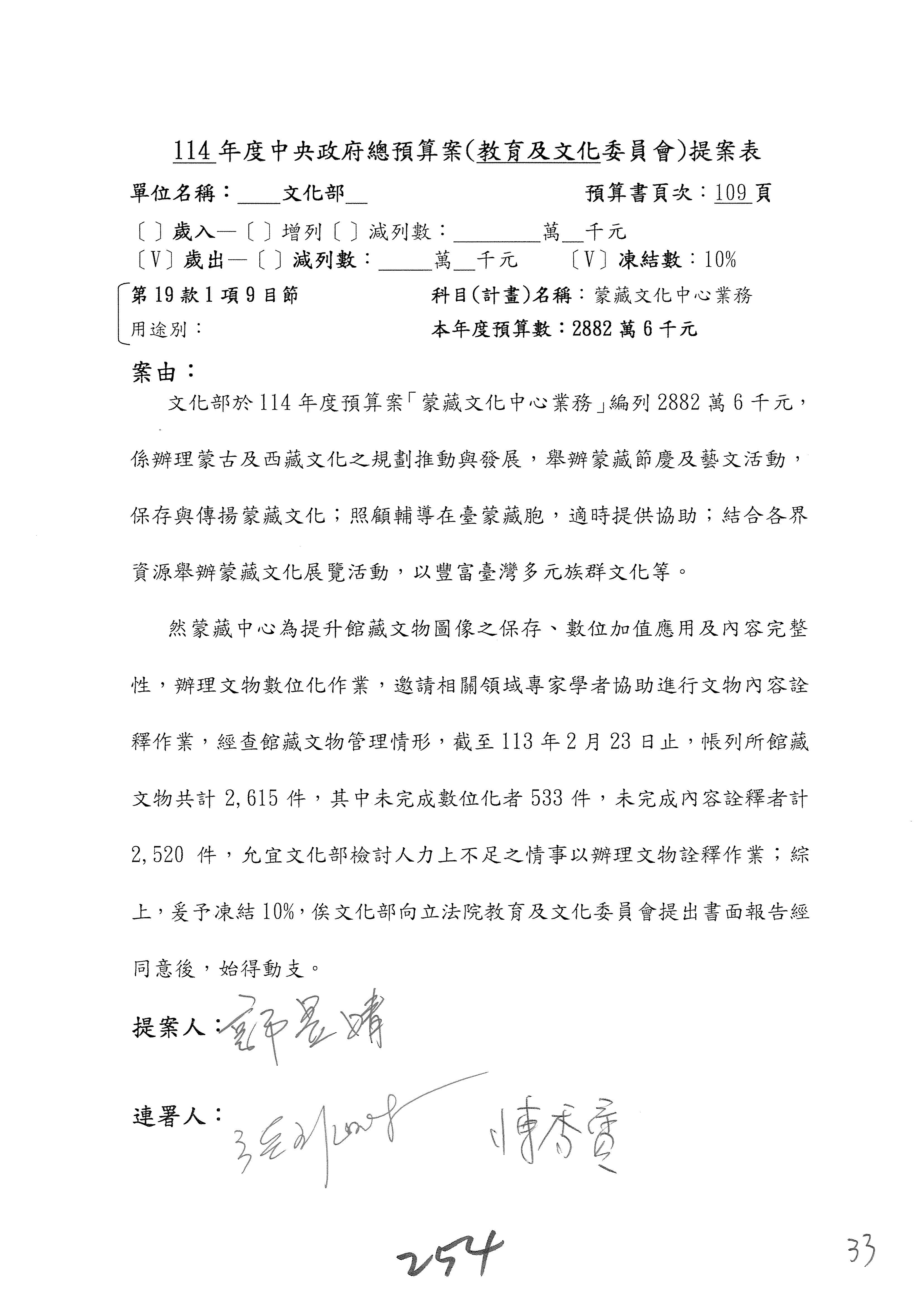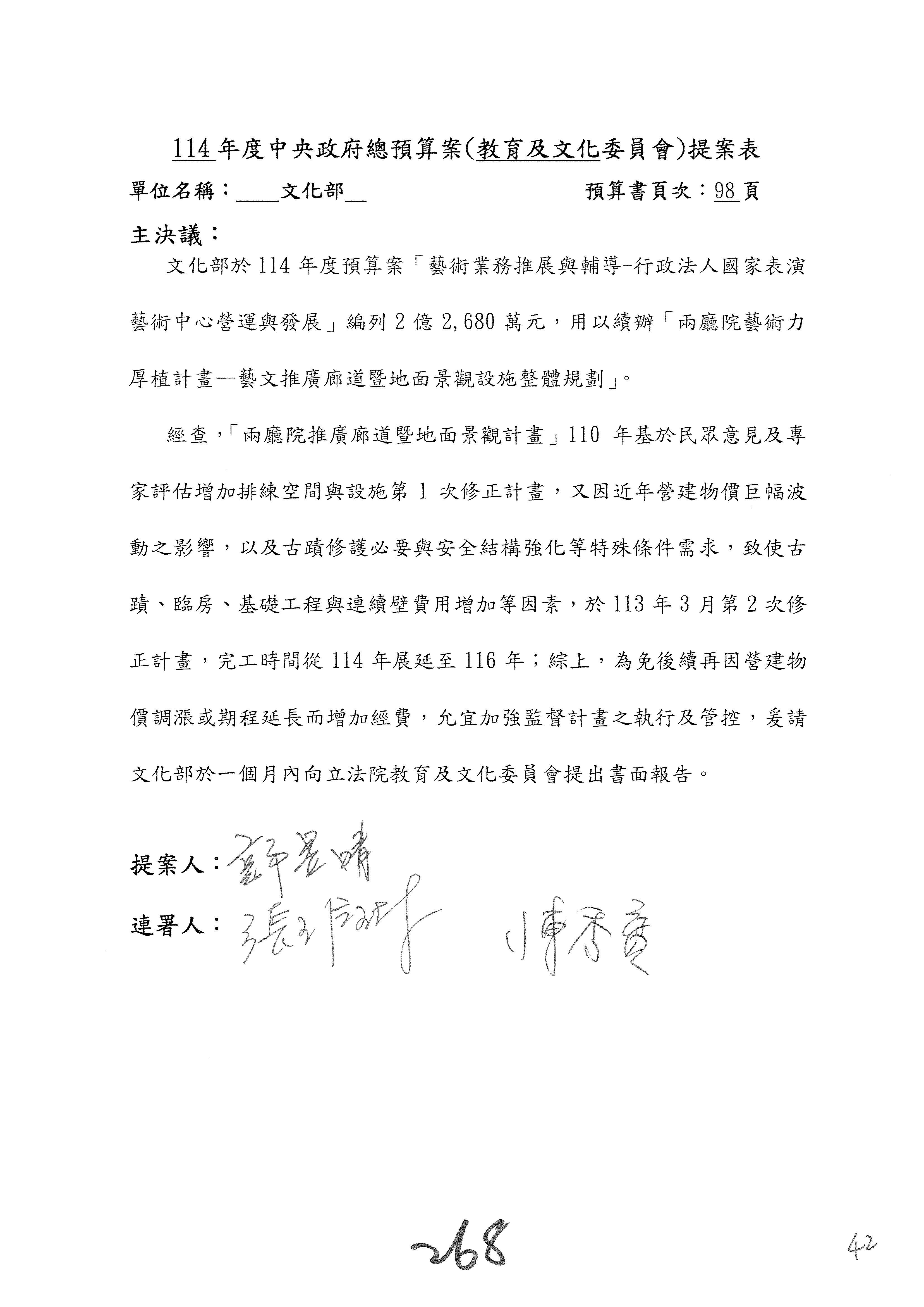 (三)114年度核能安全委員會及所屬第2目「原子能管理發展業務」第1節「原子能科學發展」預算編列27億5,477萬9千元,凍結5,000萬元,俟核能安全委員會向立法院教育及文化委員會提出書面報告後,始得動支。15-42
