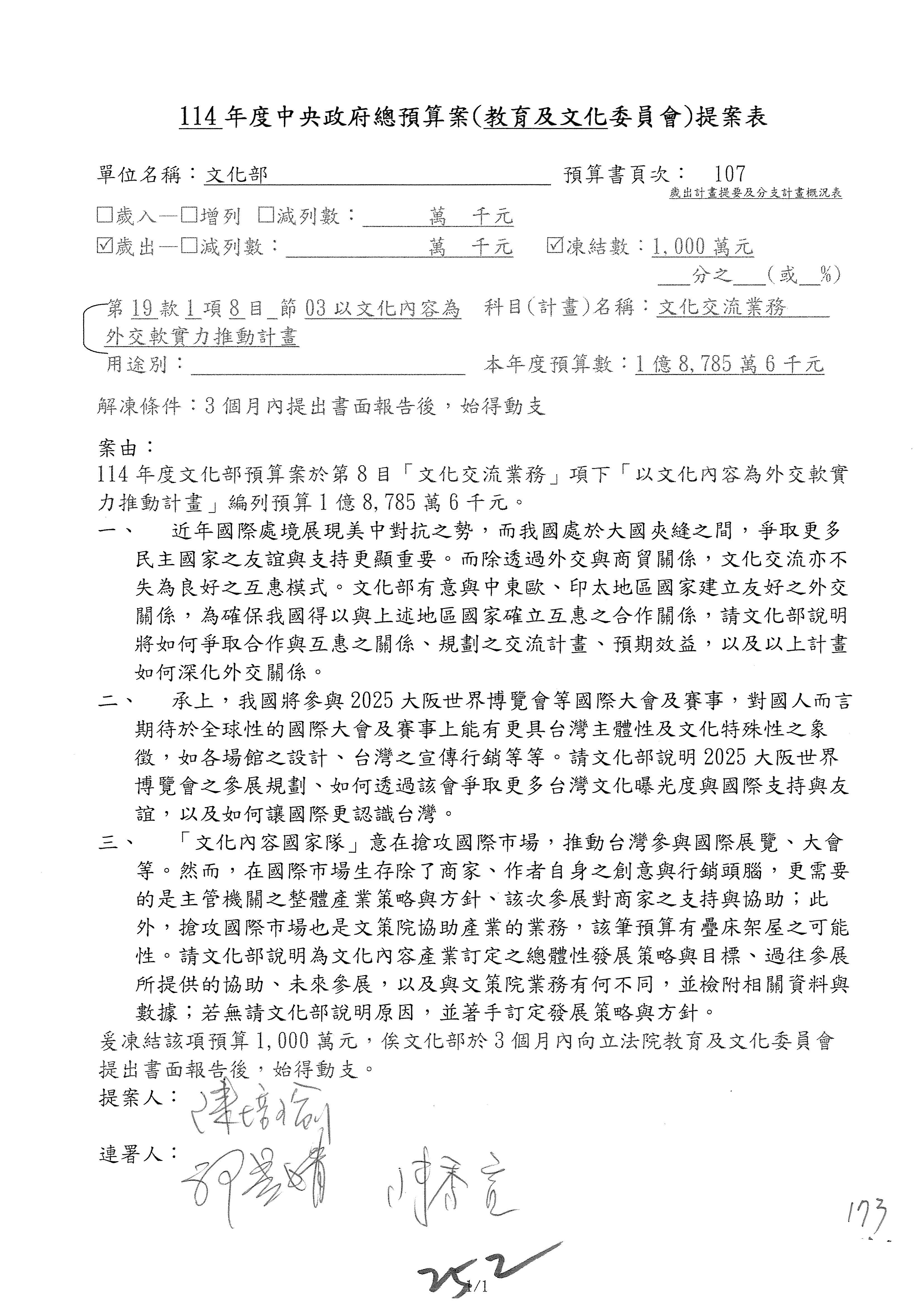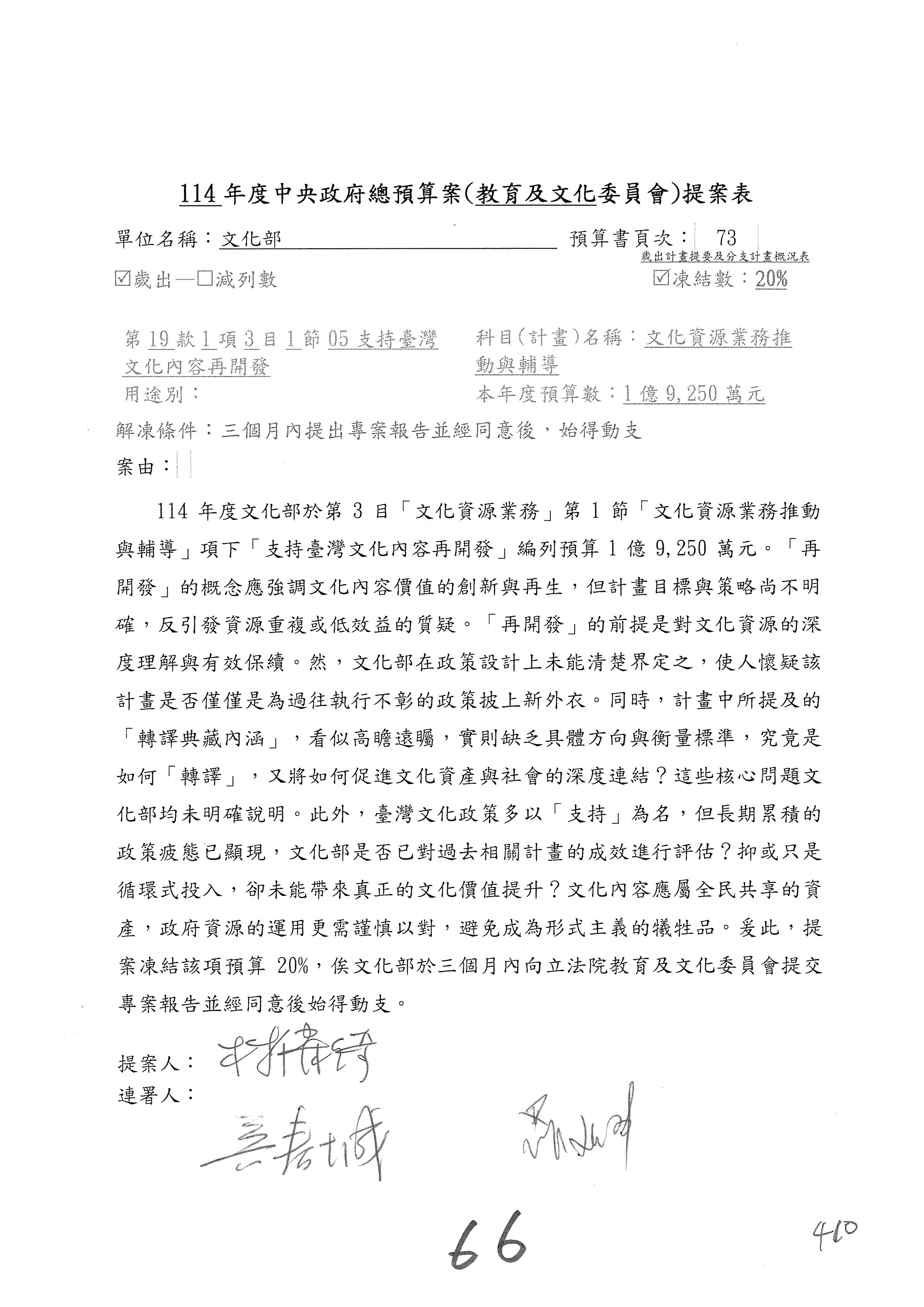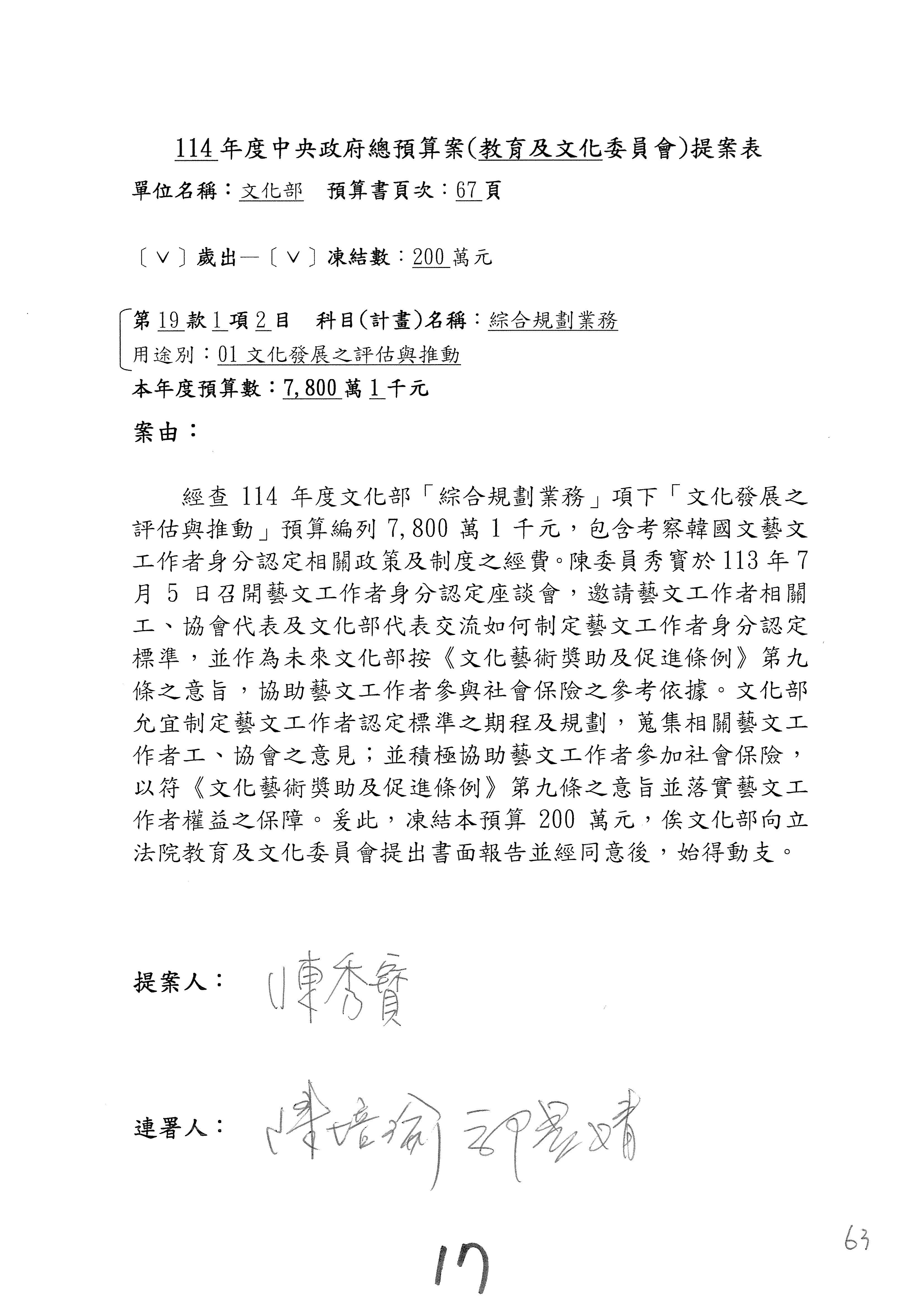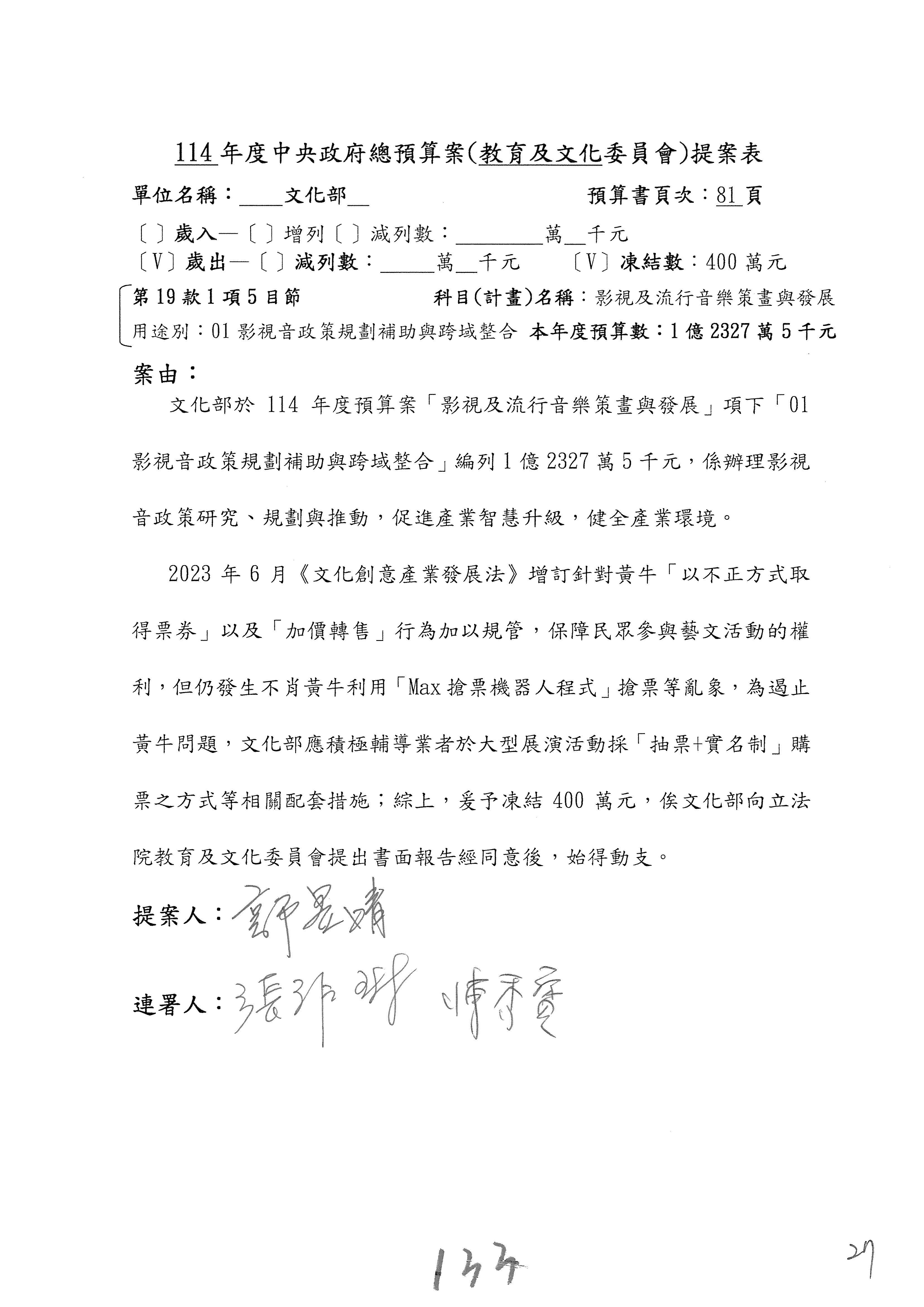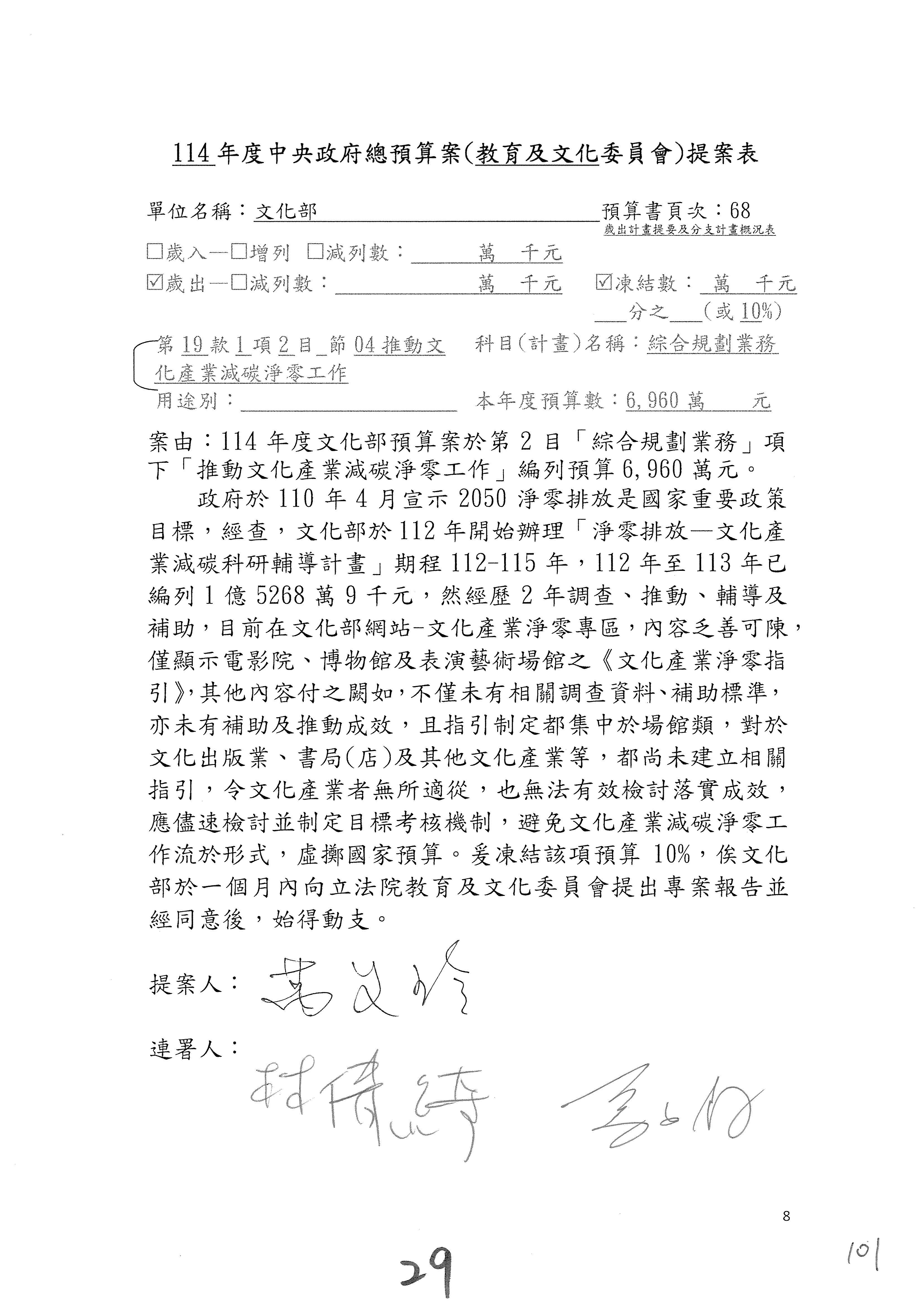 (三)114年度核能安全委員會及所屬第2目「原子能管理發展業務」第1節「原子能科學發展」預算編列27億5,477萬9千元,凍結5,000萬元,俟核能安全委員會向立法院教育及文化委員會提出書面報告後,始得動支。15-42