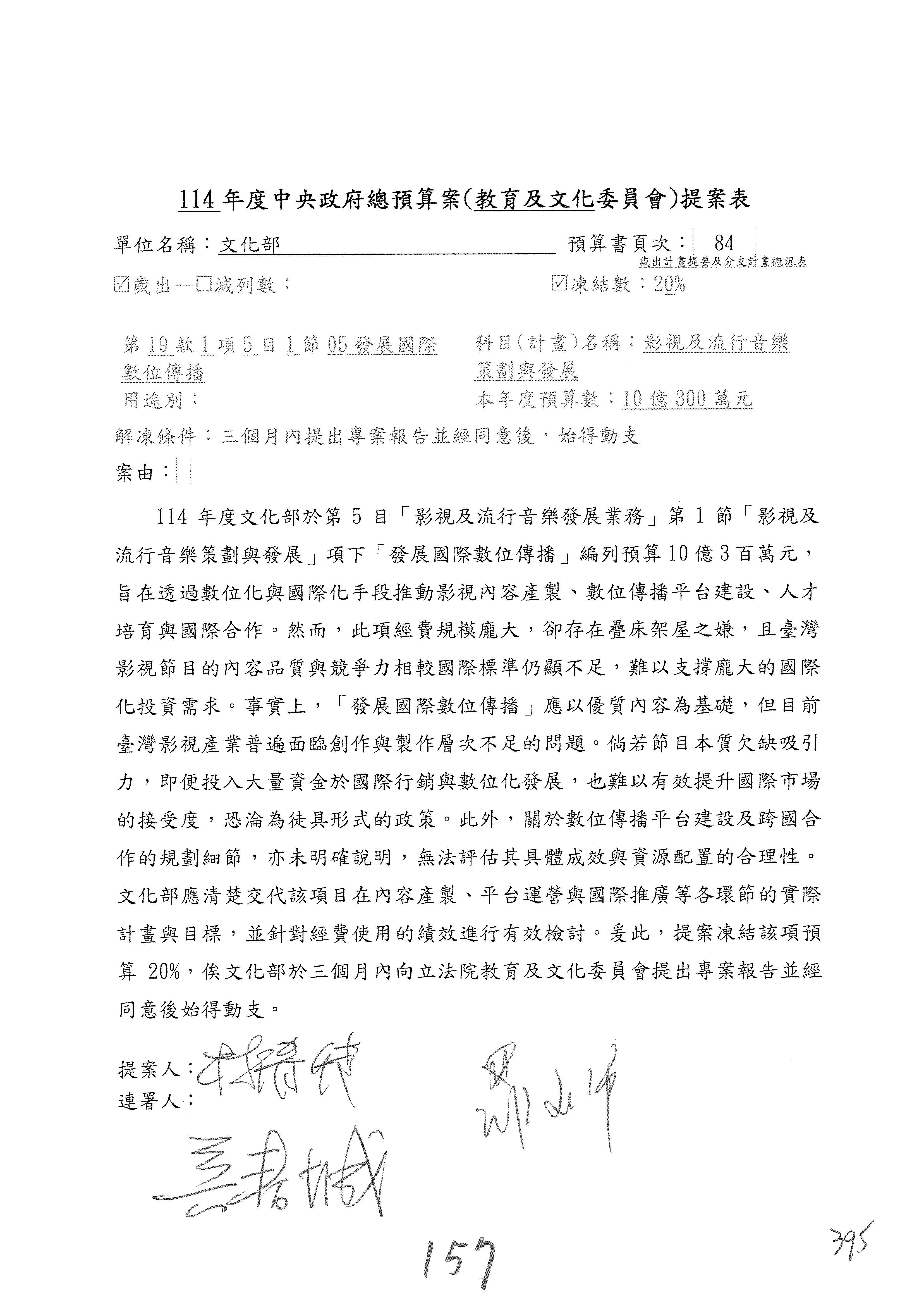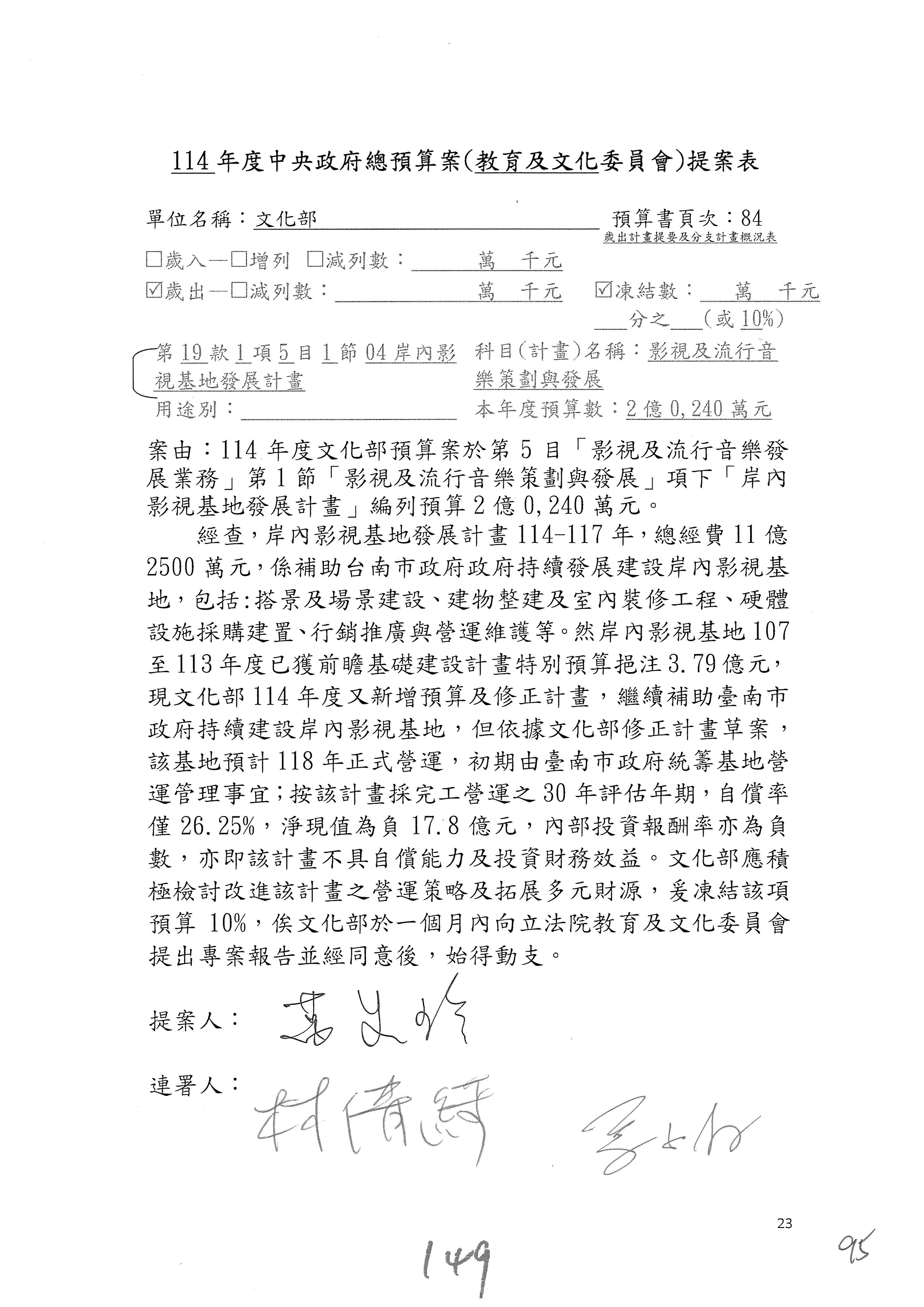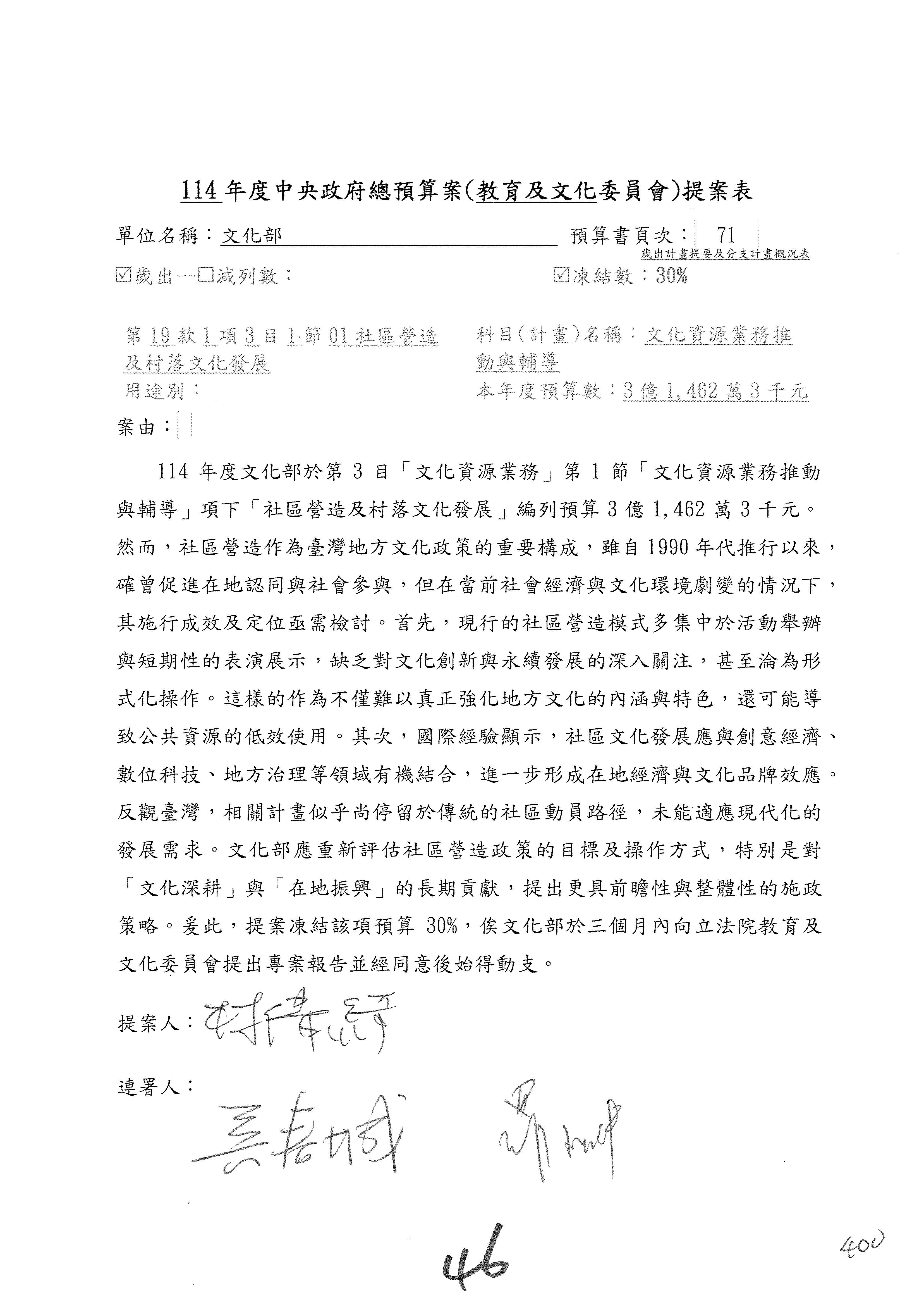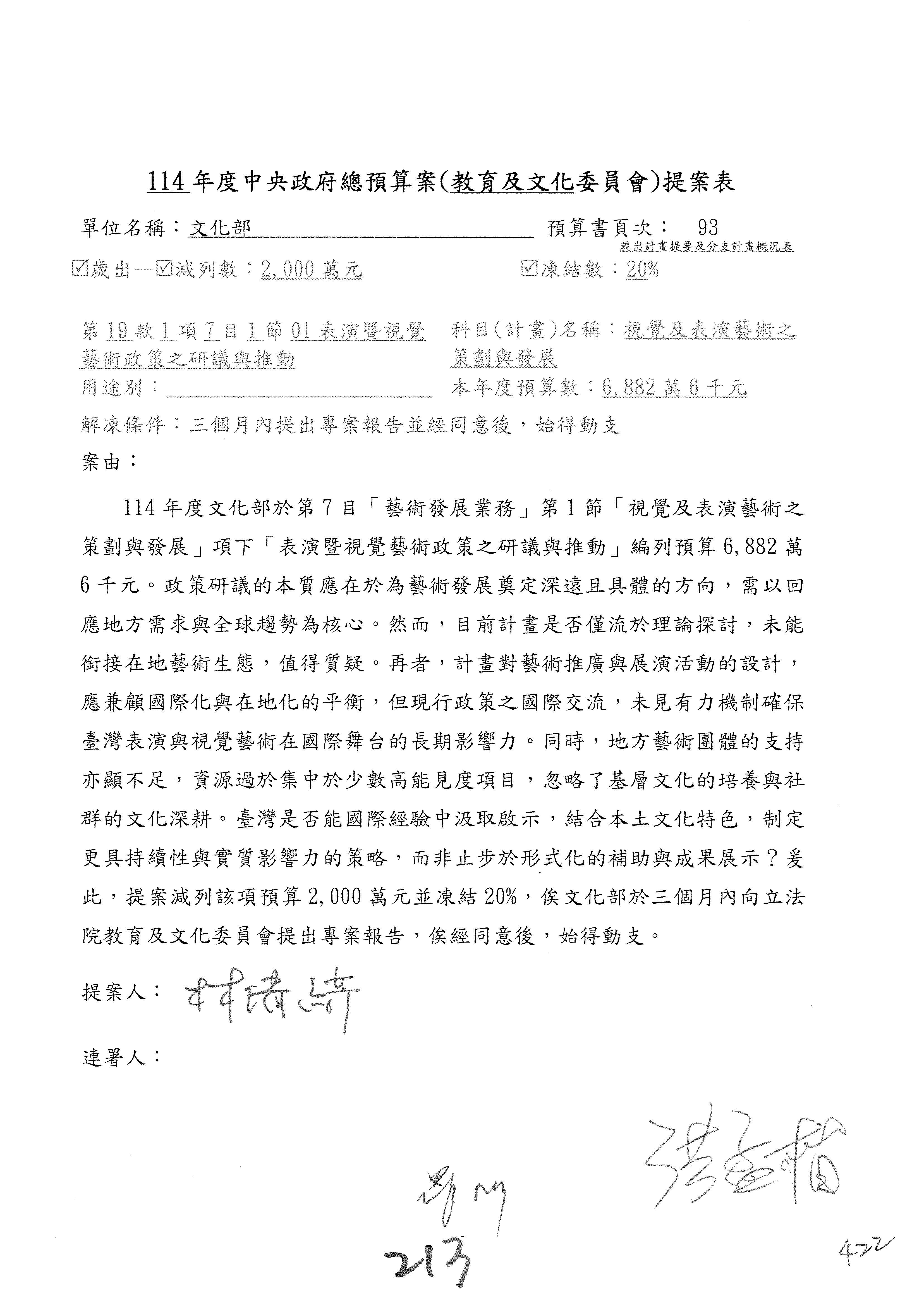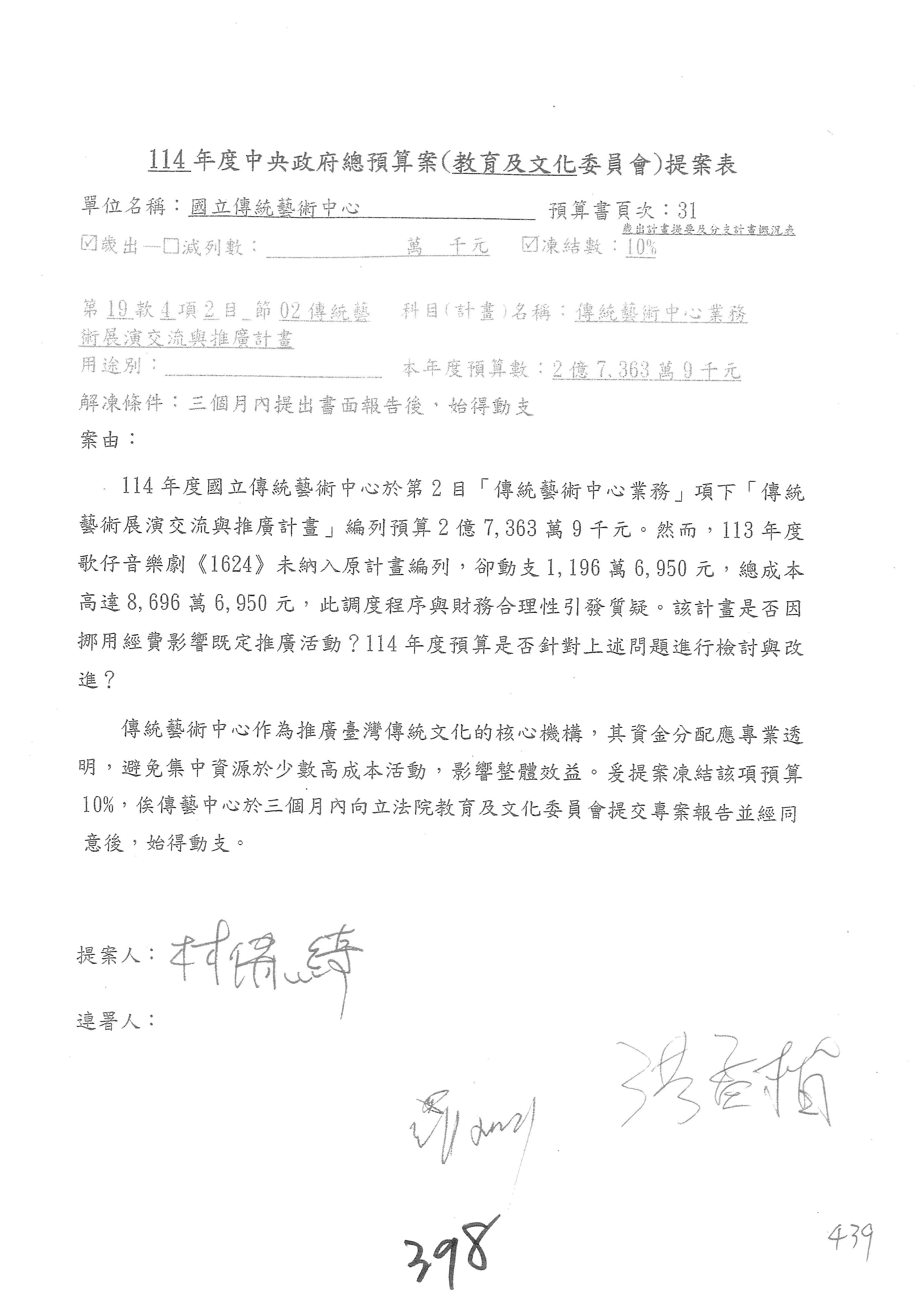 (三)114年度核能安全委員會及所屬第2目「原子能管理發展業務」第1節「原子能科學發展」預算編列27億5,477萬9千元,凍結5,000萬元,俟核能安全委員會向立法院教育及文化委員會提出書面報告後,始得動支。15-42