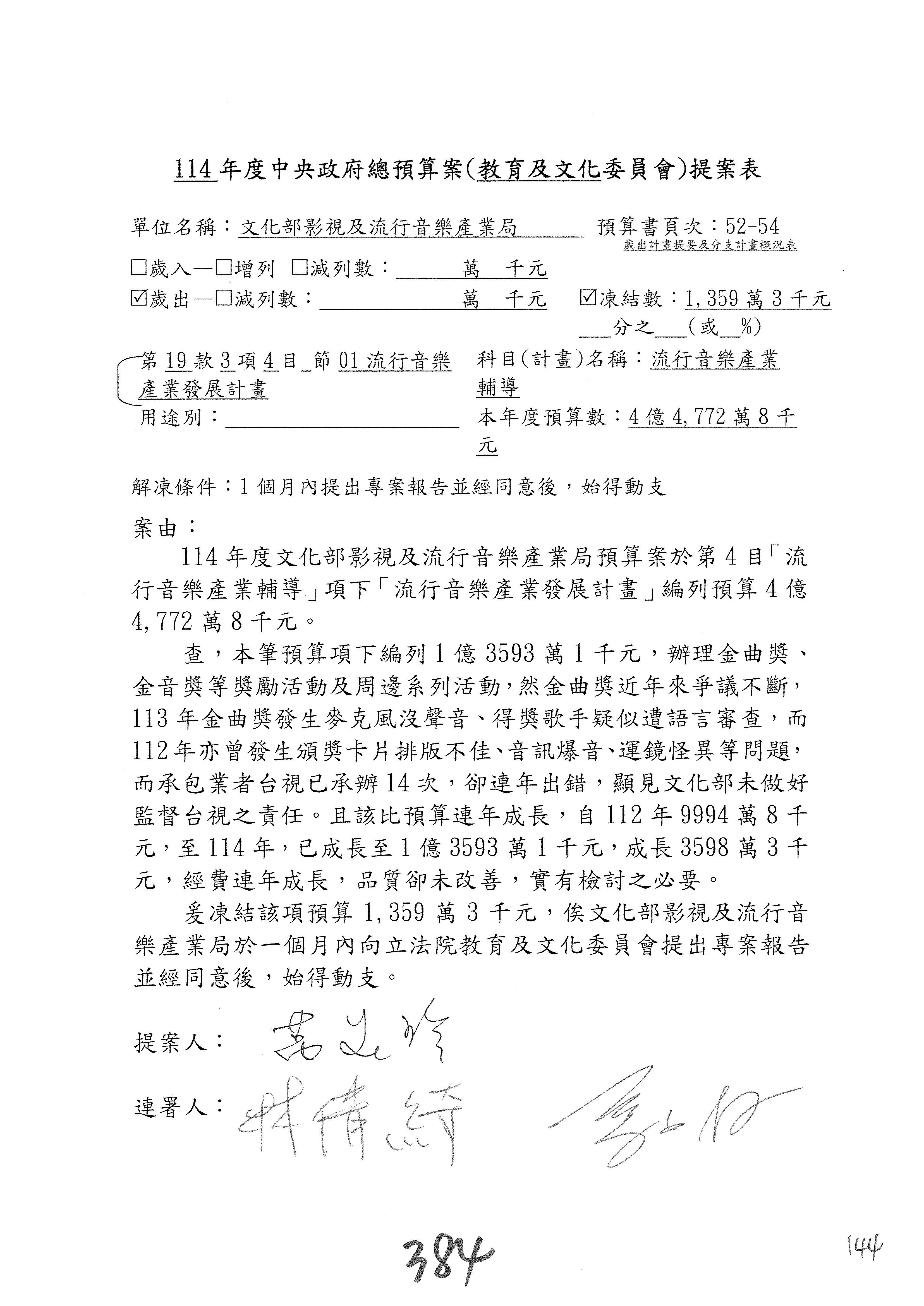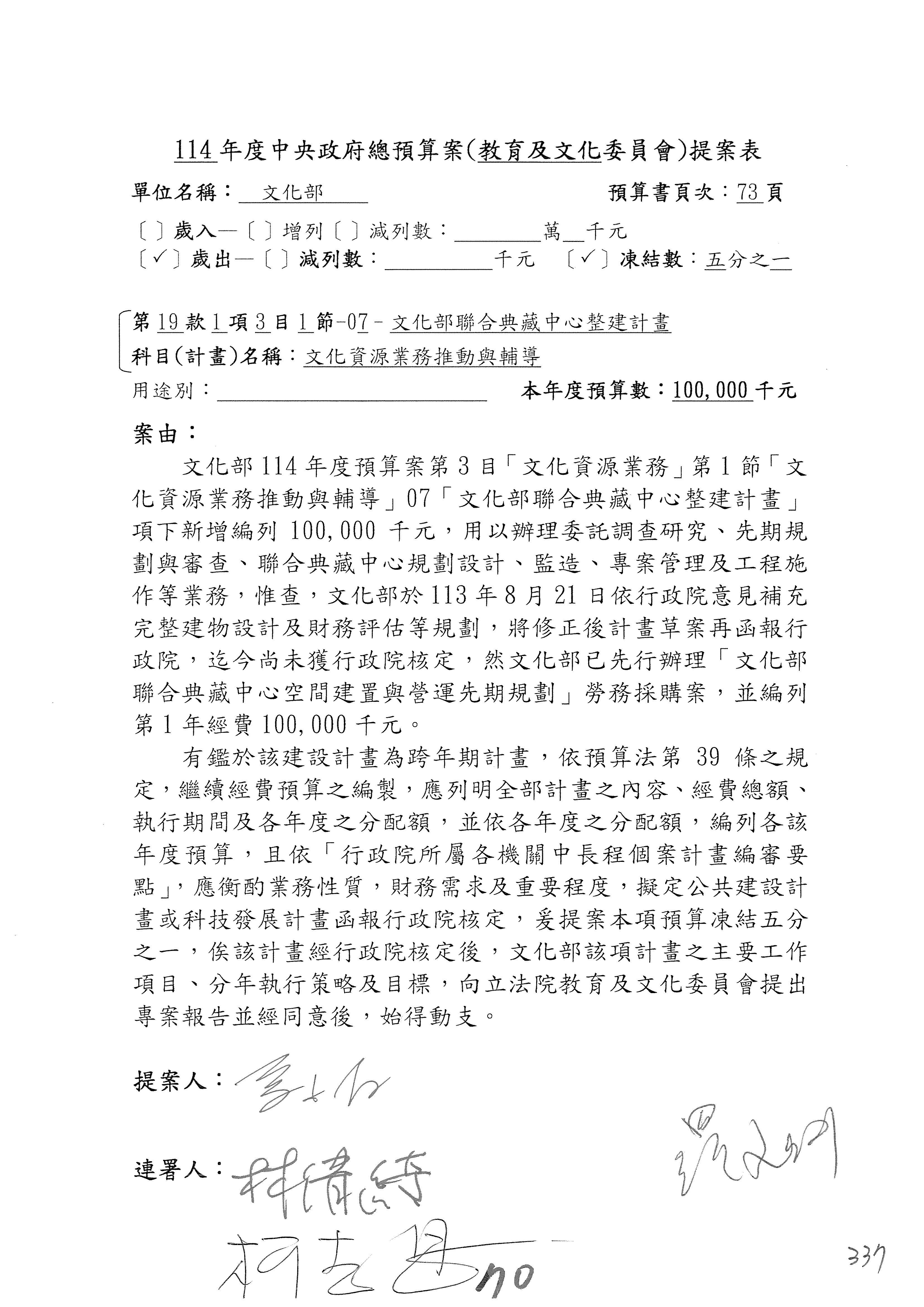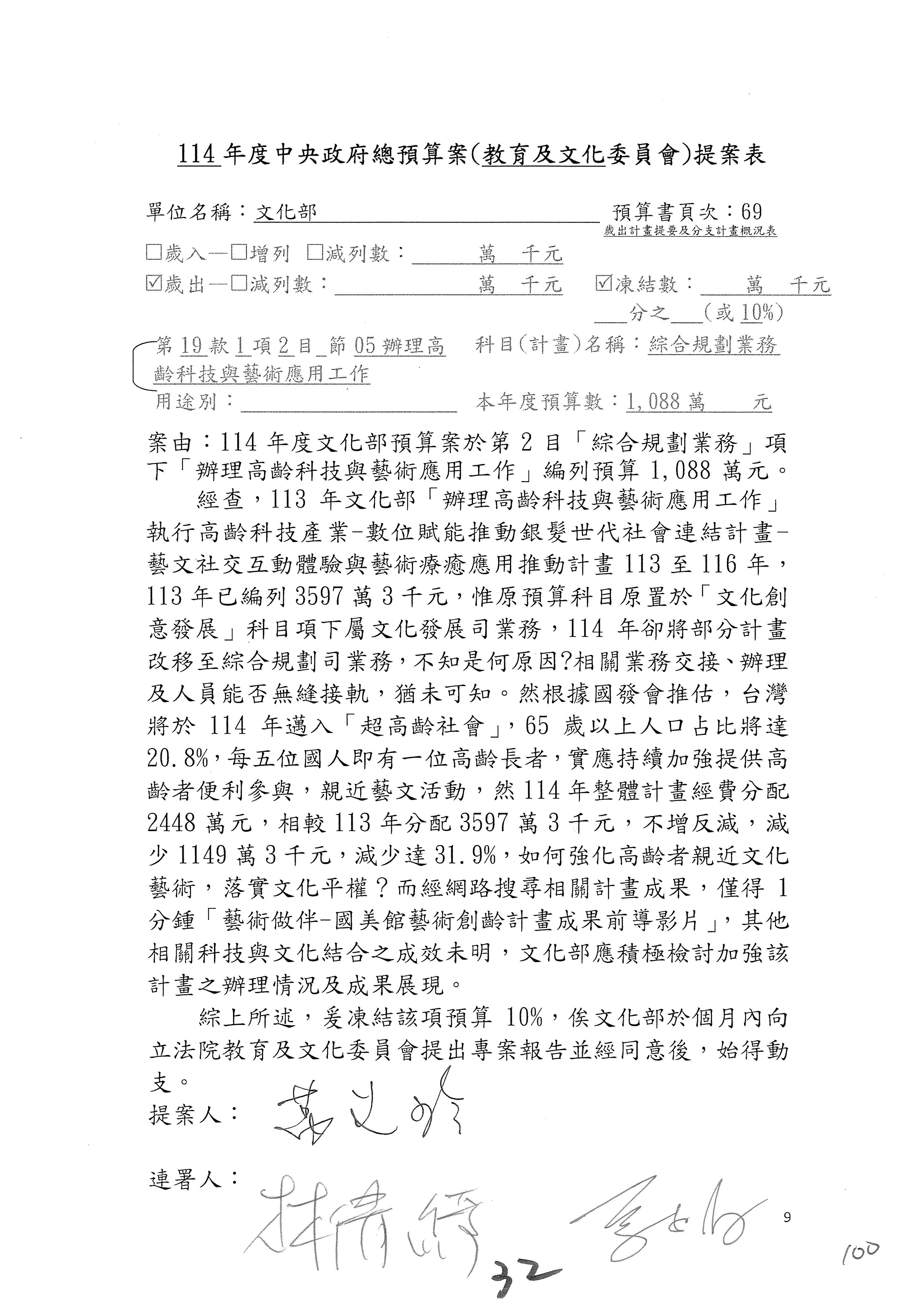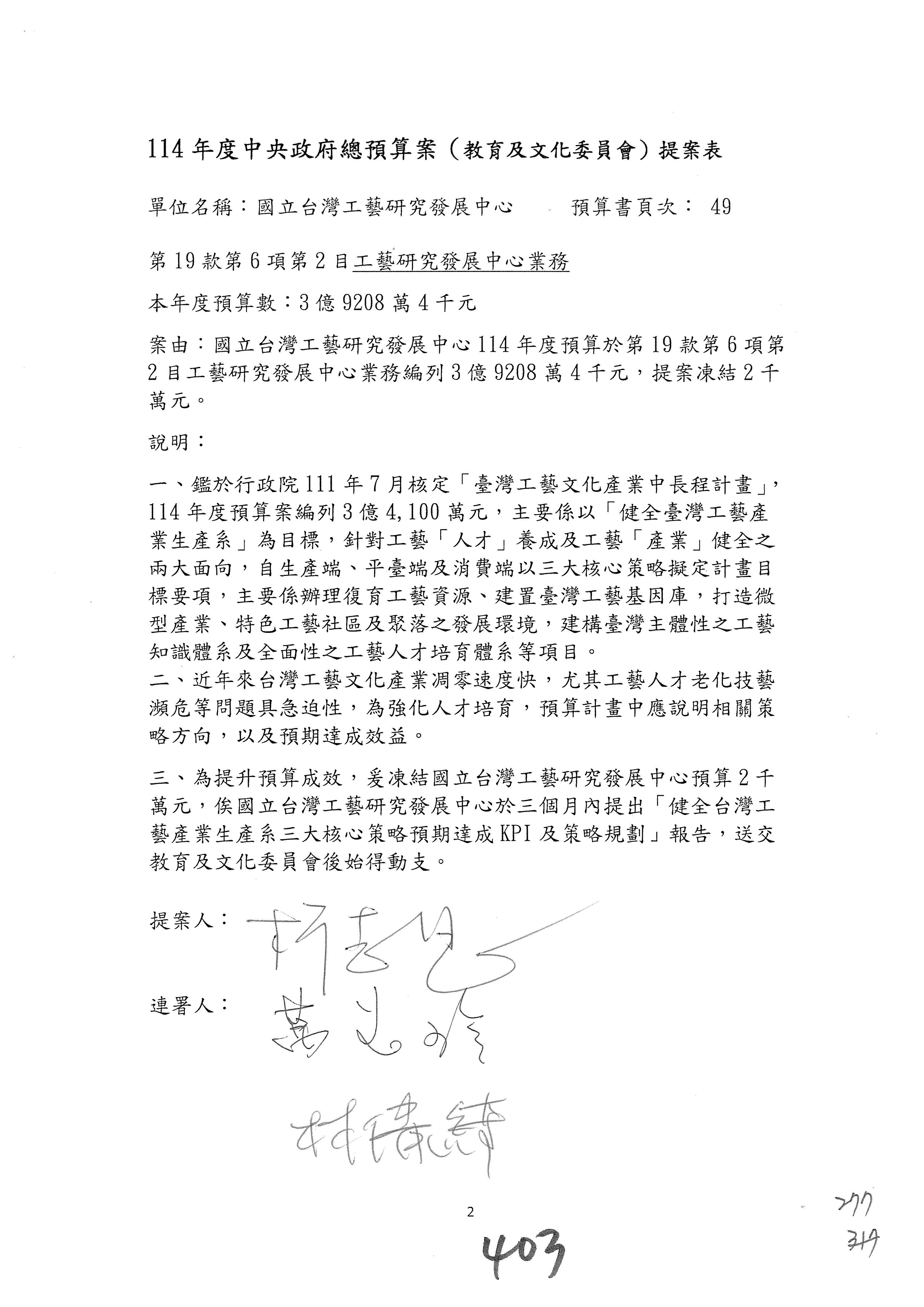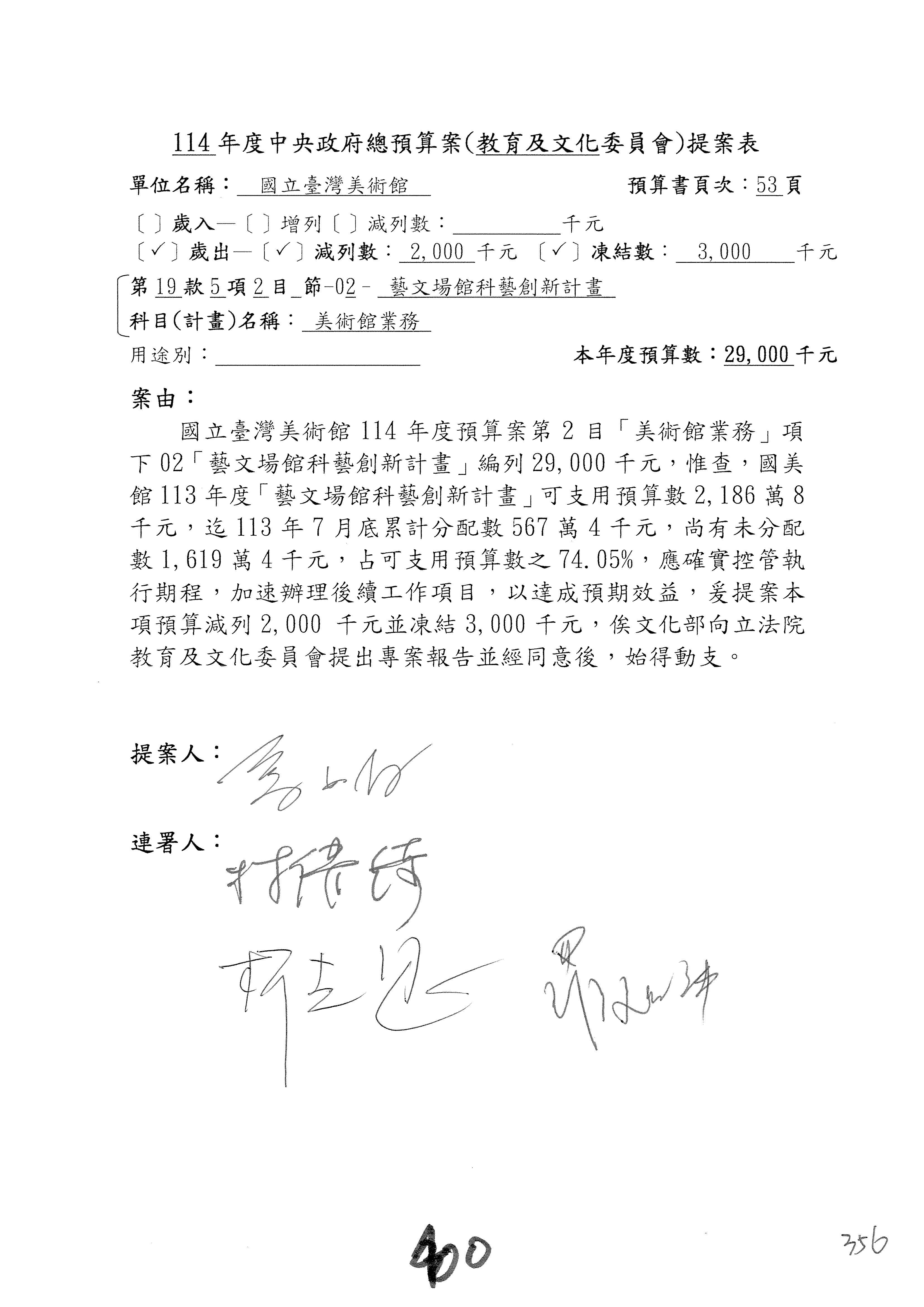 (三)114年度核能安全委員會及所屬第2目「原子能管理發展業務」第1節「原子能科學發展」預算編列27億5,477萬9千元,凍結5,000萬元,俟核能安全委員會向立法院教育及文化委員會提出書面報告後,始得動支。15-42