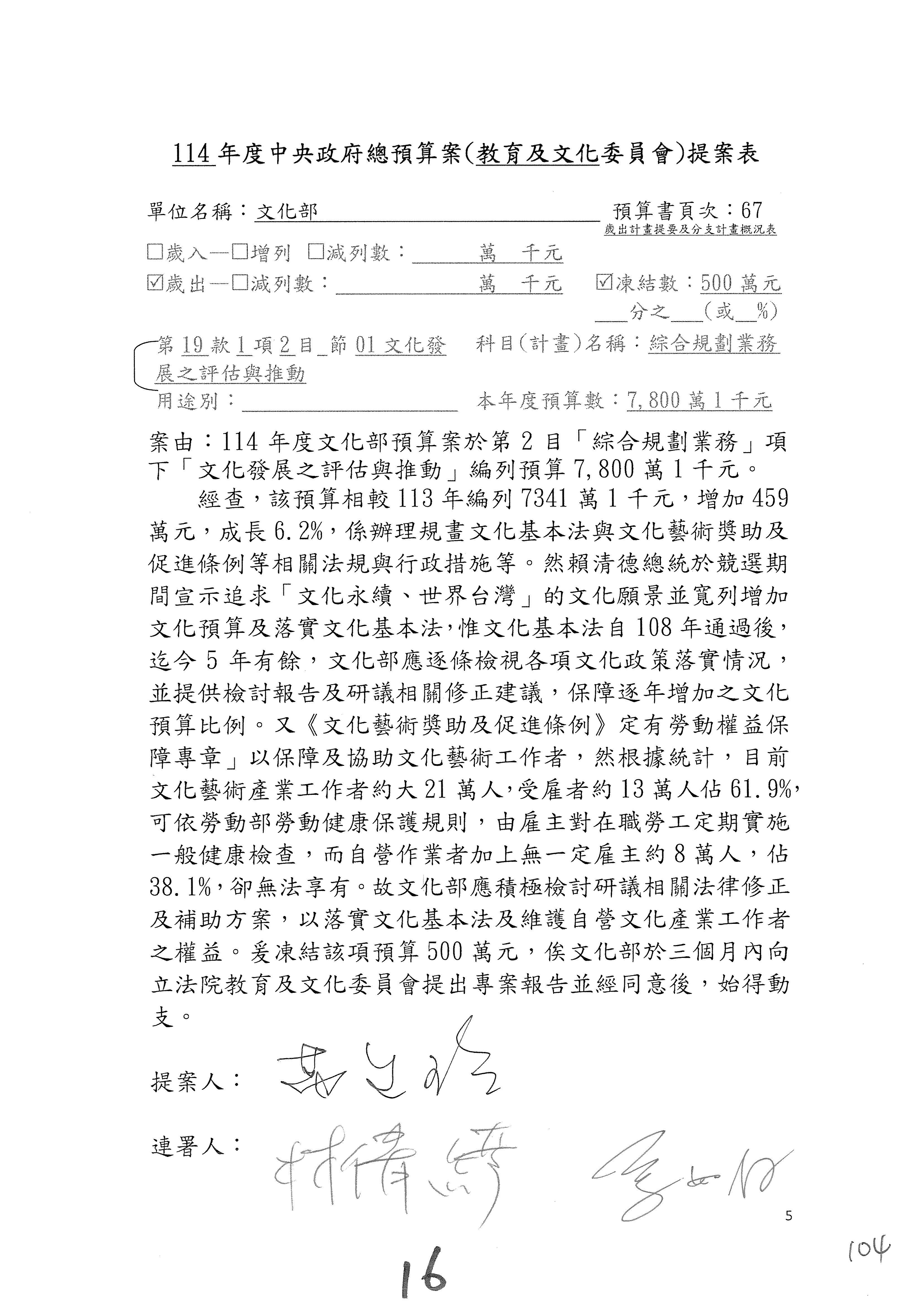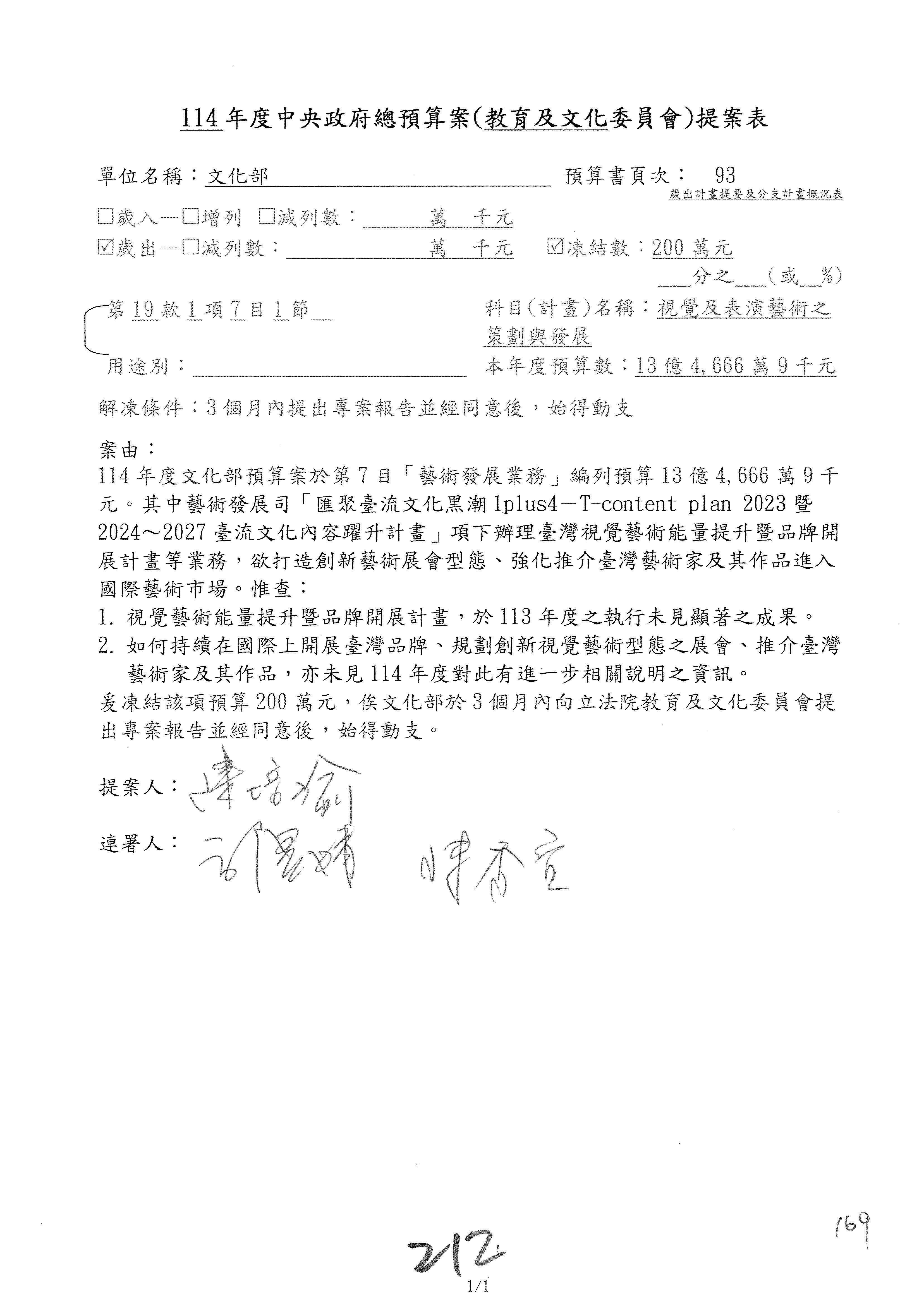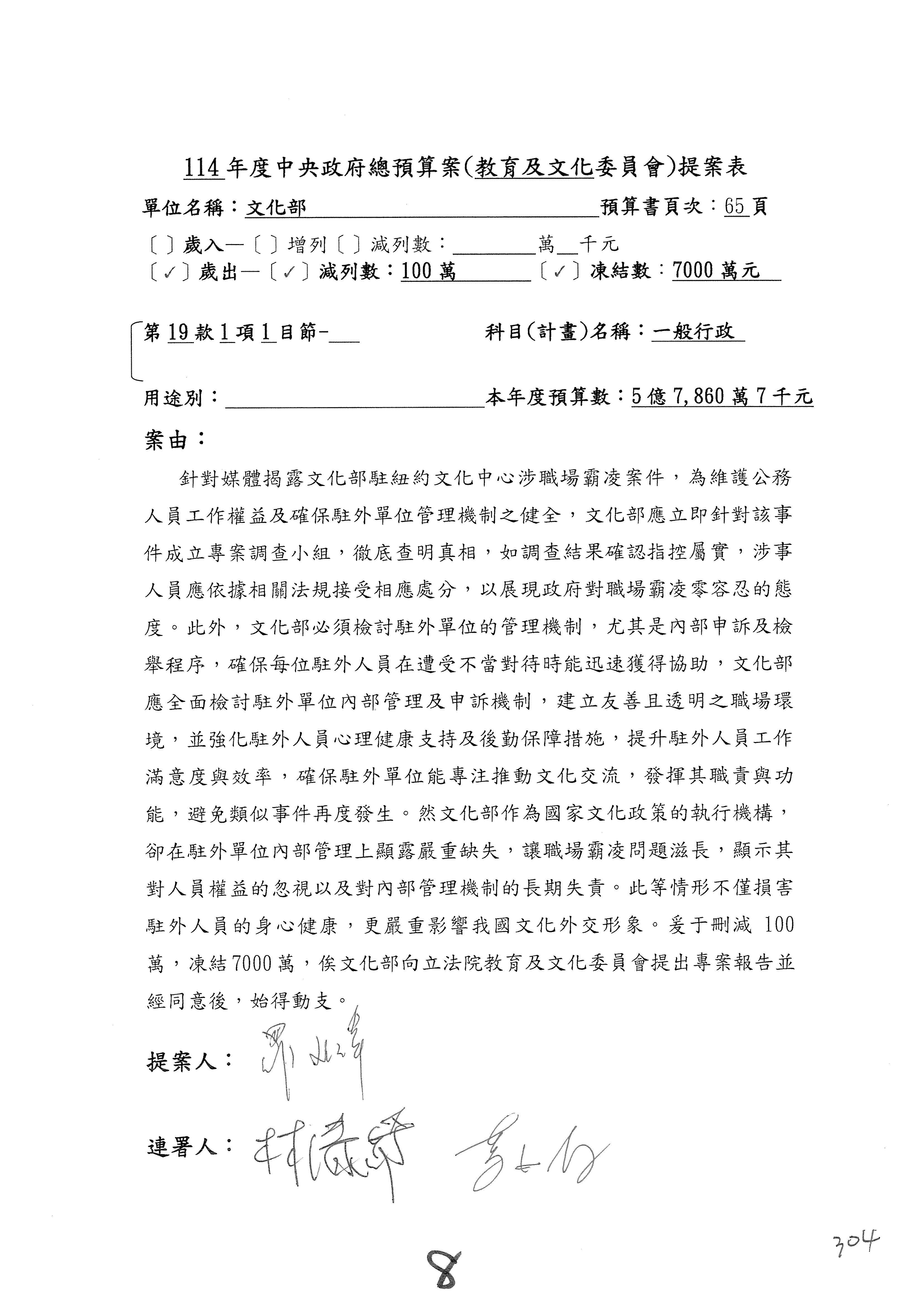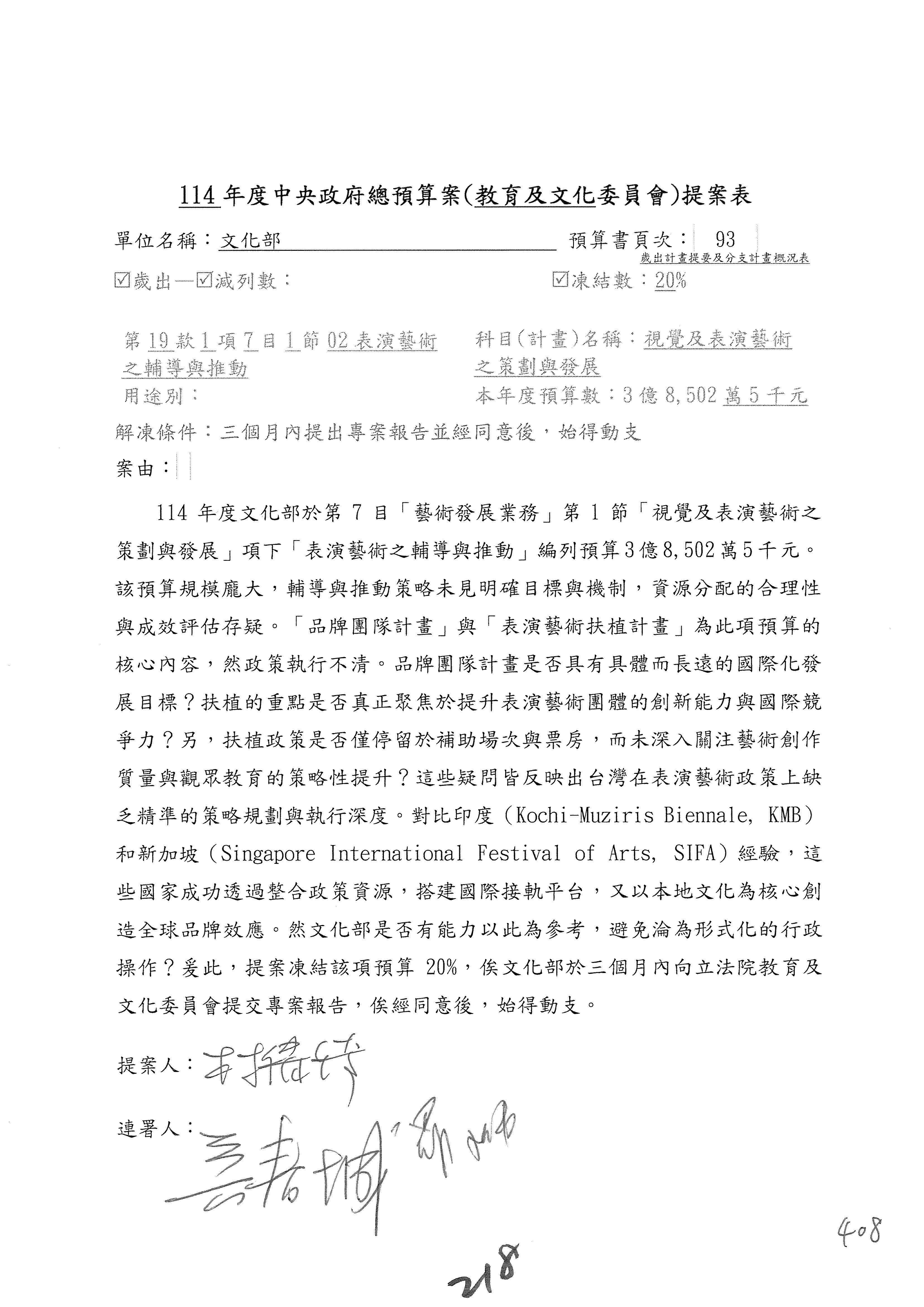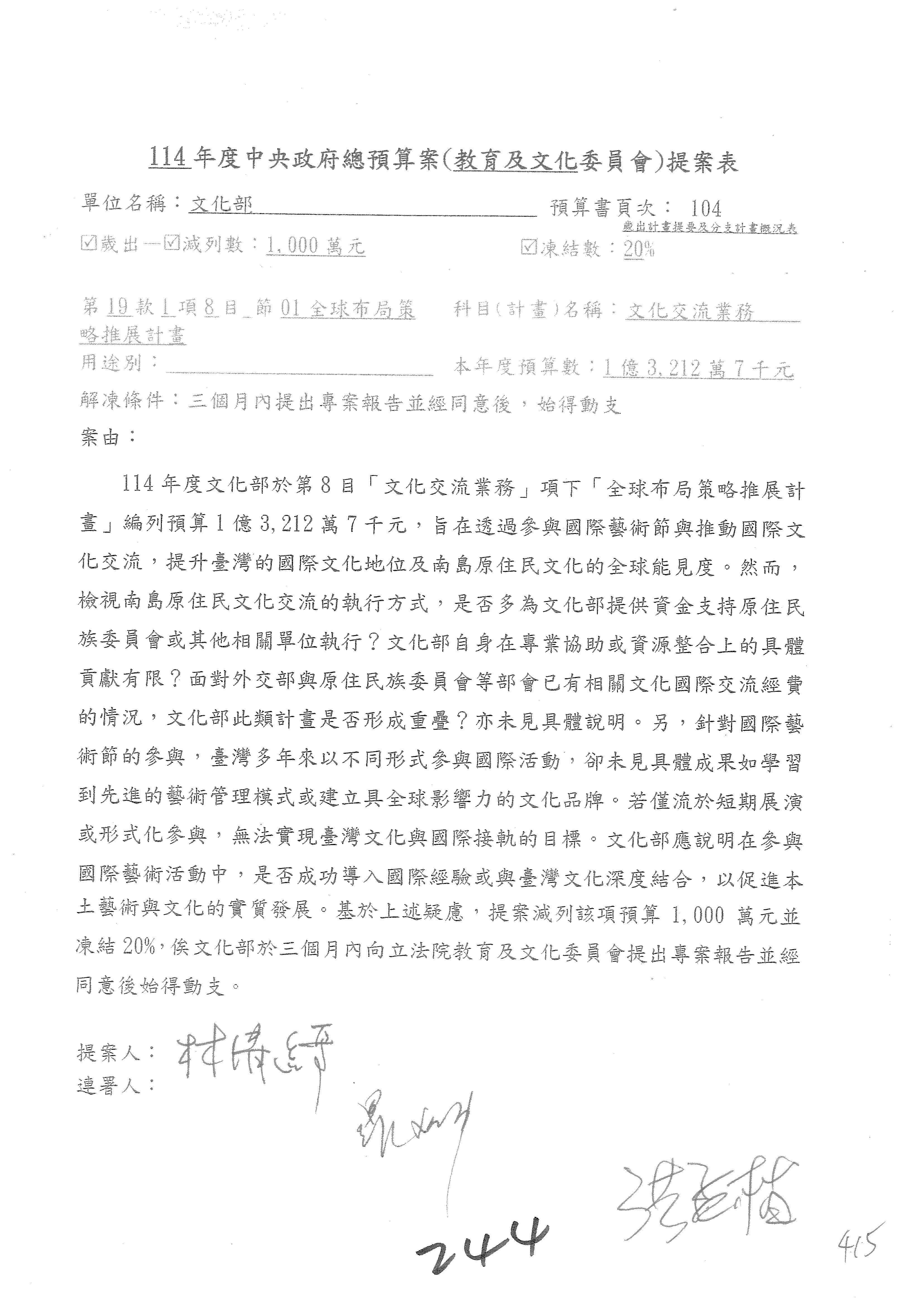 (三)114年度核能安全委員會及所屬第2目「原子能管理發展業務」第1節「原子能科學發展」預算編列27億5,477萬9千元,凍結5,000萬元,俟核能安全委員會向立法院教育及文化委員會提出書面報告後,始得動支。15-42