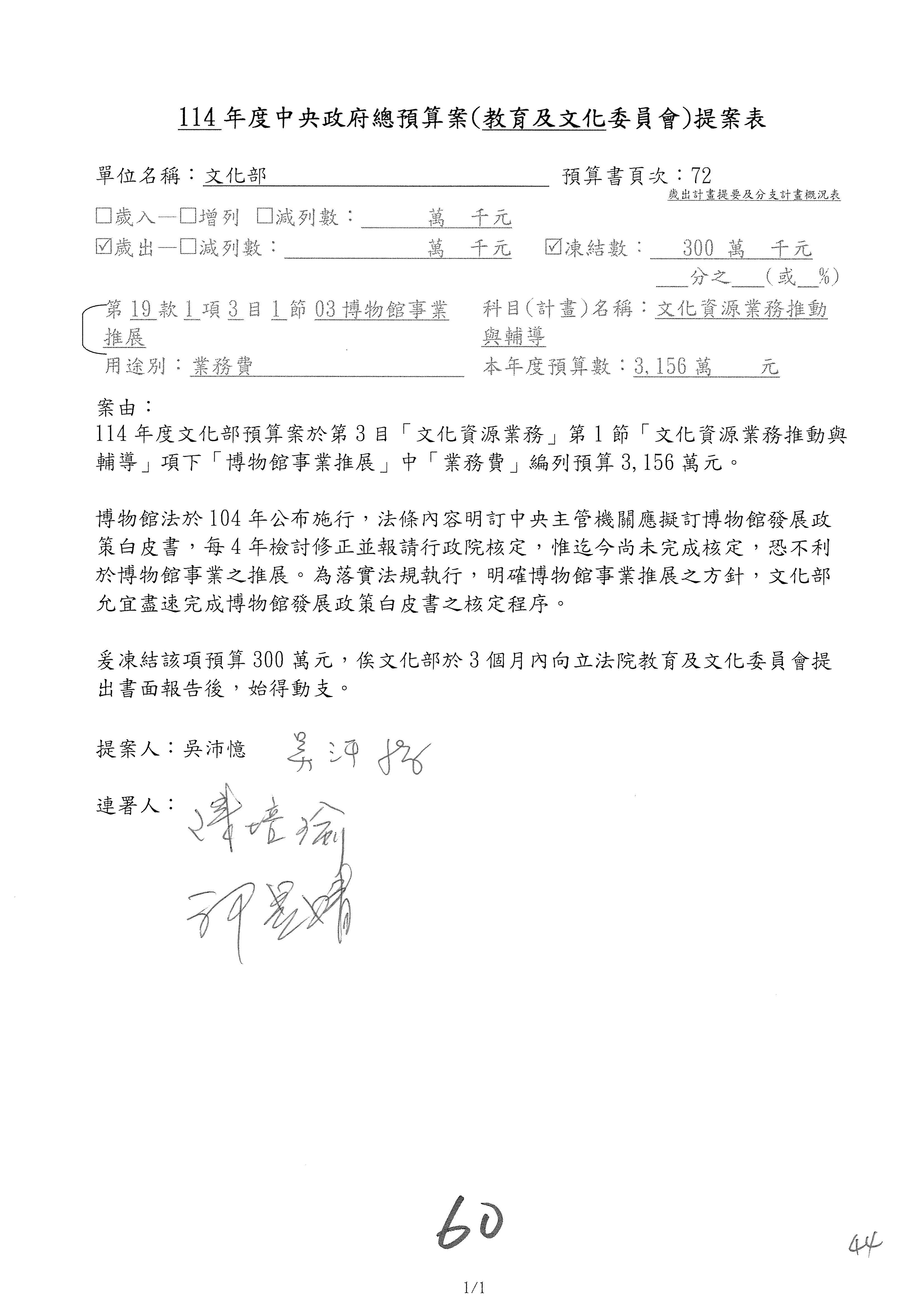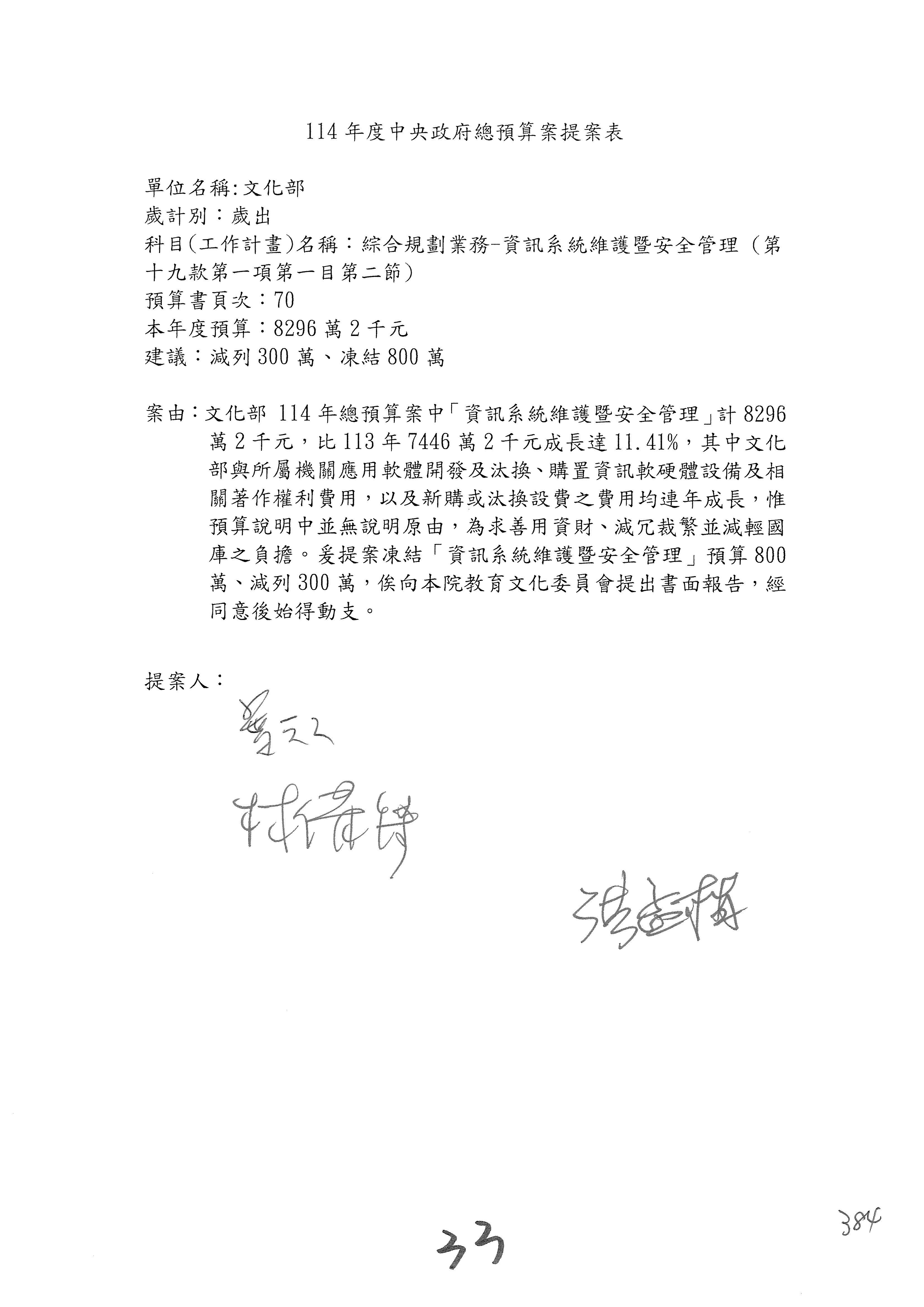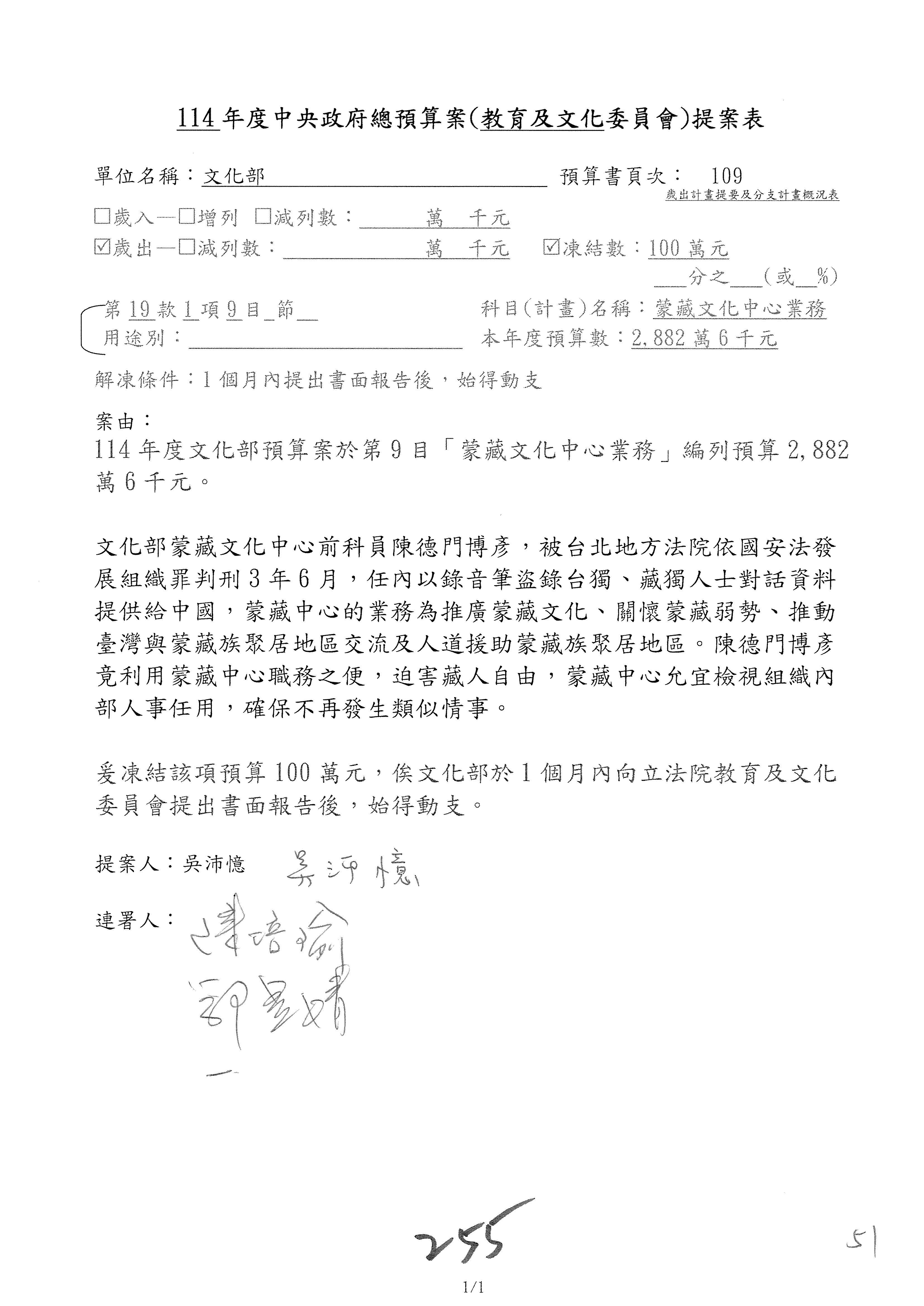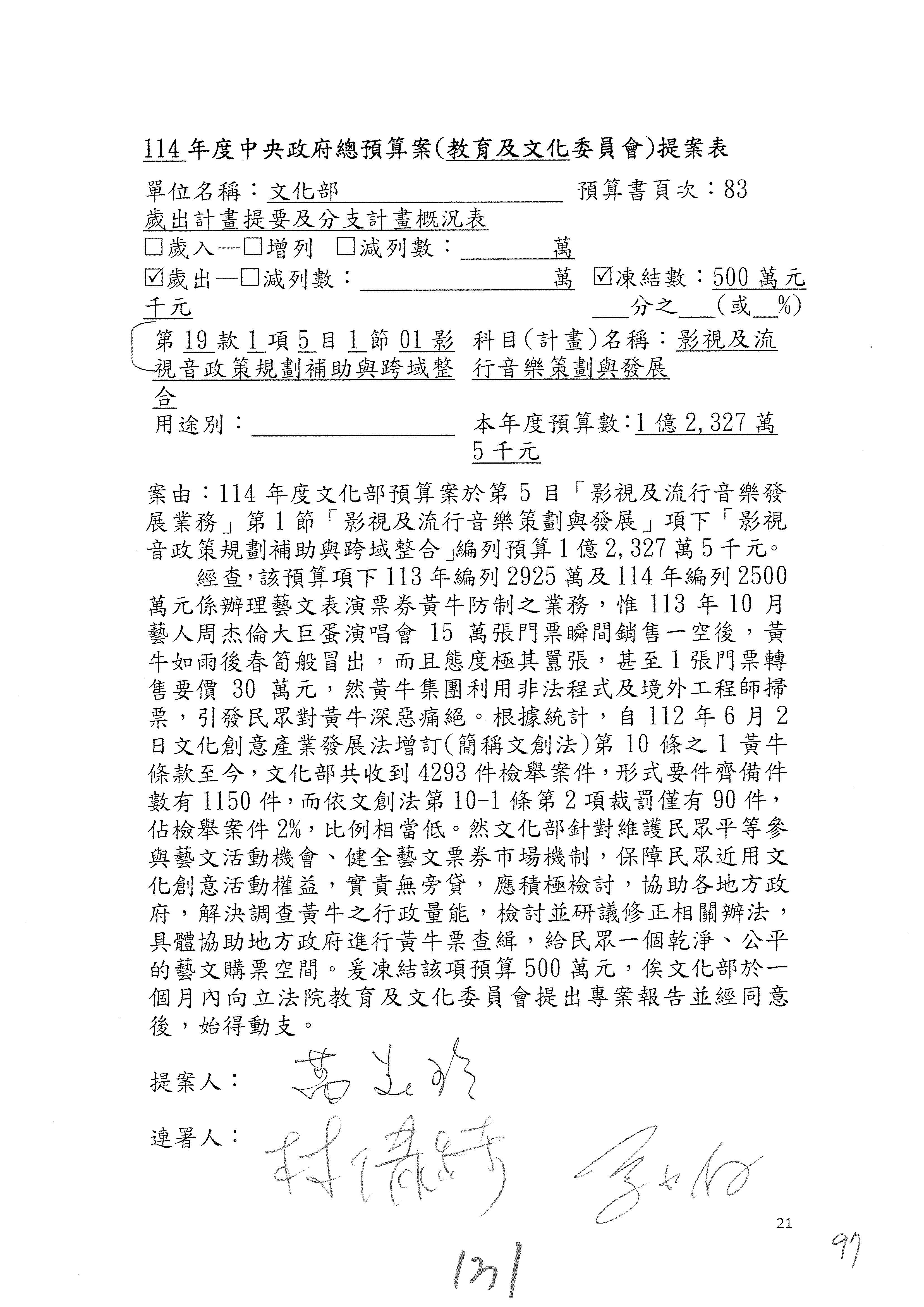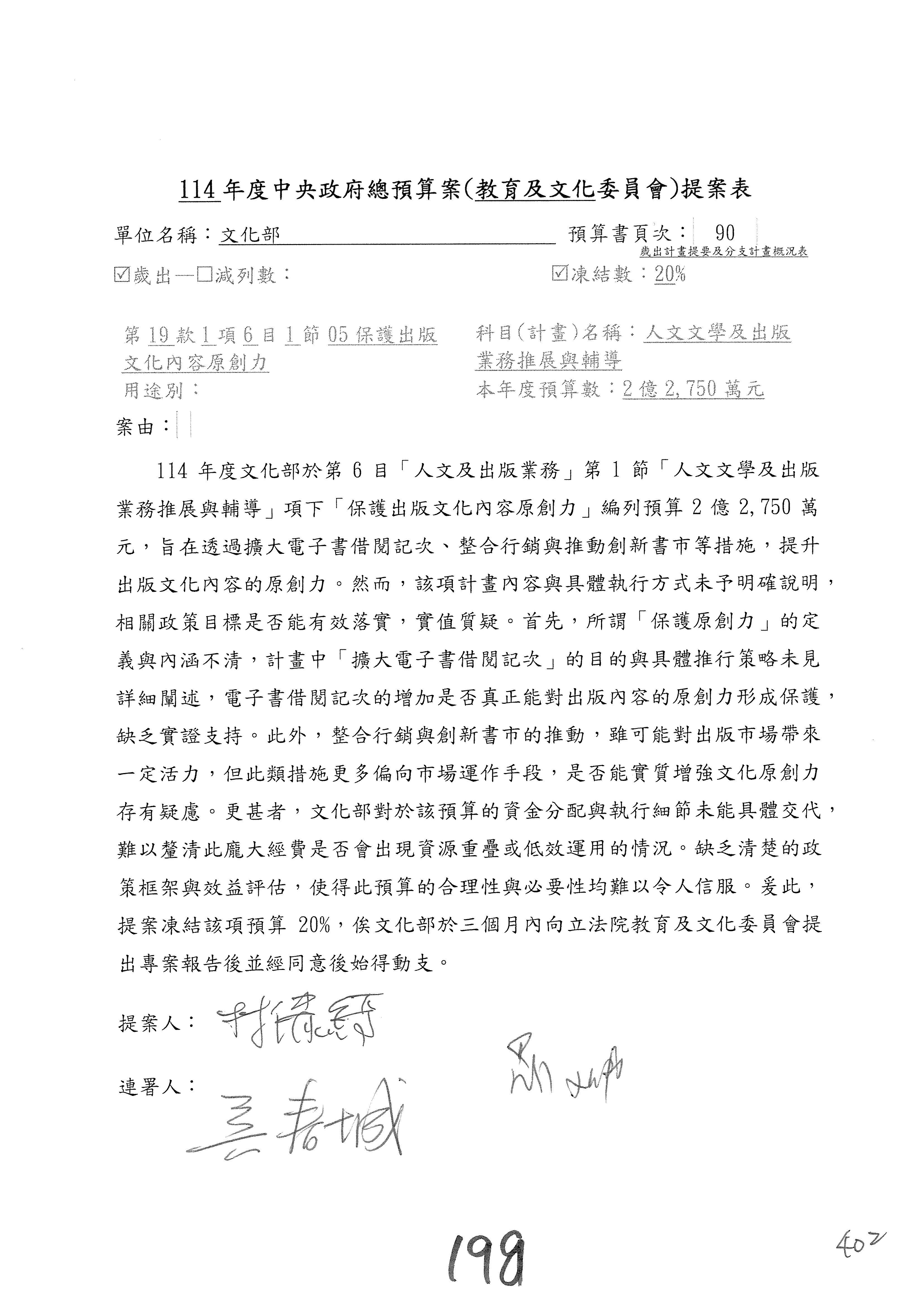 (三)114年度核能安全委員會及所屬第2目「原子能管理發展業務」第1節「原子能科學發展」預算編列27億5,477萬9千元,凍結5,000萬元,俟核能安全委員會向立法院教育及文化委員會提出書面報告後,始得動支。15-42