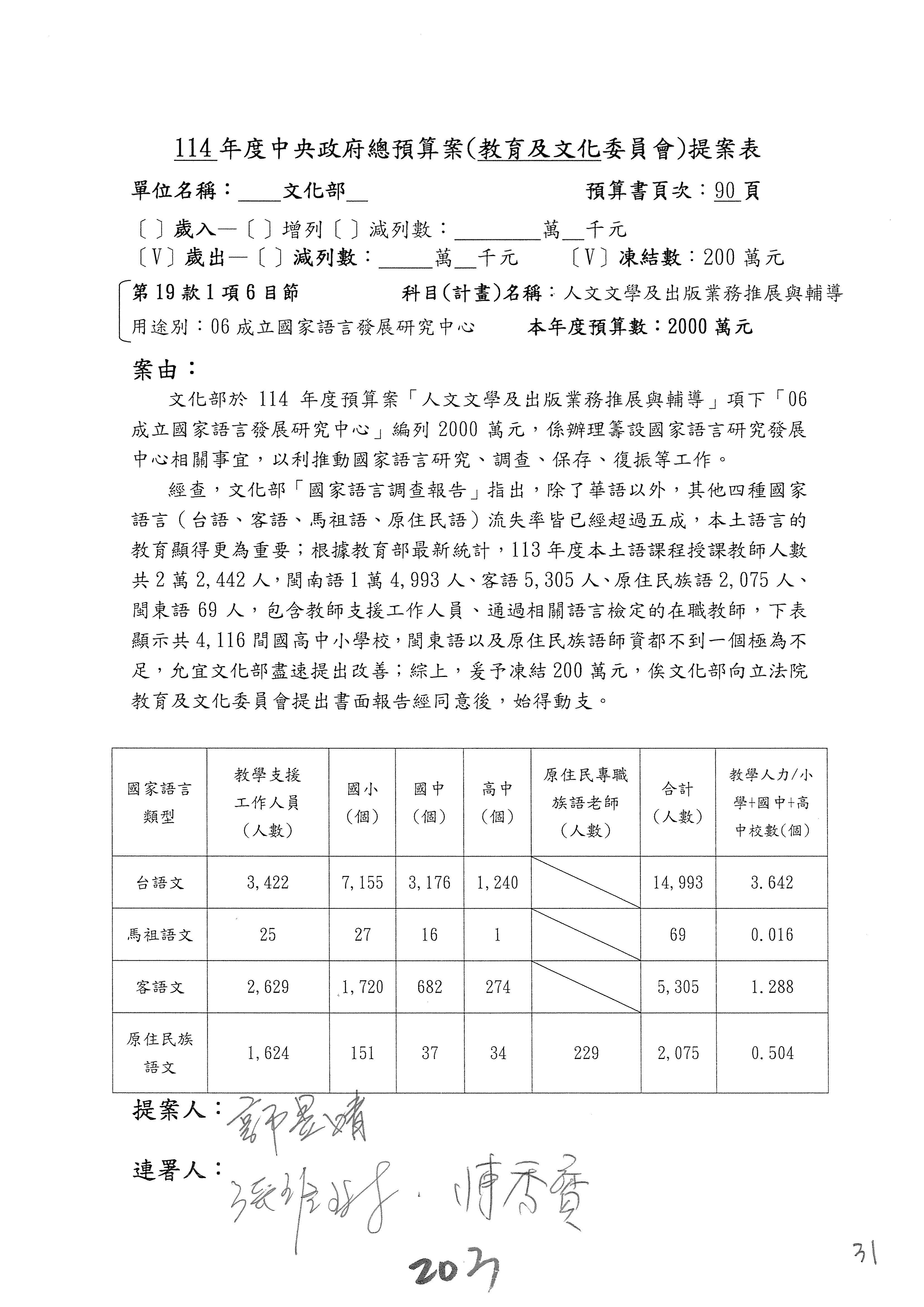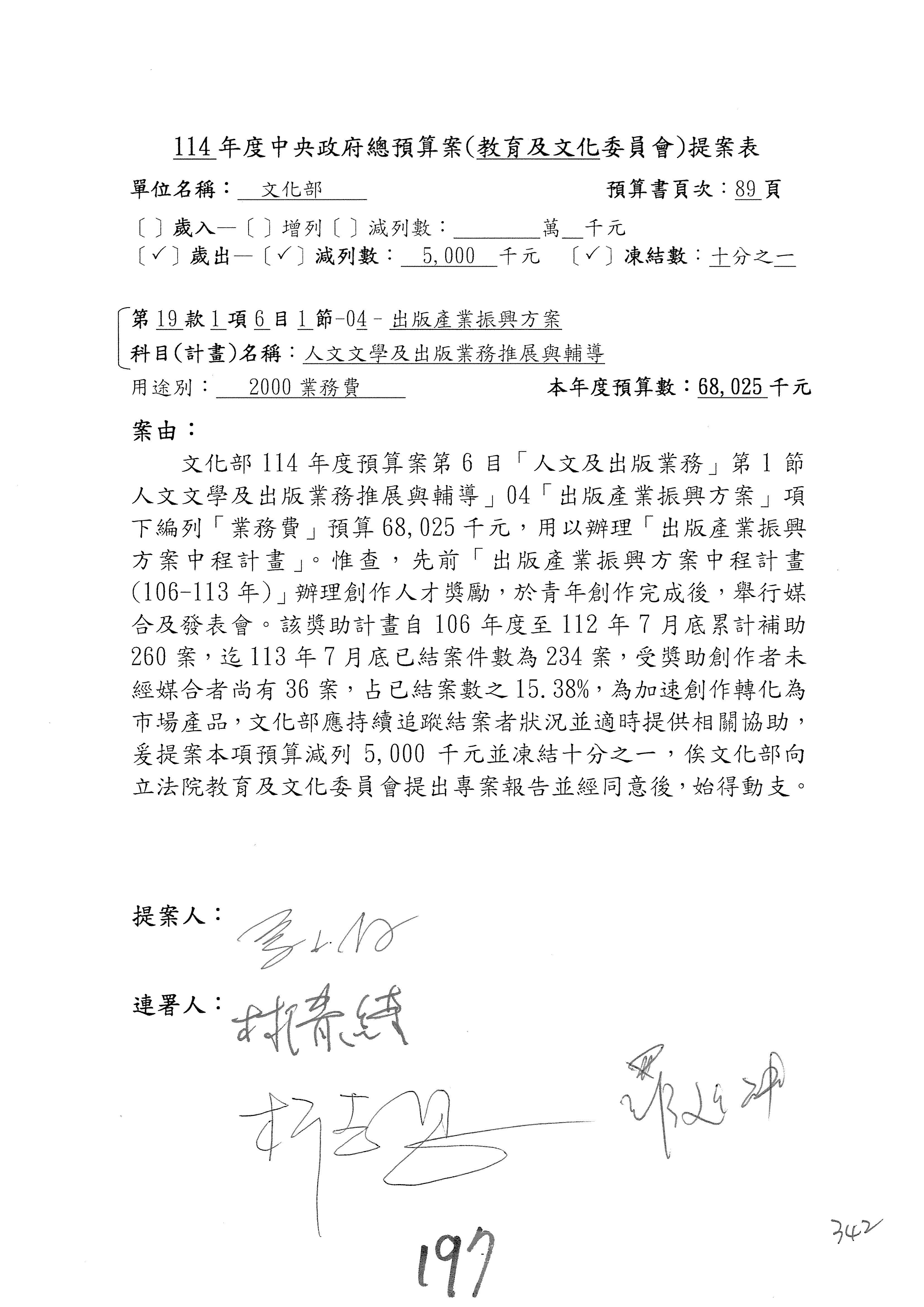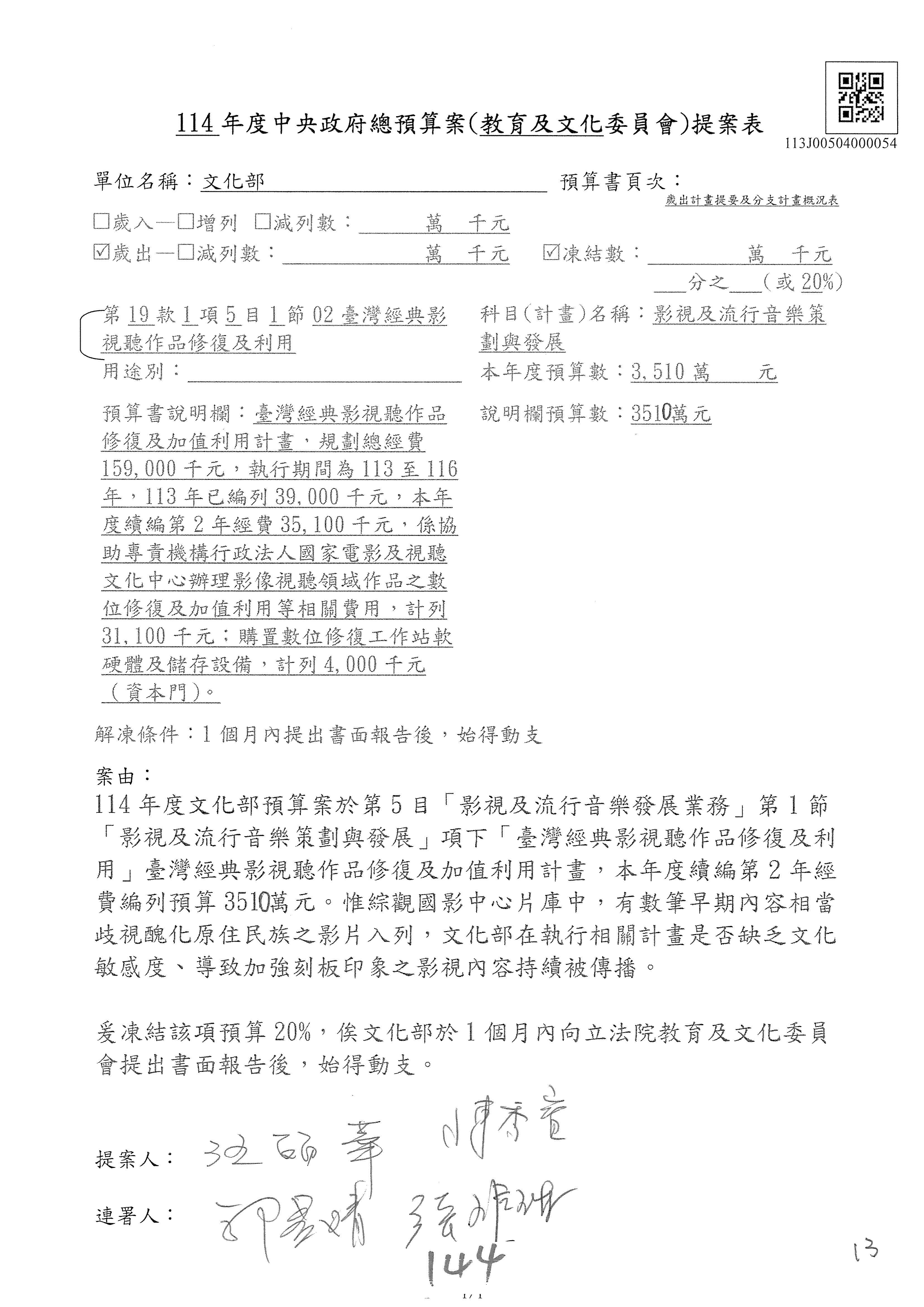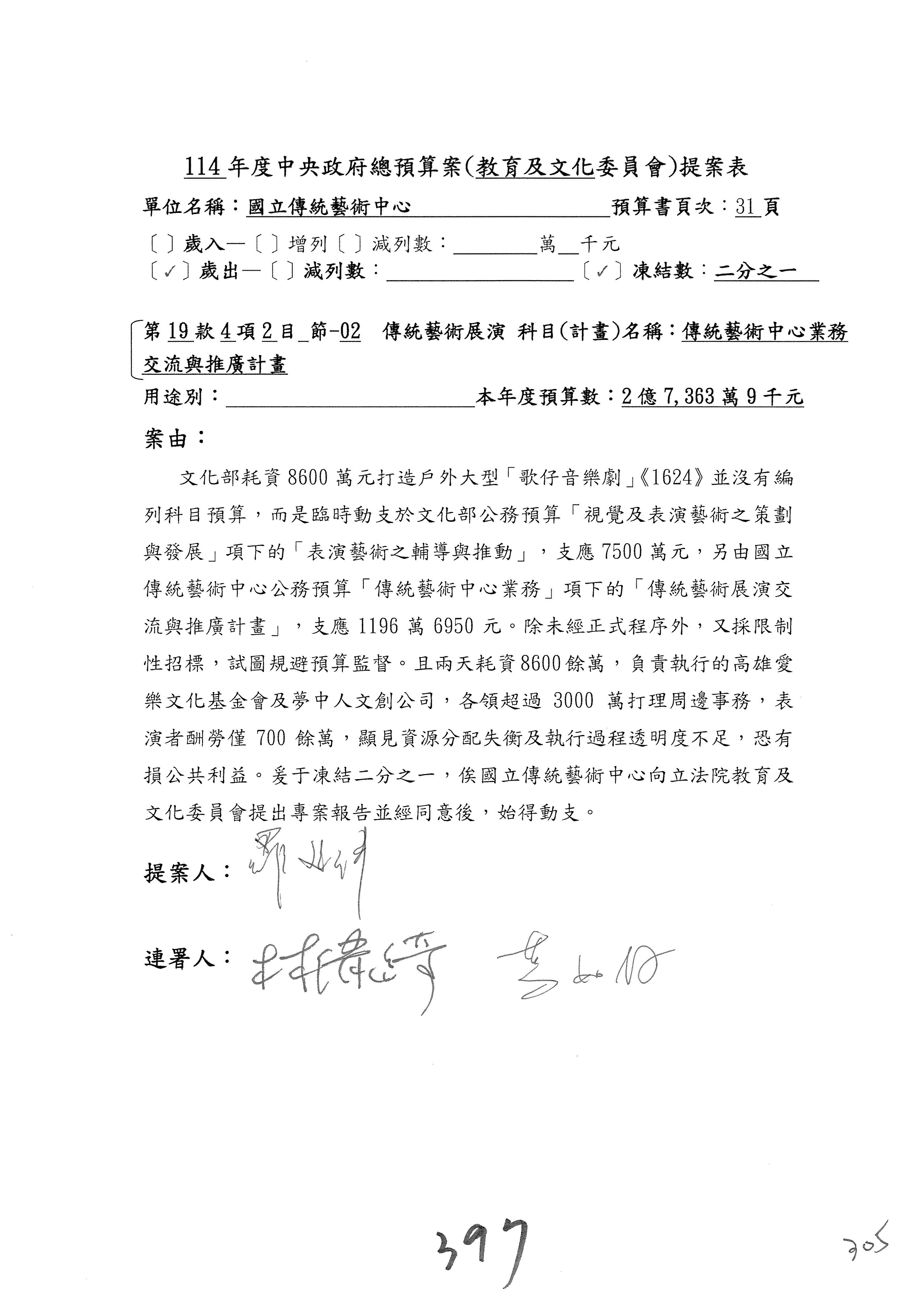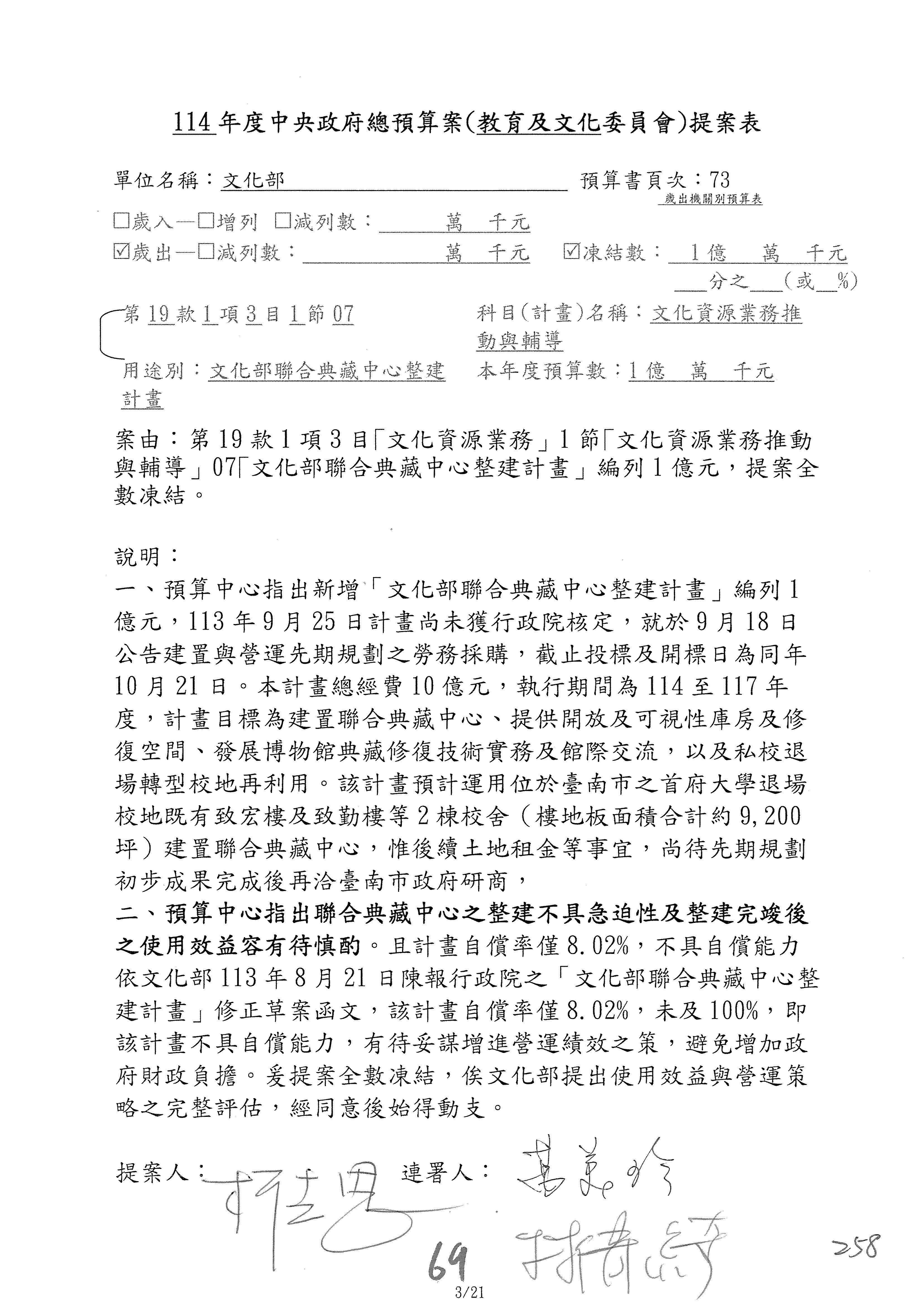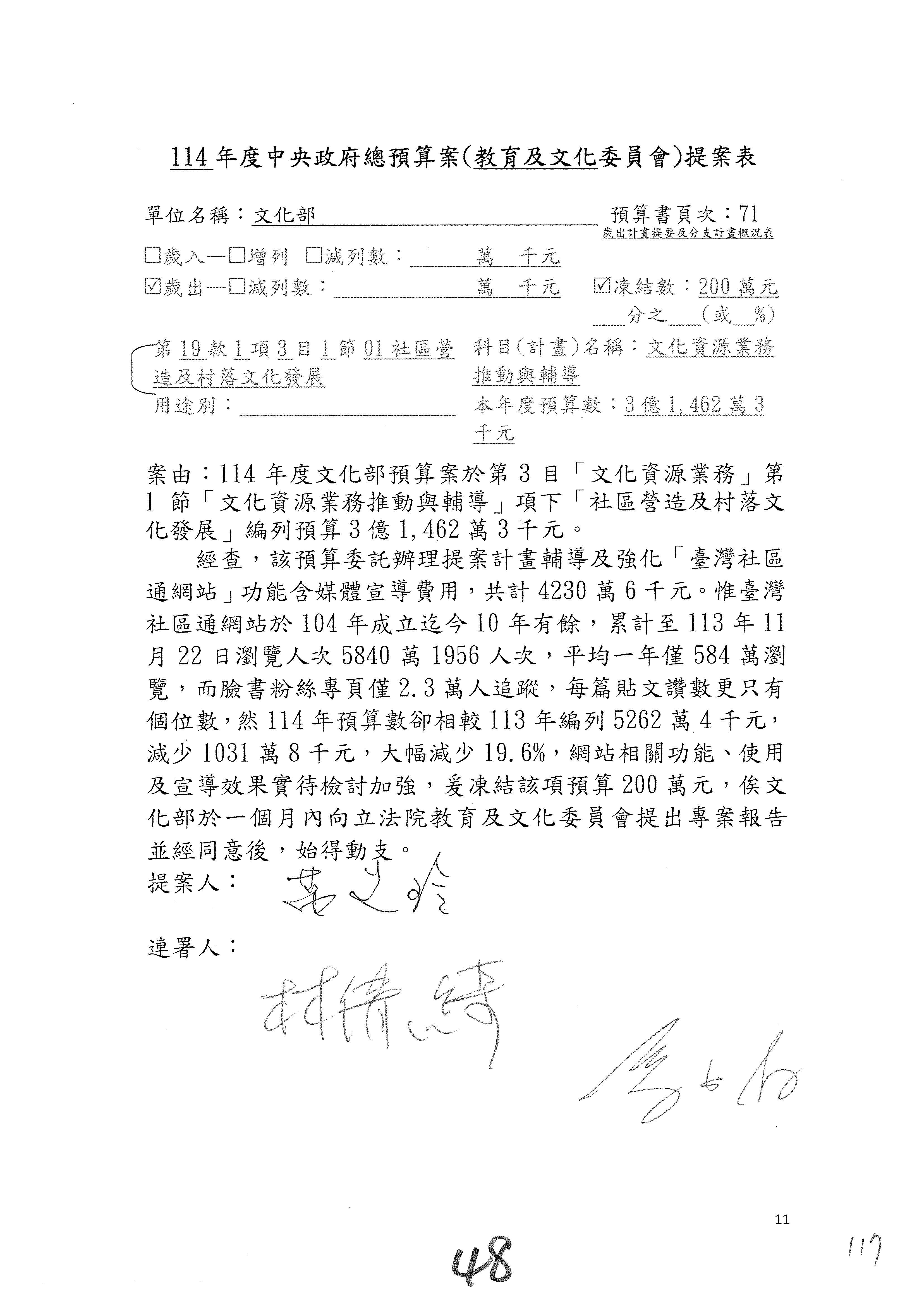 (三)114年度核能安全委員會及所屬第2目「原子能管理發展業務」第1節「原子能科學發展」預算編列27億5,477萬9千元,凍結5,000萬元,俟核能安全委員會向立法院教育及文化委員會提出書面報告後,始得動支。15-42