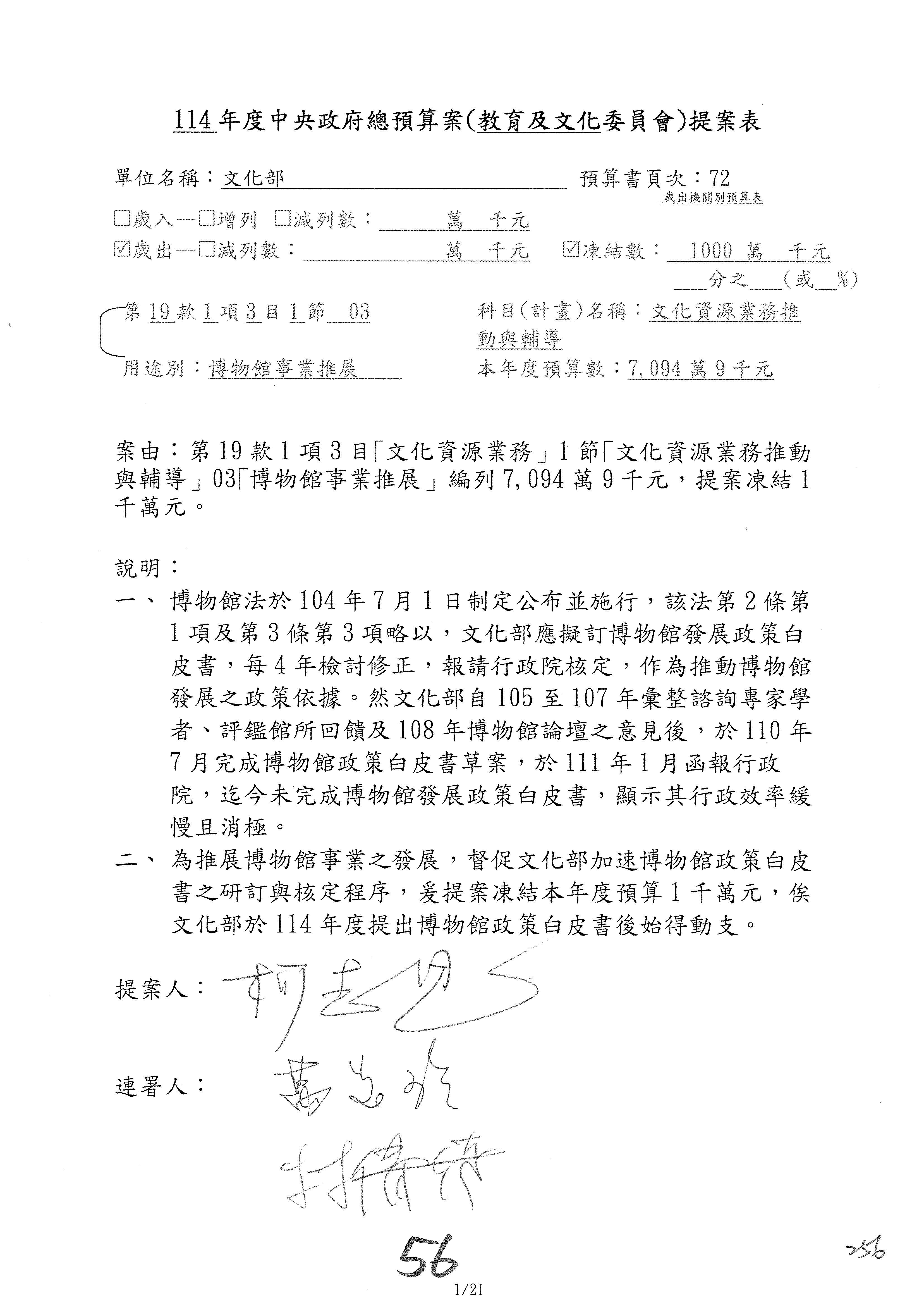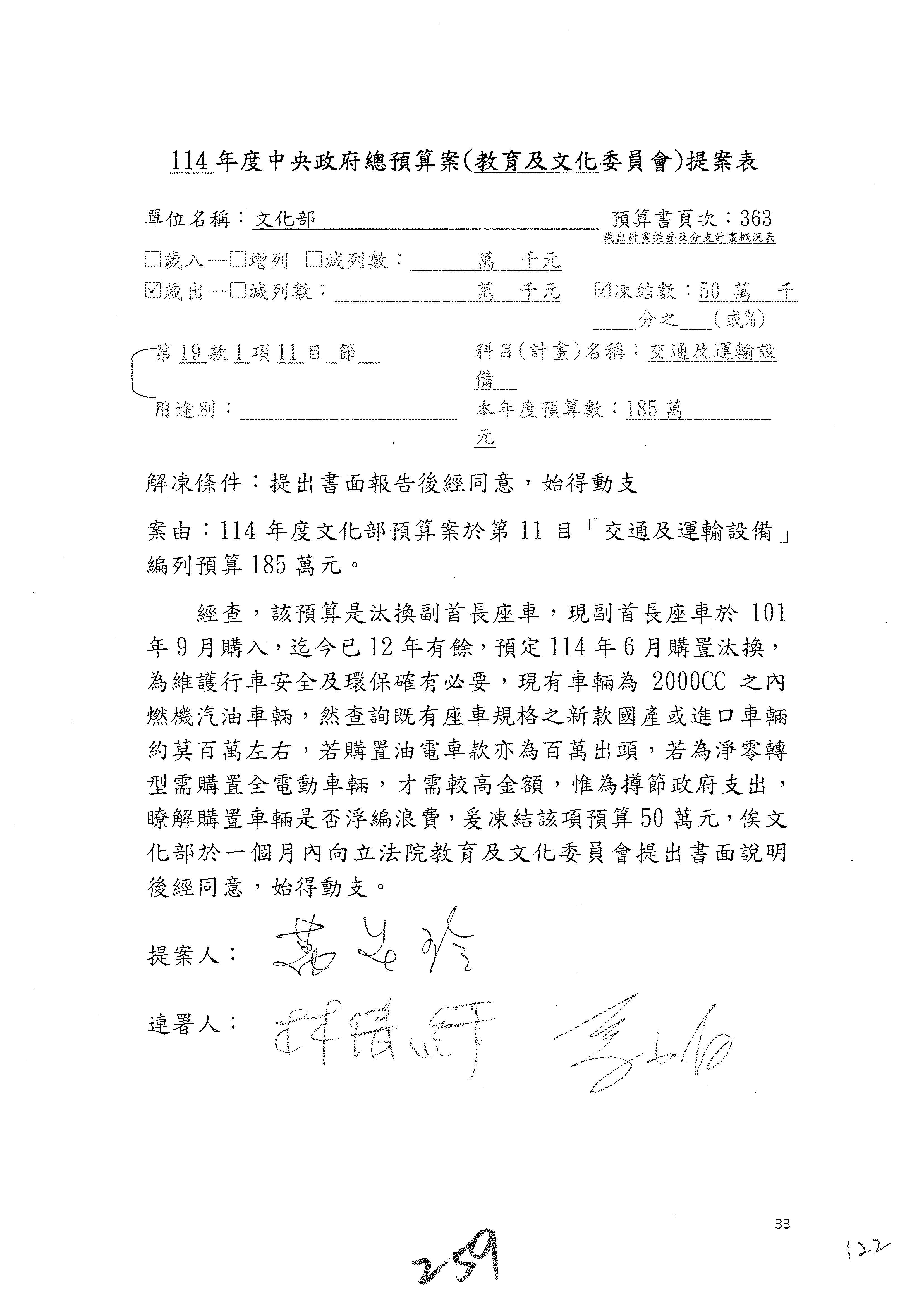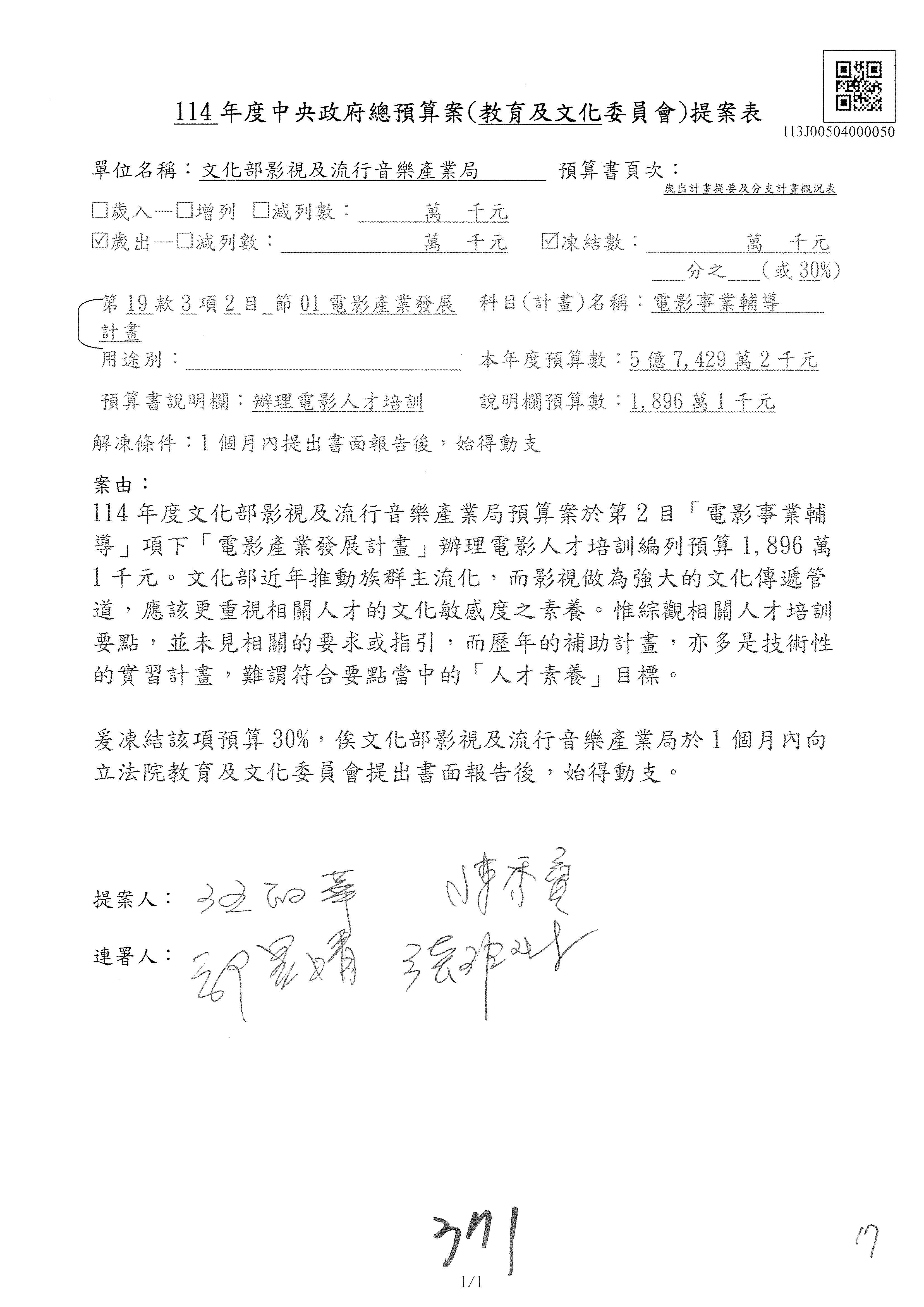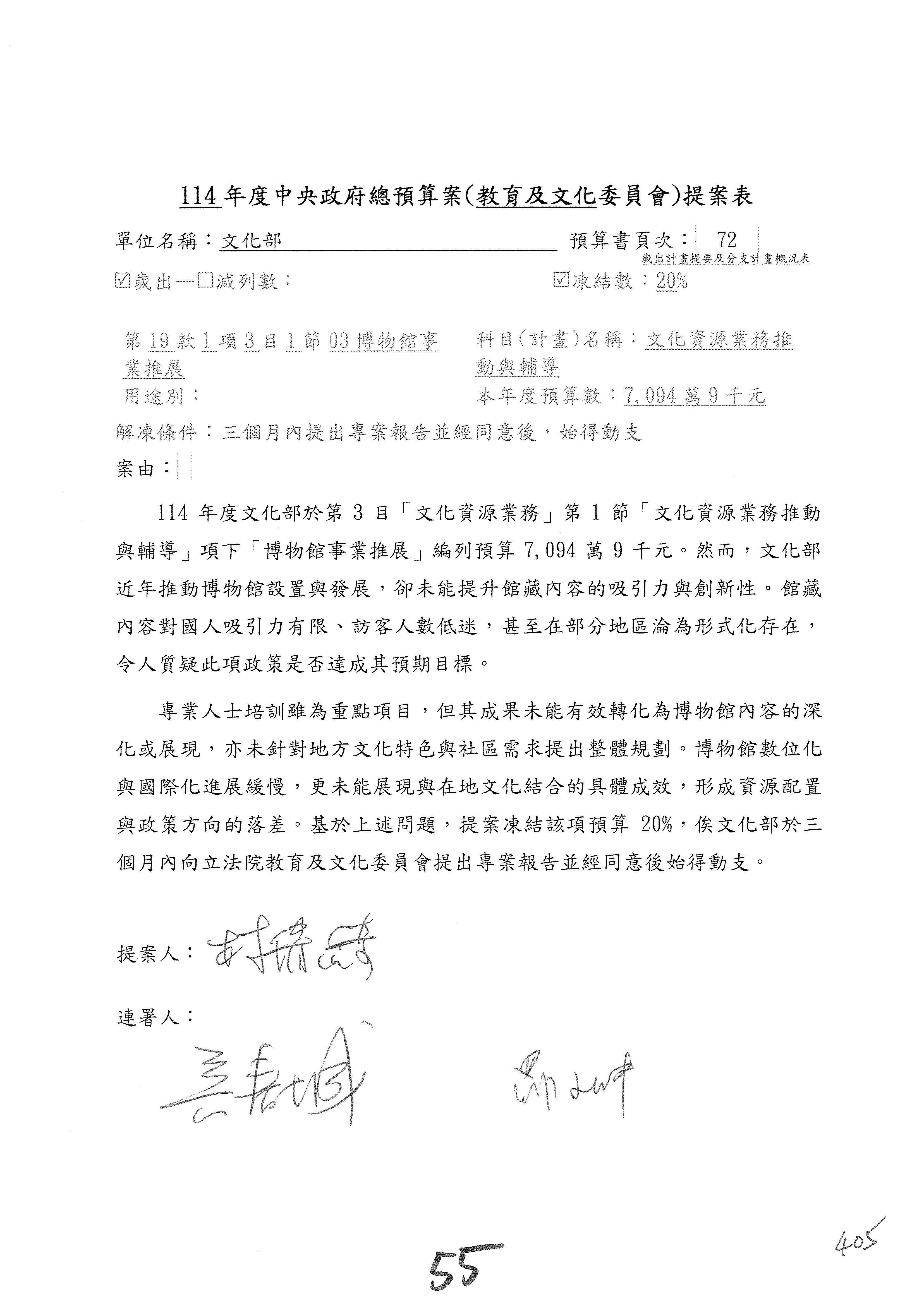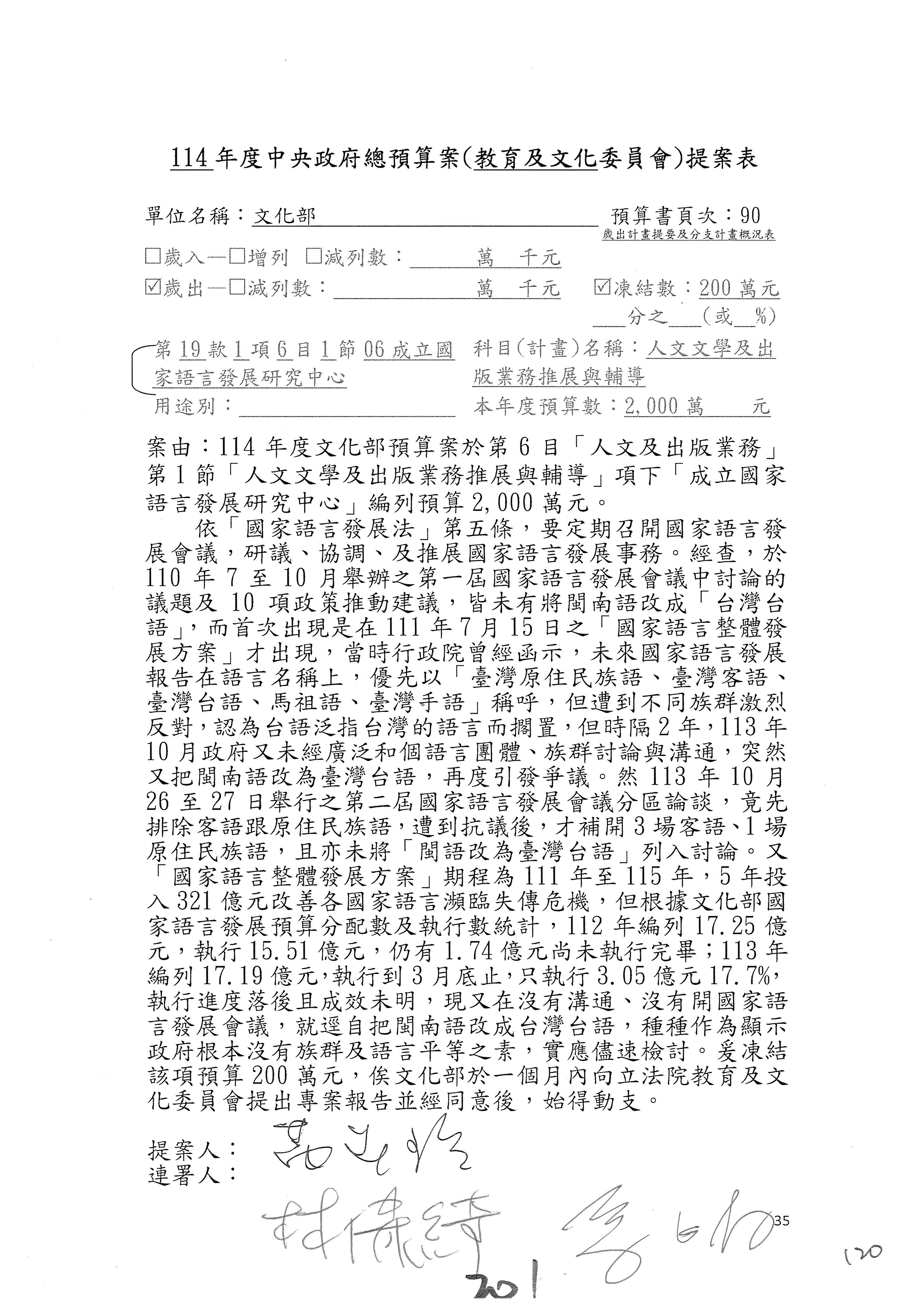 (三)114年度核能安全委員會及所屬第2目「原子能管理發展業務」第1節「原子能科學發展」預算編列27億5,477萬9千元,凍結5,000萬元,俟核能安全委員會向立法院教育及文化委員會提出書面報告後,始得動支。15-42