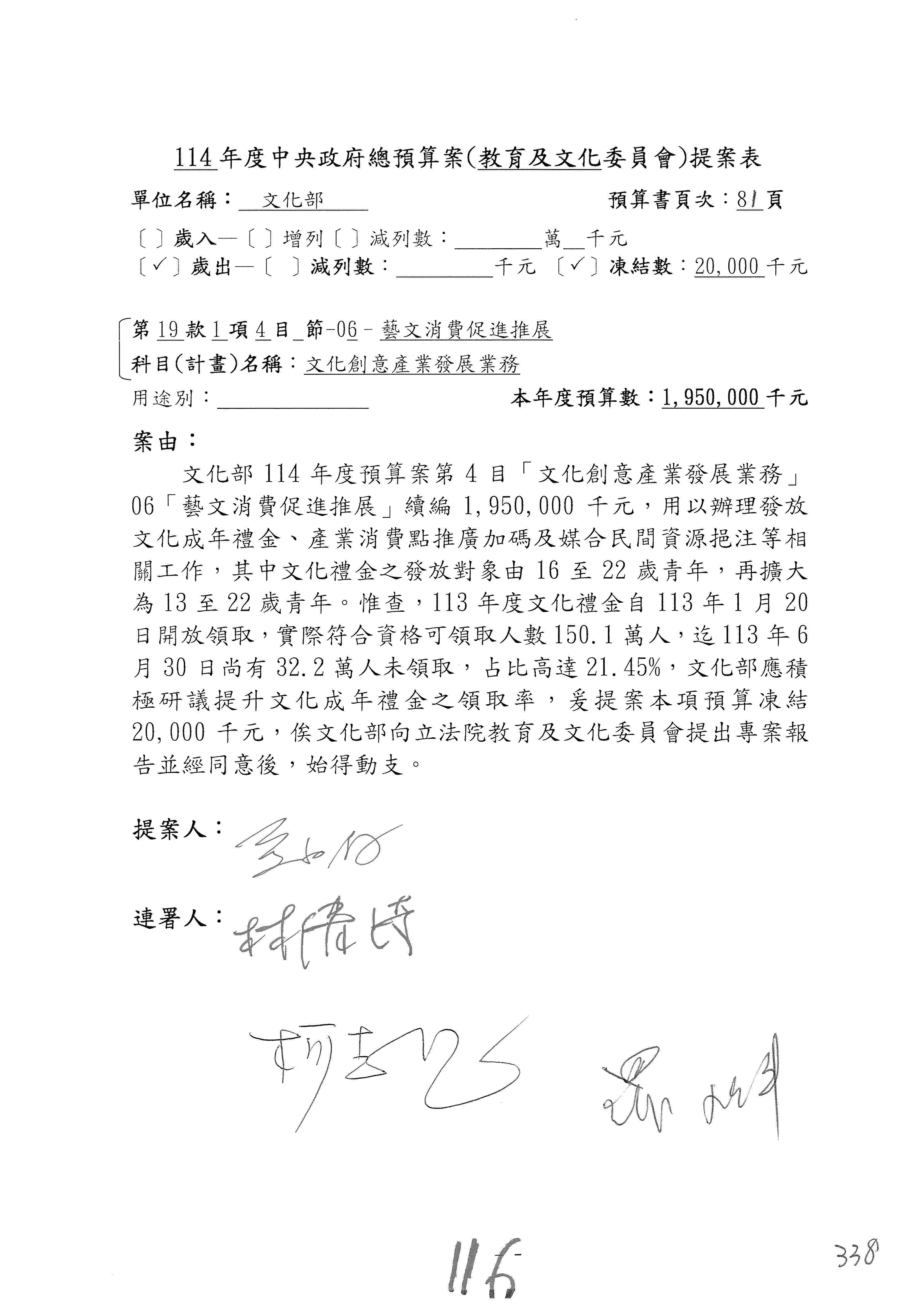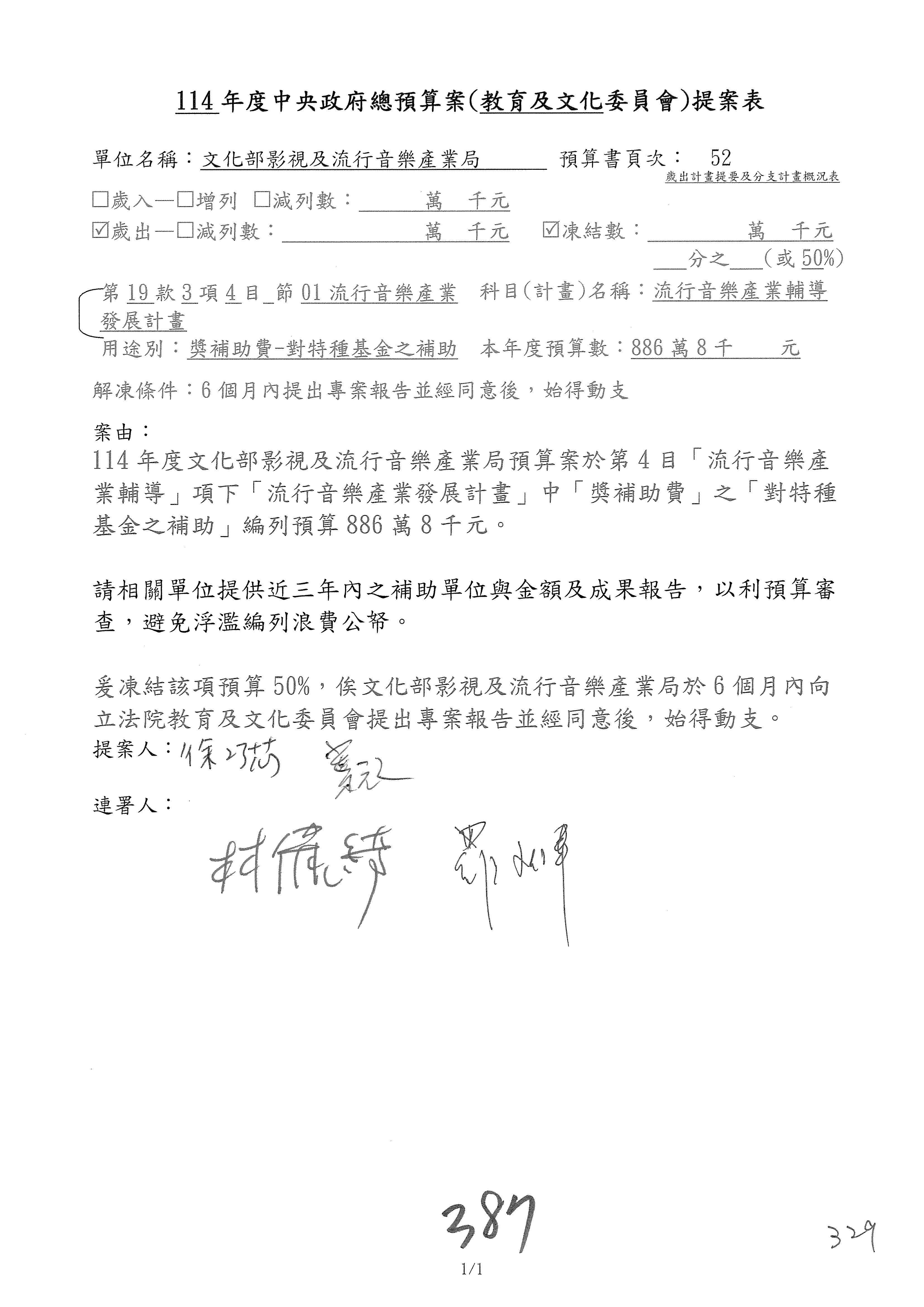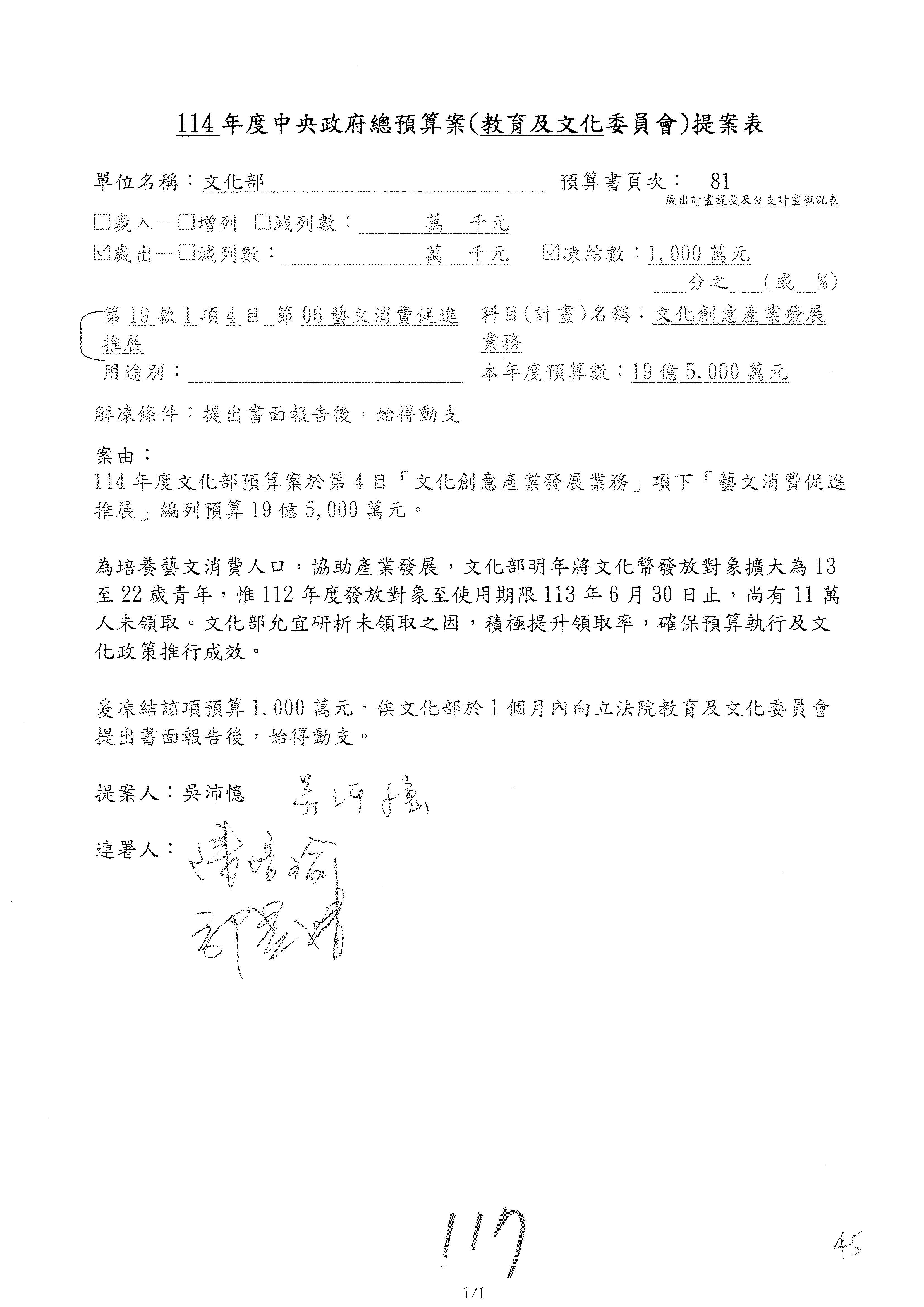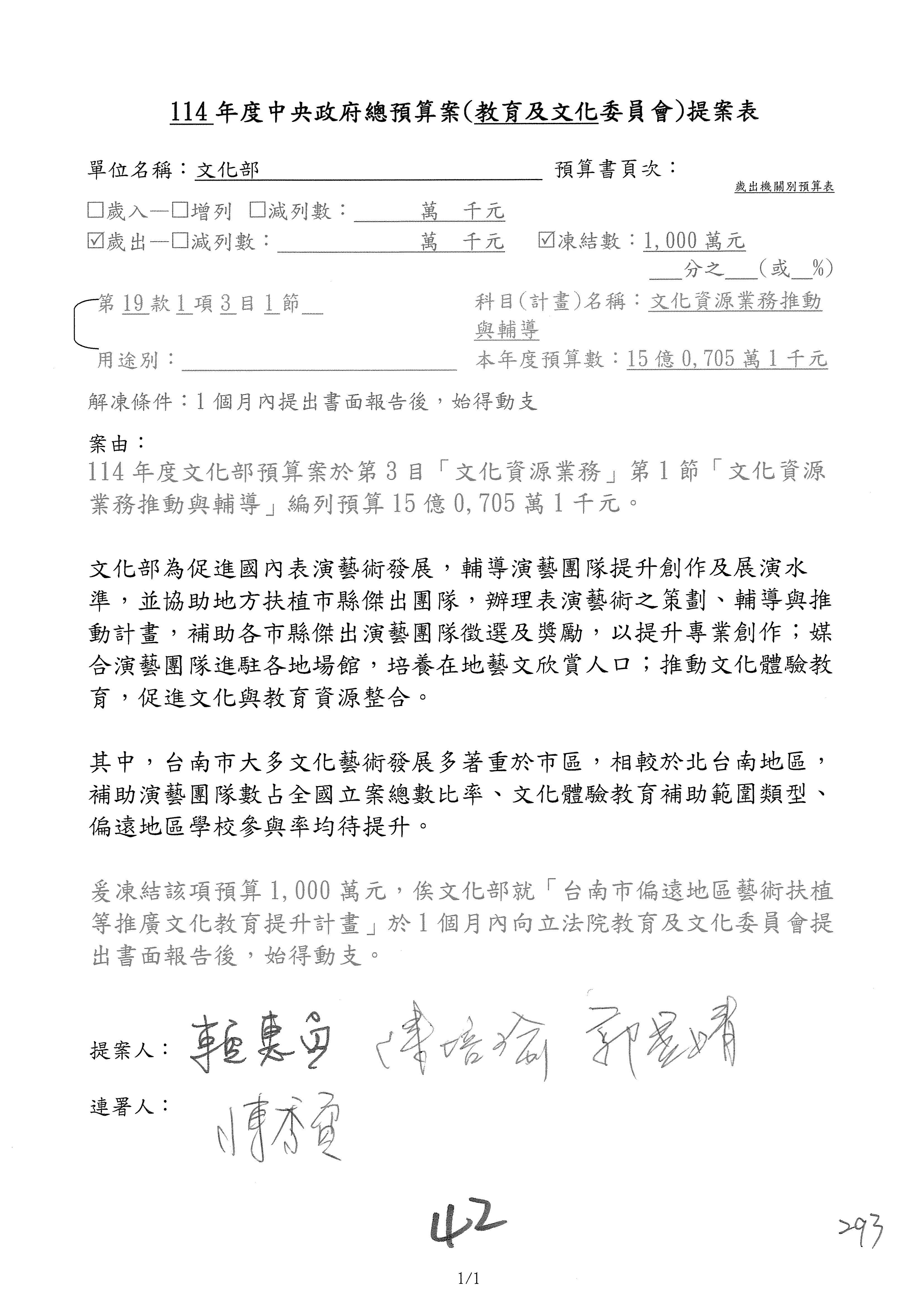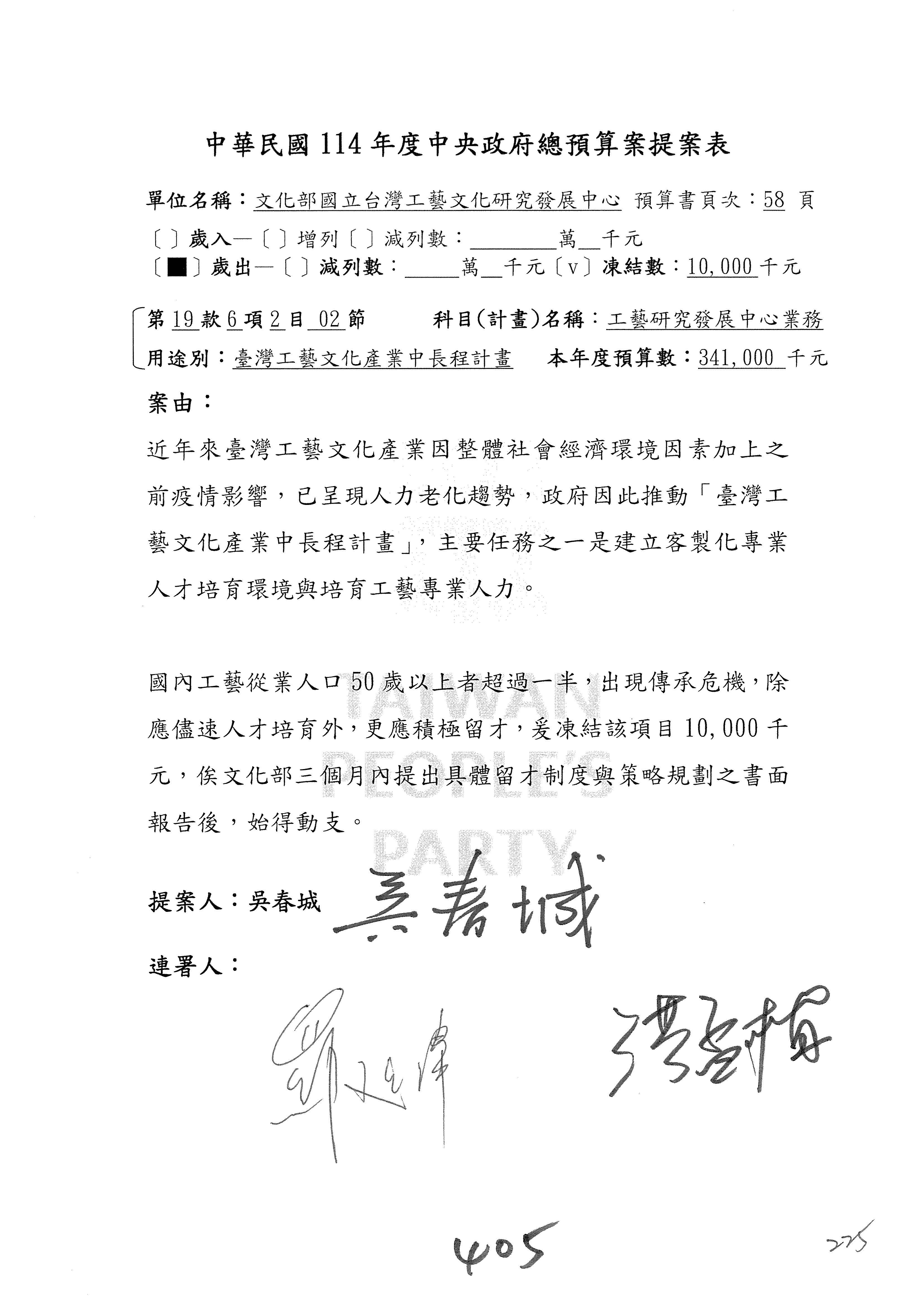 (三)114年度核能安全委員會及所屬第2目「原子能管理發展業務」第1節「原子能科學發展」預算編列27億5,477萬9千元,凍結5,000萬元,俟核能安全委員會向立法院教育及文化委員會提出書面報告後,始得動支。15-42