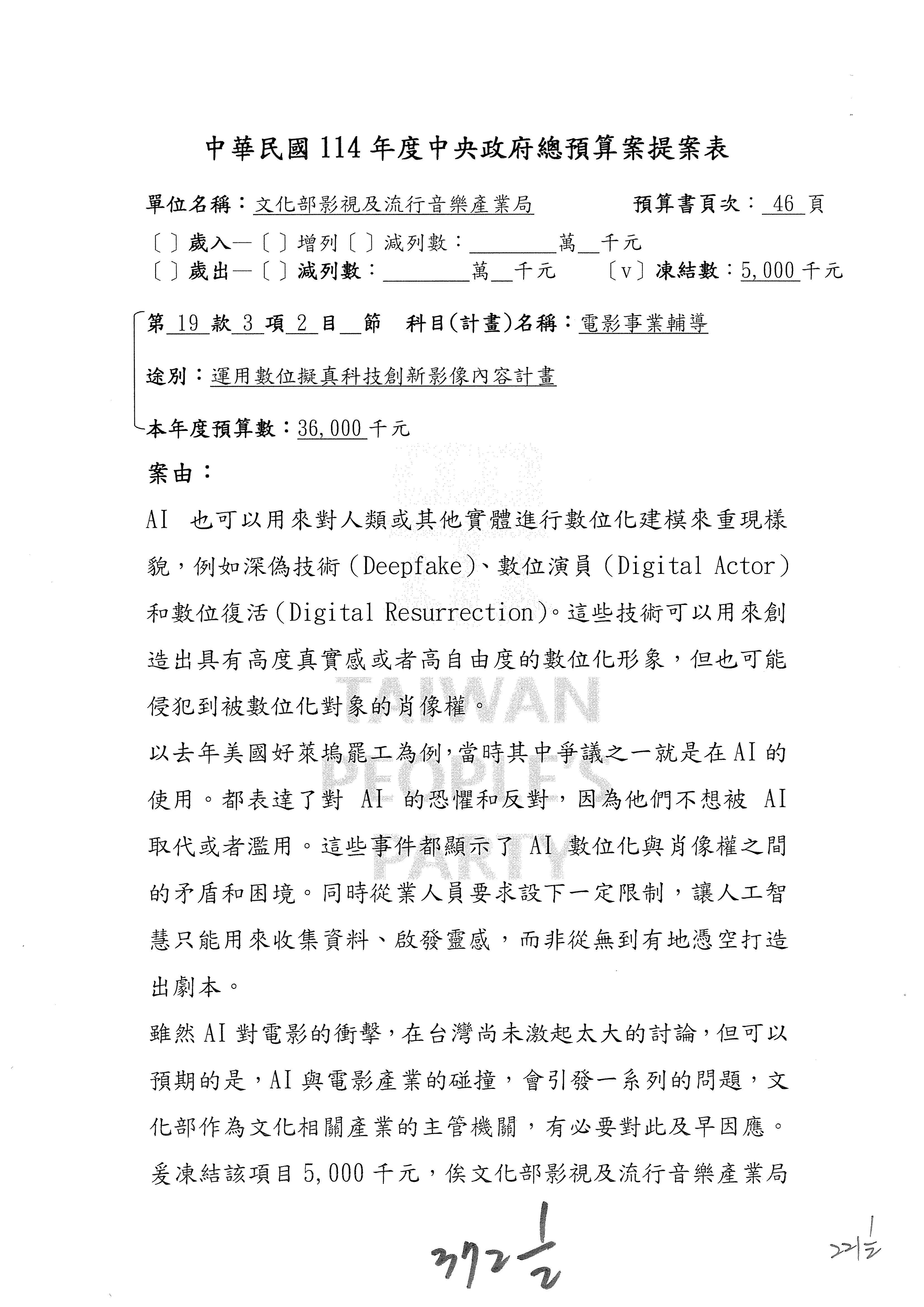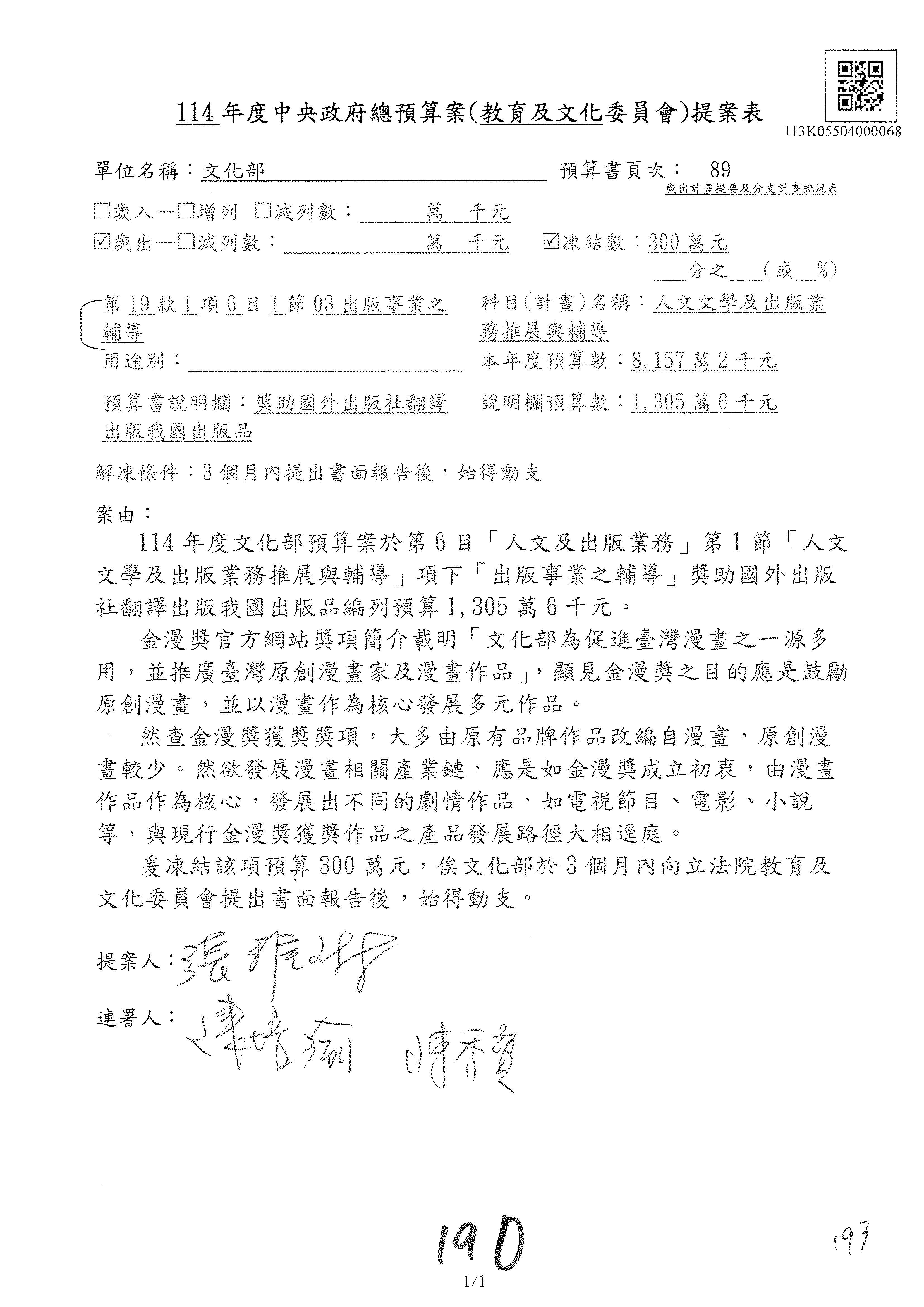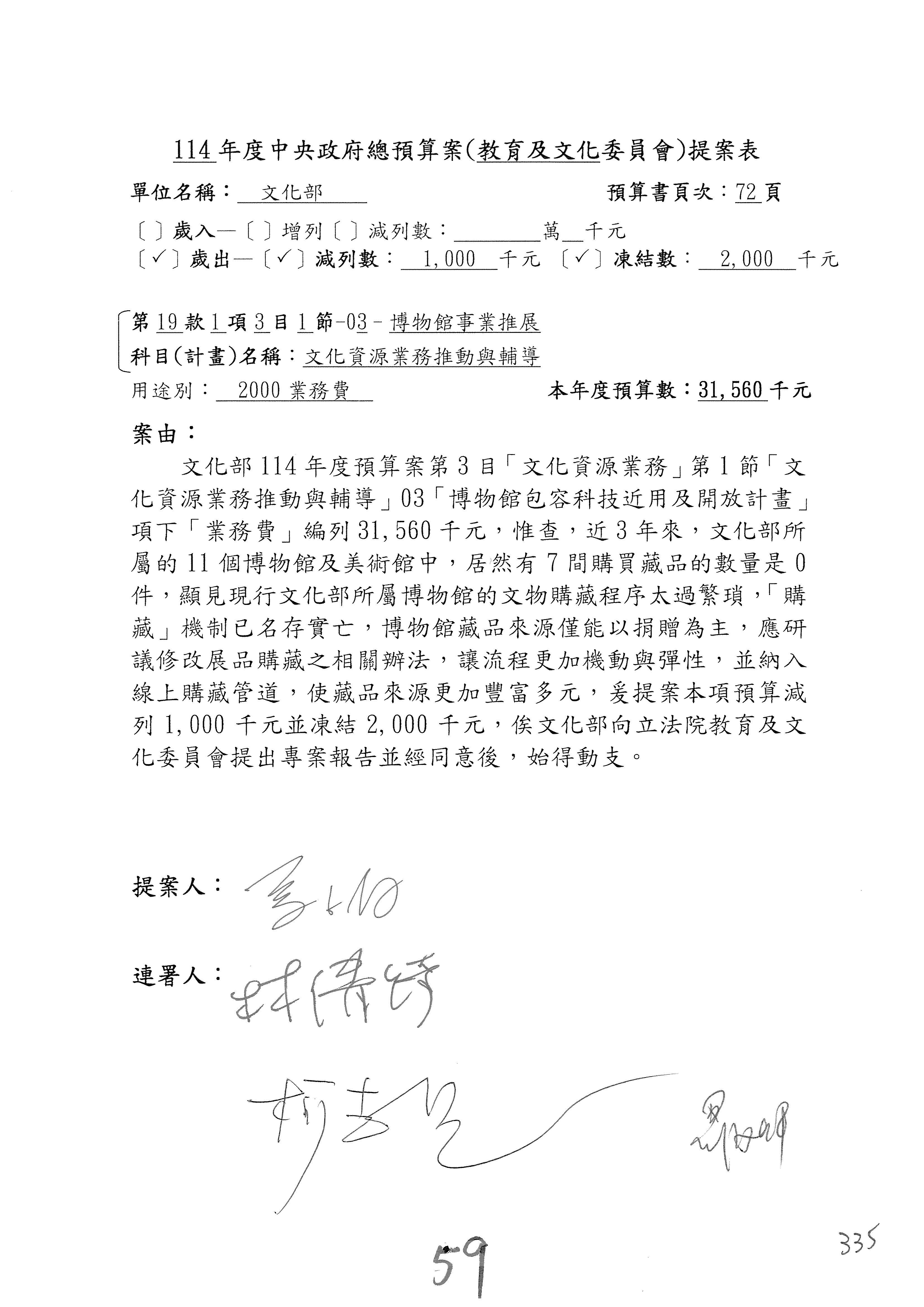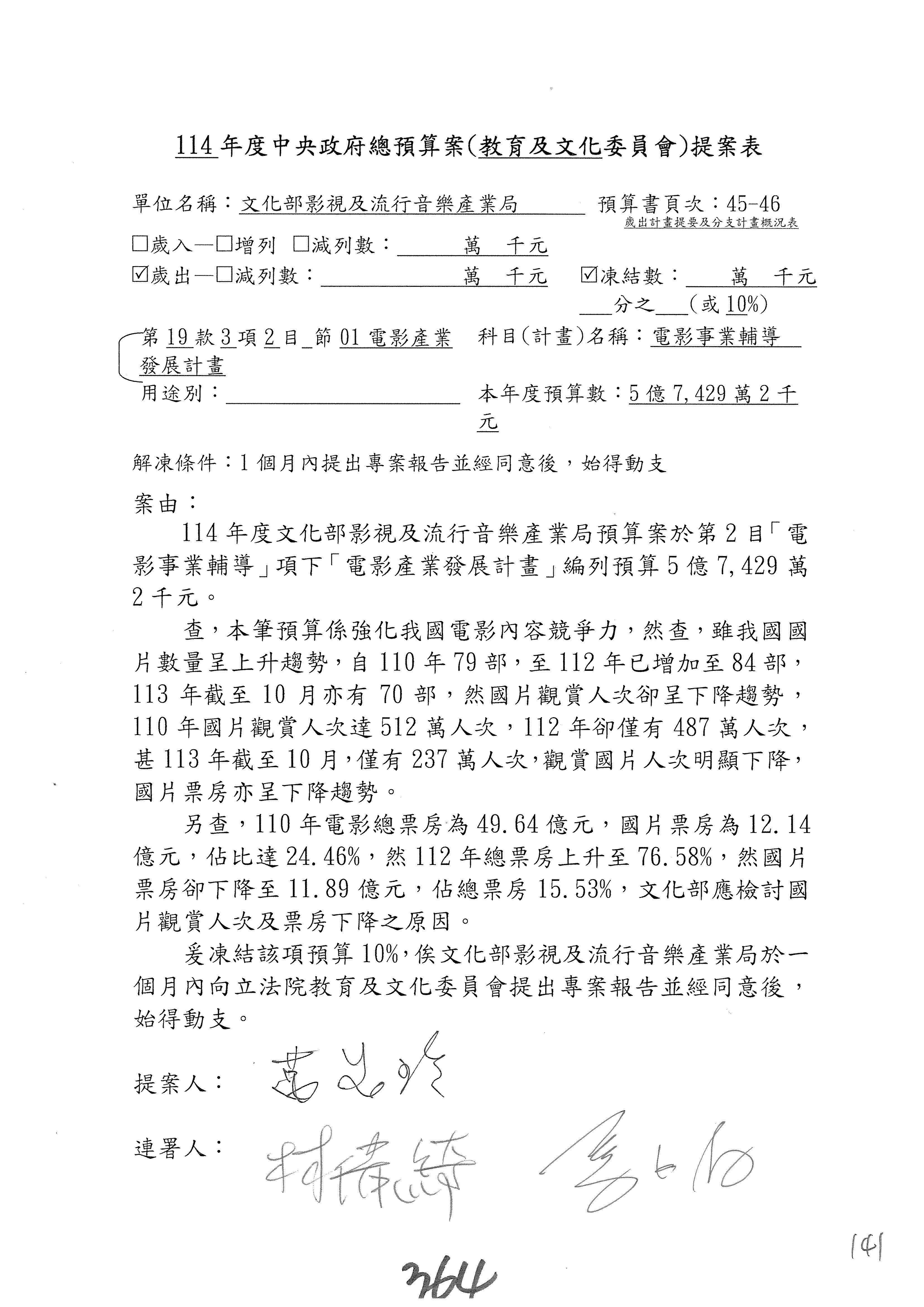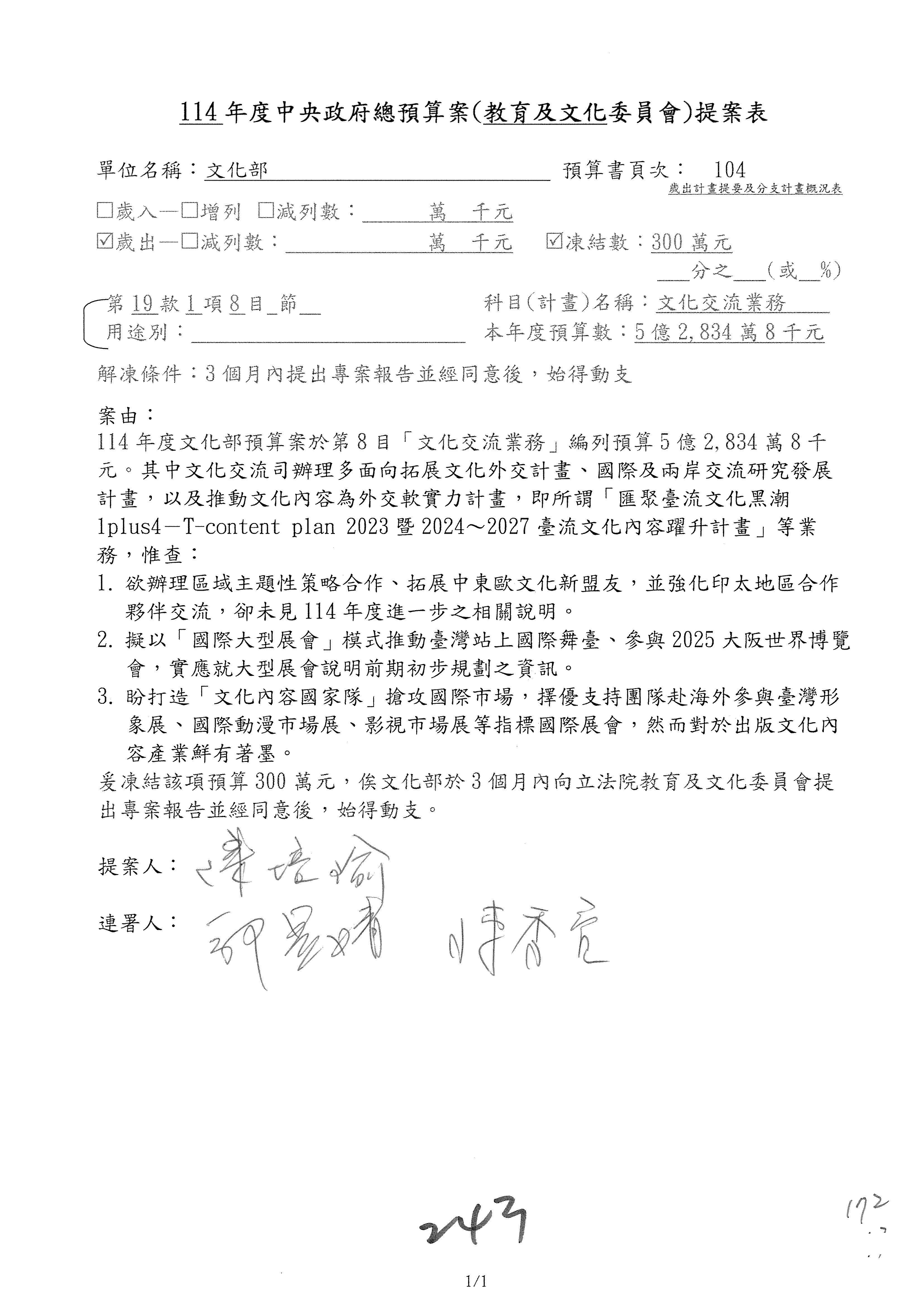 (三)114年度核能安全委員會及所屬第2目「原子能管理發展業務」第1節「原子能科學發展」預算編列27億5,477萬9千元,凍結5,000萬元,俟核能安全委員會向立法院教育及文化委員會提出書面報告後,始得動支。15-42