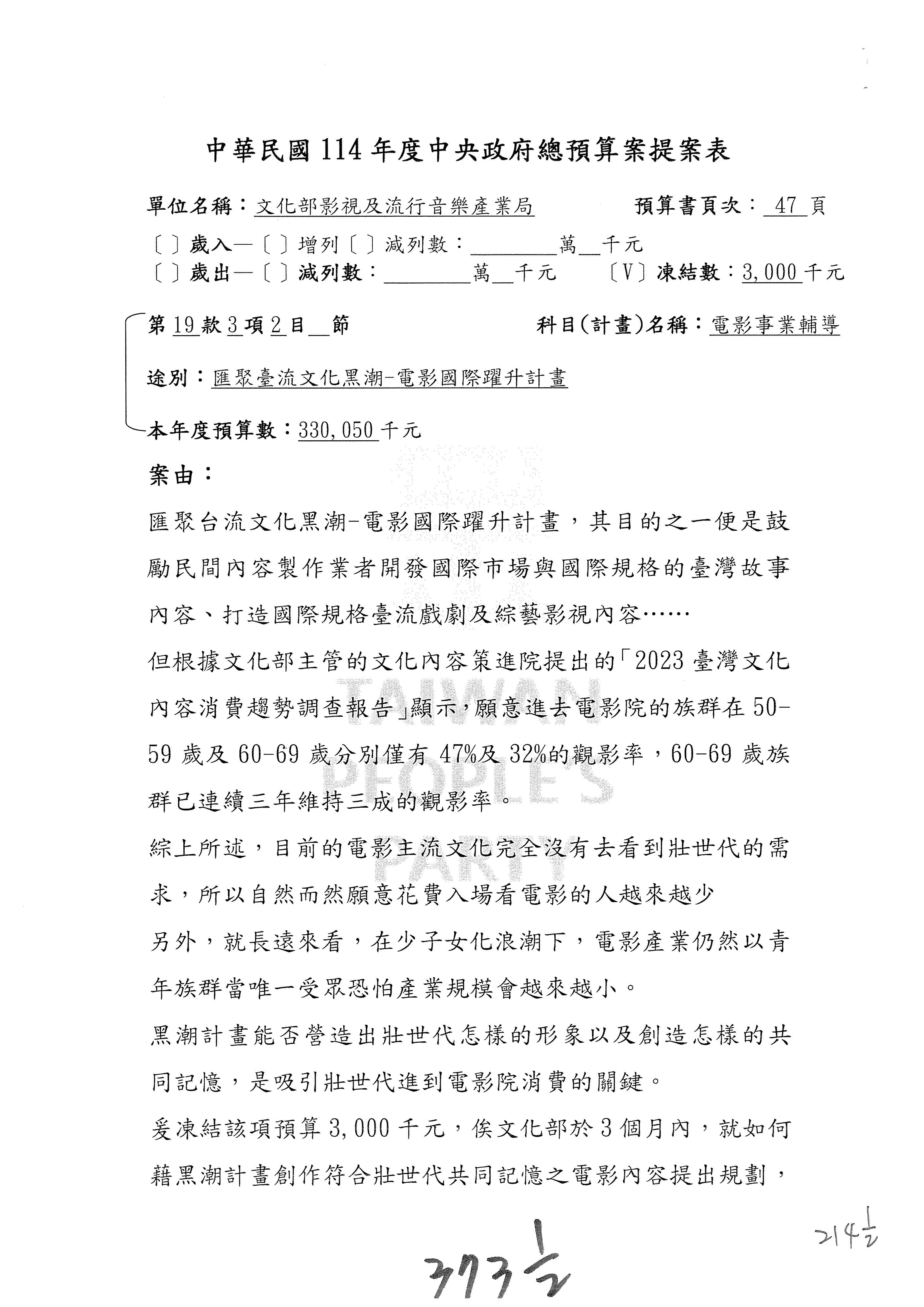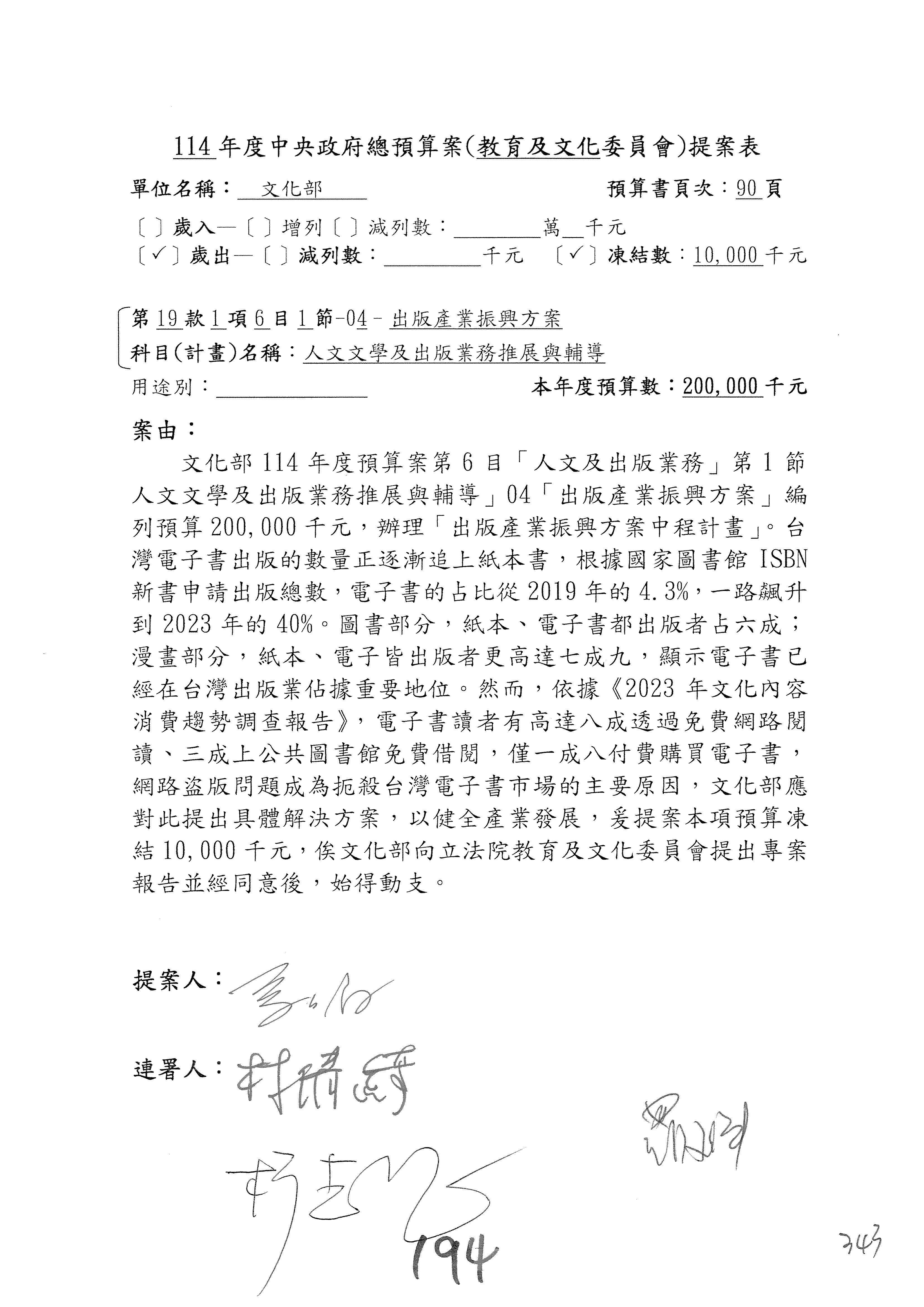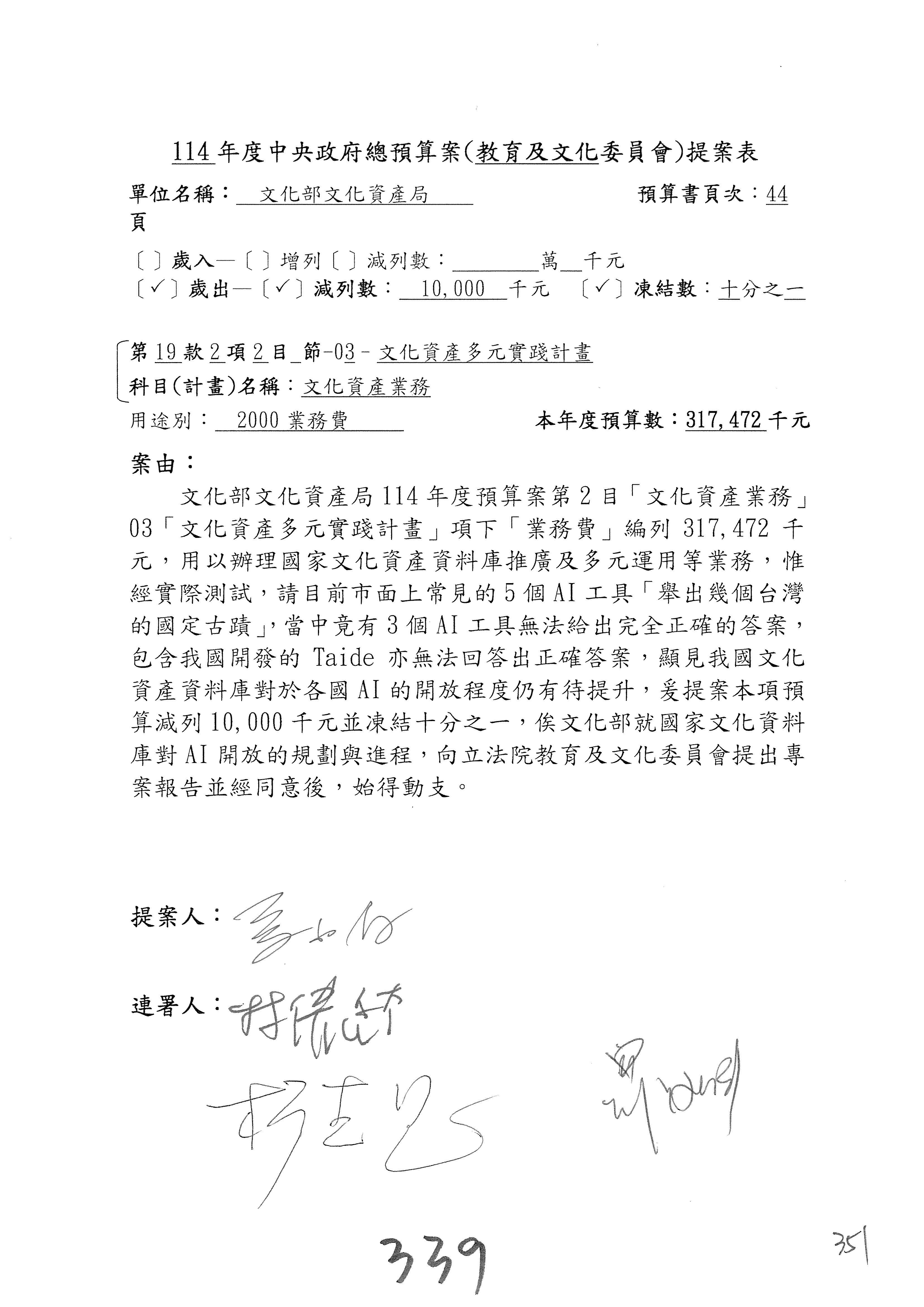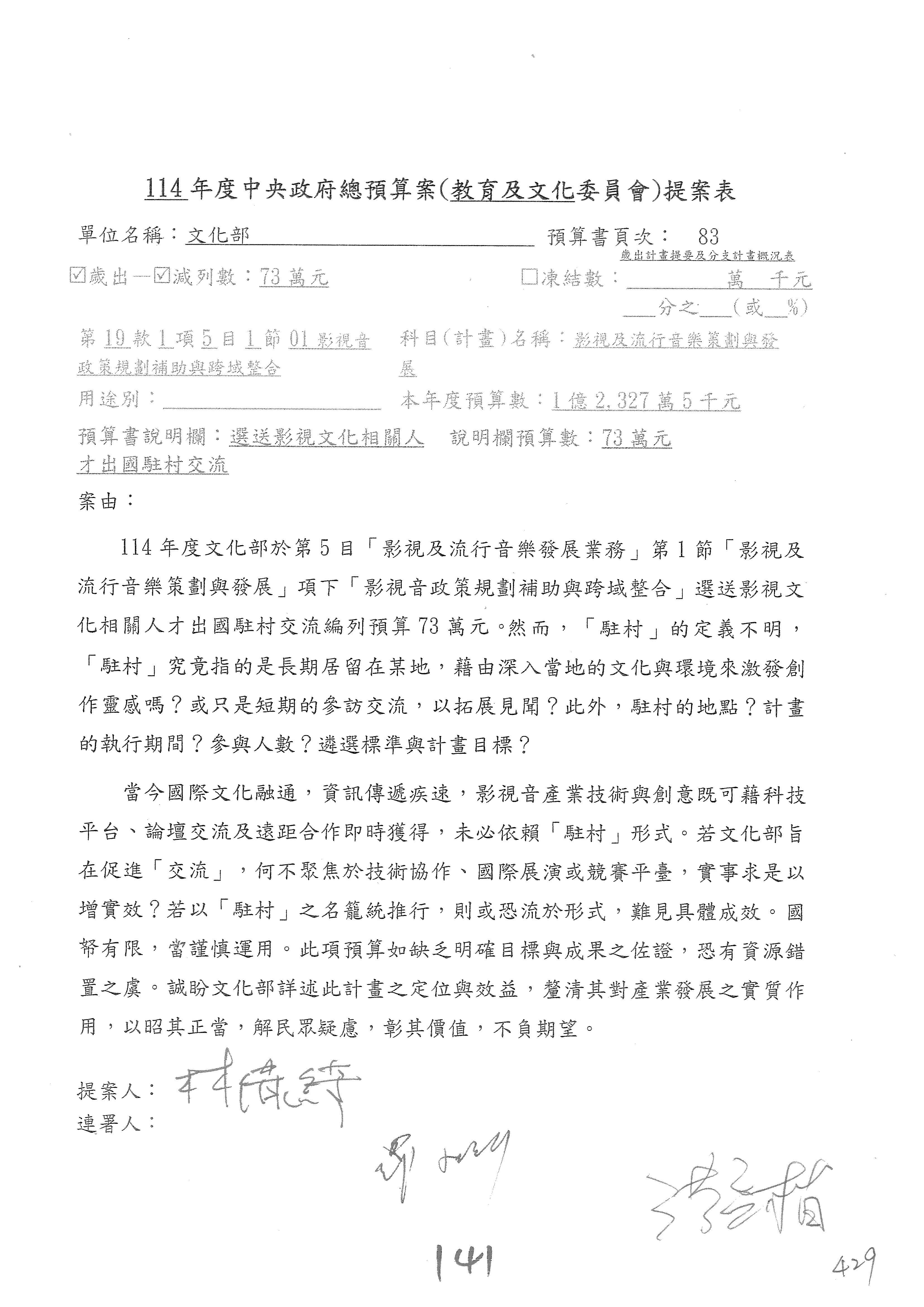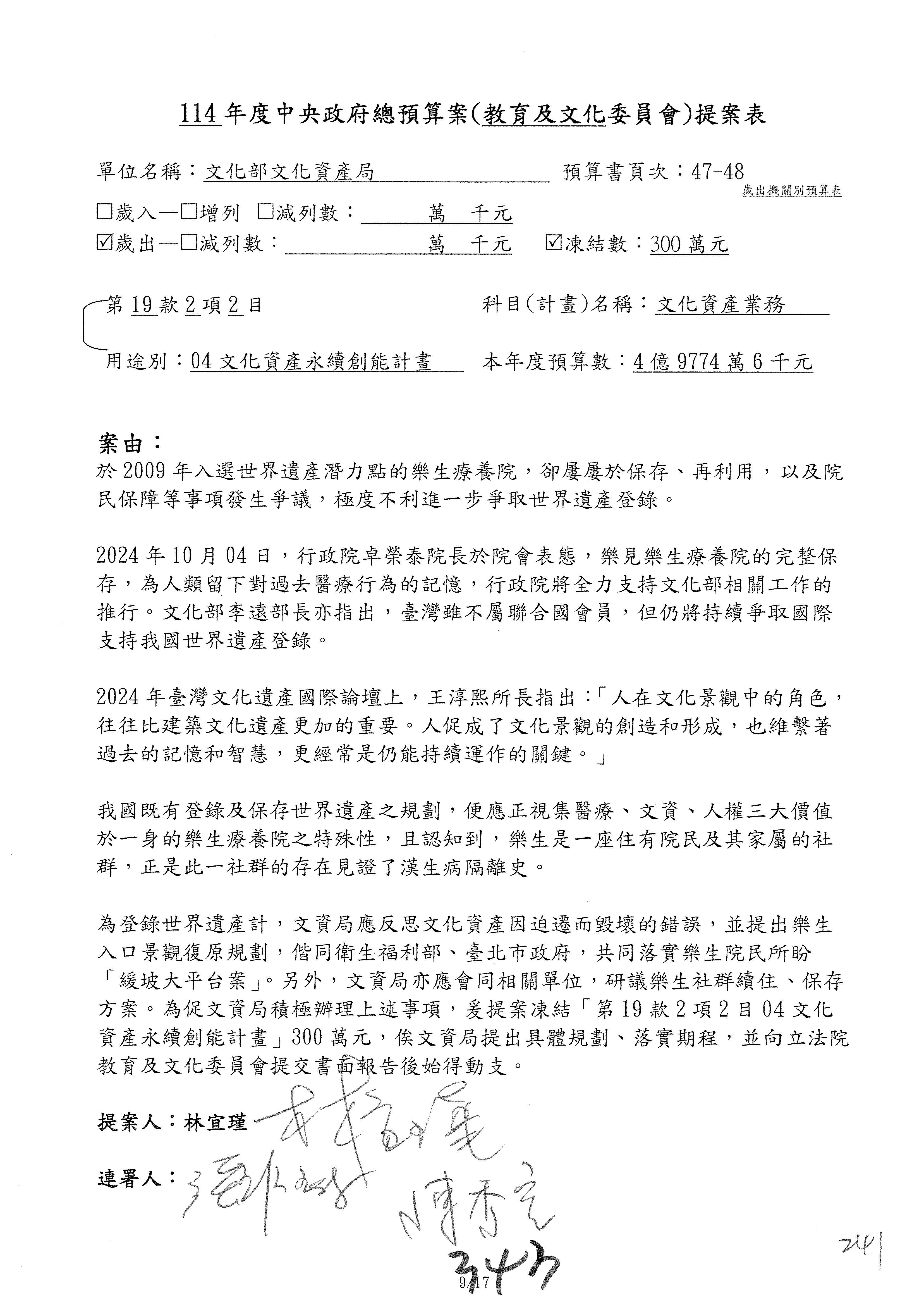 (三)114年度核能安全委員會及所屬第2目「原子能管理發展業務」第1節「原子能科學發展」預算編列27億5,477萬9千元,凍結5,000萬元,俟核能安全委員會向立法院教育及文化委員會提出書面報告後,始得動支。15-42