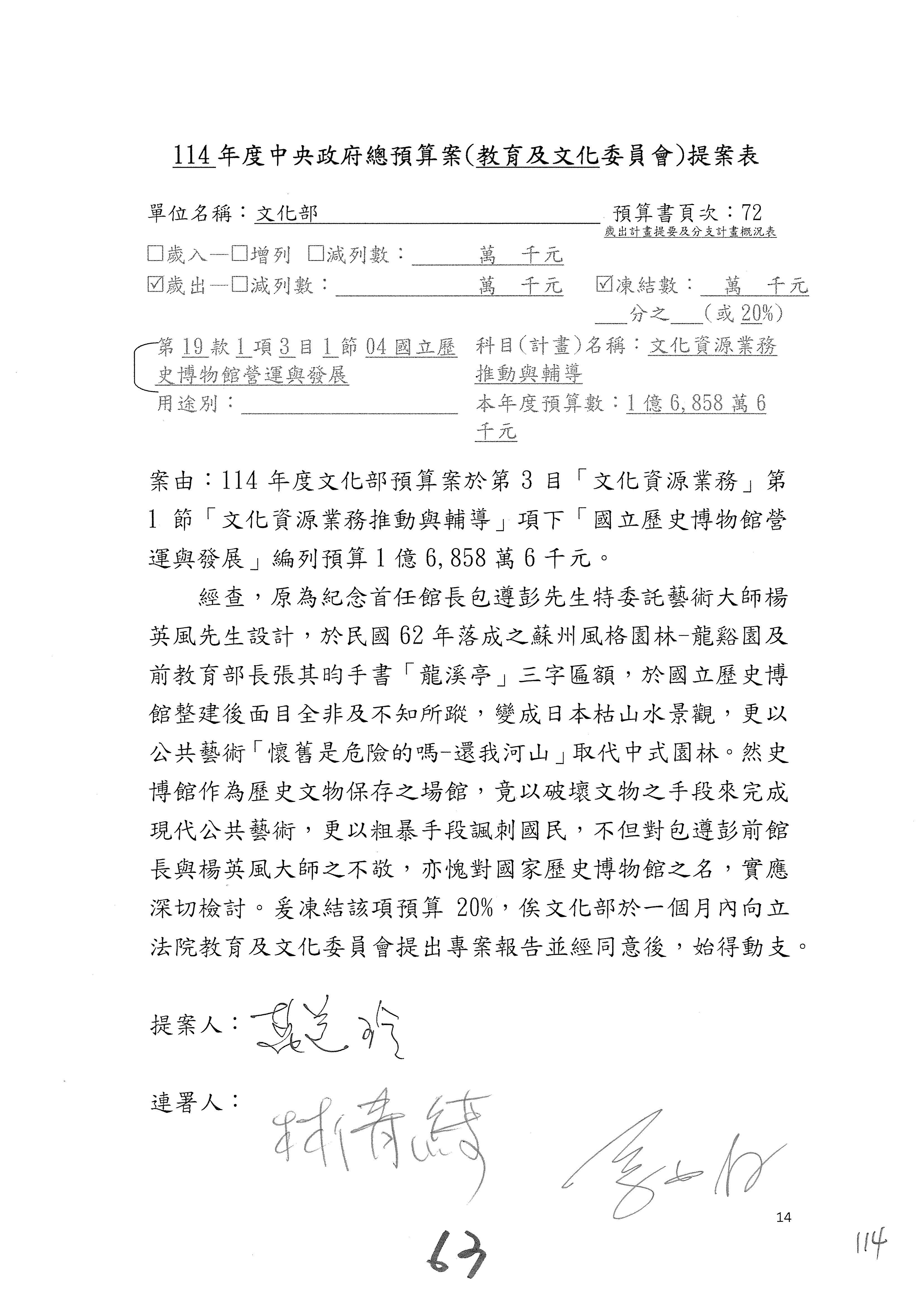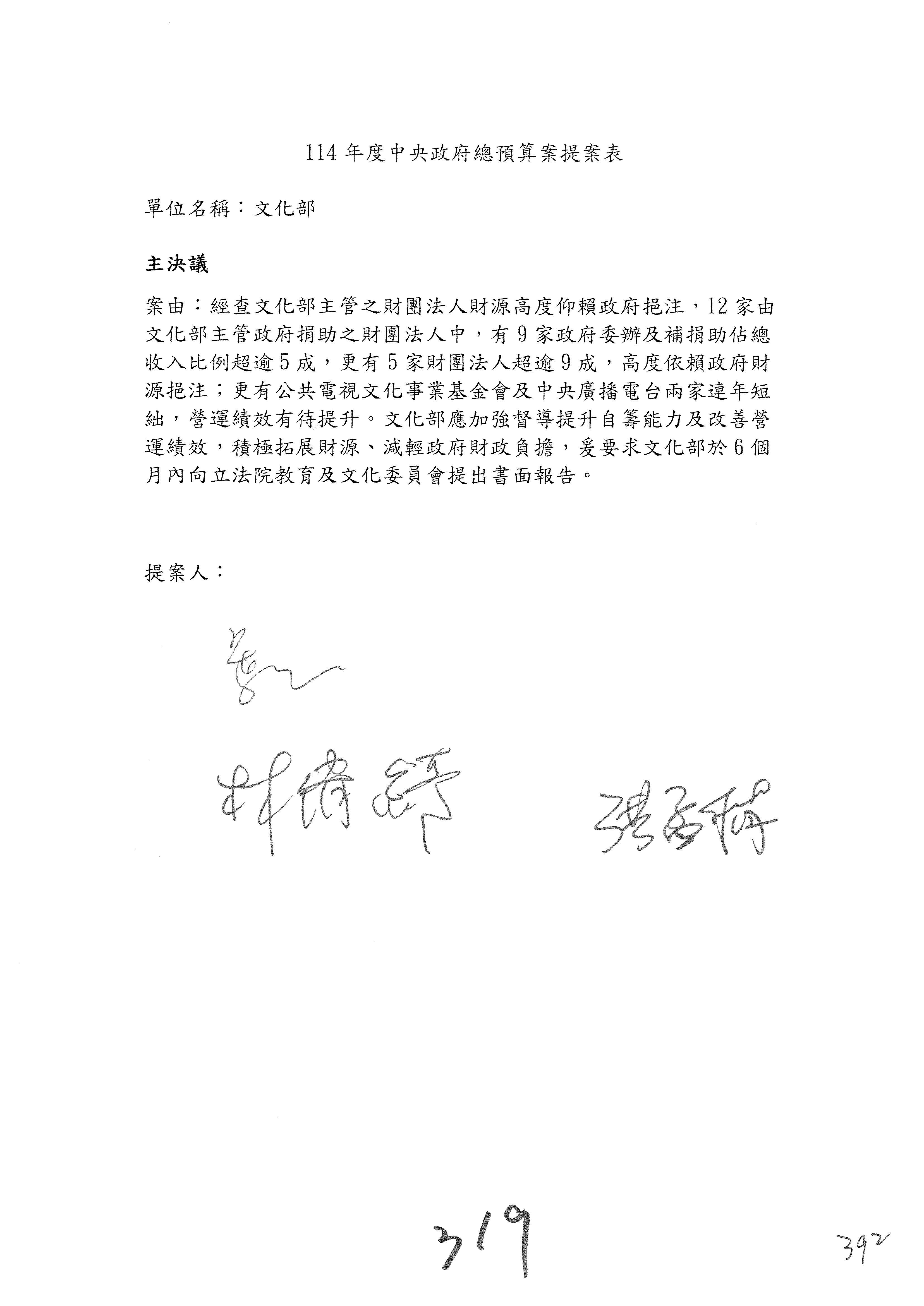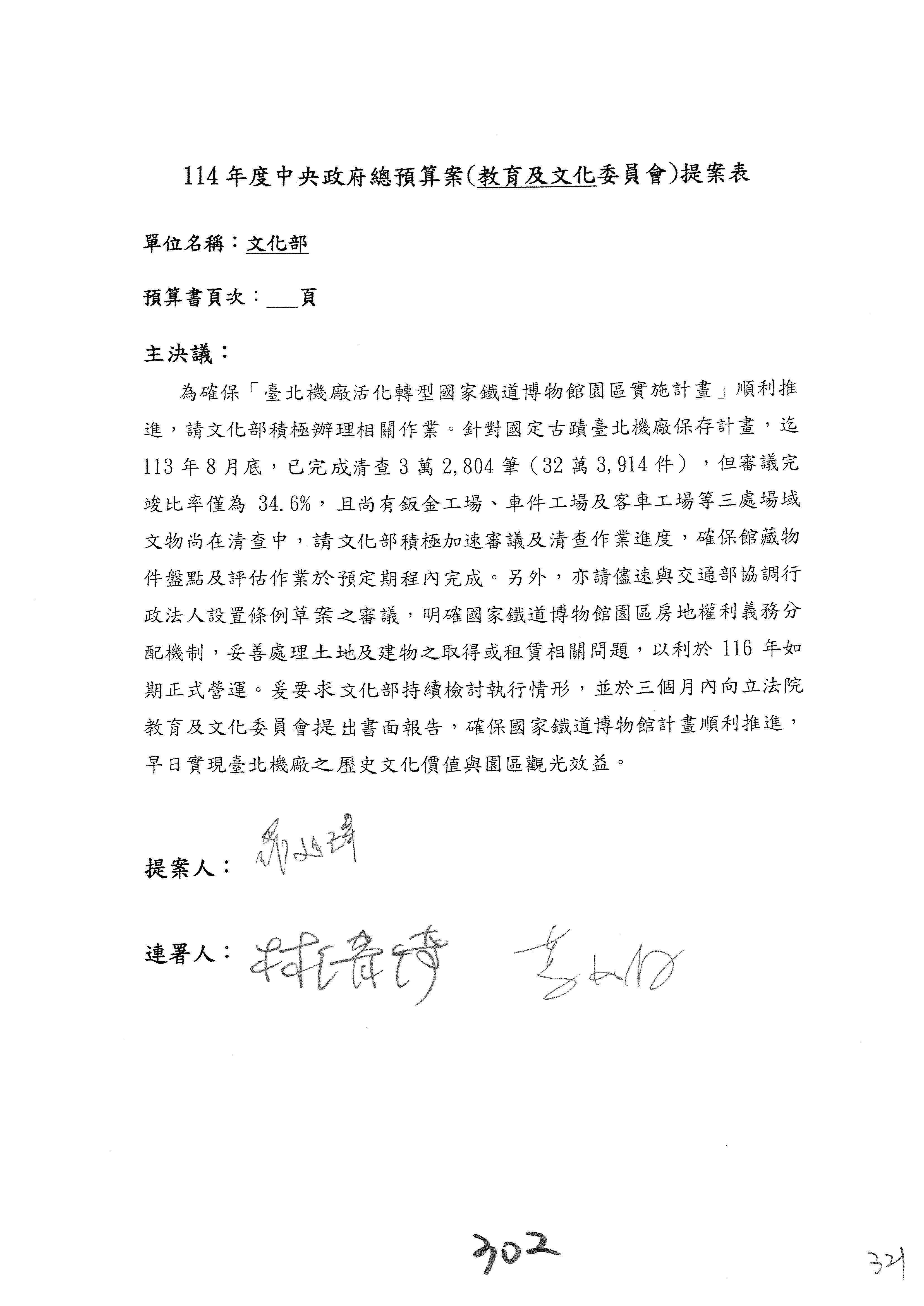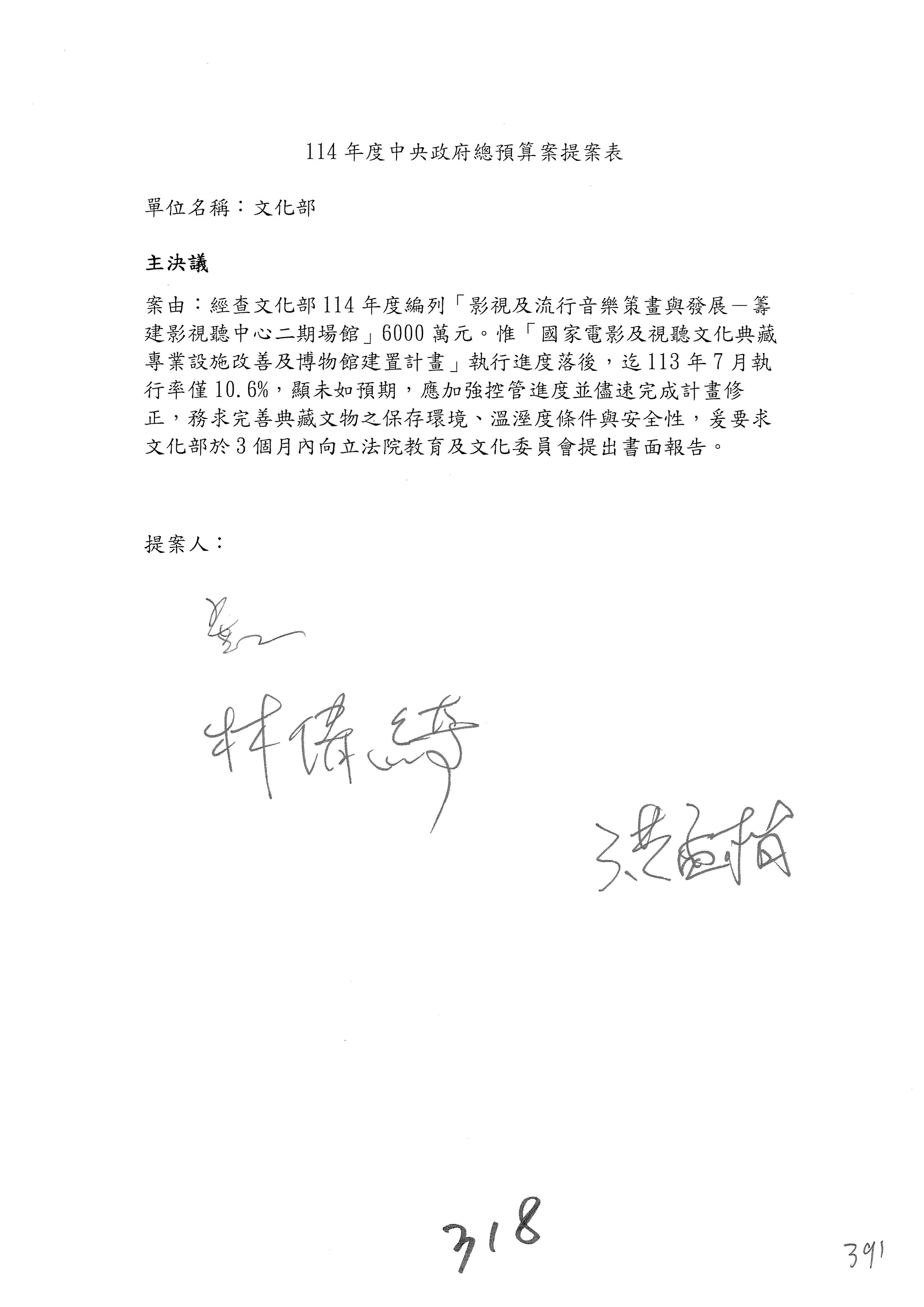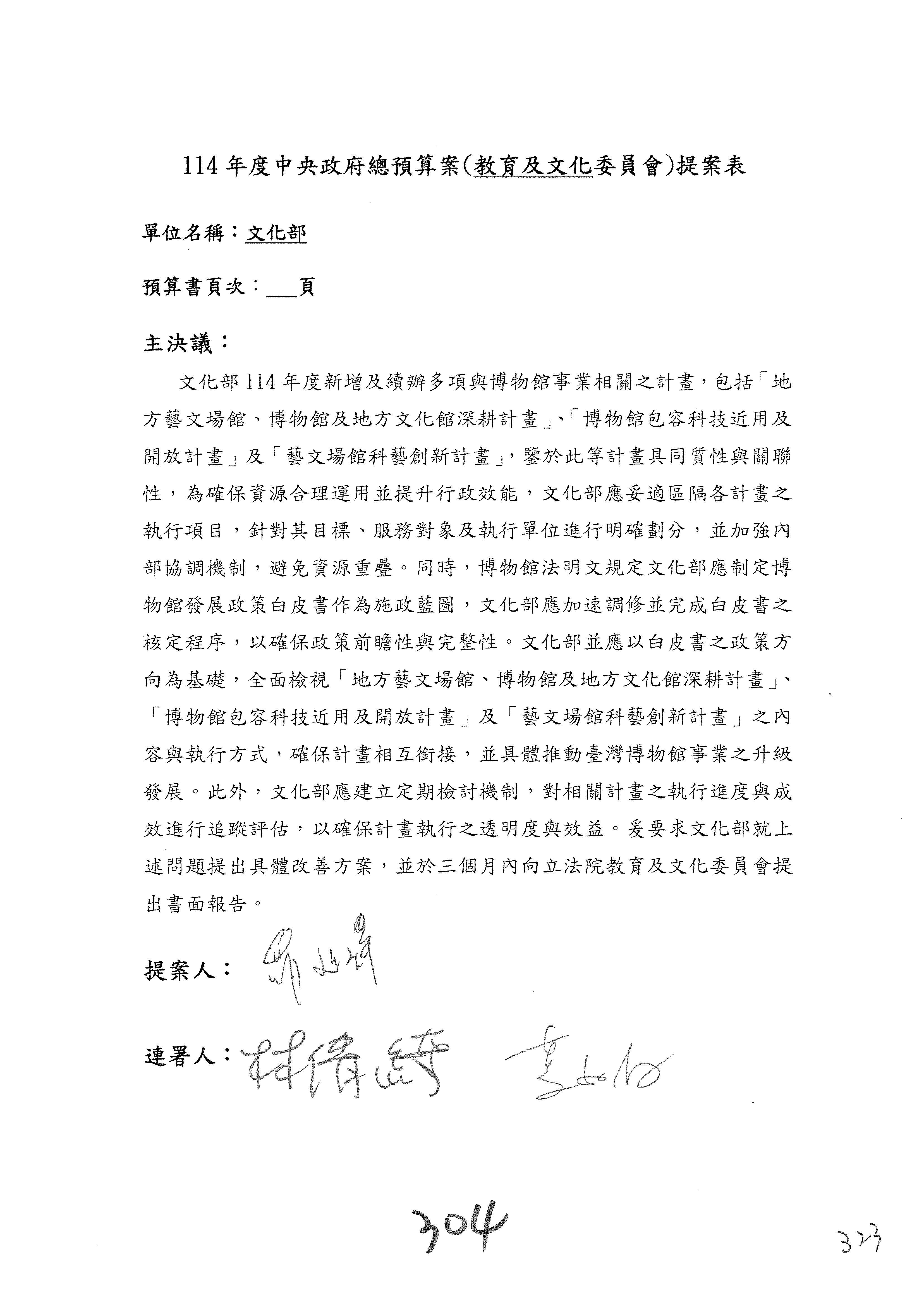 一、繼續審查114年度中央政府總預算案有關文化部及所屬單位預算案。