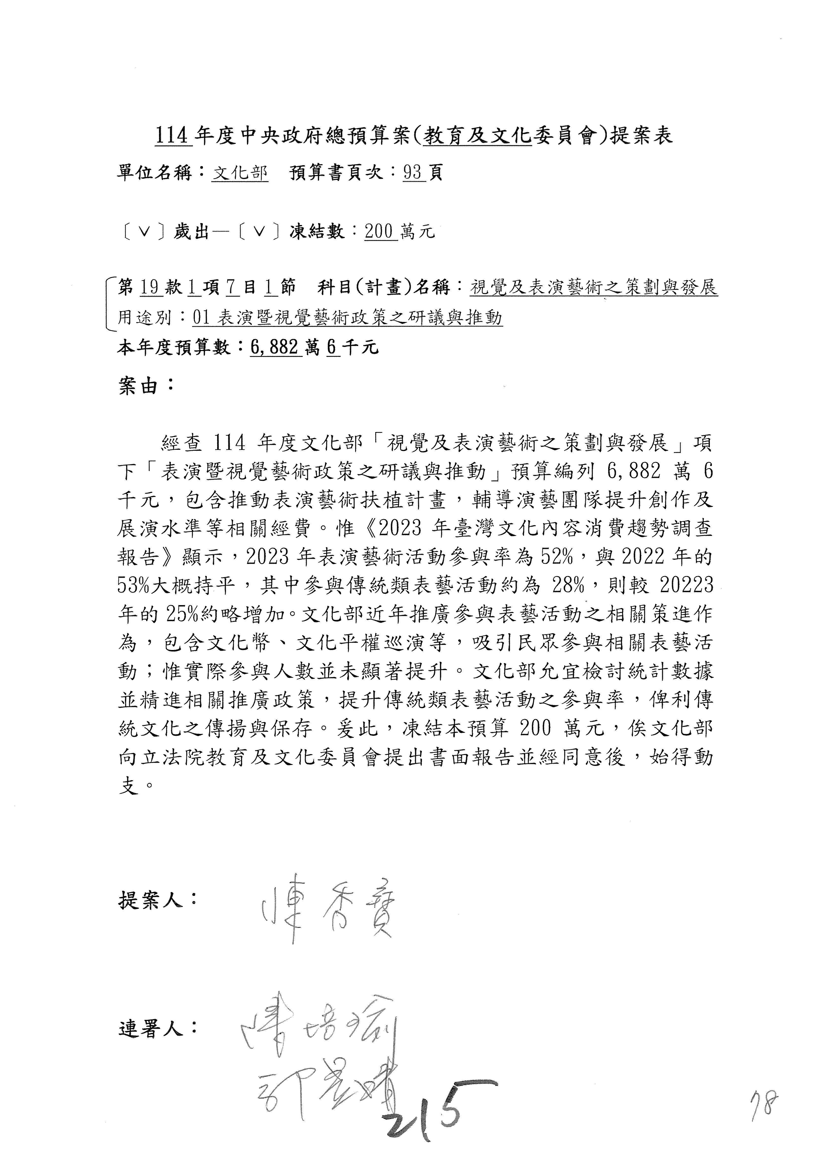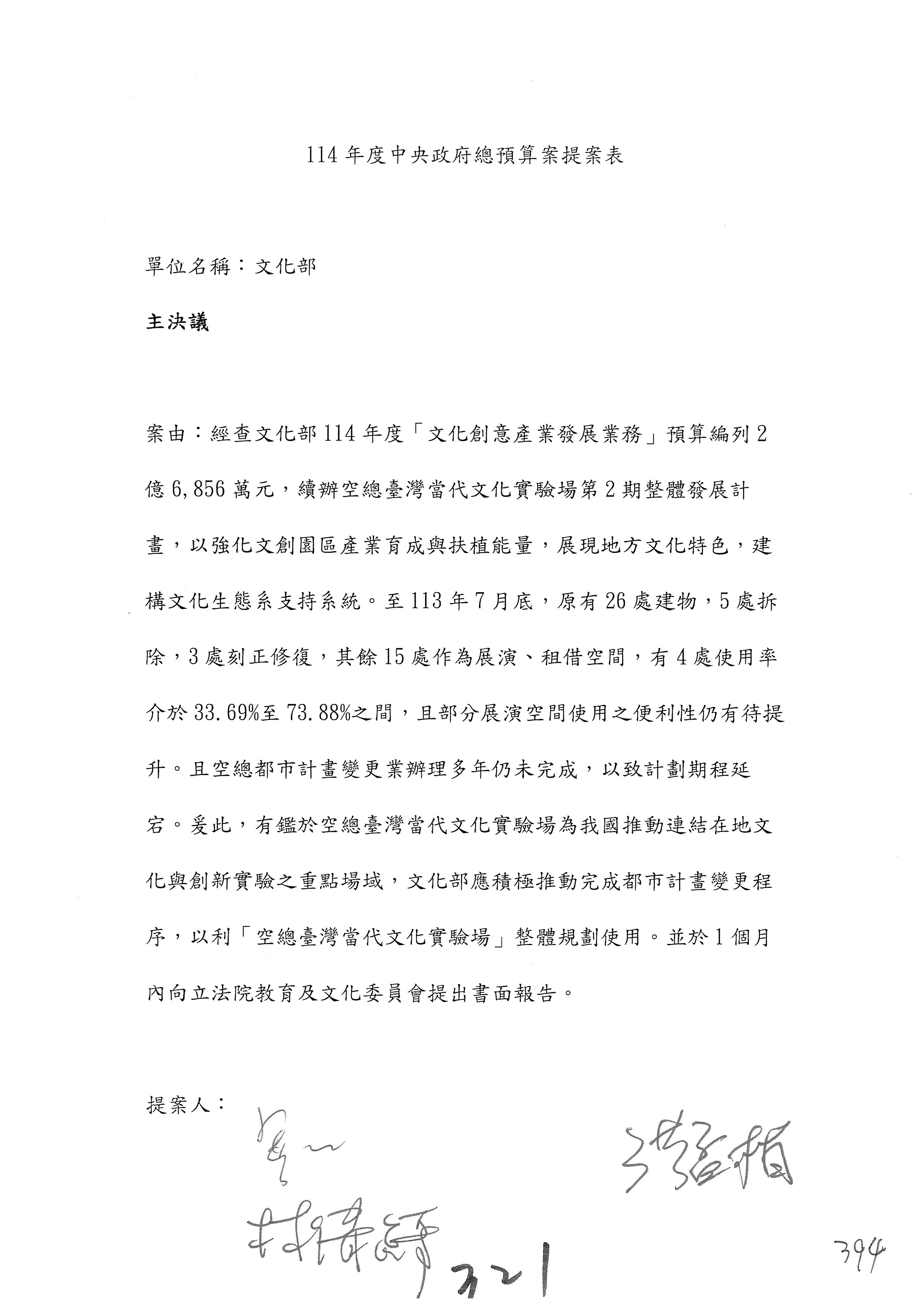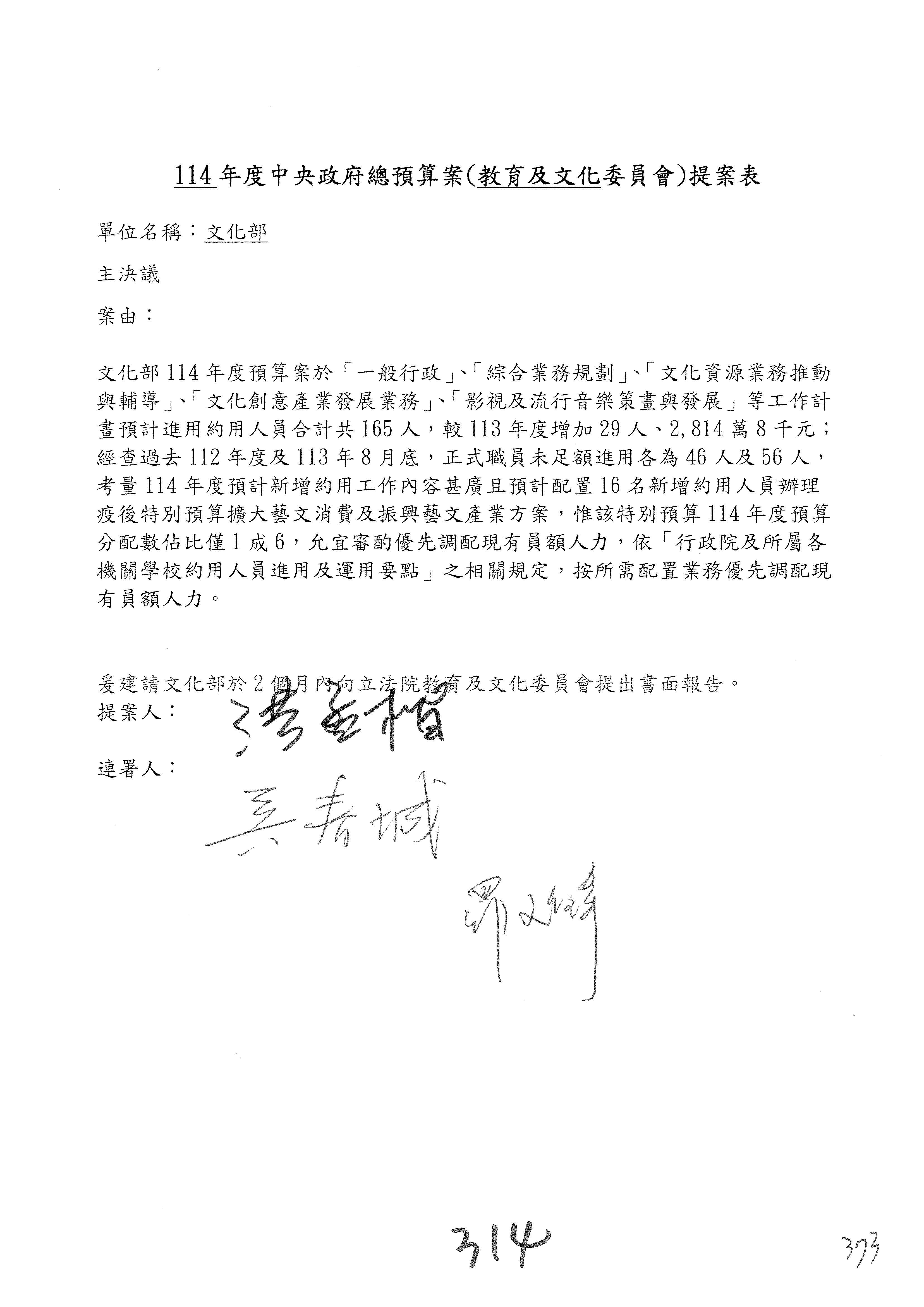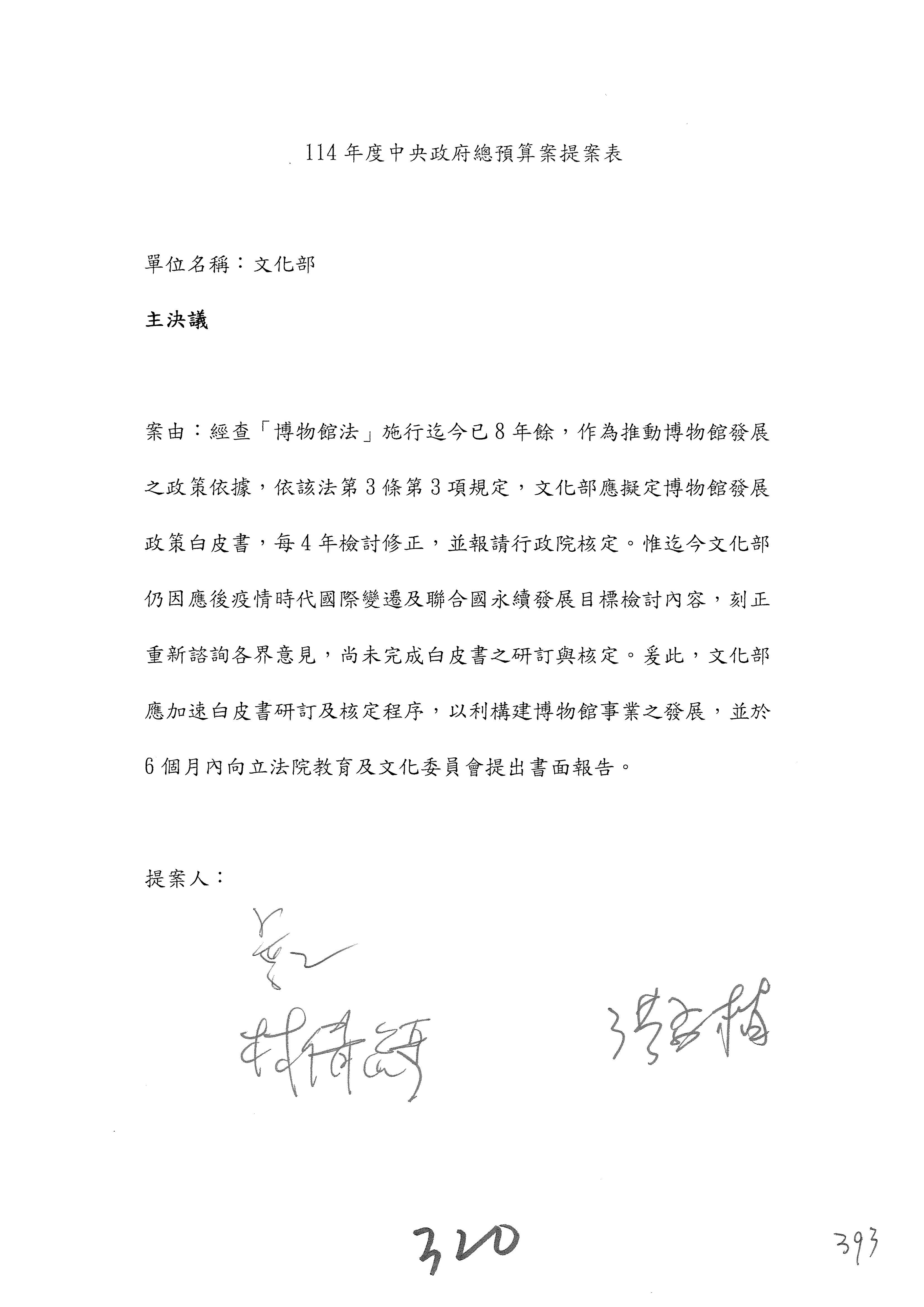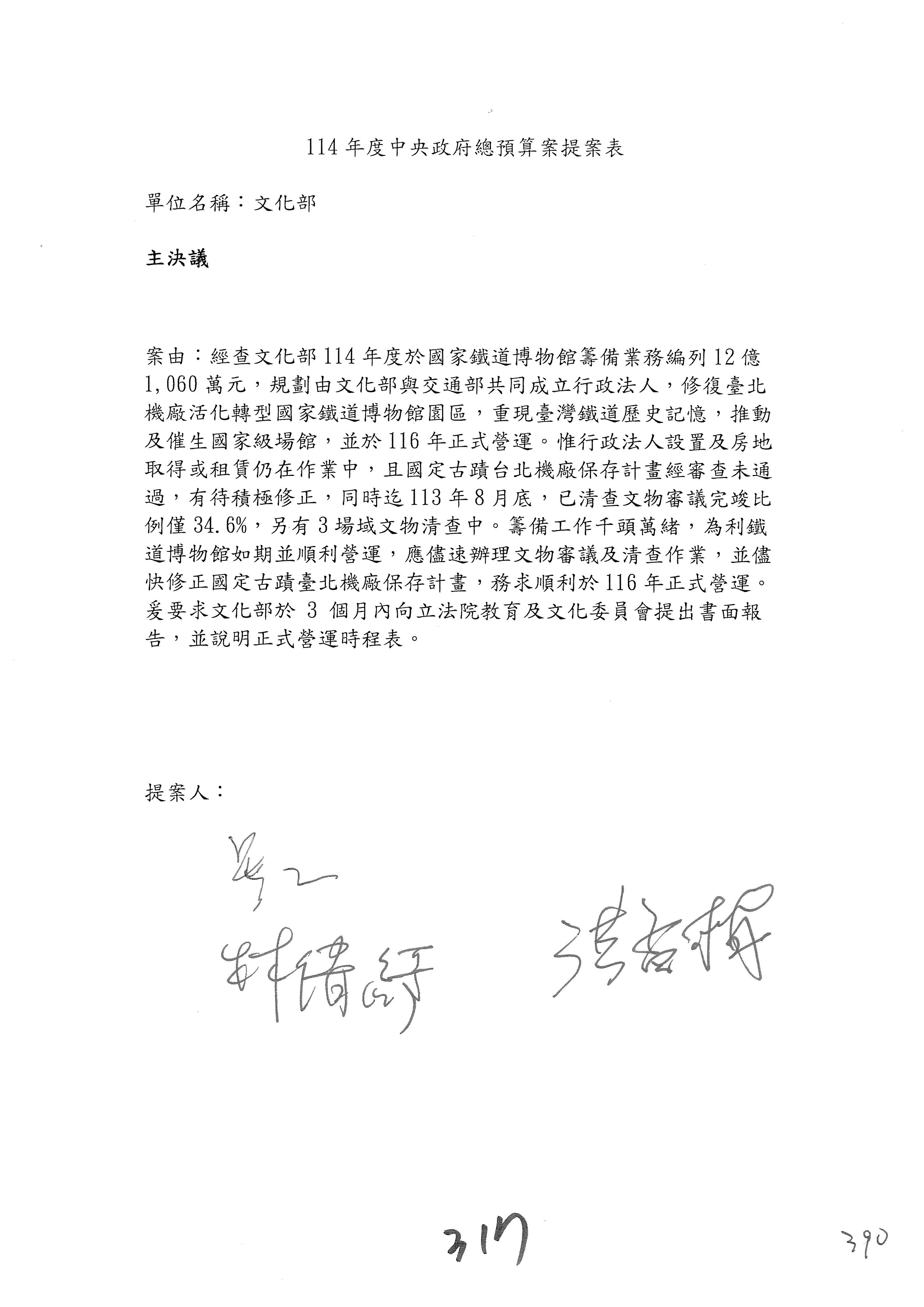 一、繼續審查114年度中央政府總預算案有關文化部及所屬單位預算案。