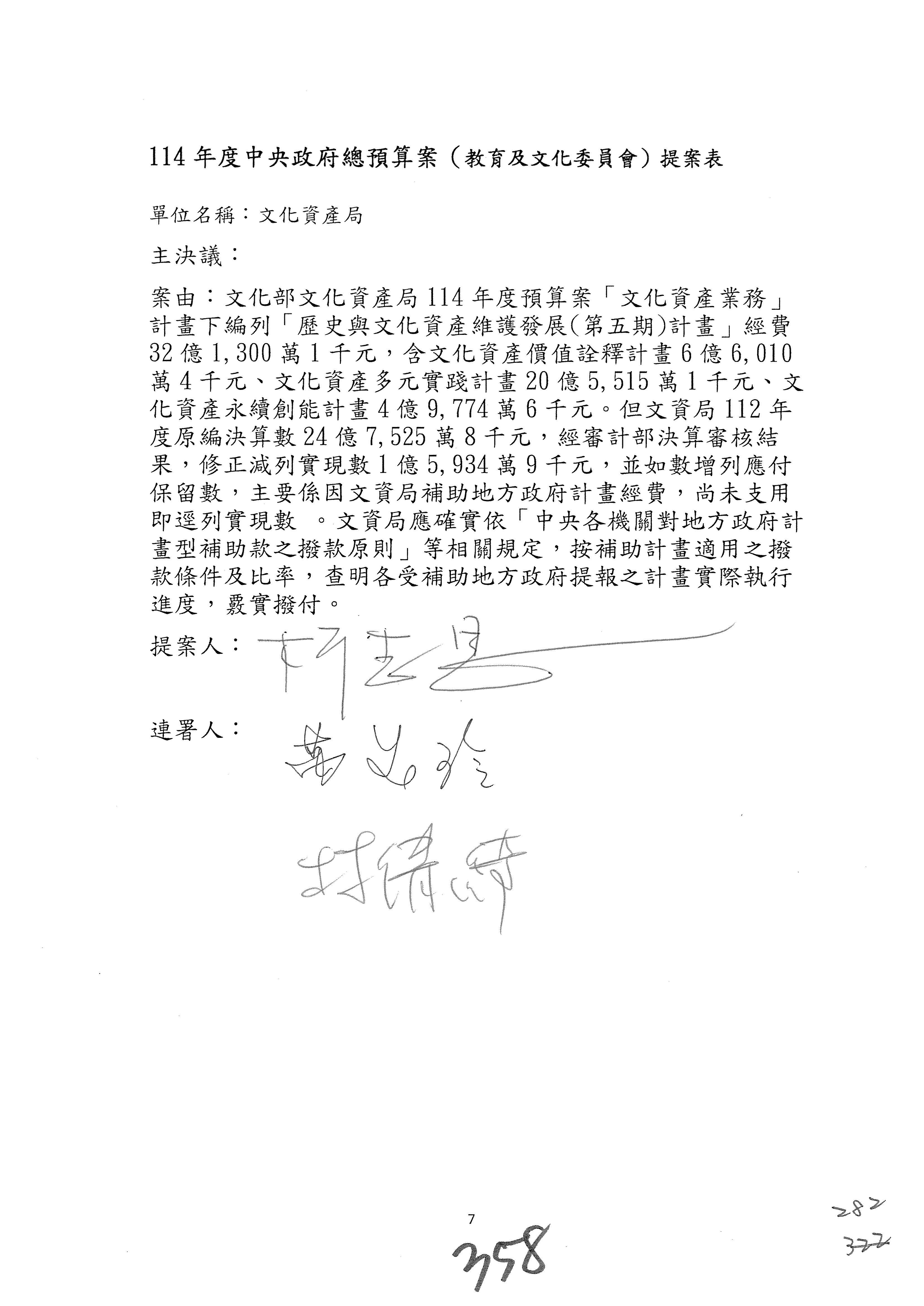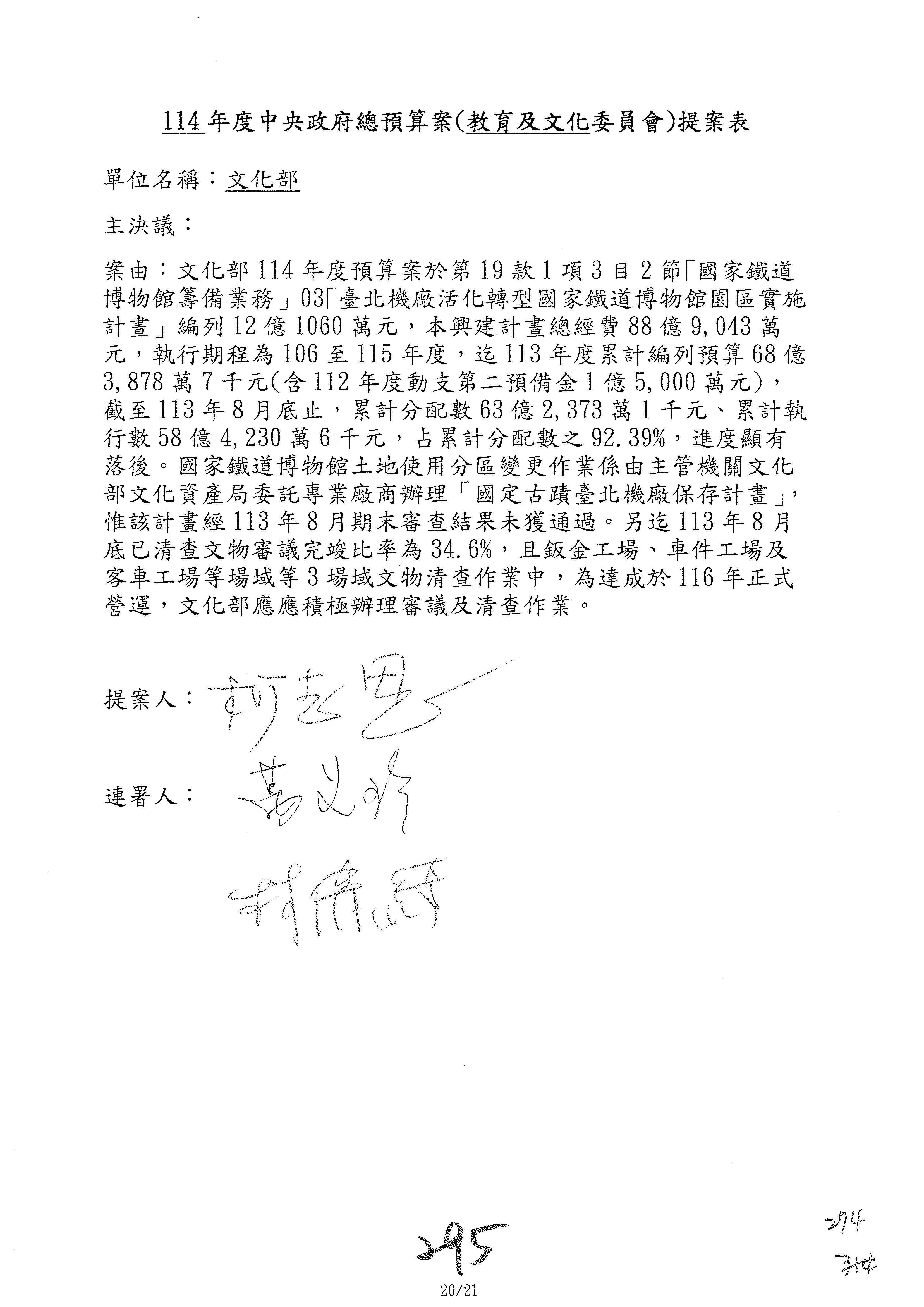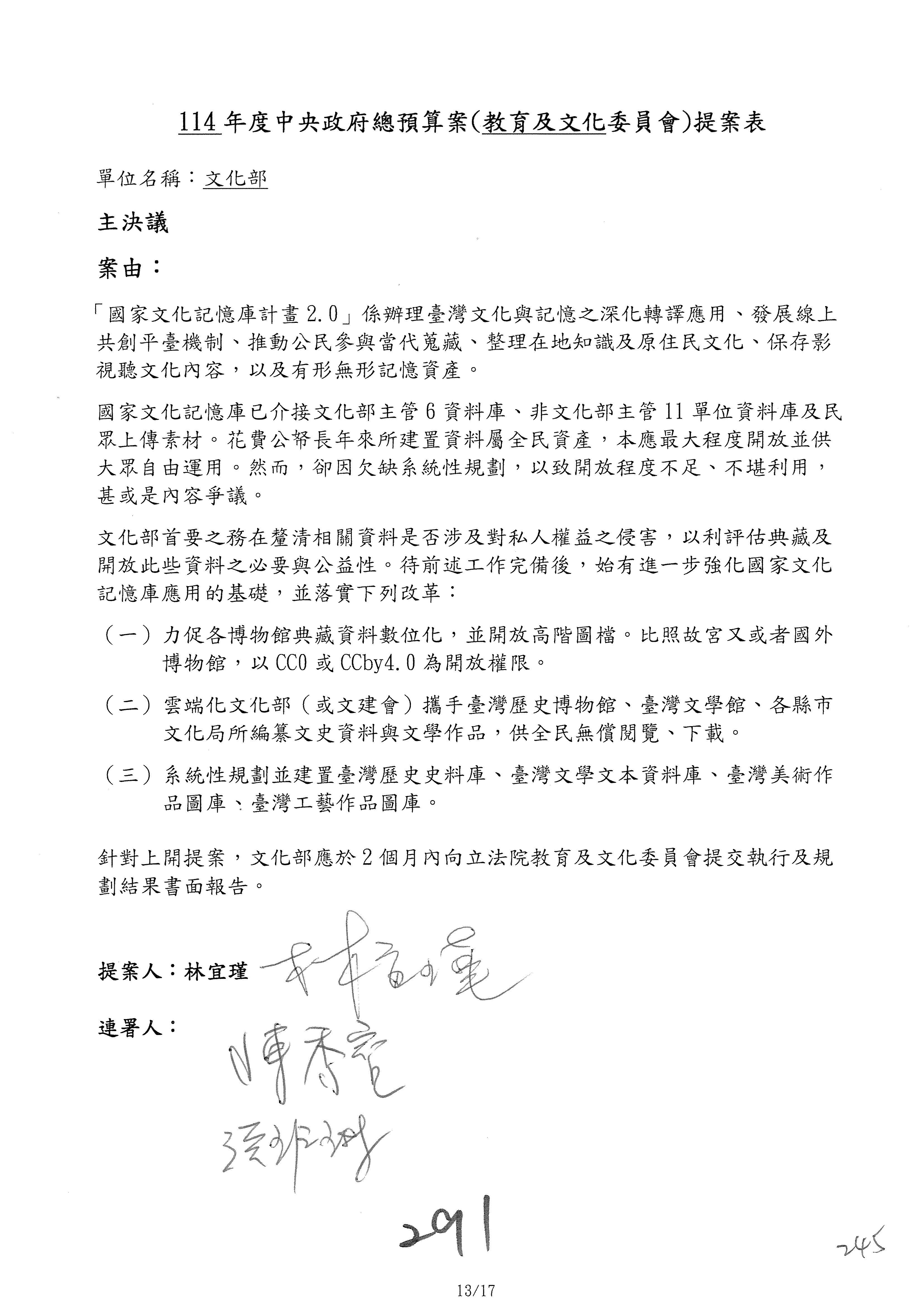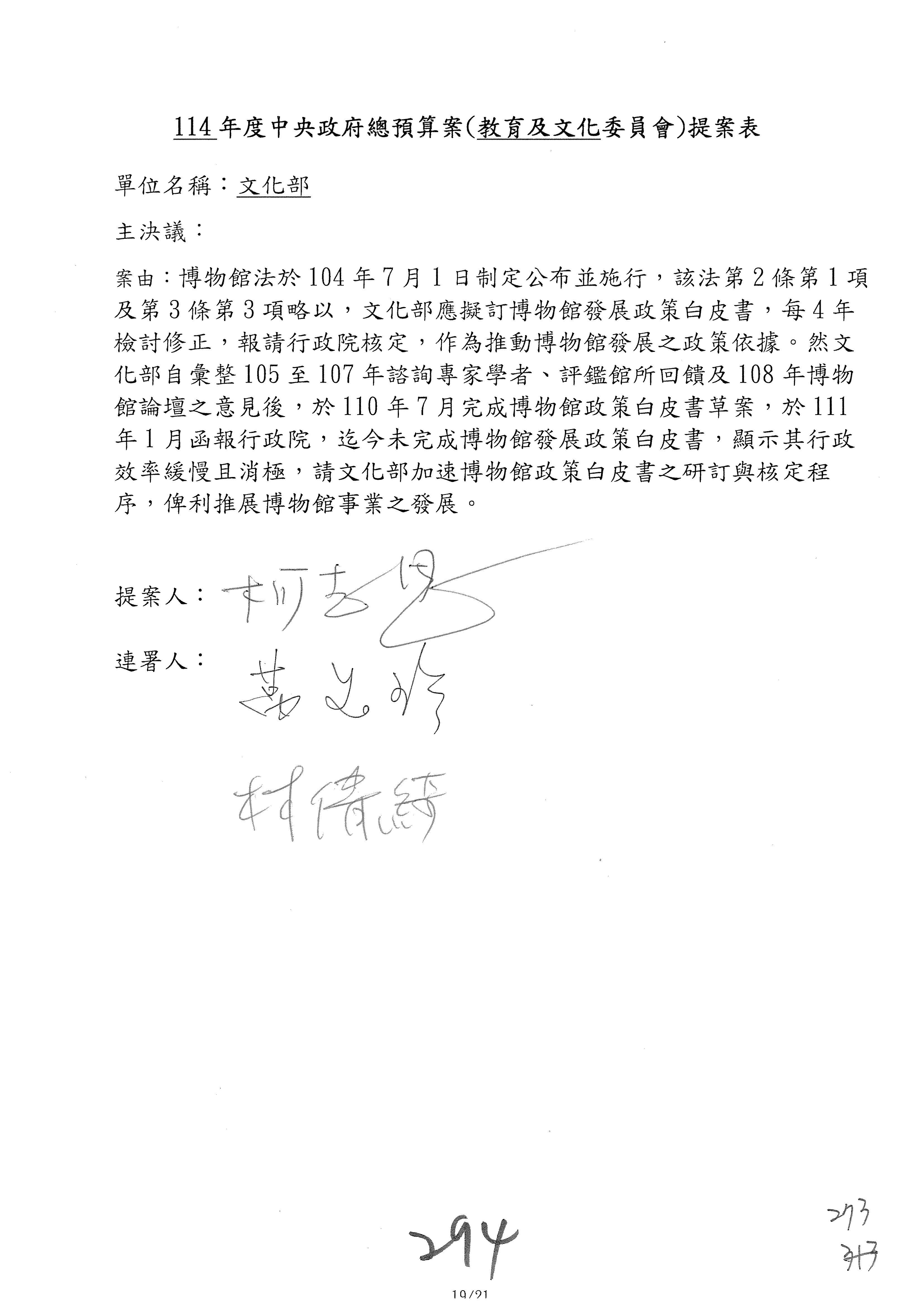 一、繼續審查114年度中央政府總預算案有關文化部及所屬單位預算案。