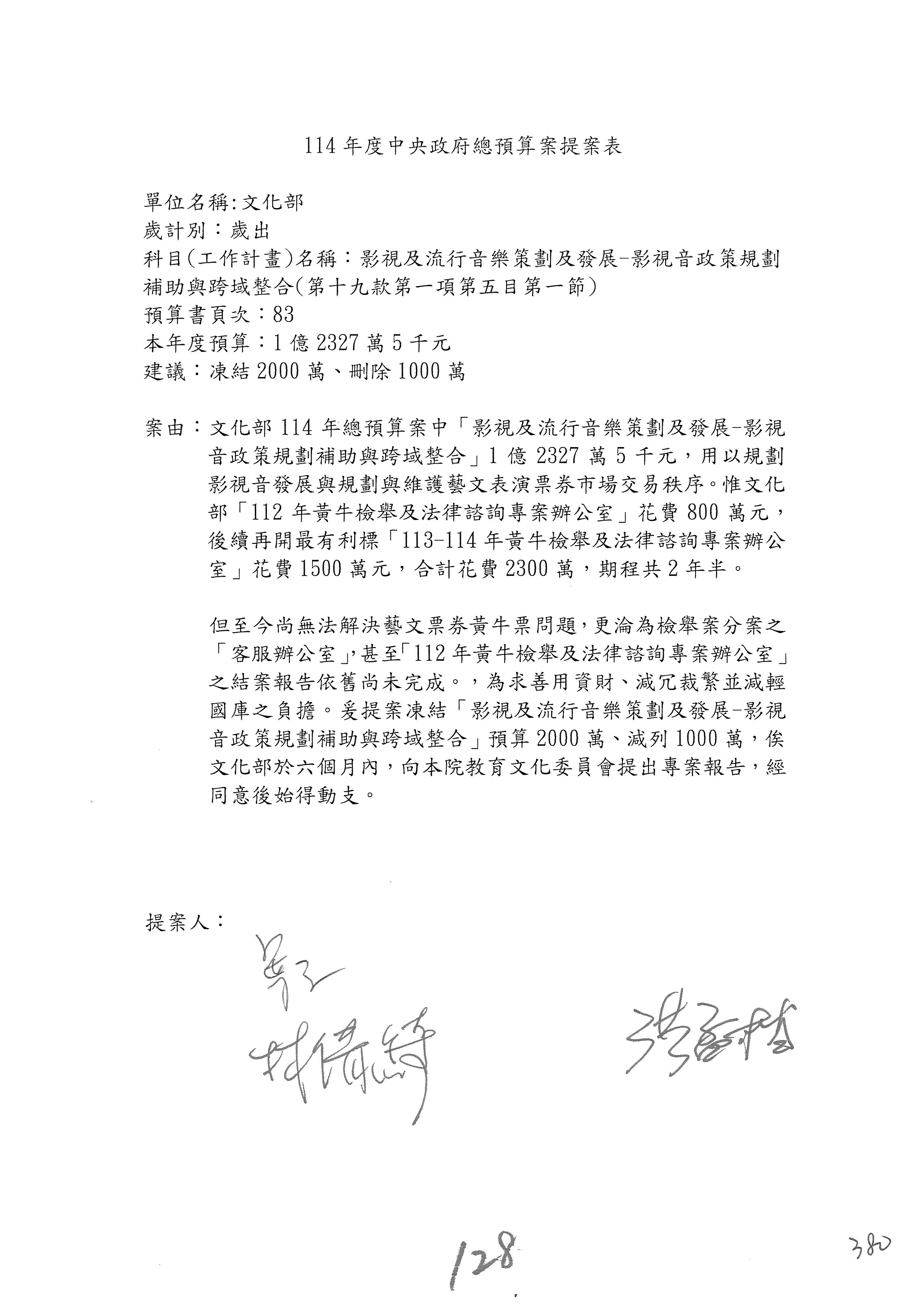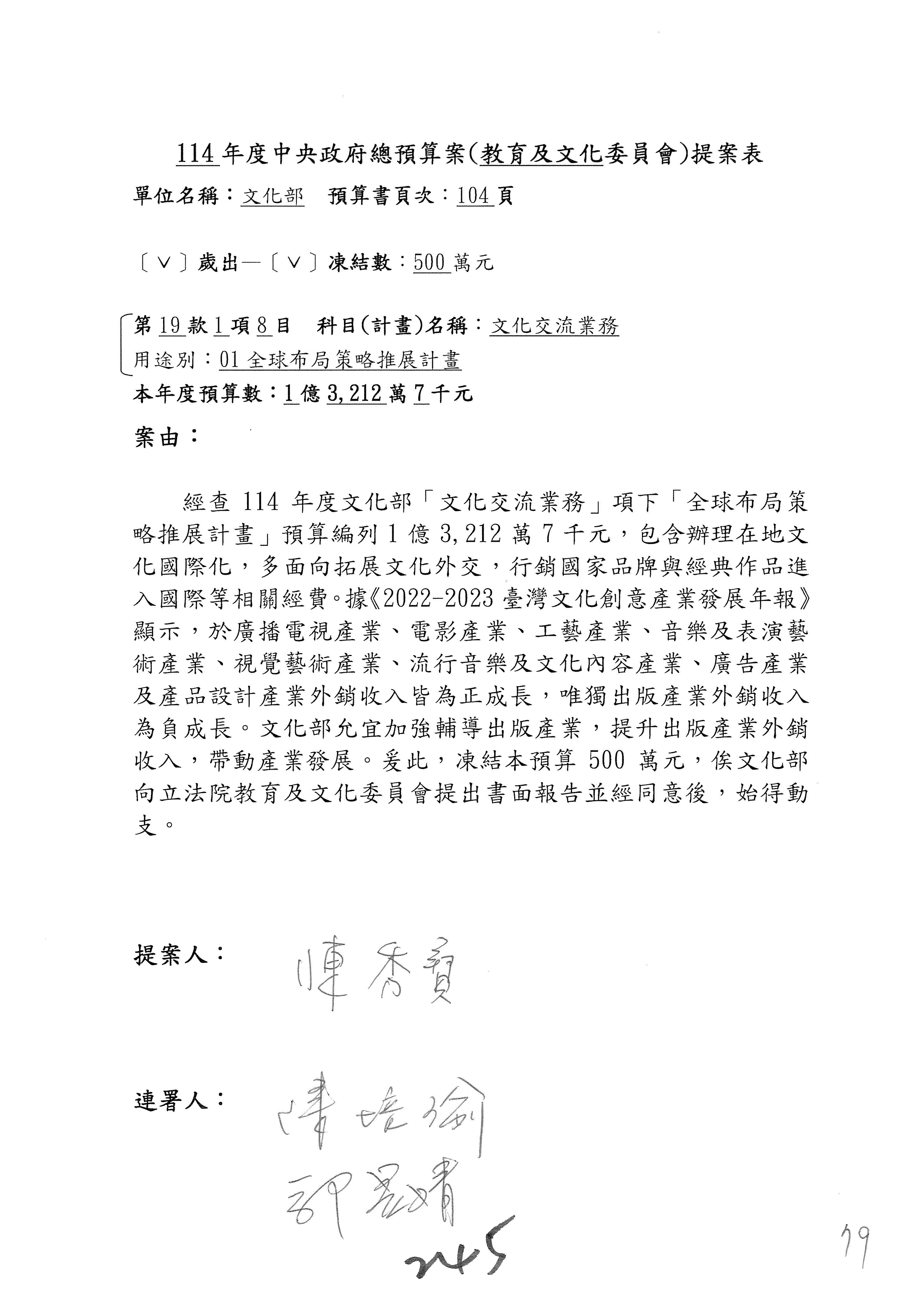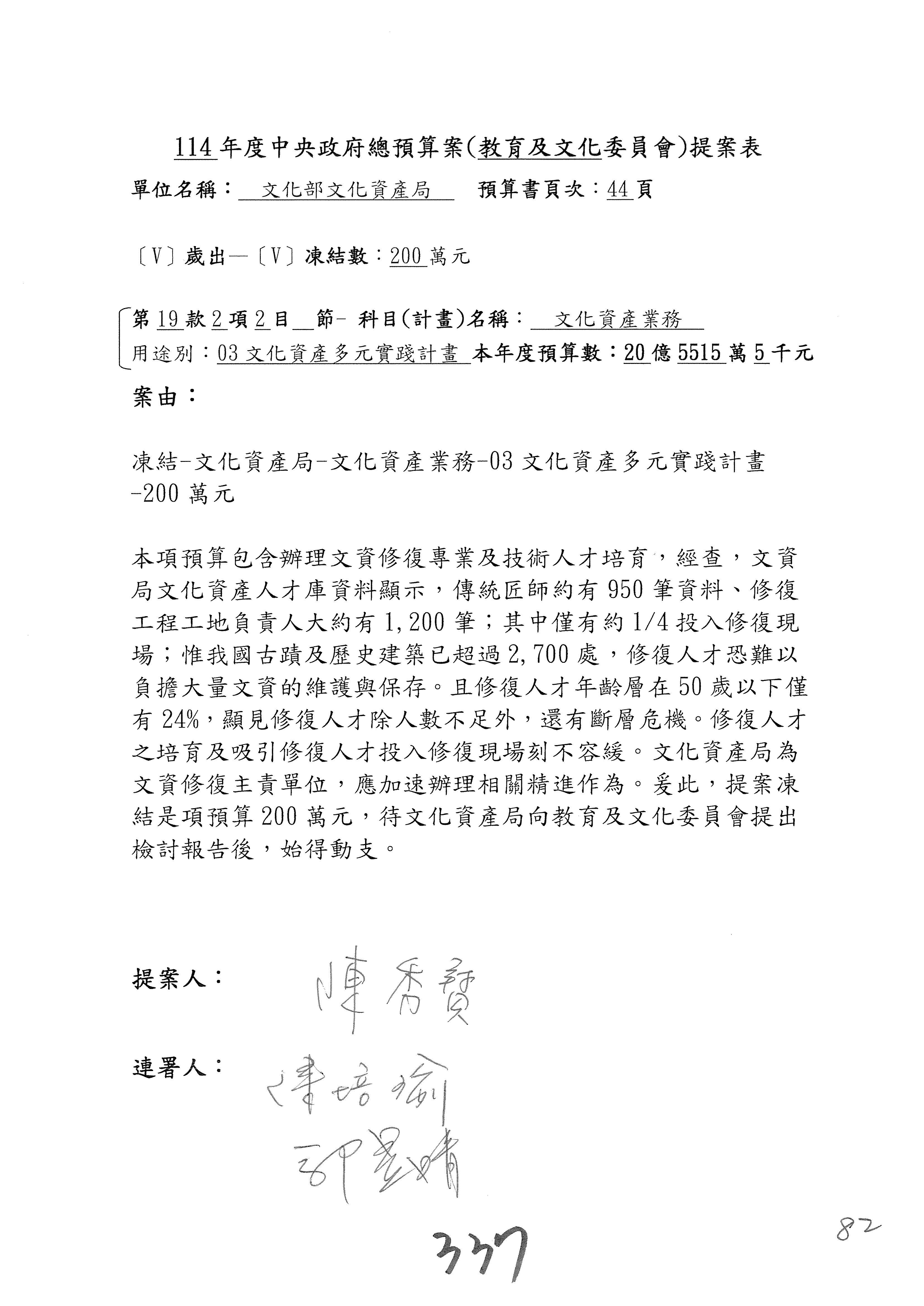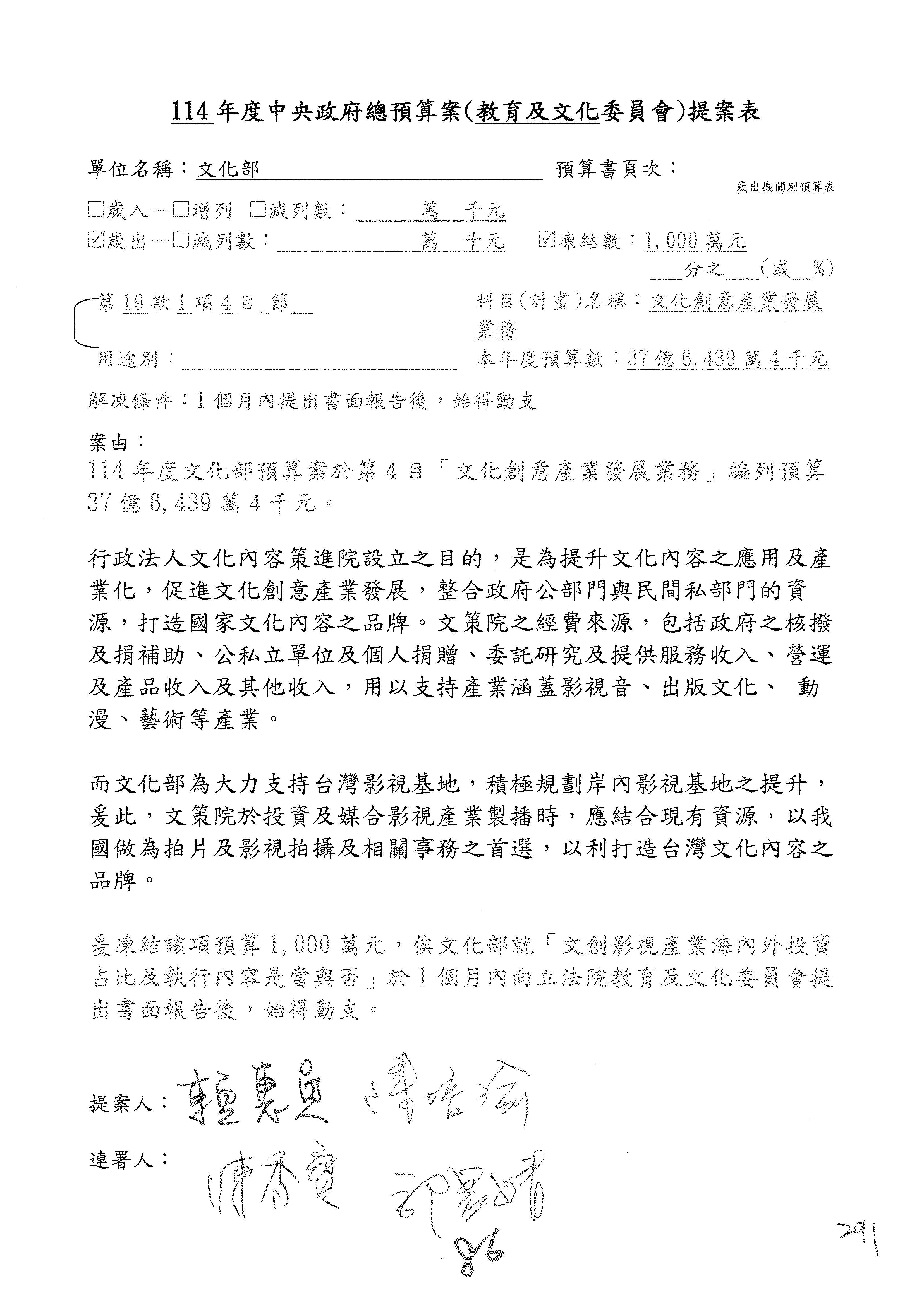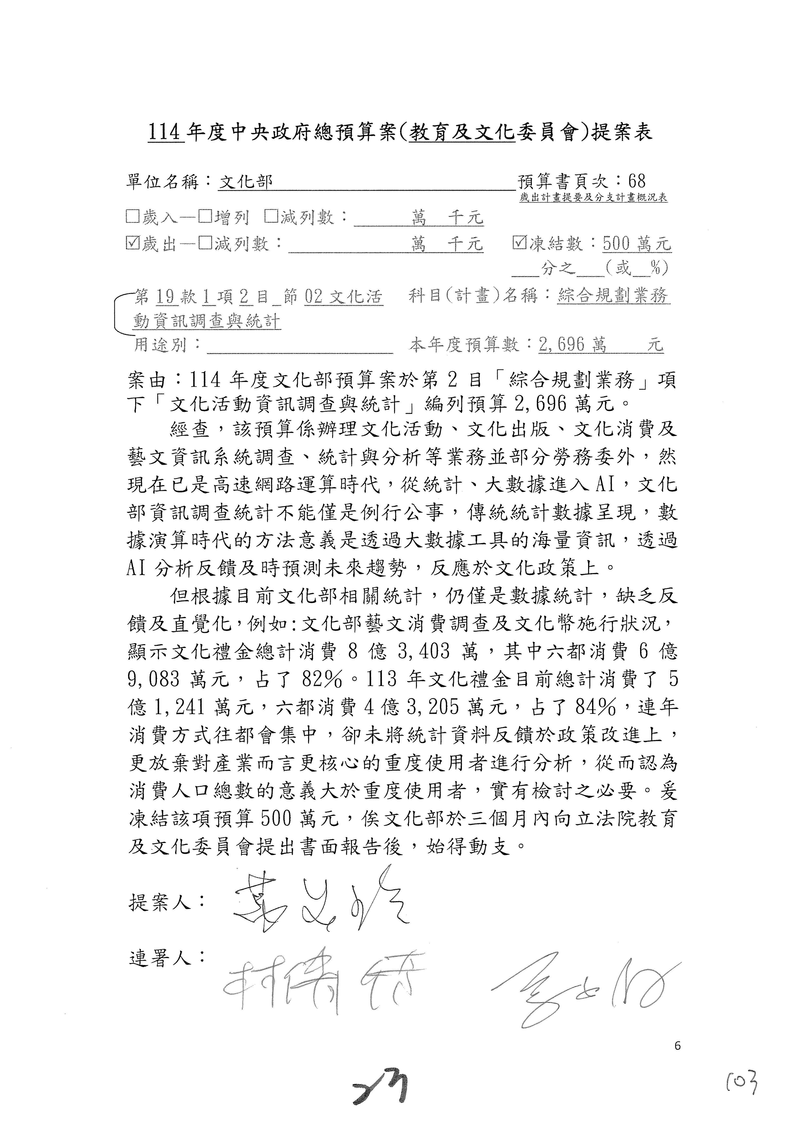 一、繼續審查114年度中央政府總預算案有關文化部及所屬單位預算案。