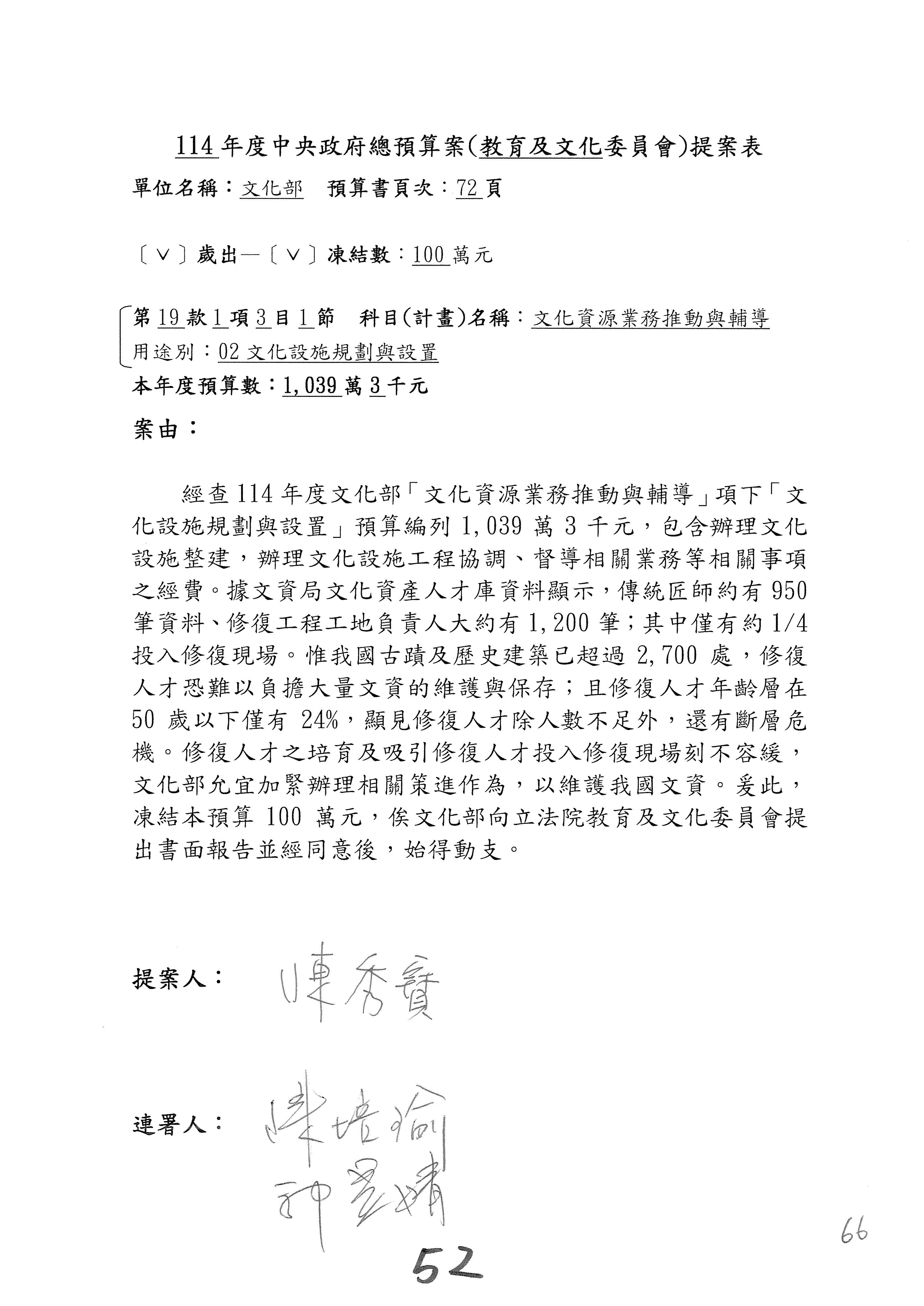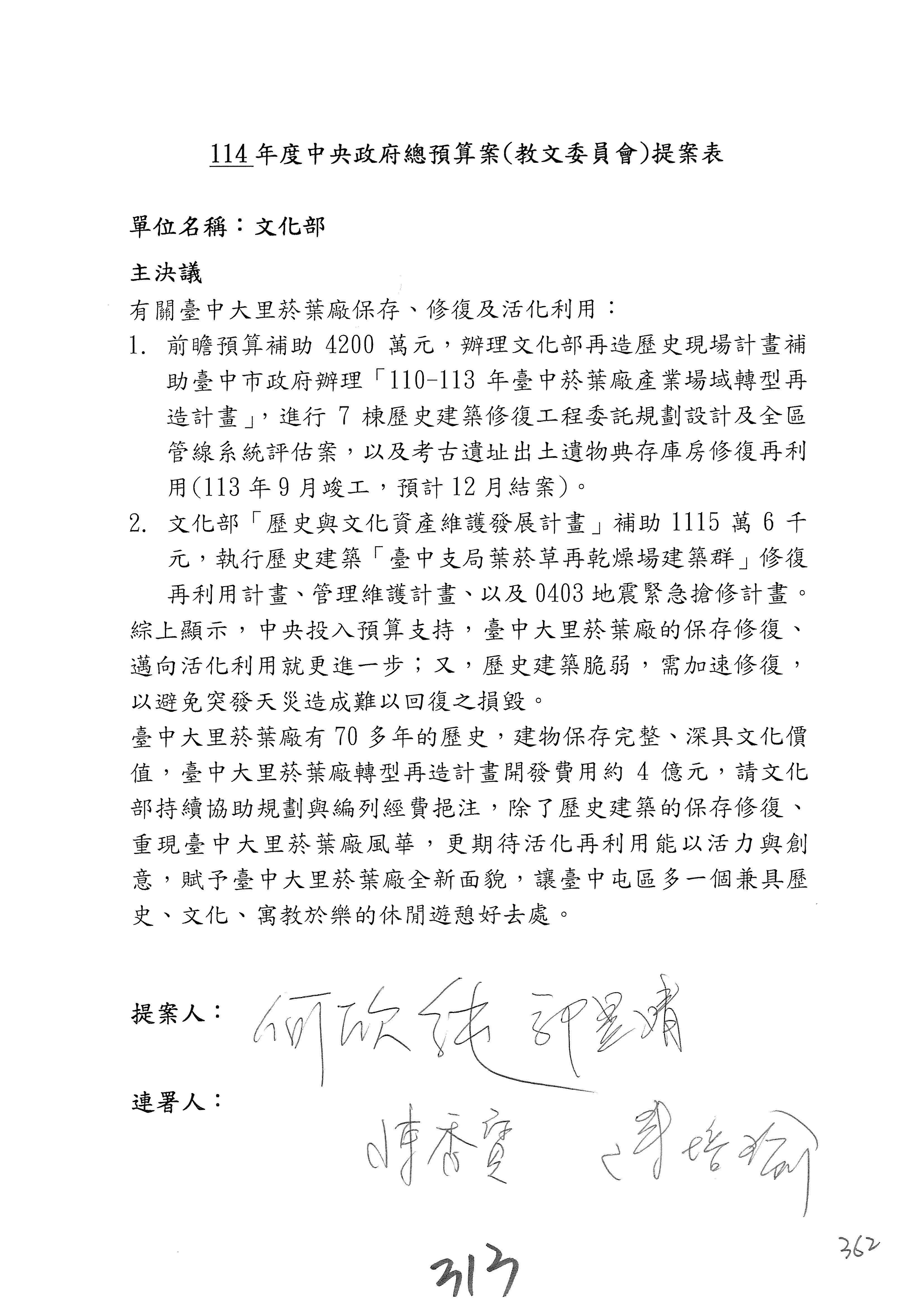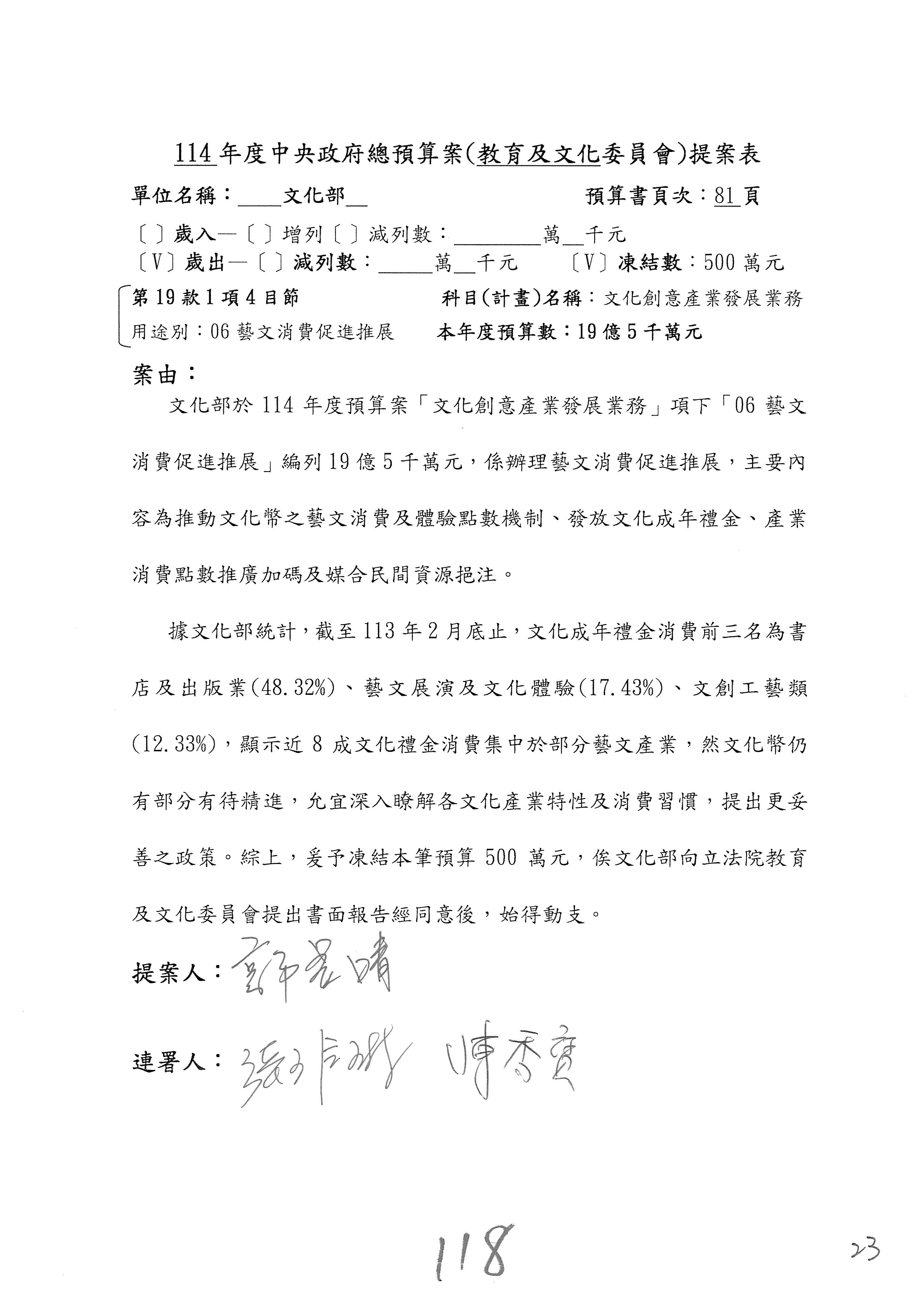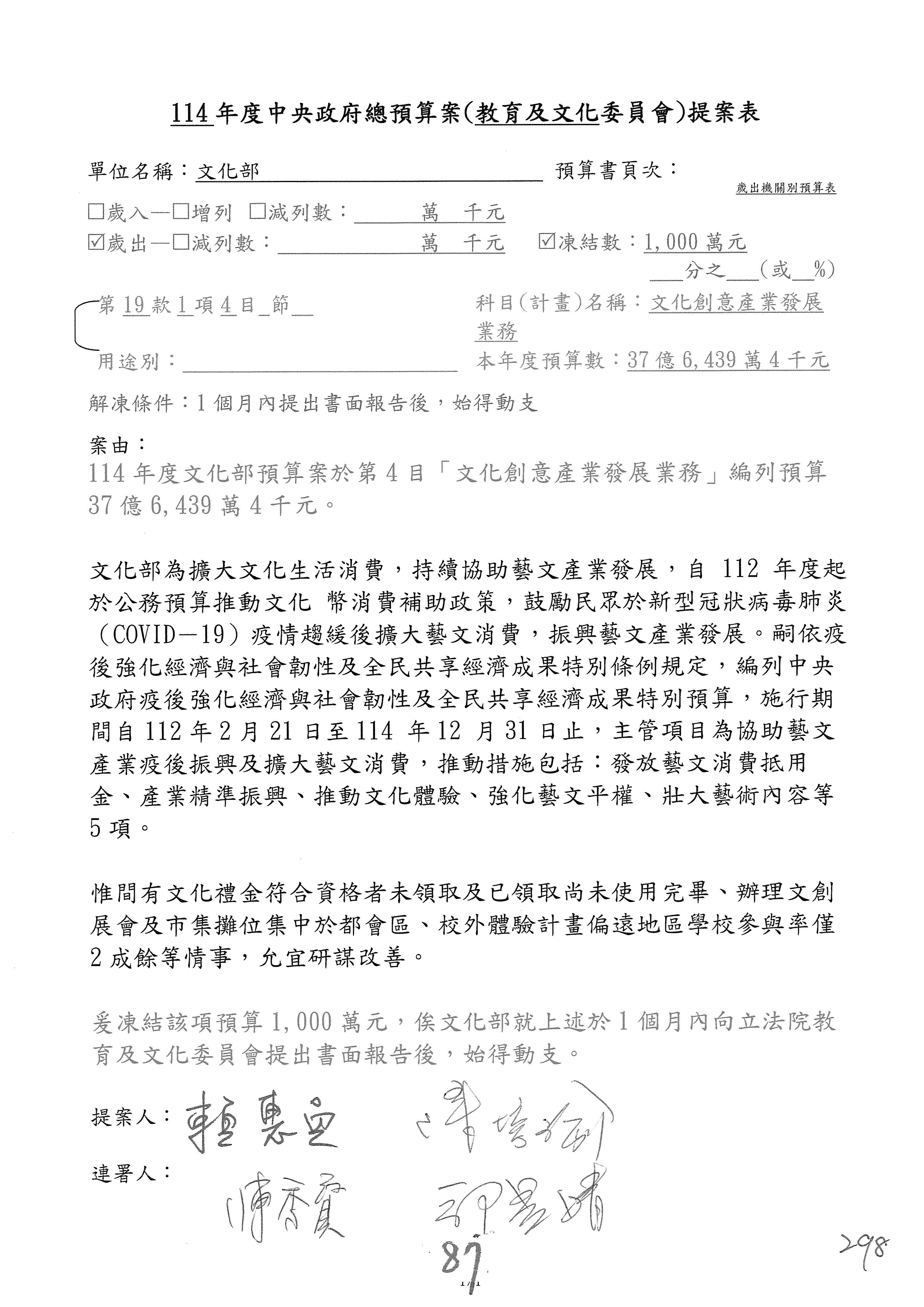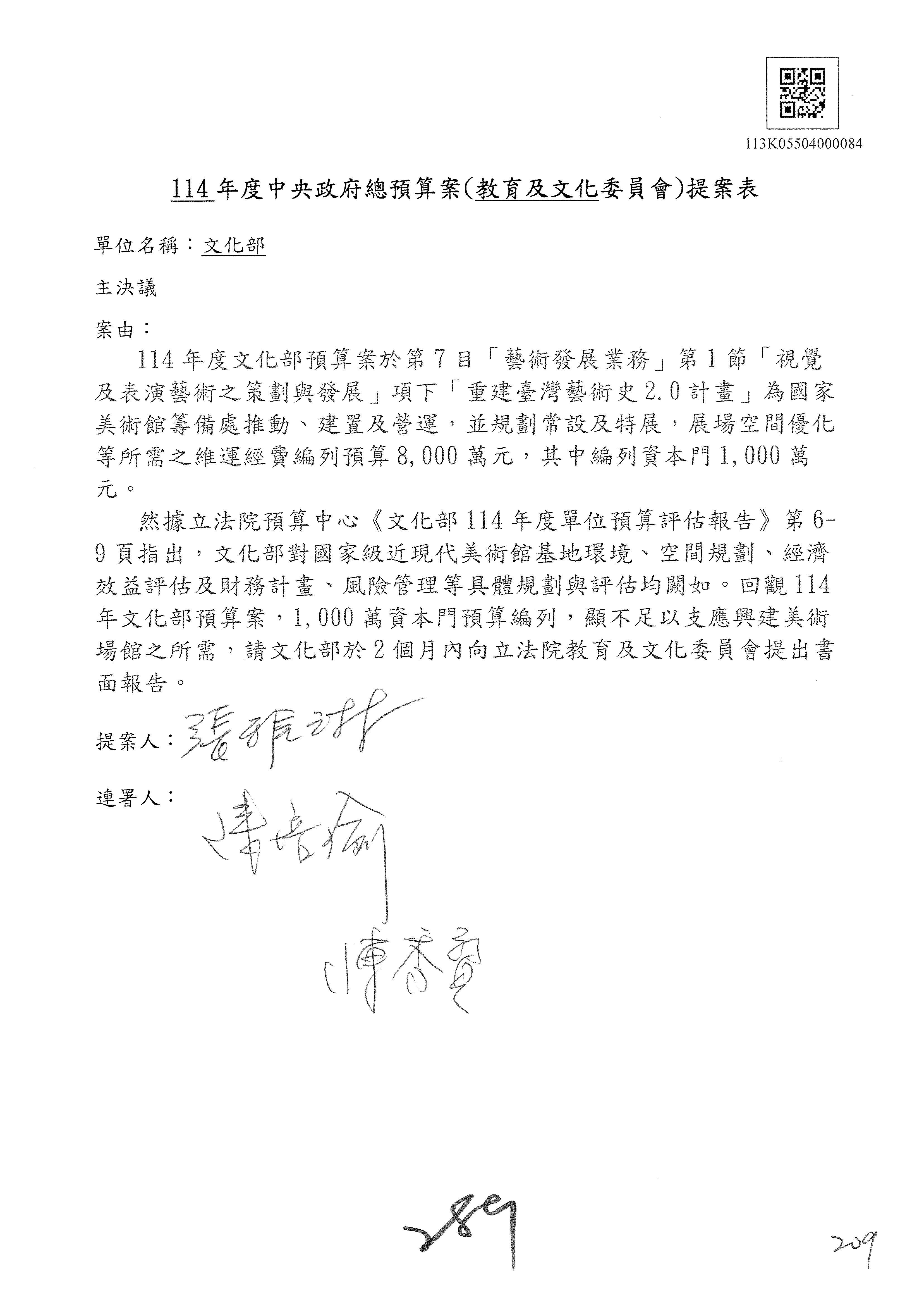 一、繼續審查114年度中央政府總預算案有關文化部及所屬單位預算案。