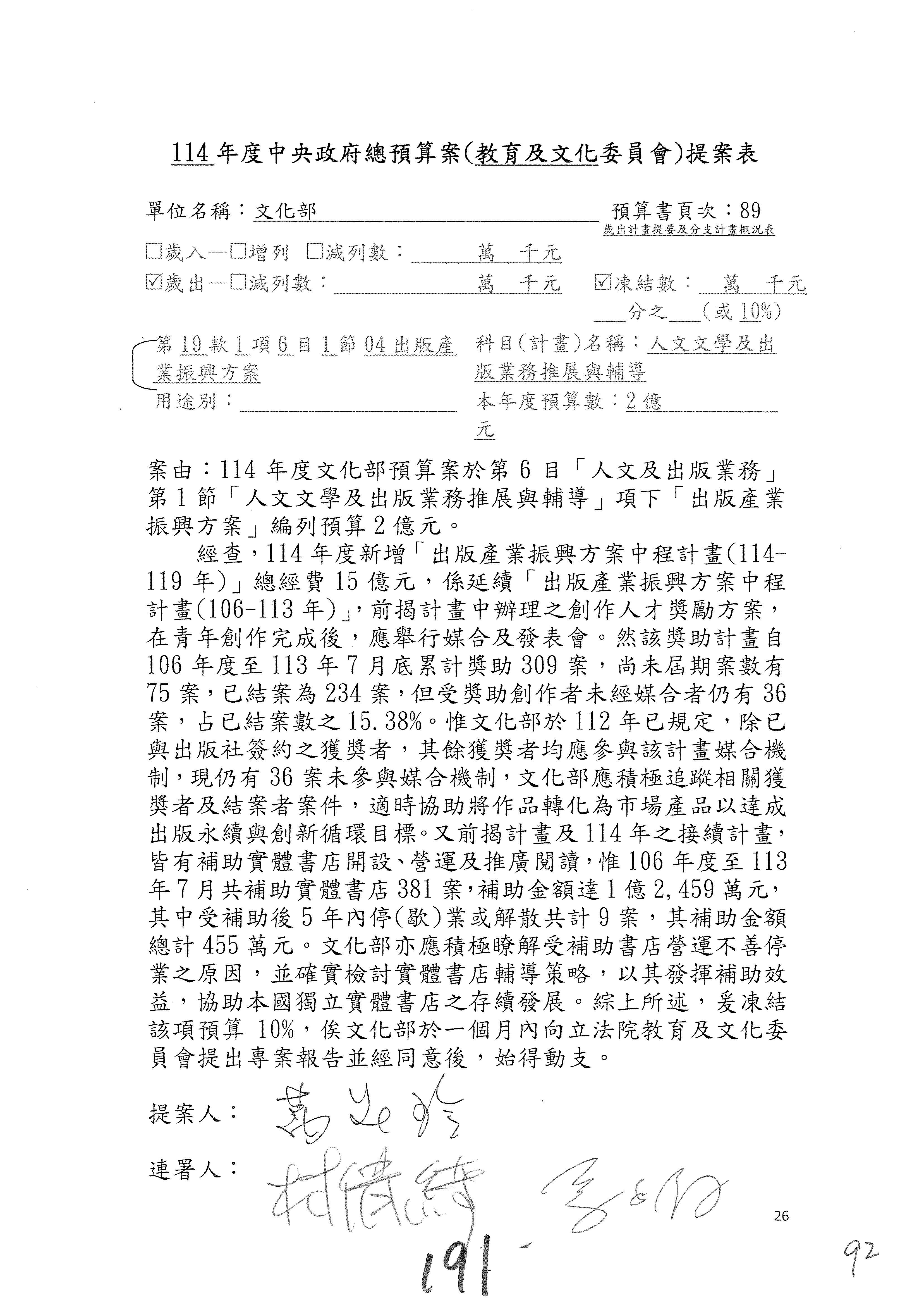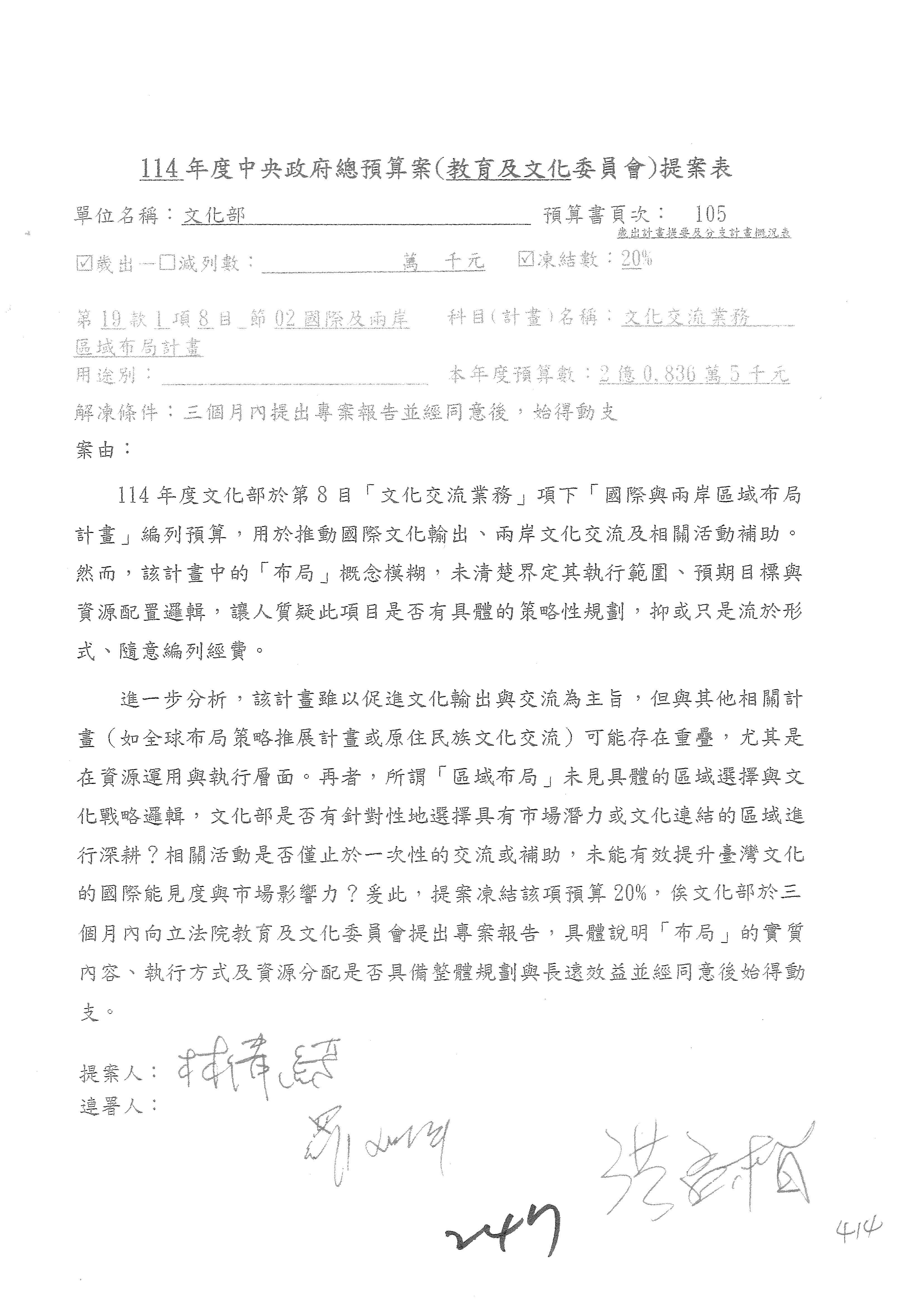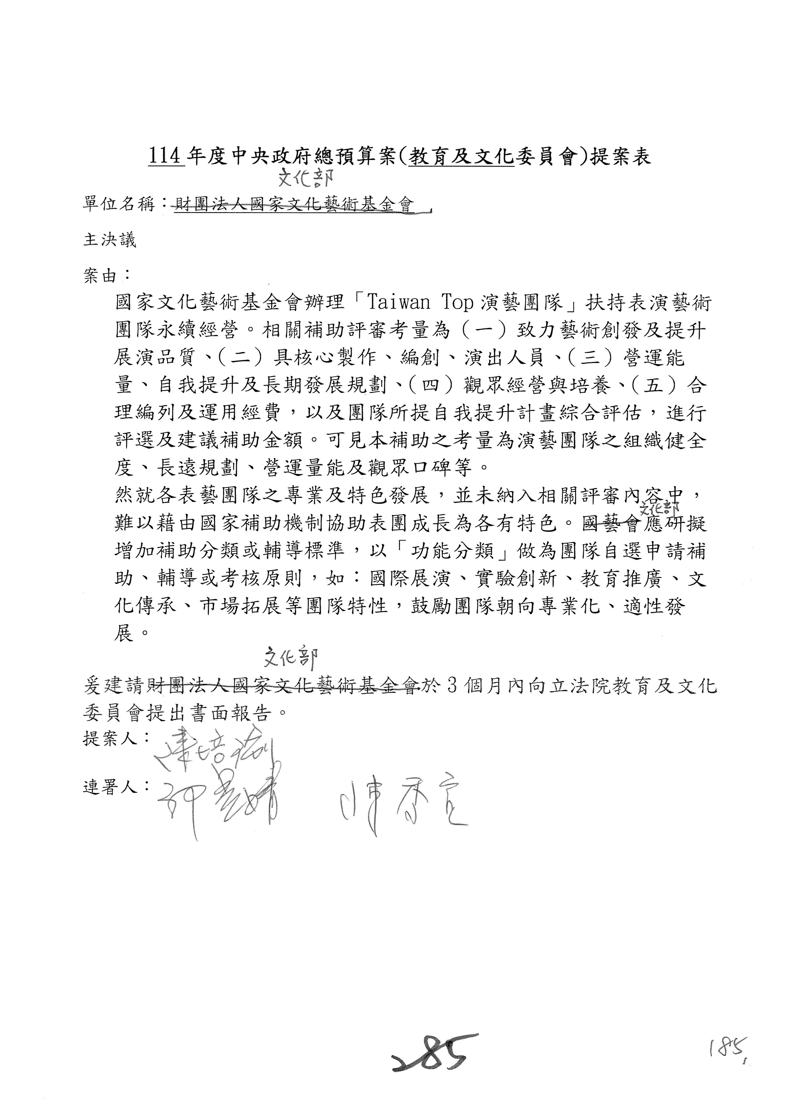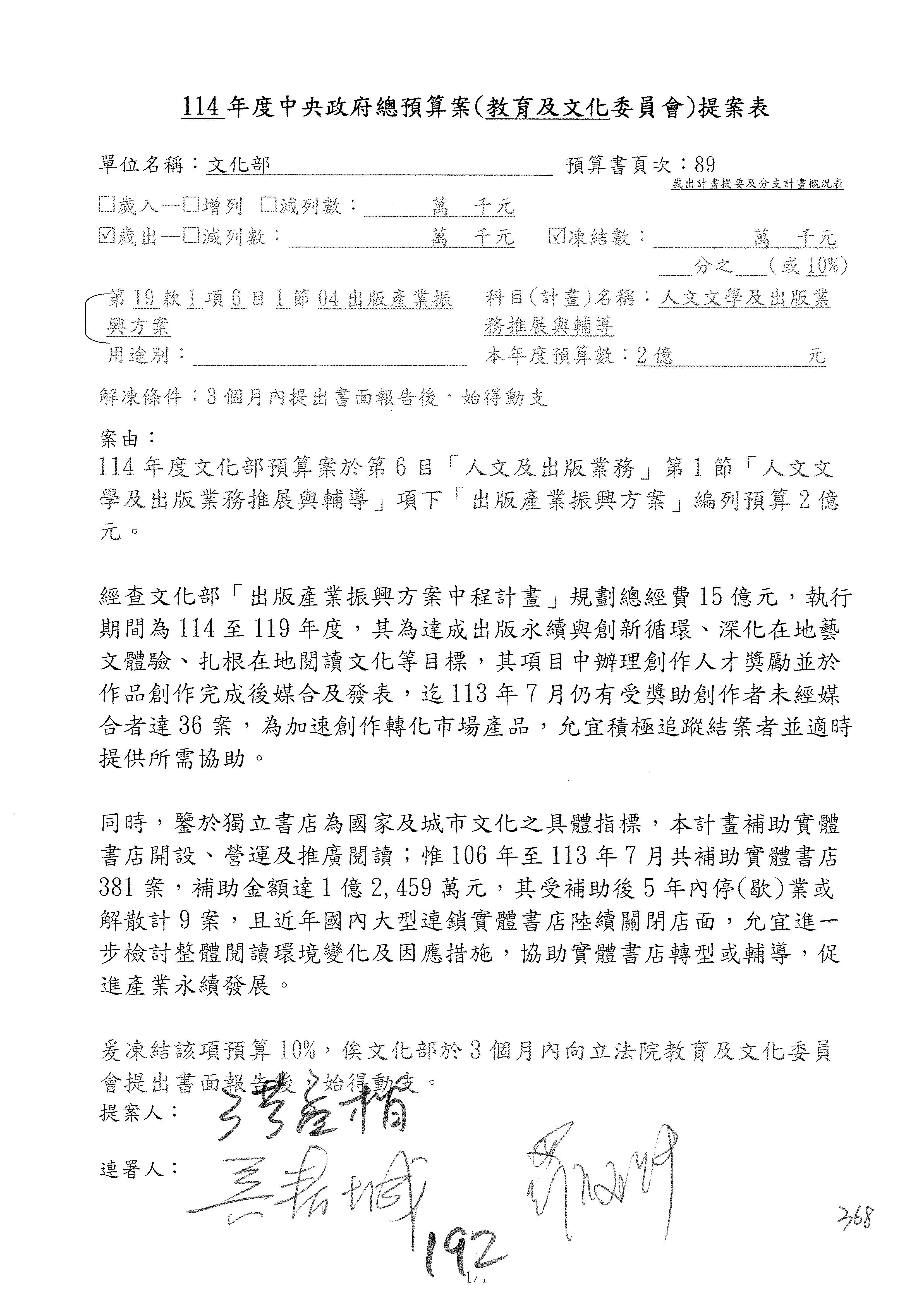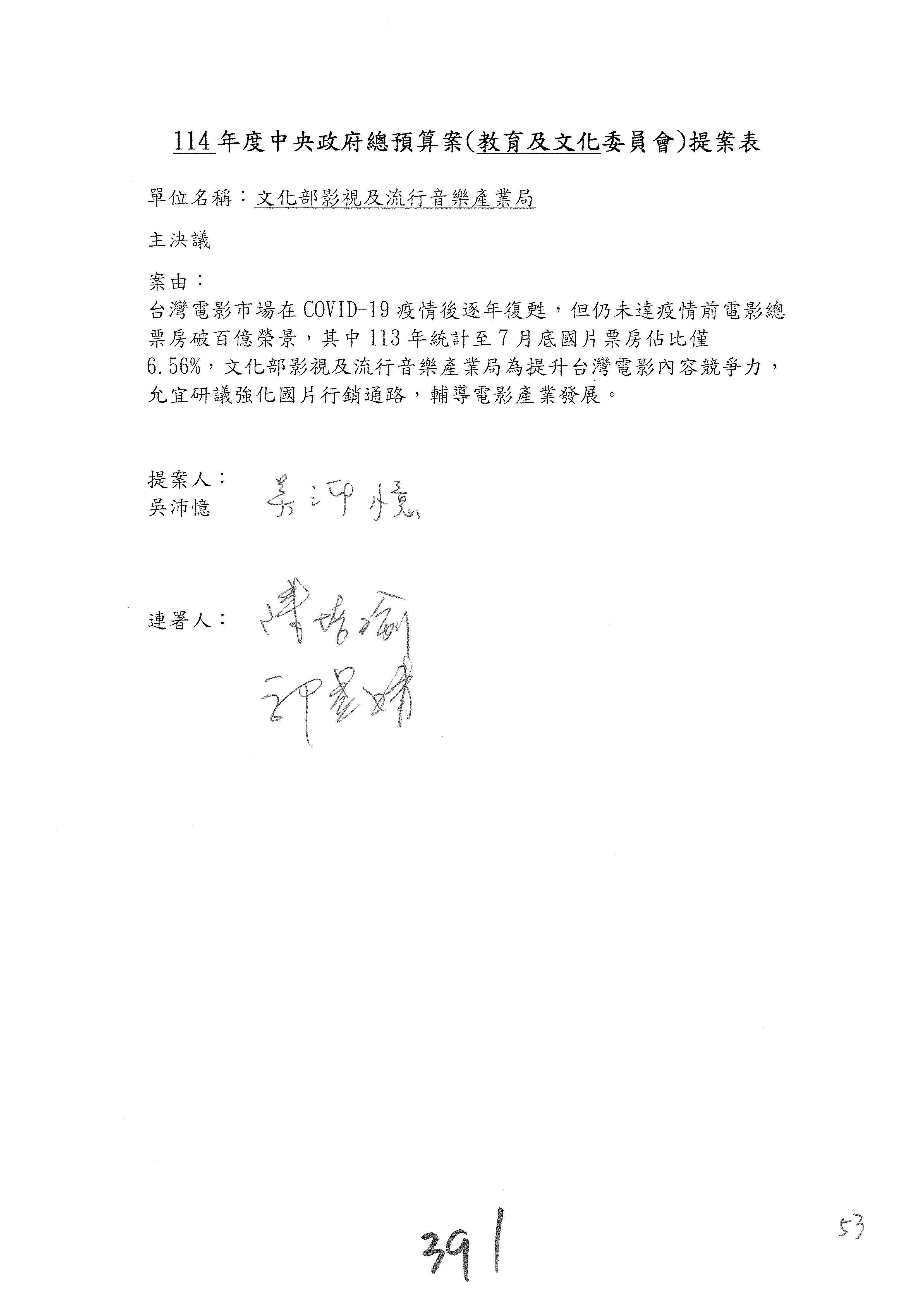 一、繼續審查114年度中央政府總預算案有關文化部及所屬單位預算案。