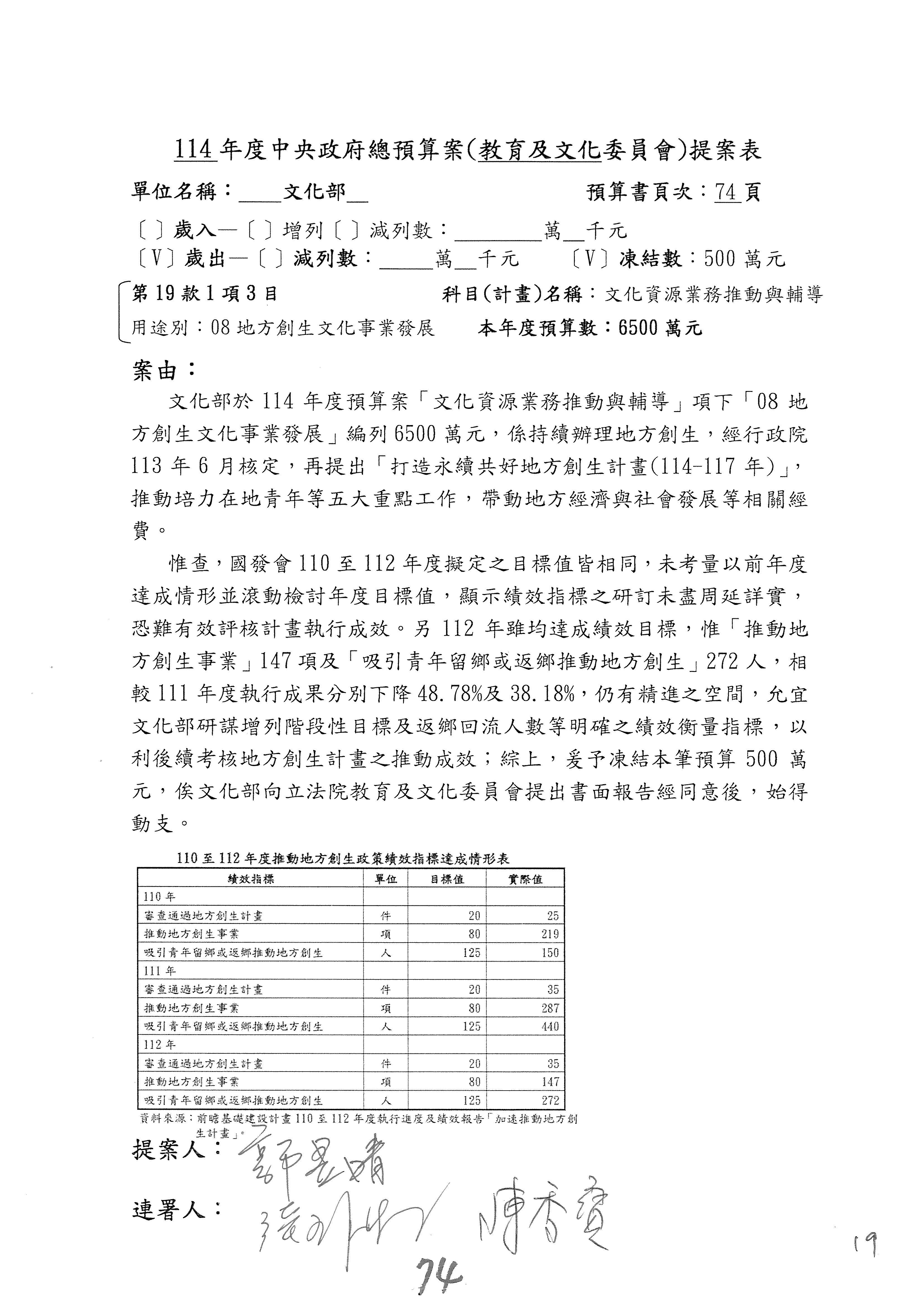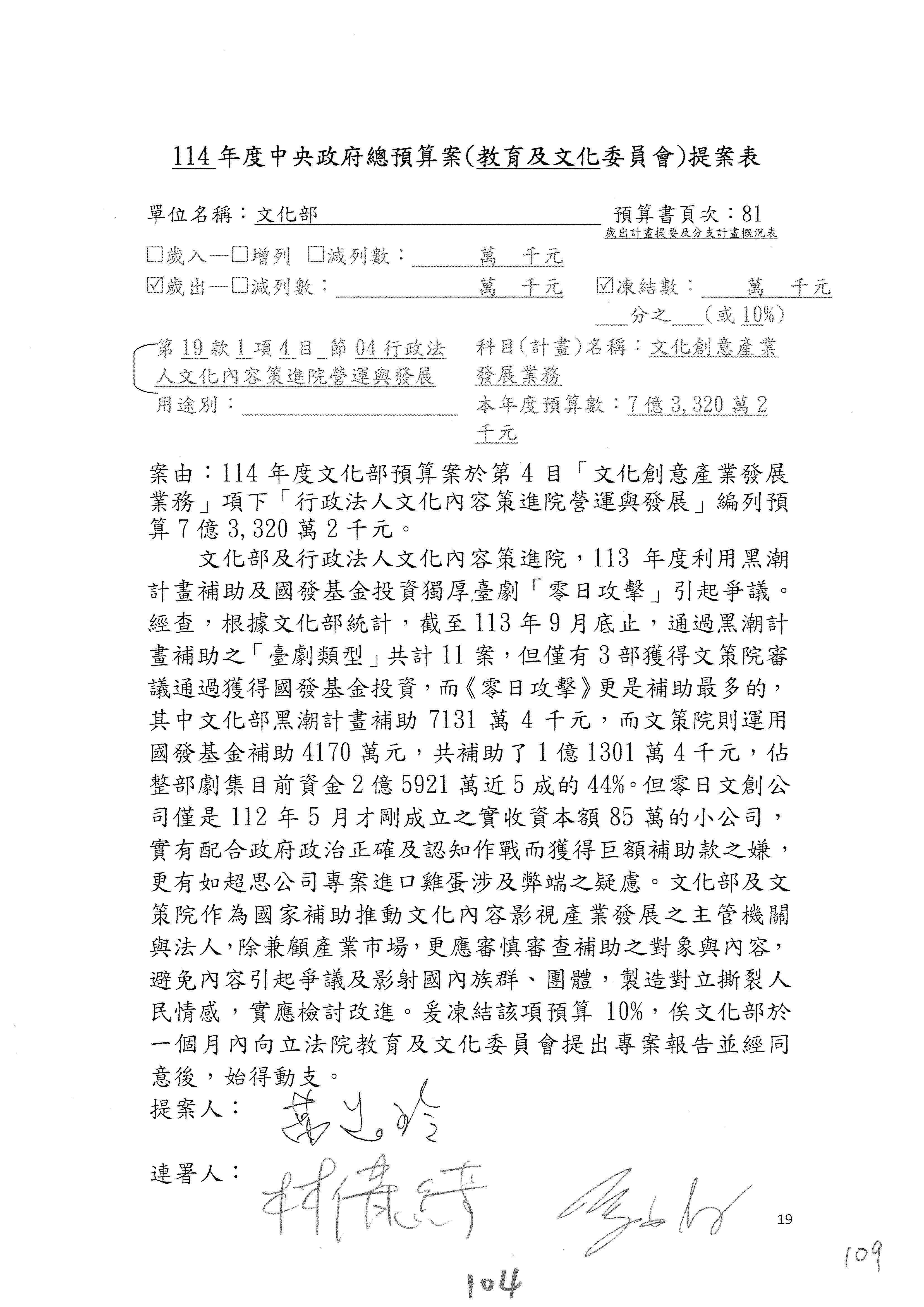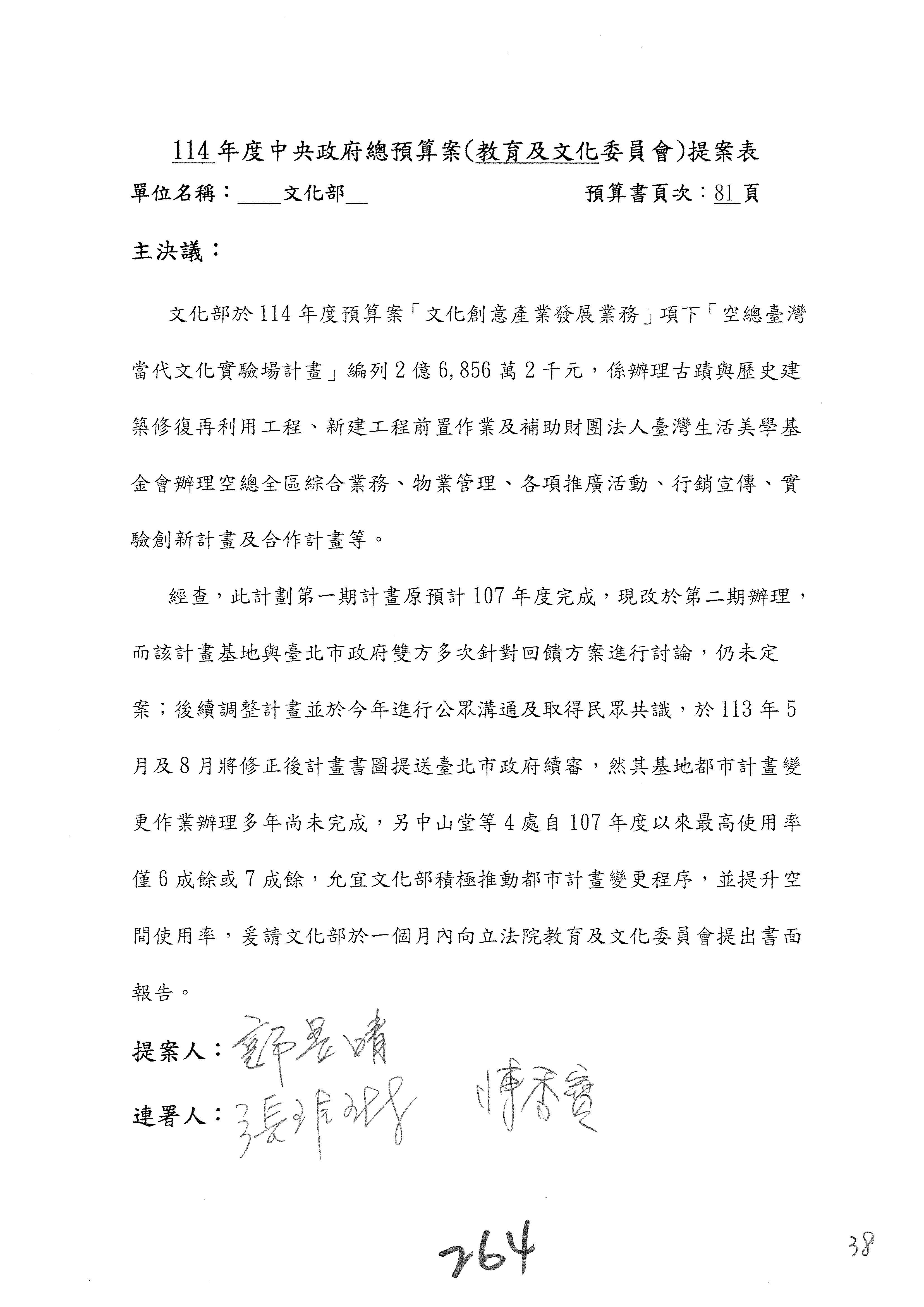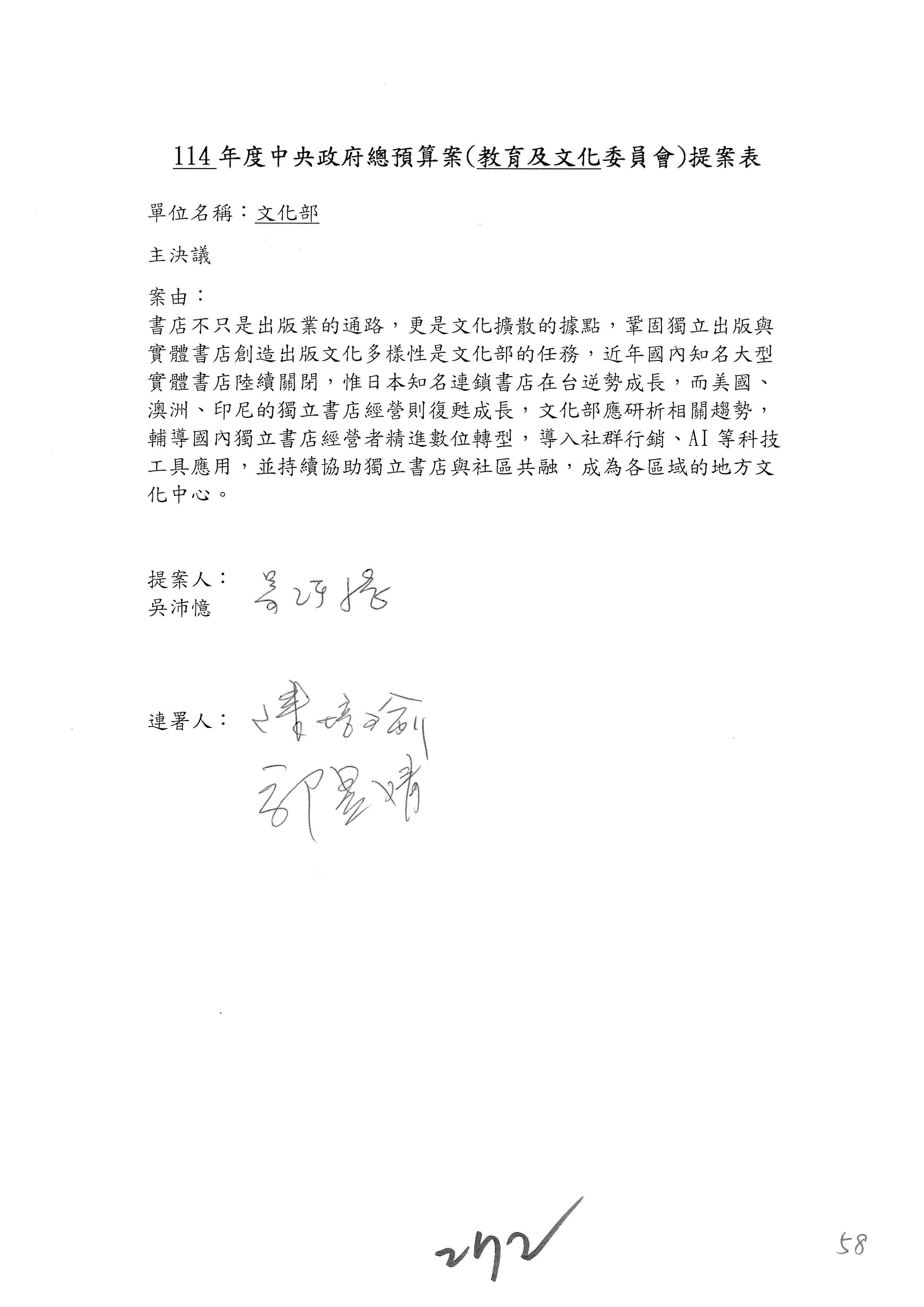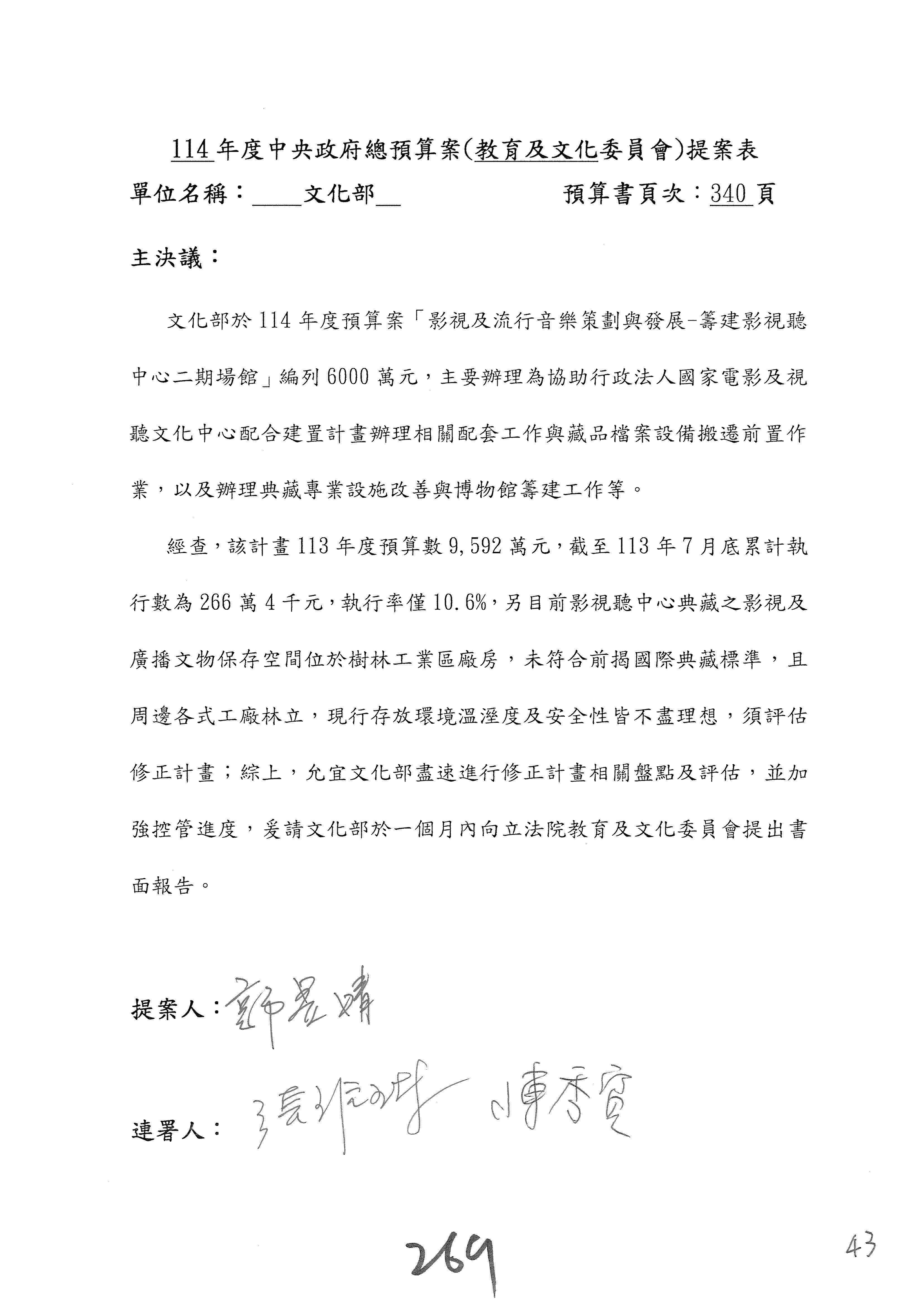 一、繼續審查114年度中央政府總預算案有關文化部及所屬單位預算案。