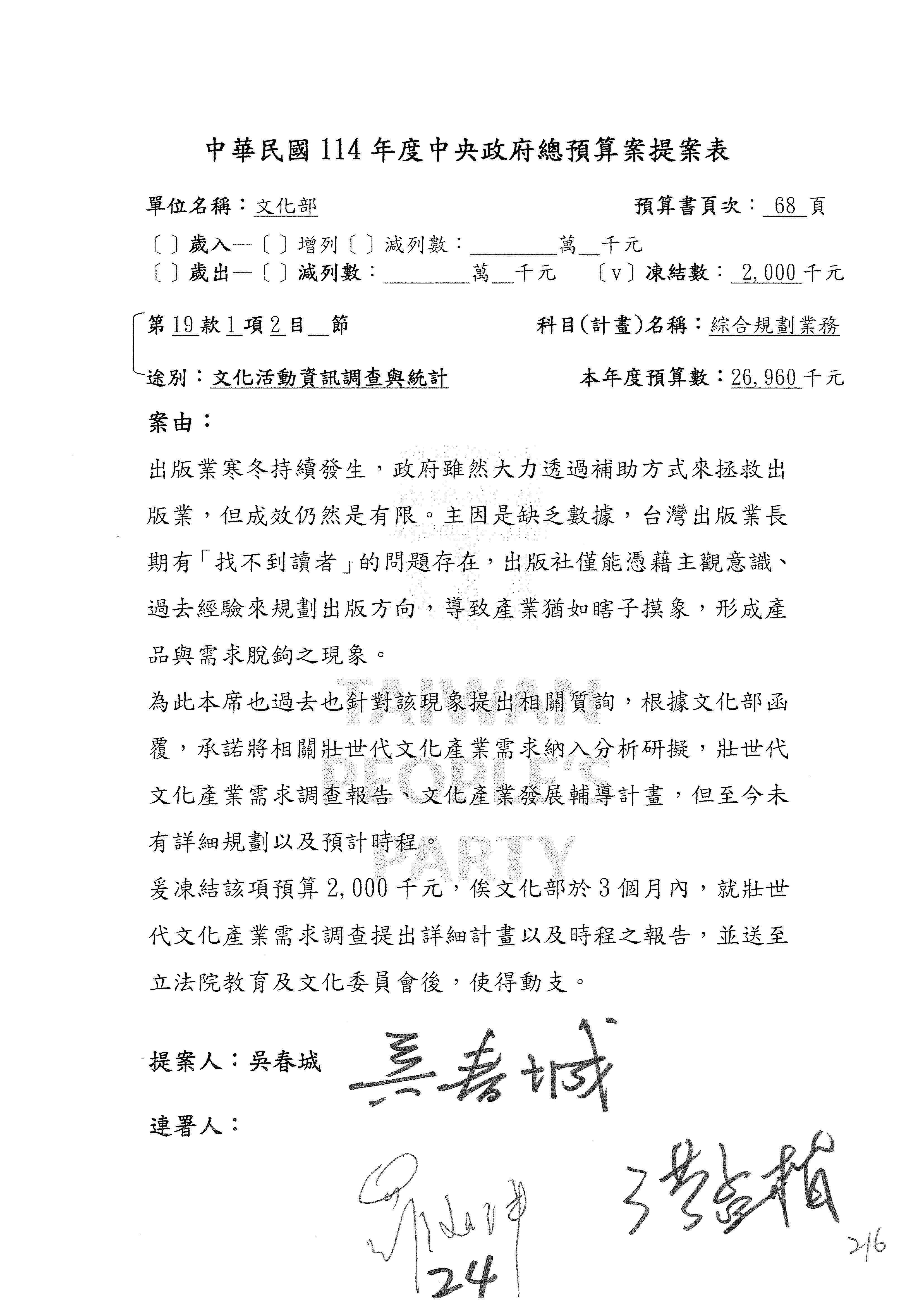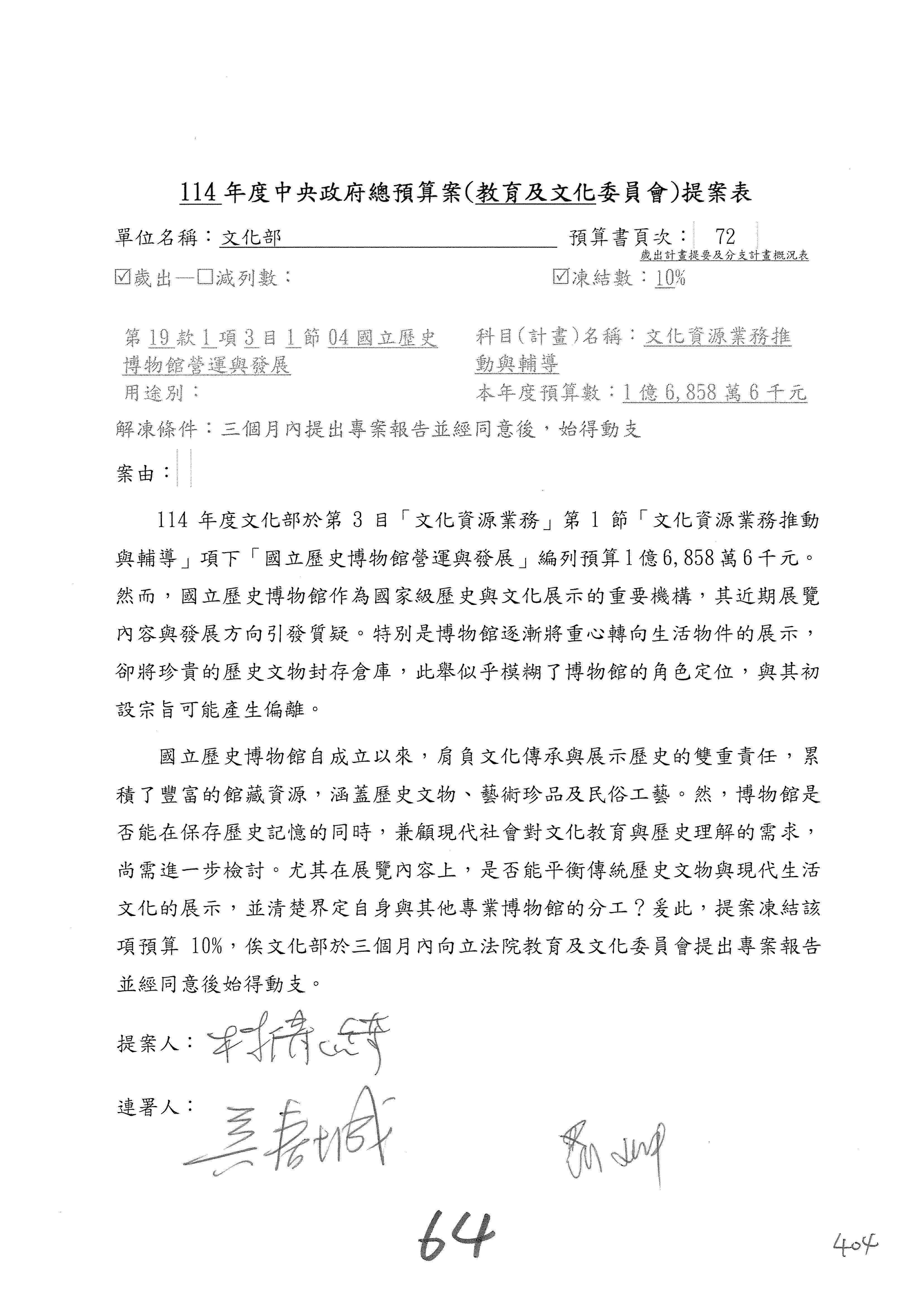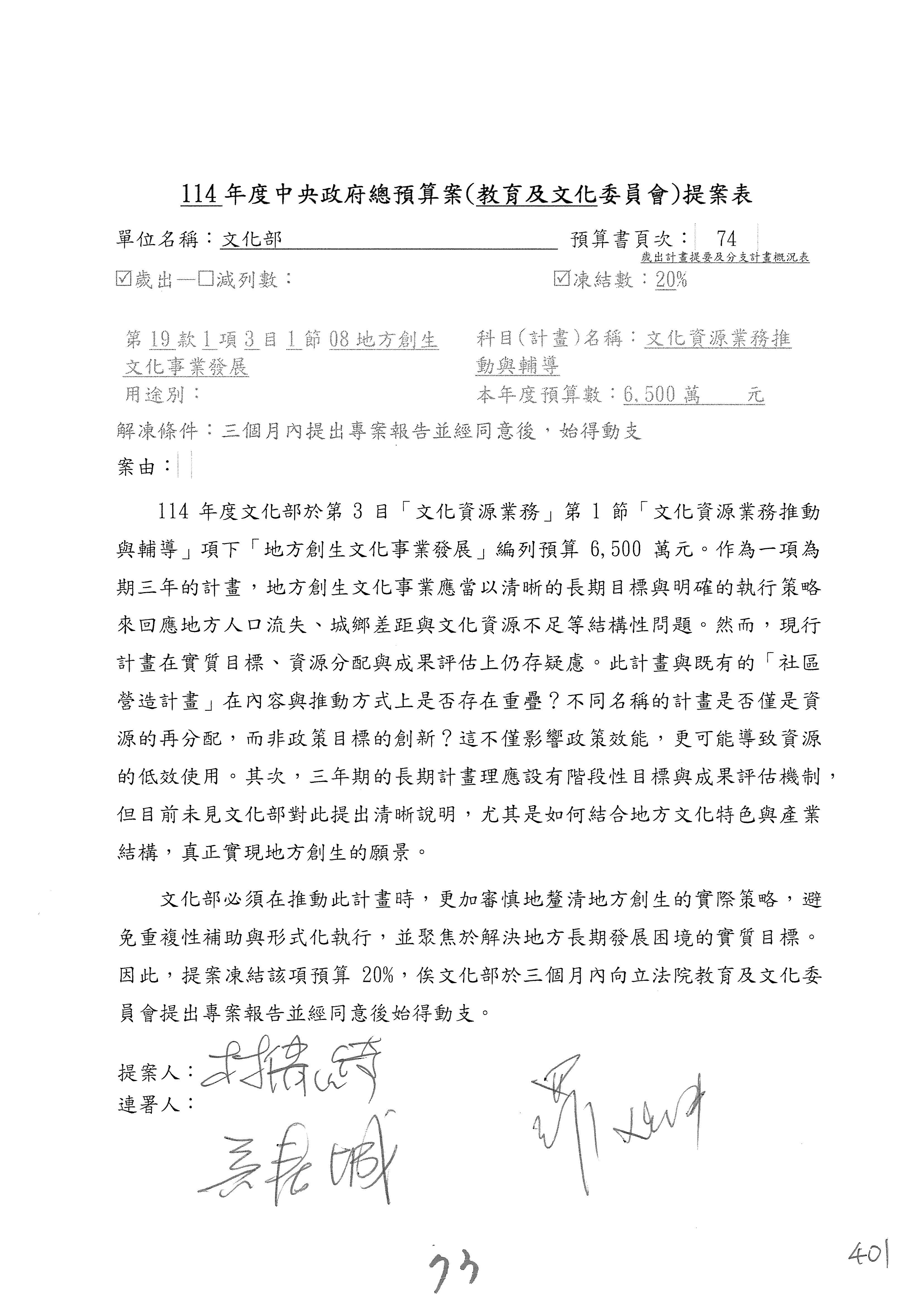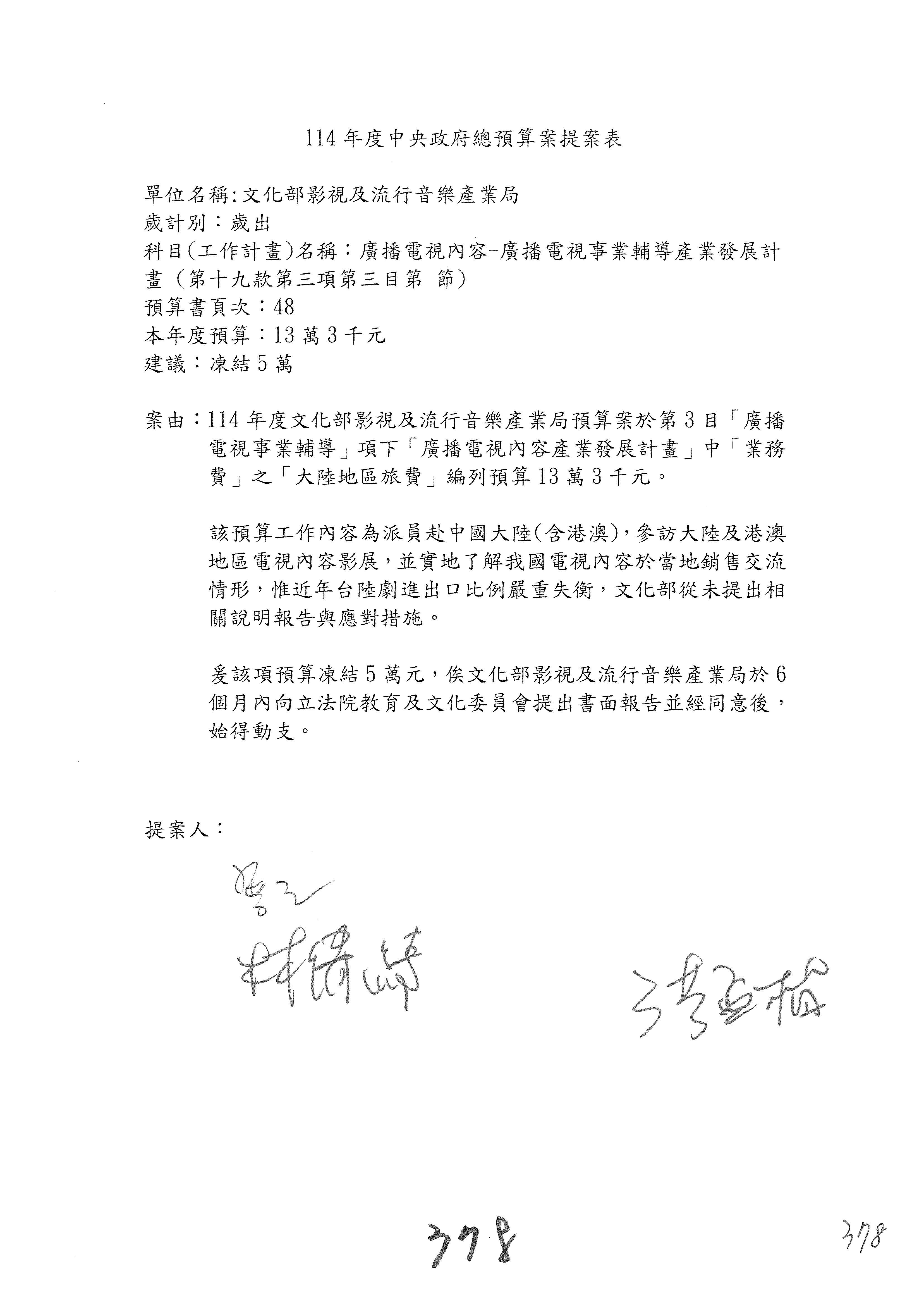 一、繼續審查114年度中央政府總預算案有關文化部及所屬單位預算案。