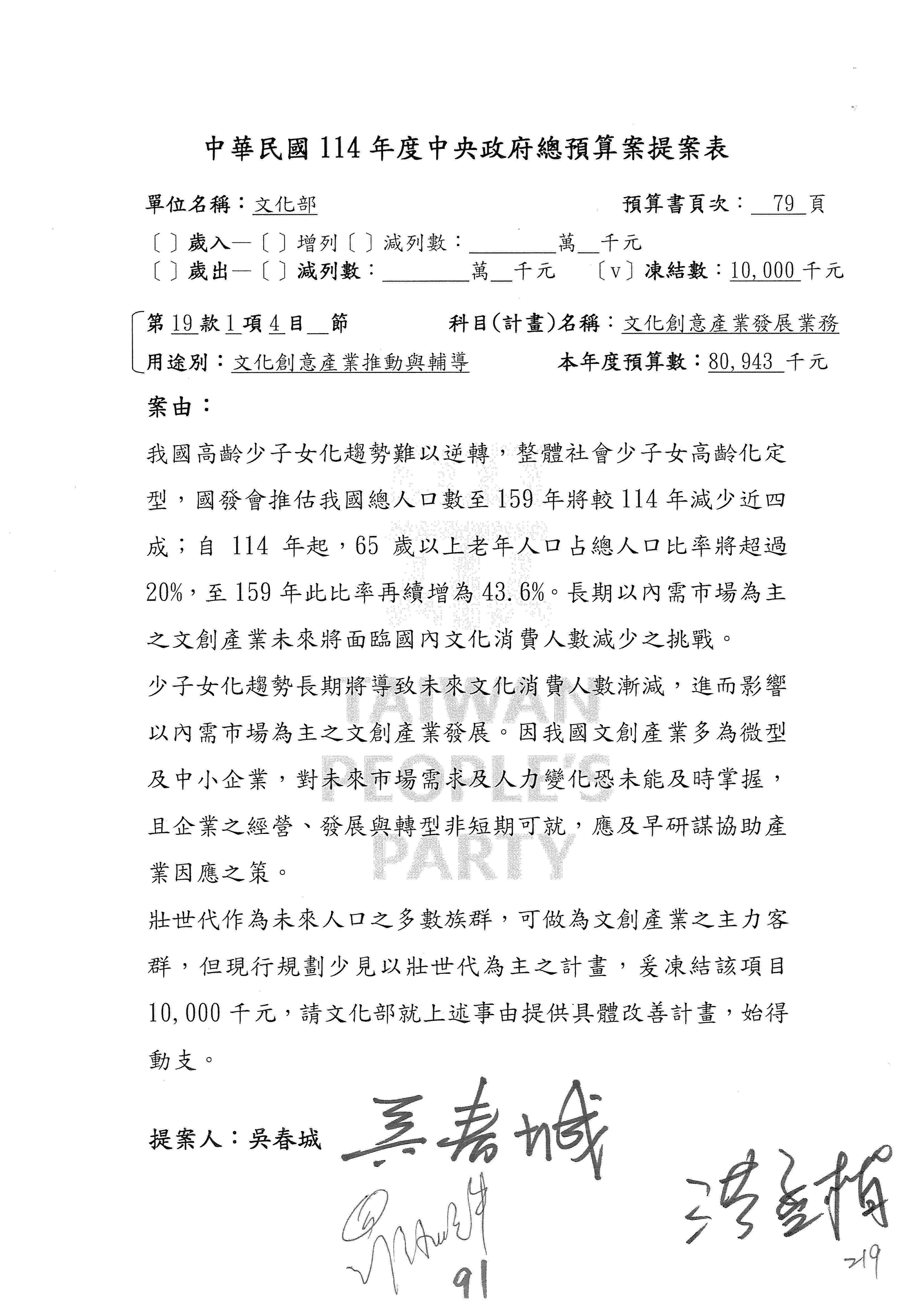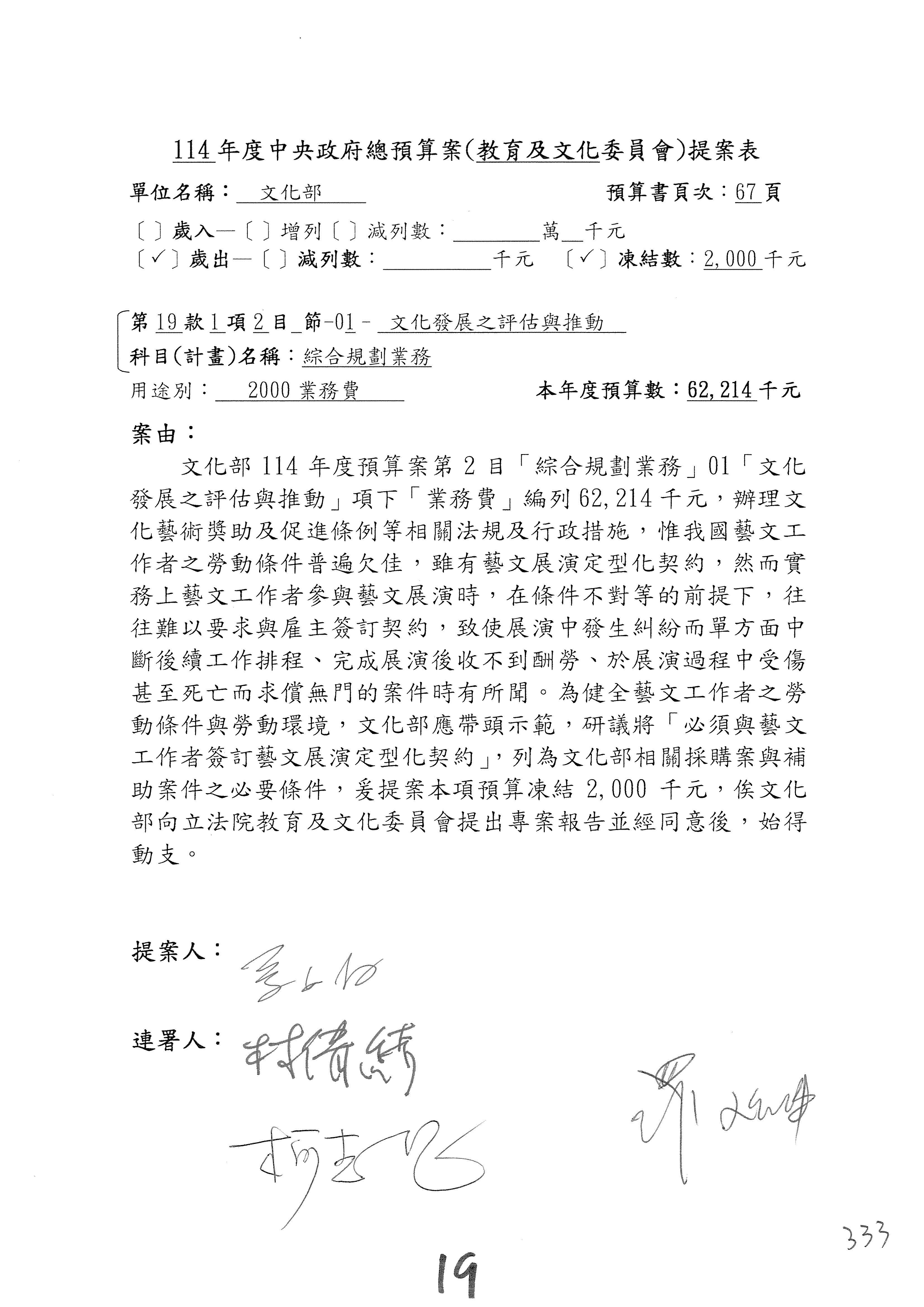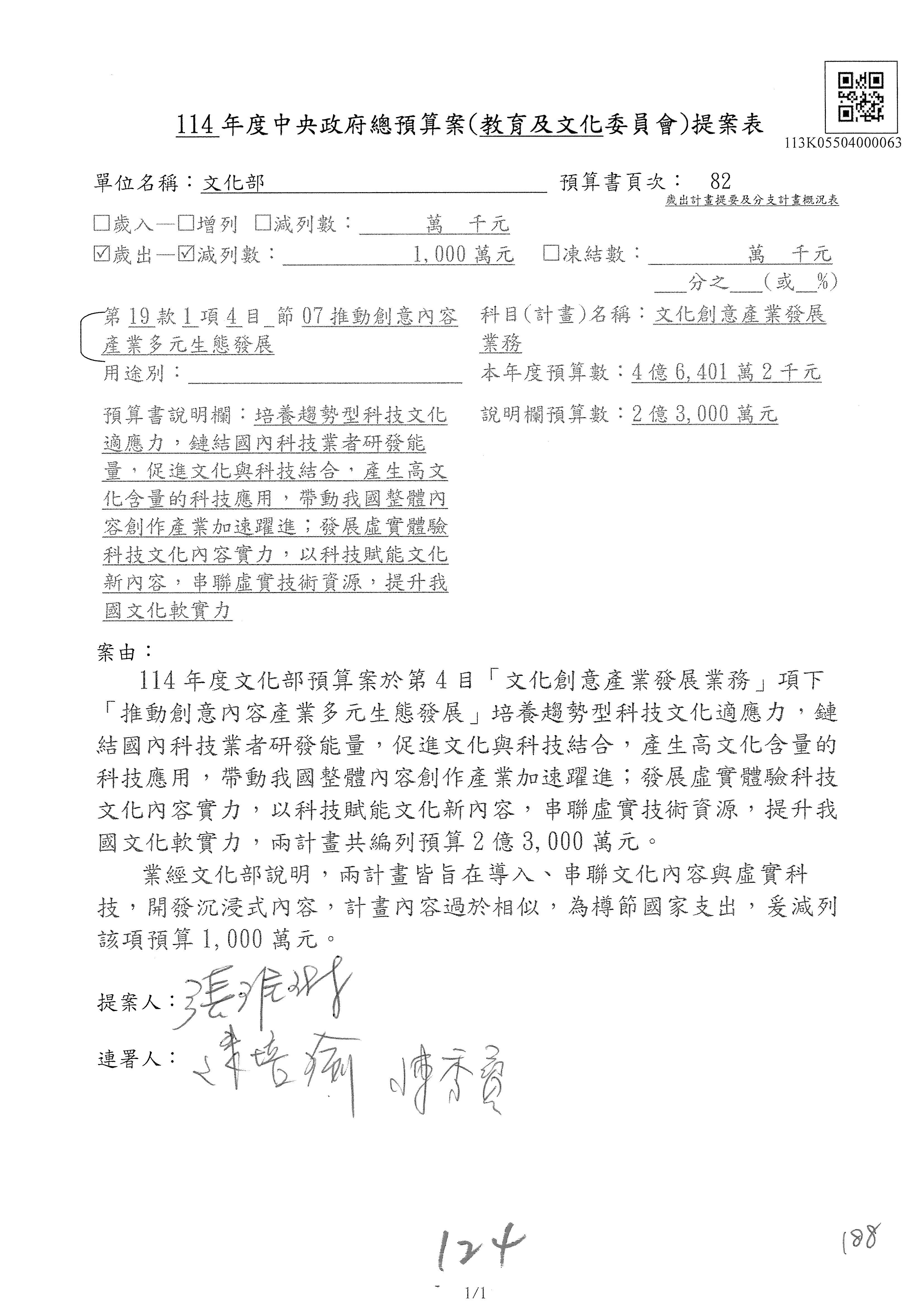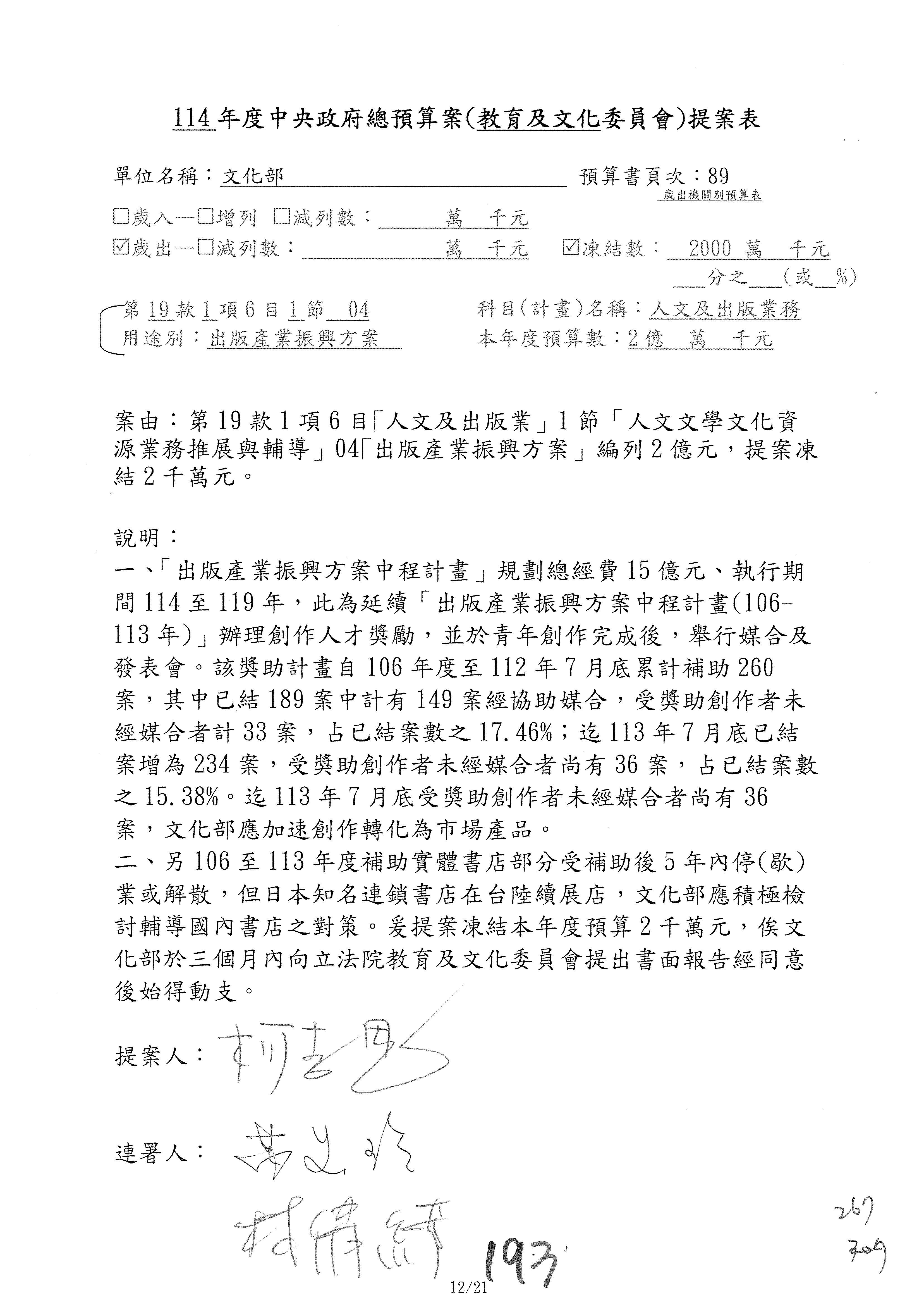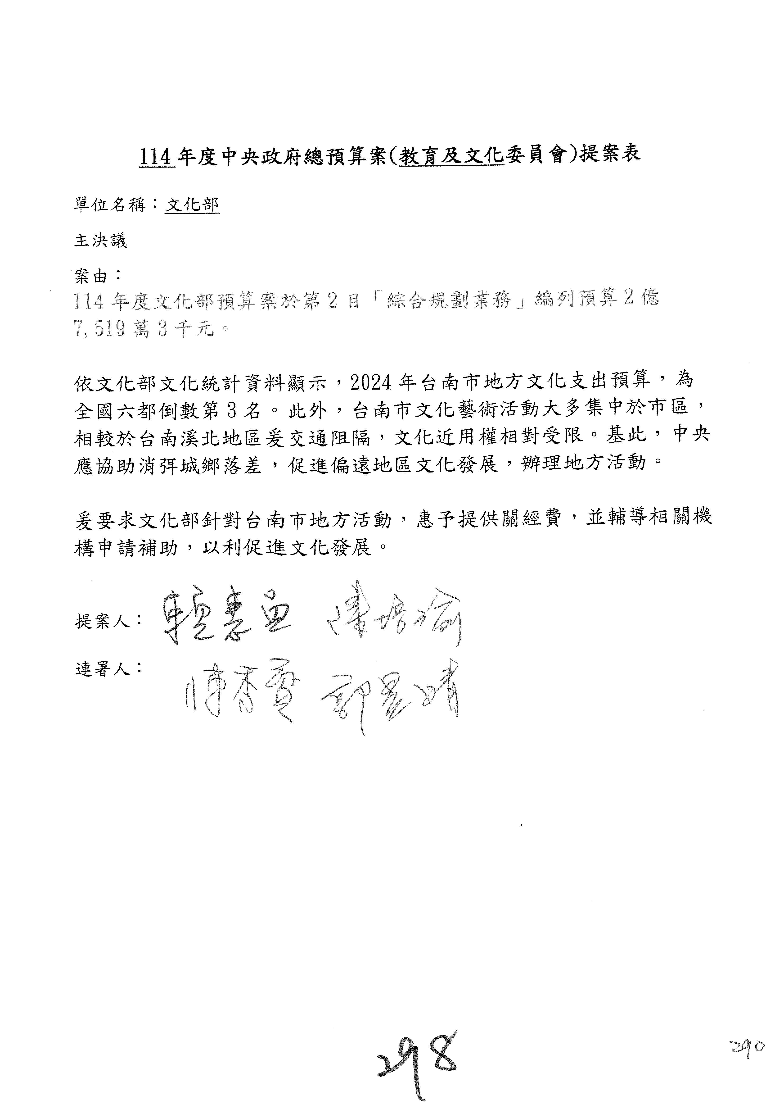 一、繼續審查114年度中央政府總預算案有關文化部及所屬單位預算案。