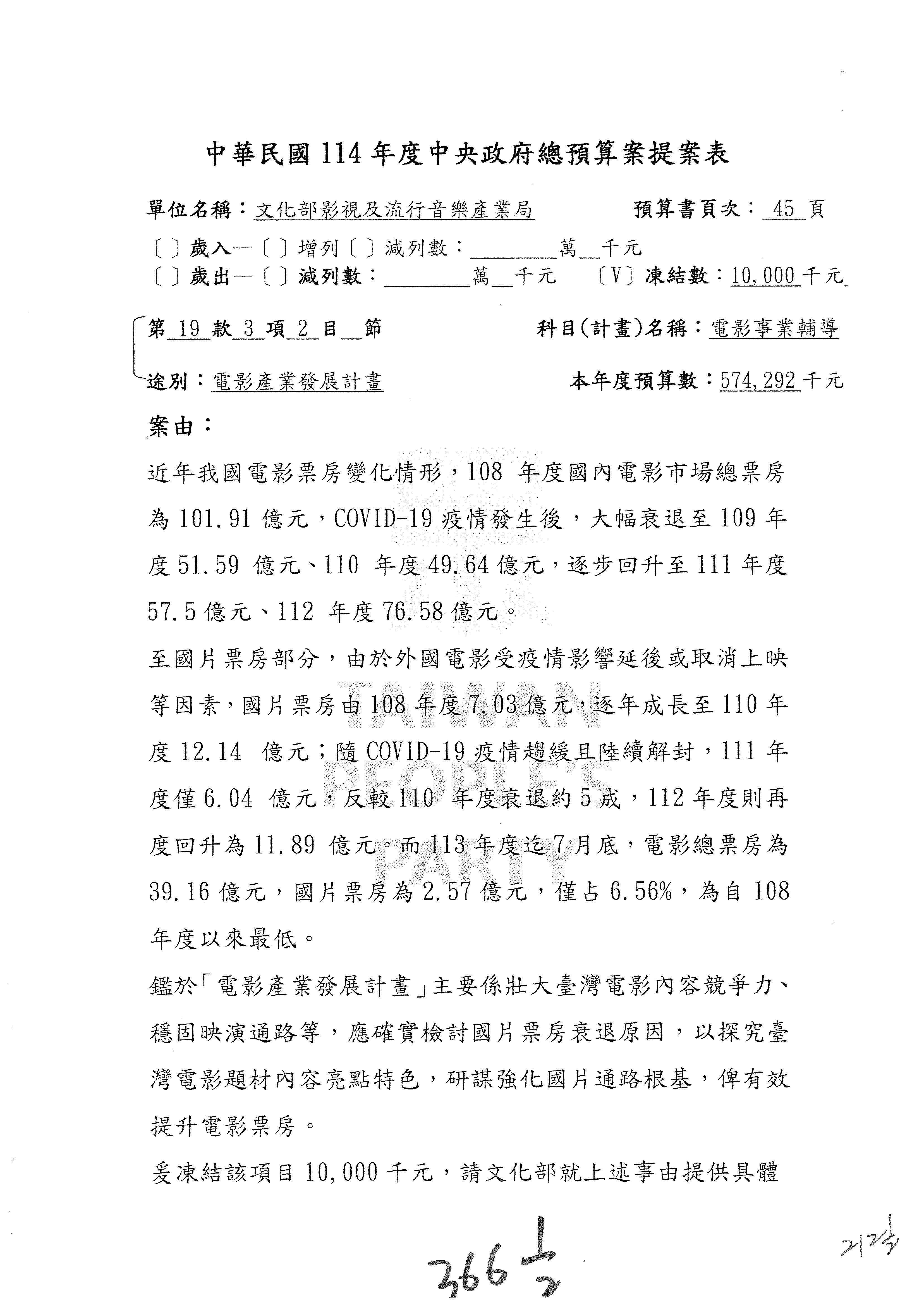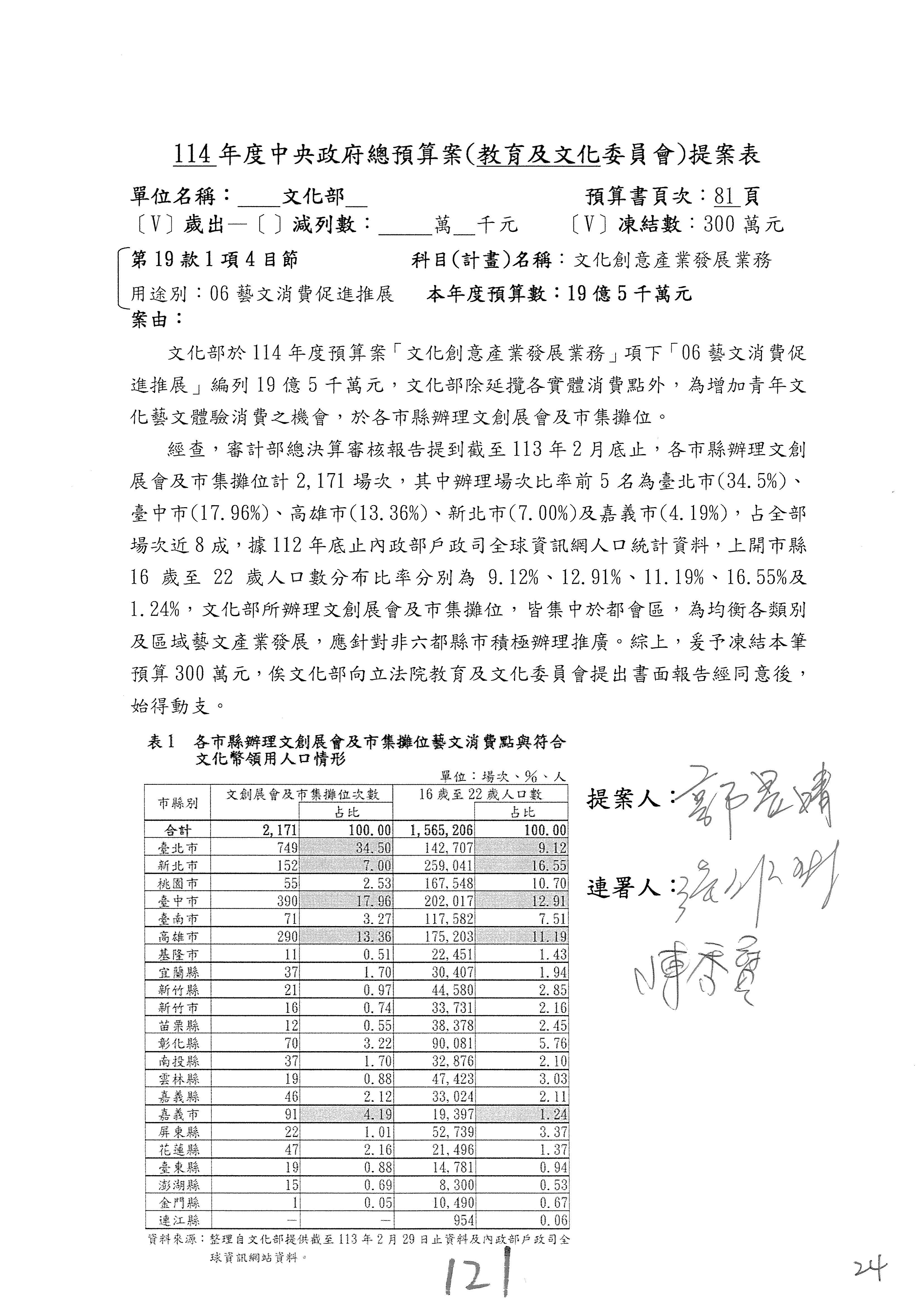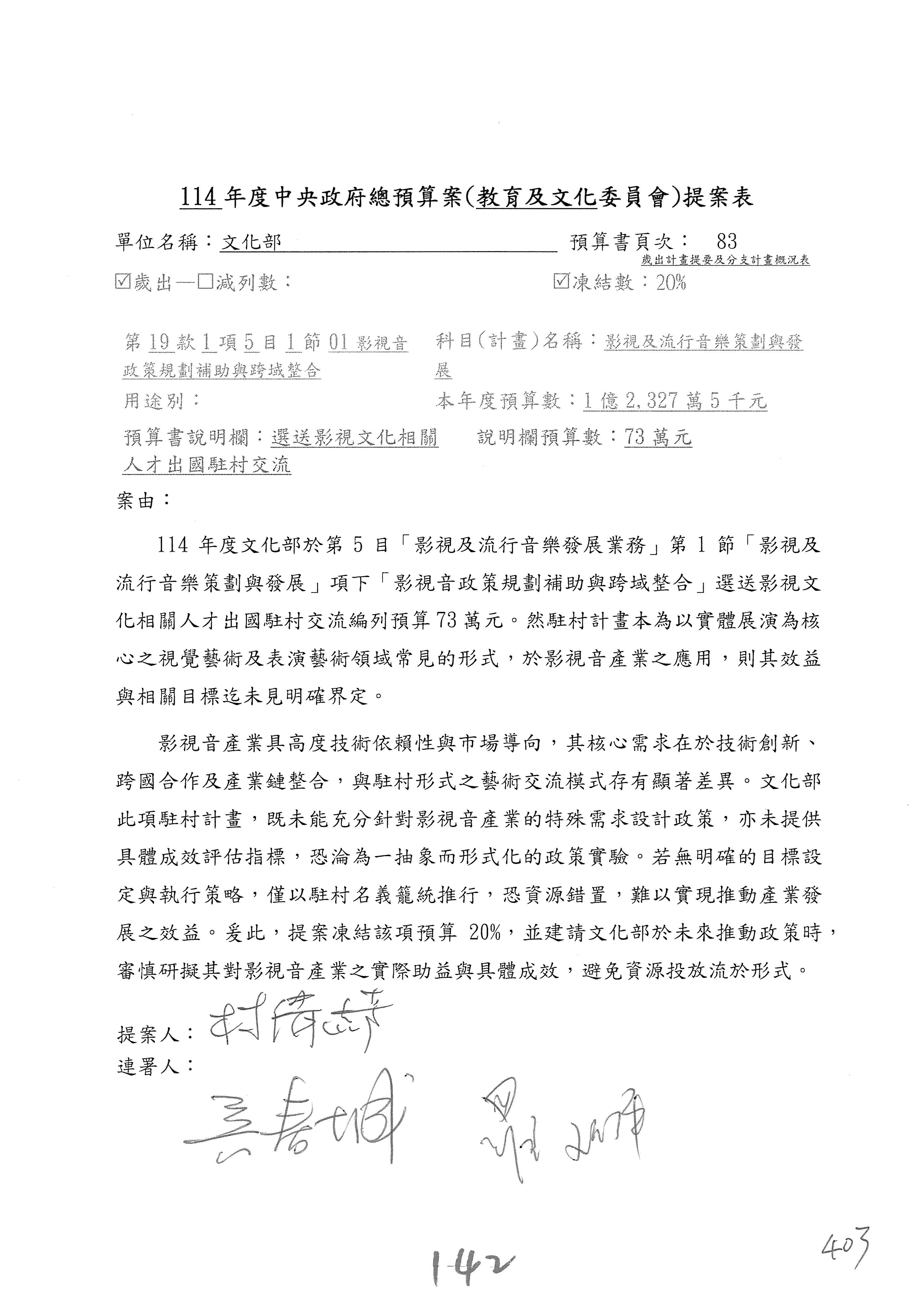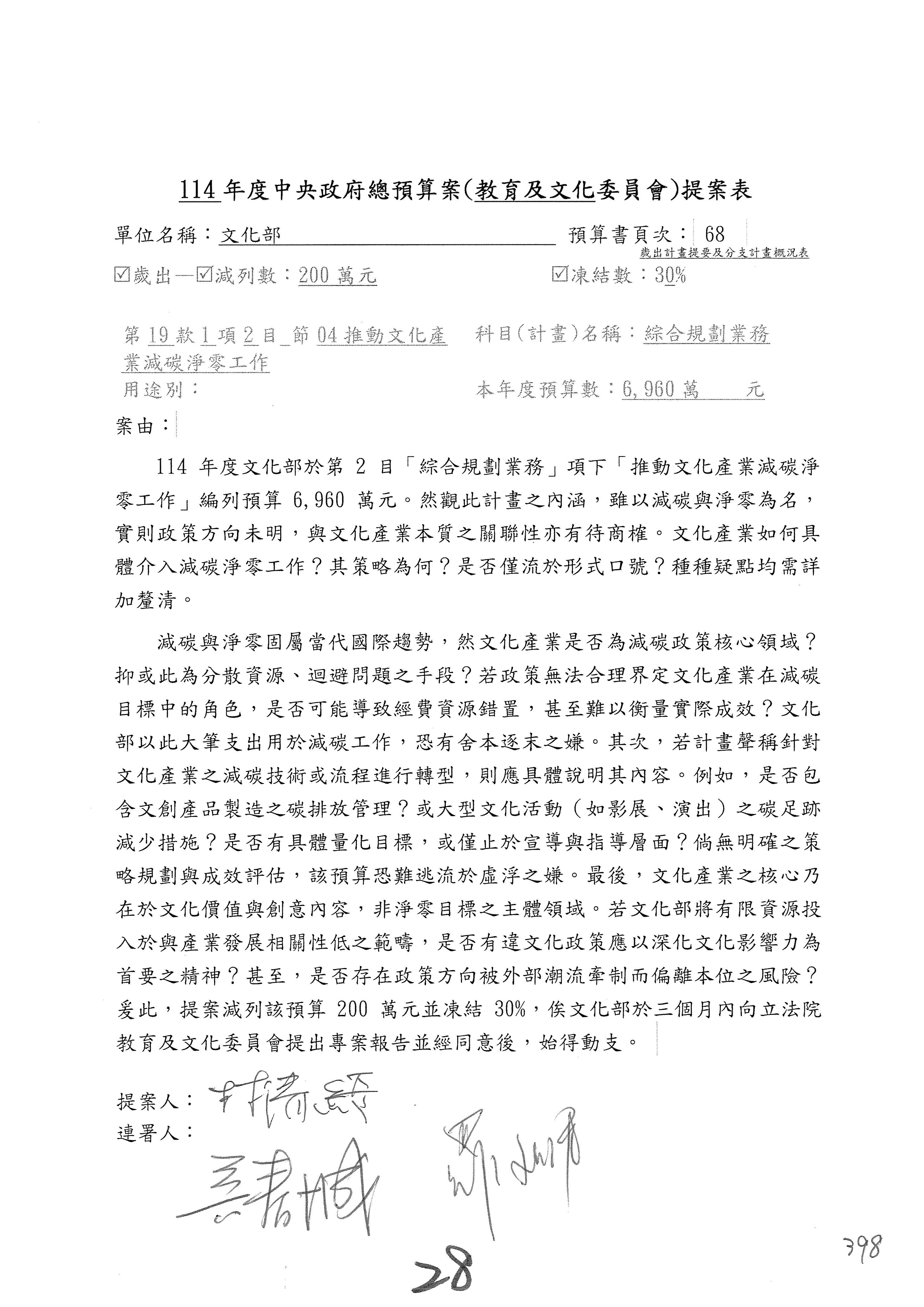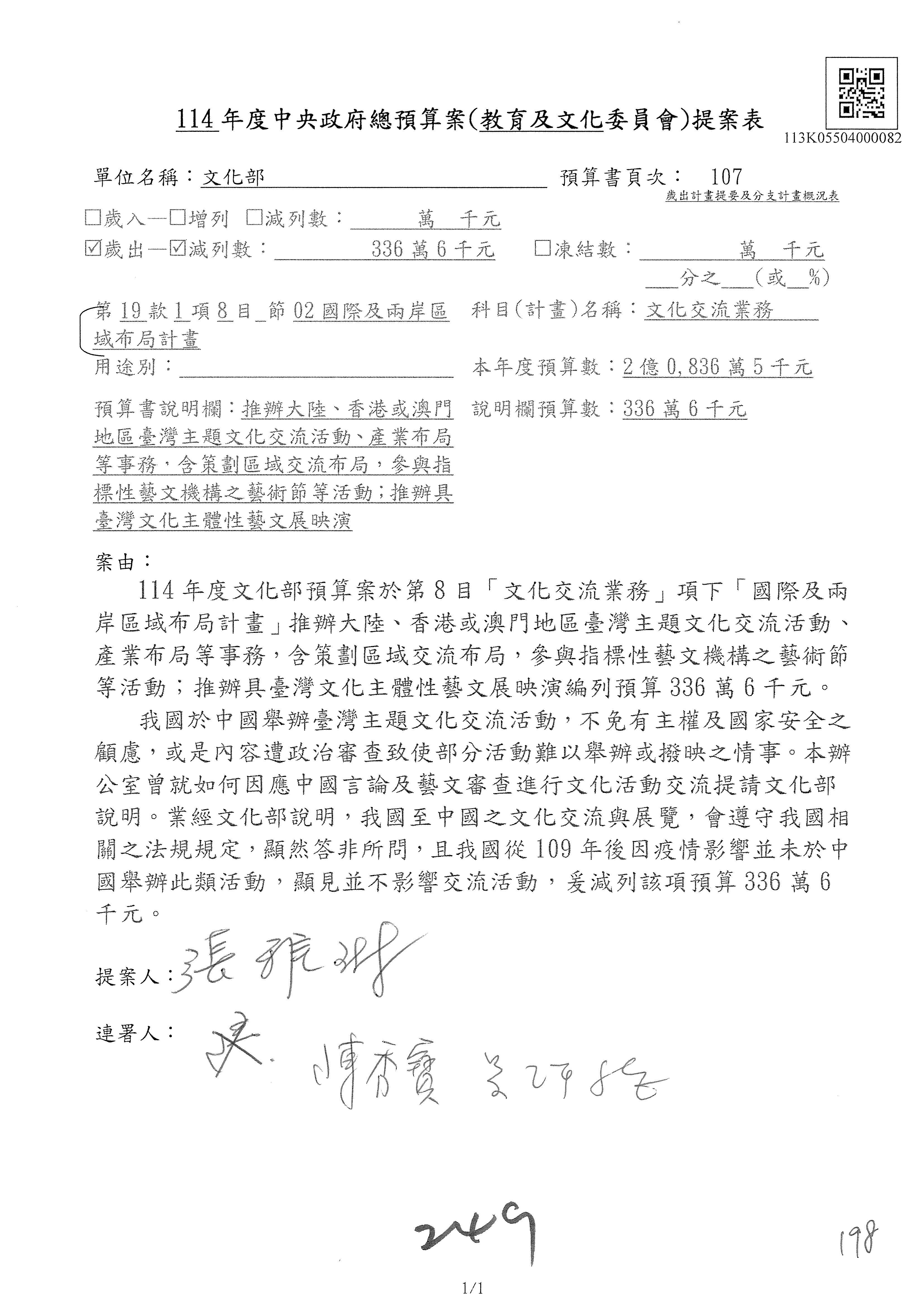 一、繼續審查114年度中央政府總預算案有關文化部及所屬單位預算案。